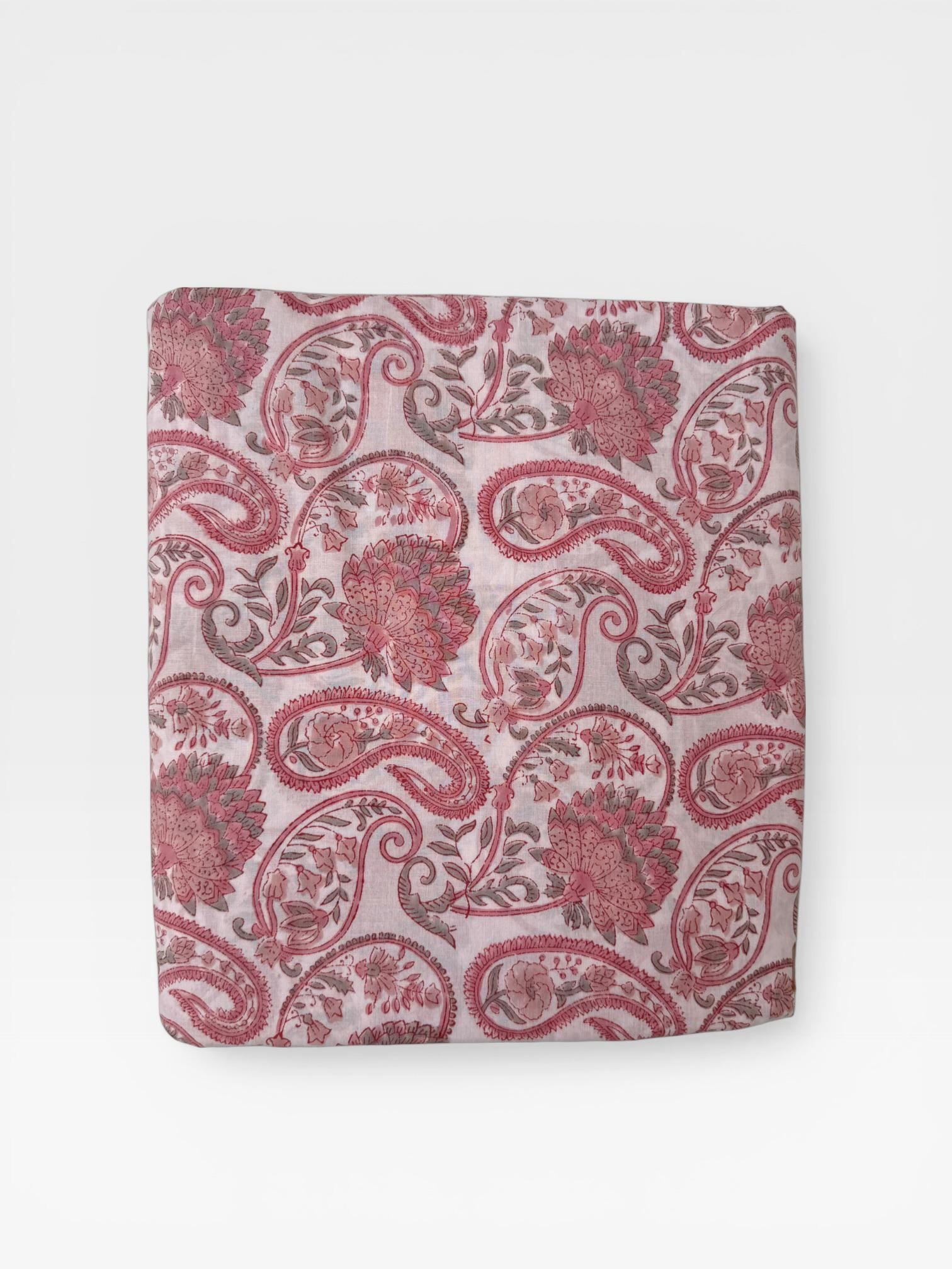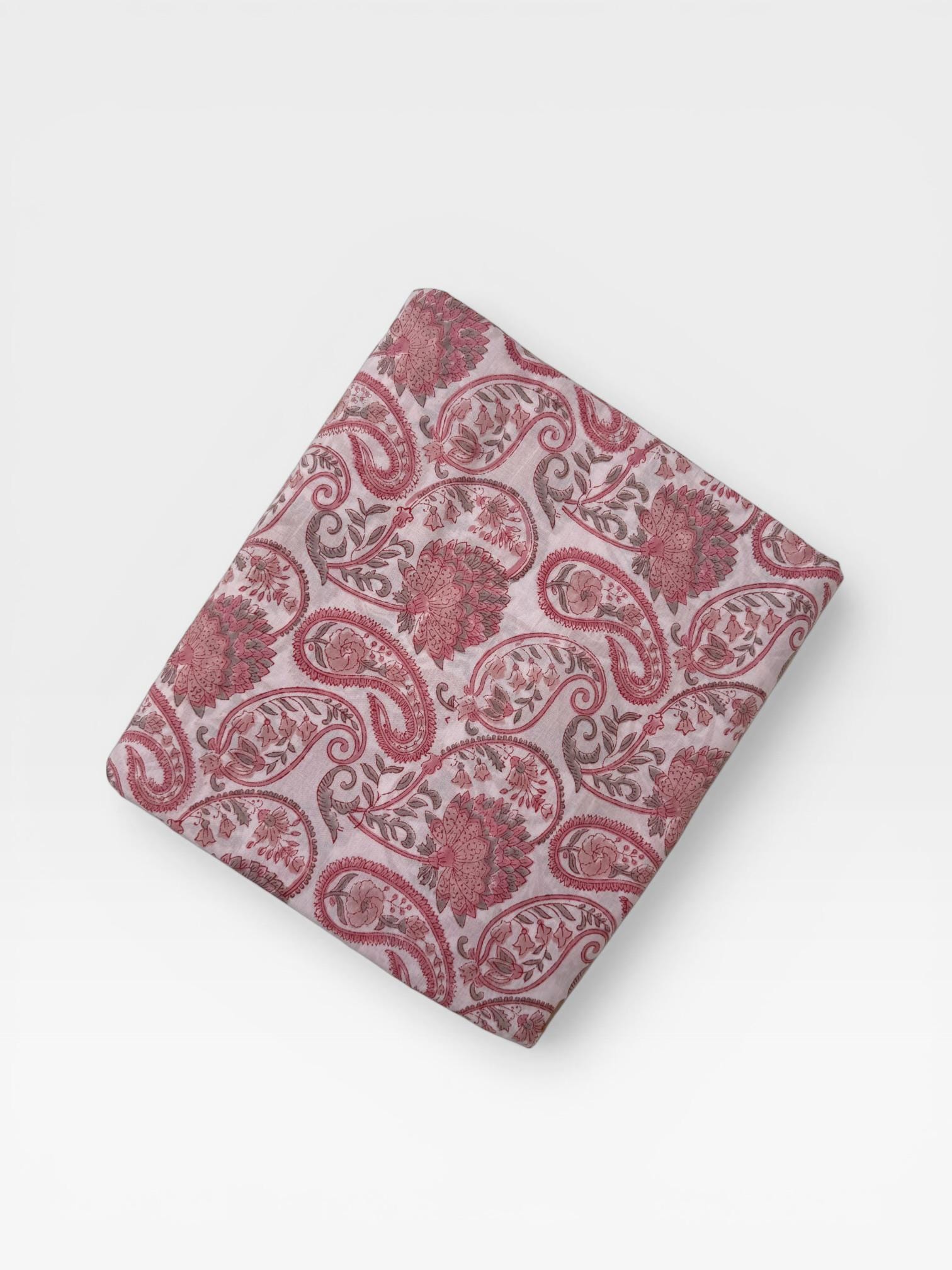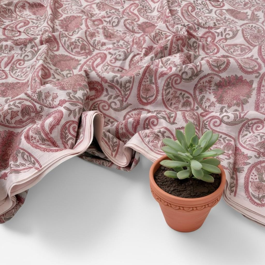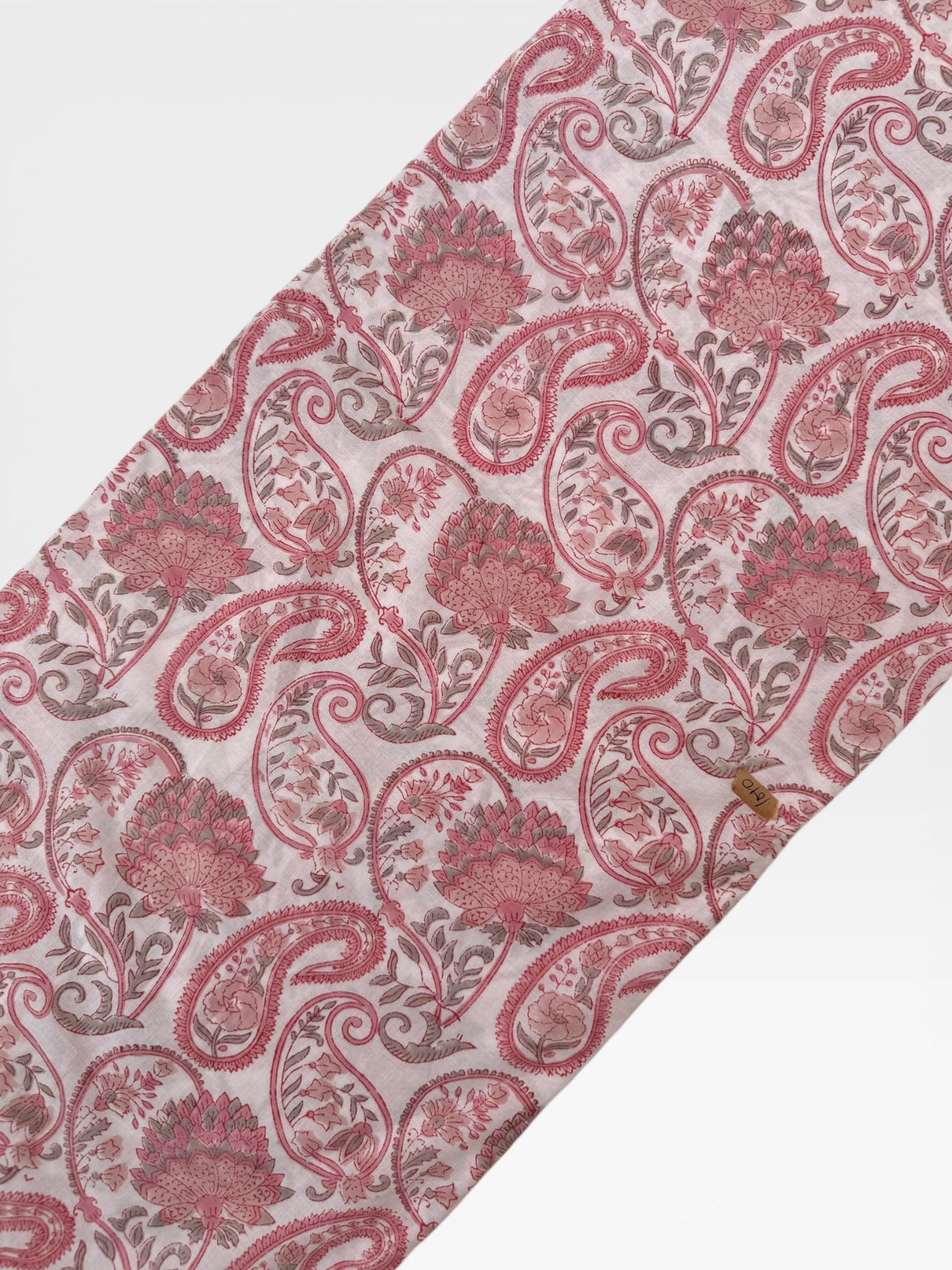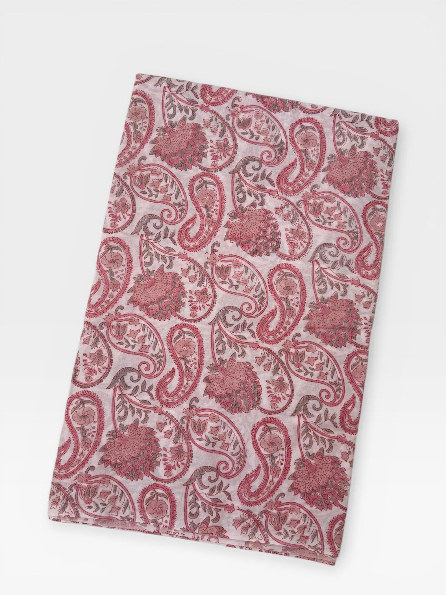Add a touch of soft elegance to your creations with this beautiful hand block printed cotton fabric, designed in a delicate palette of blush pink and earthy tones. Set on a light, airy base, the fabric features intricate paisley motifs intertwined with fine floral detailing—creating a graceful and timeless pattern that feels both romantic and sophisticated.