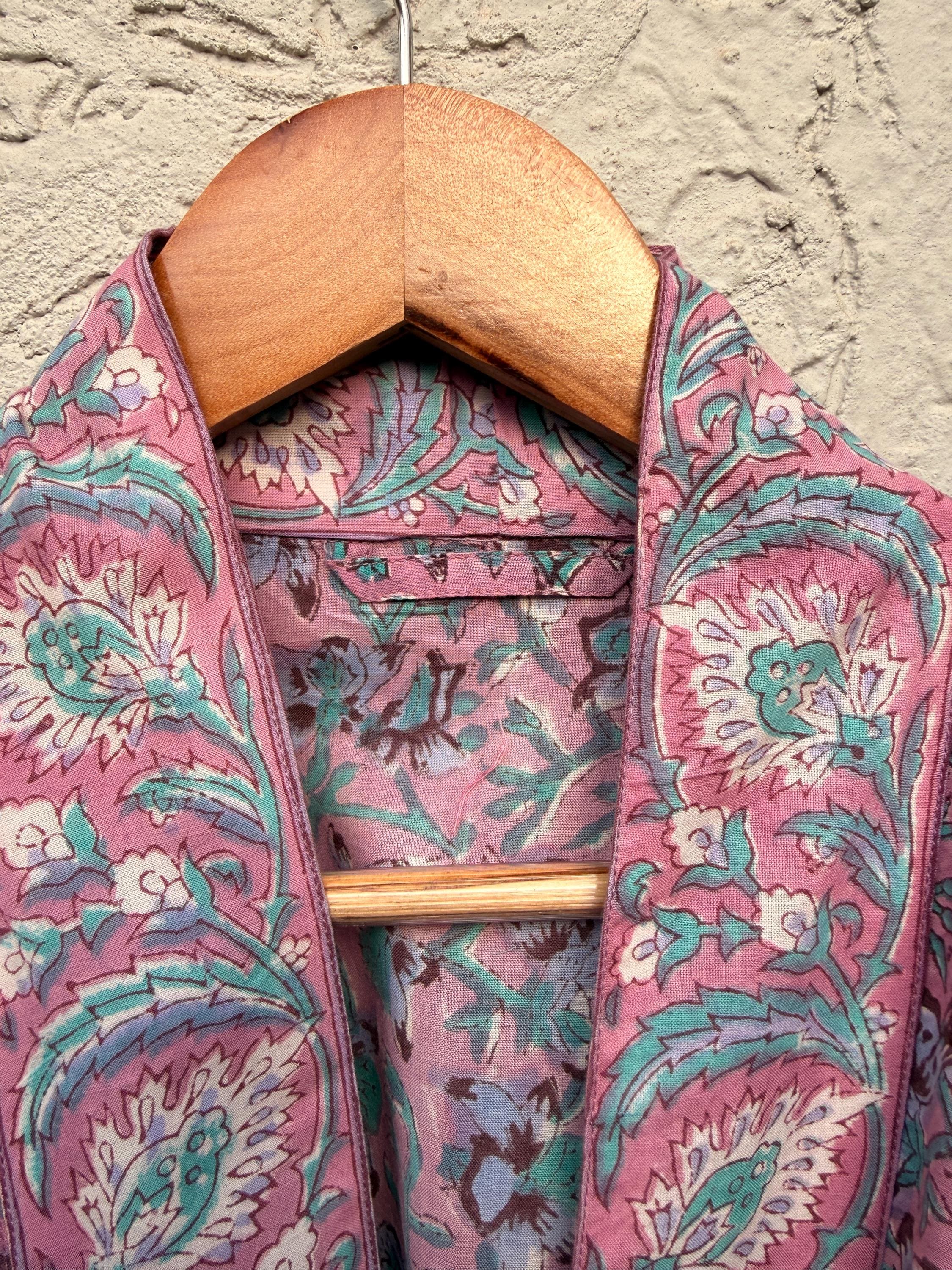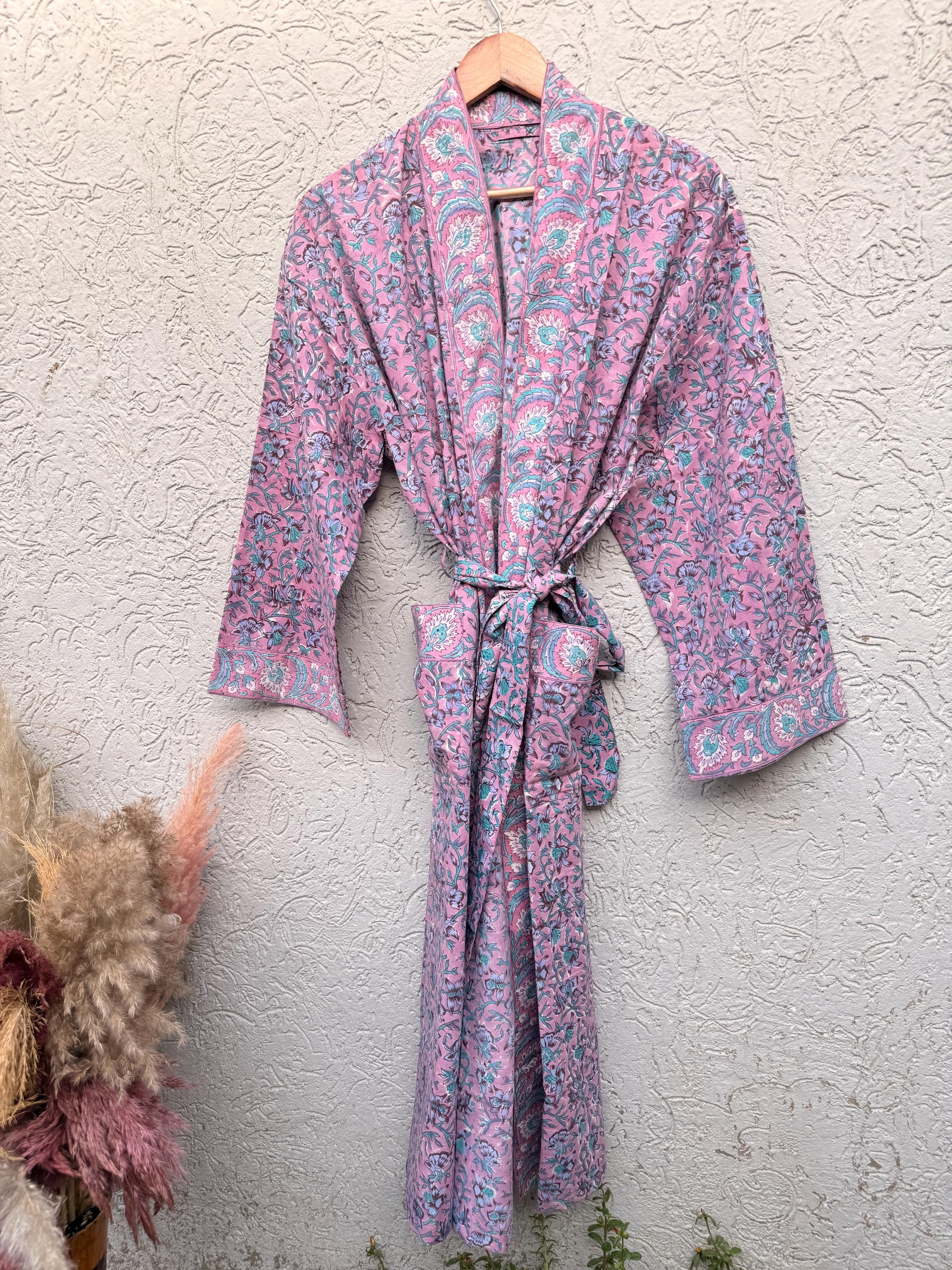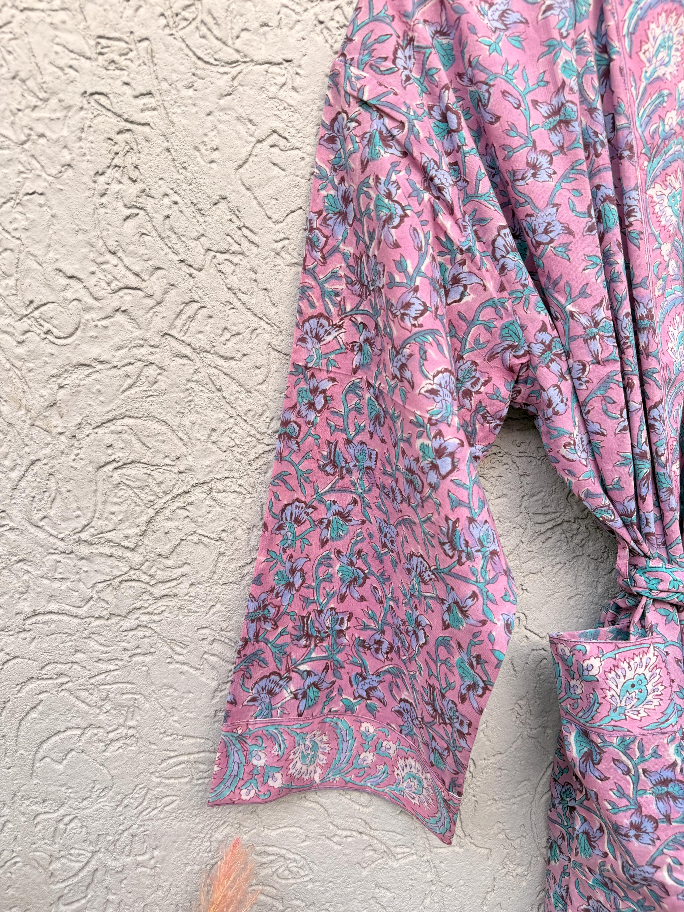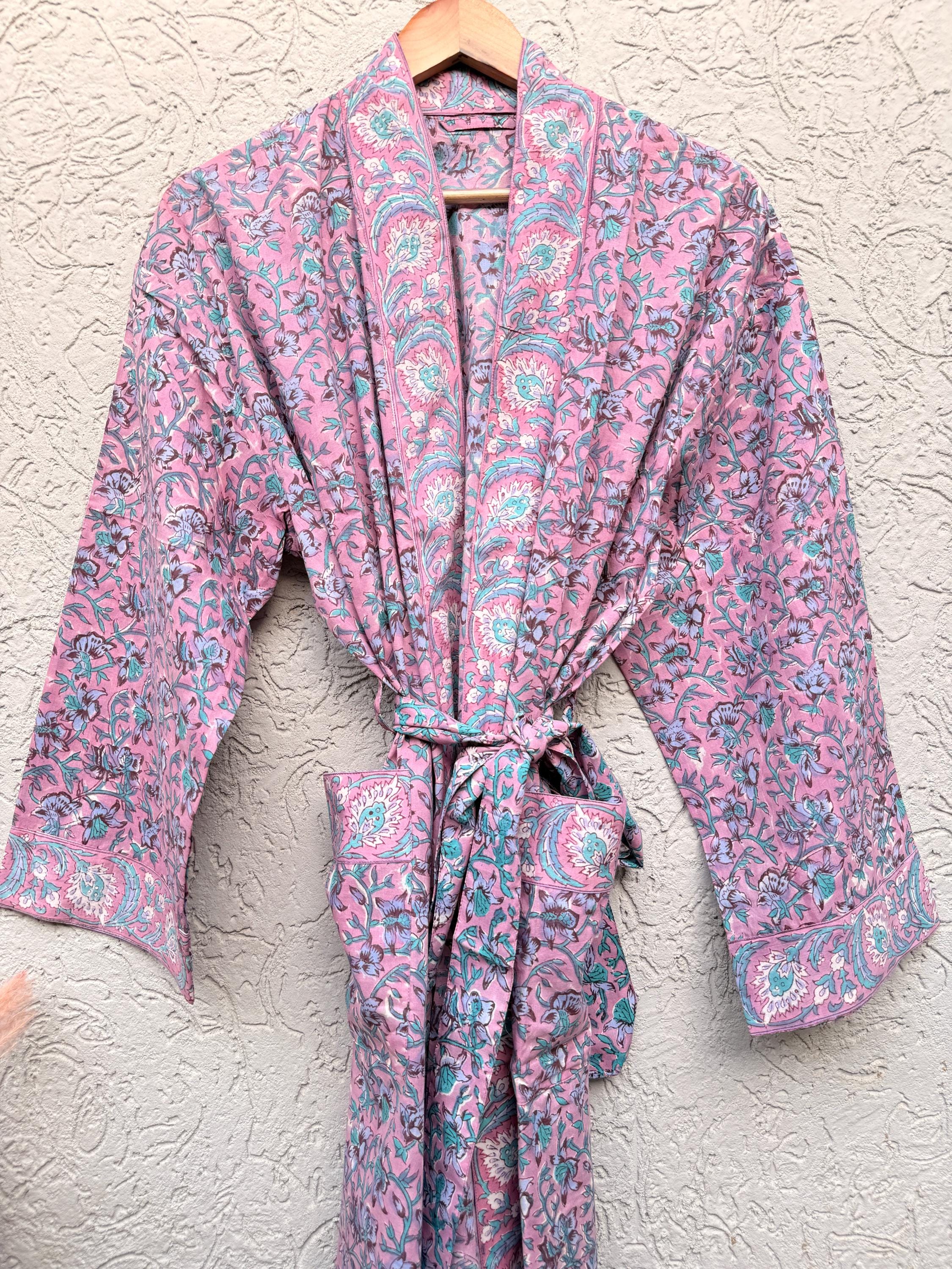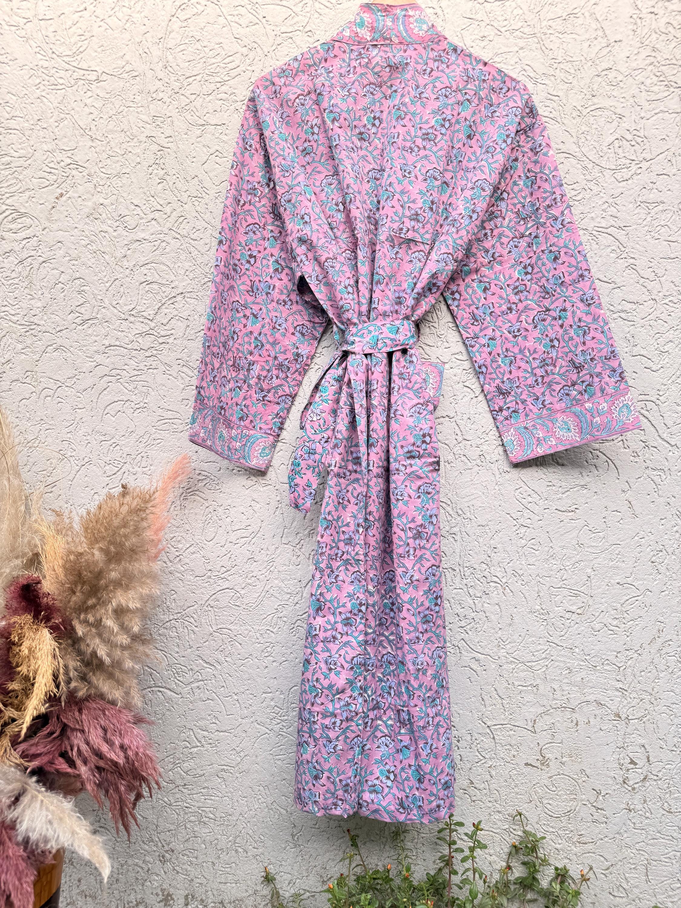 Pink Floral Block Print Cotton Bathrobe | Handmade Indian Robe | Lightweight Kimono Robe | Bridal Getting Ready Robe | Summer Loungewear