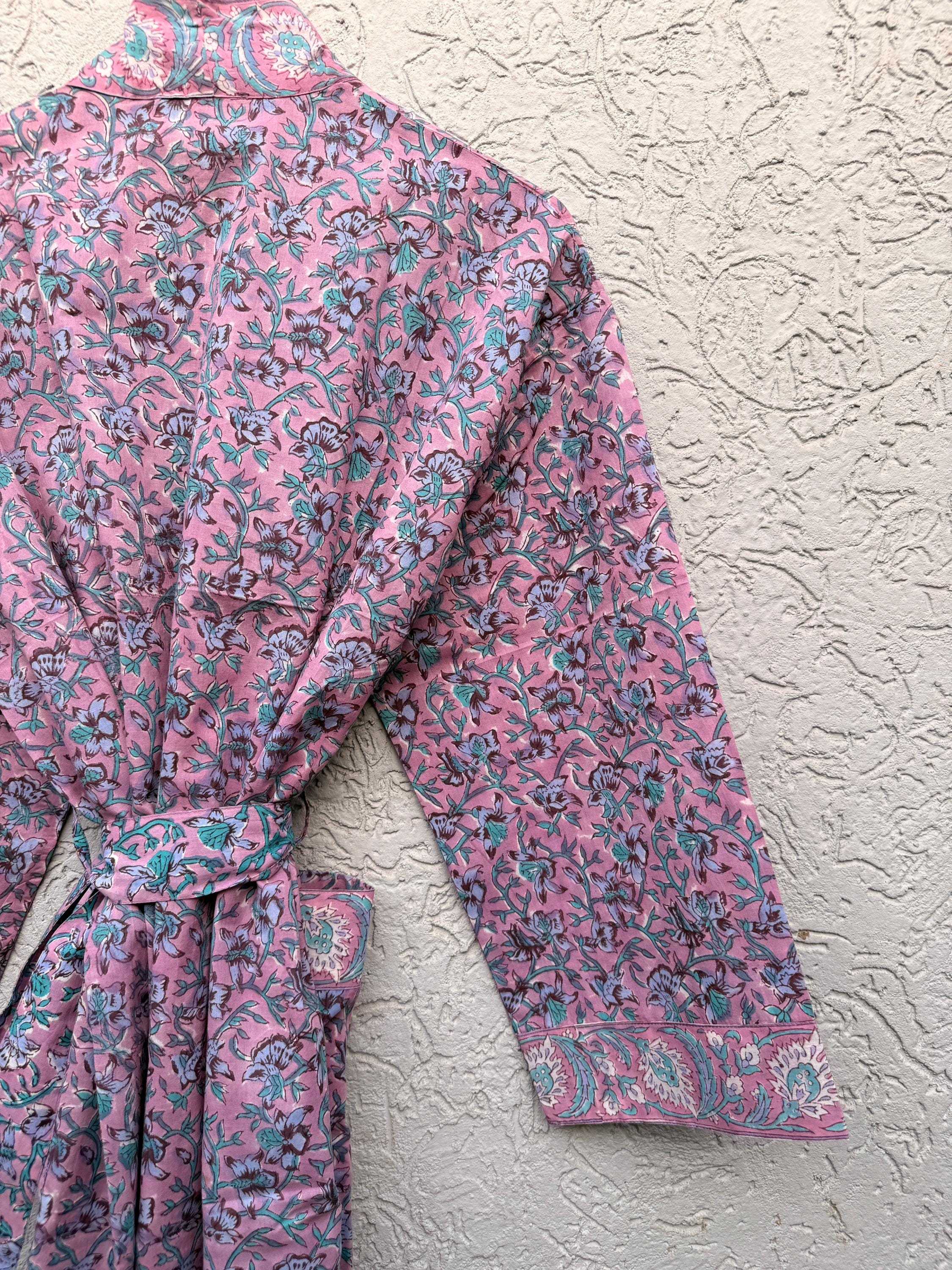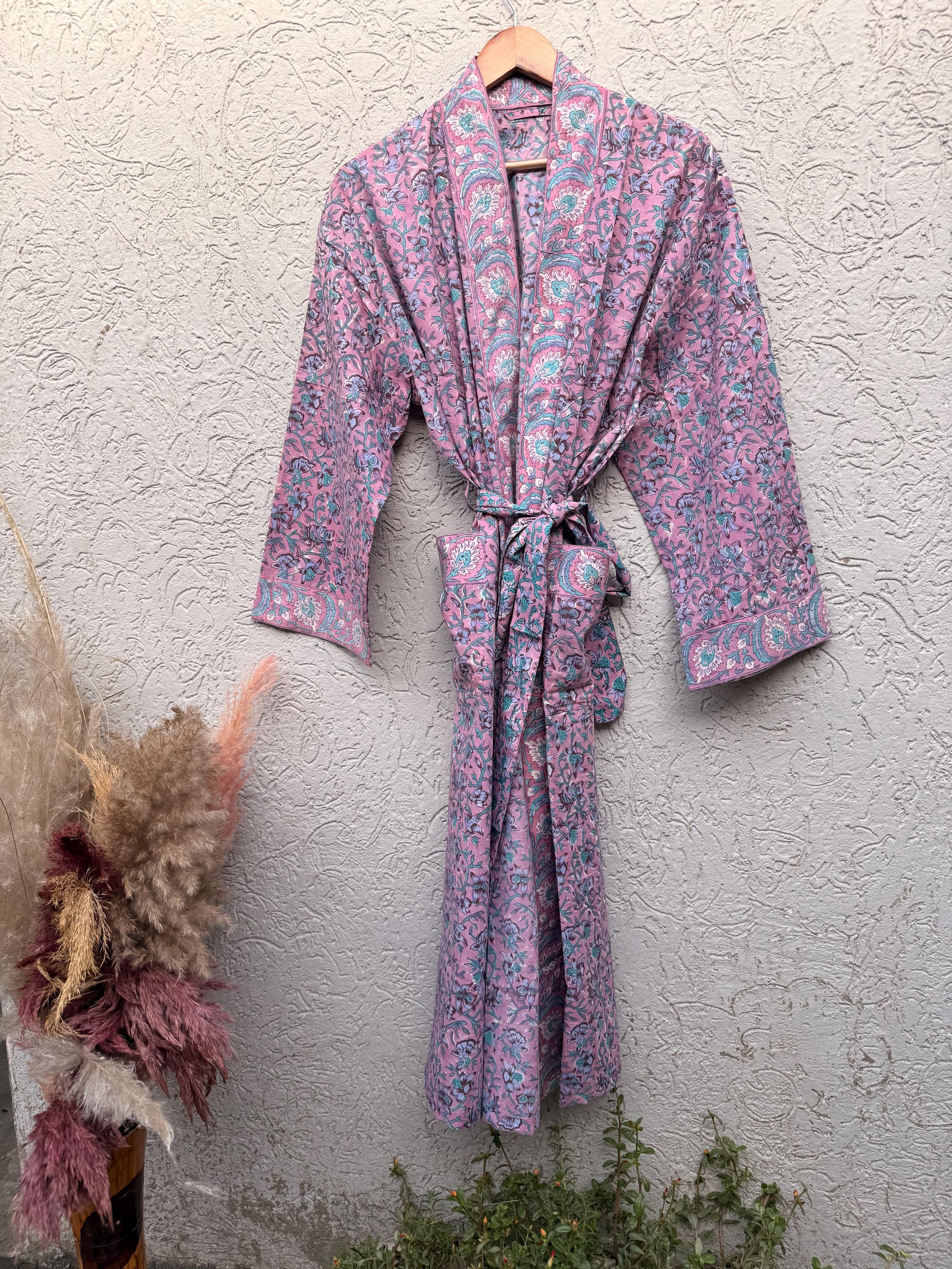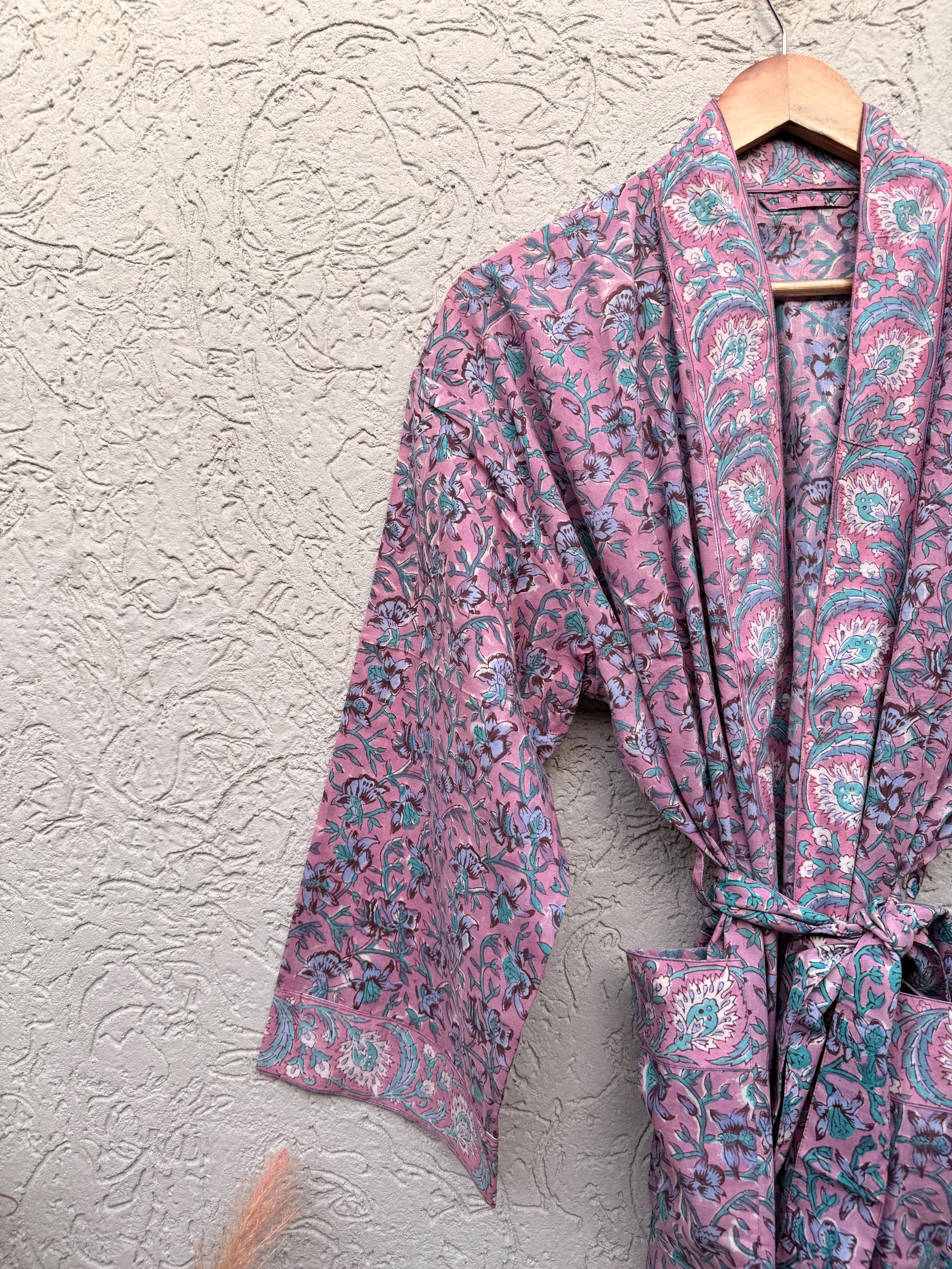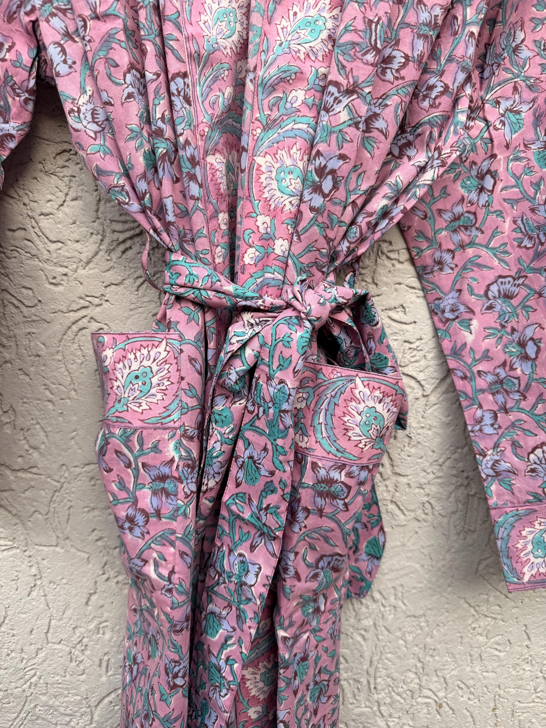 Pink Floral Block Print Cotton Bathrobe | Handmade Indian Robe | Lightweight Kimono Robe | Bridal Getting Ready Robe | Summer Loungewear