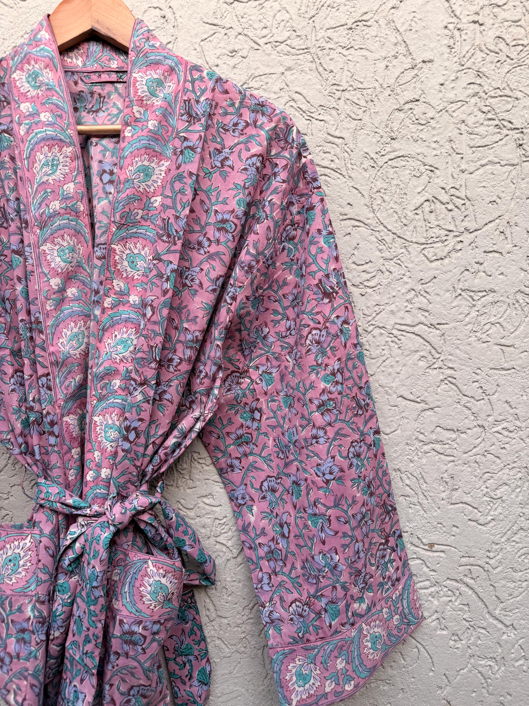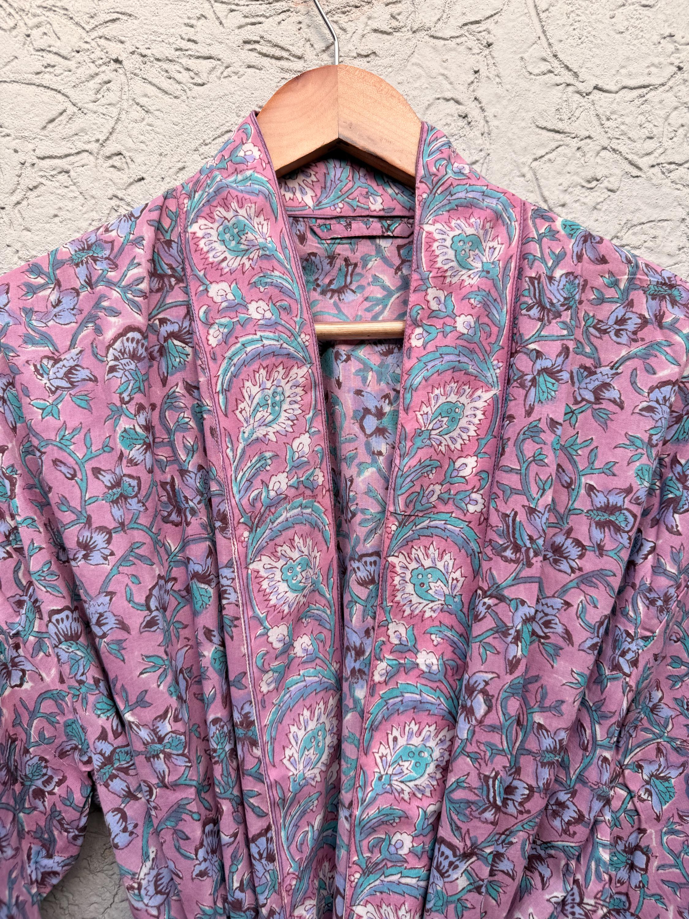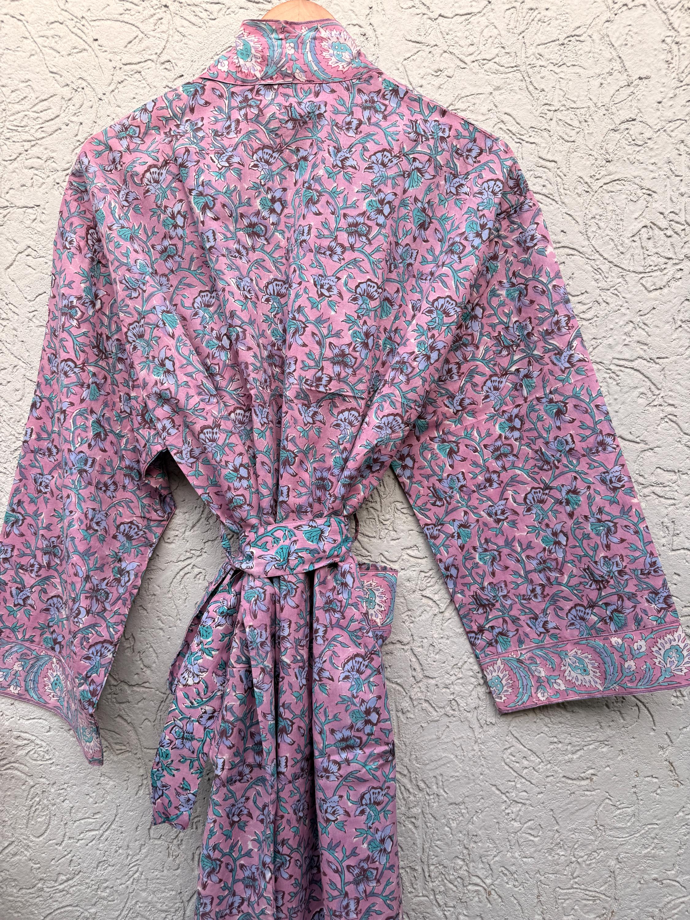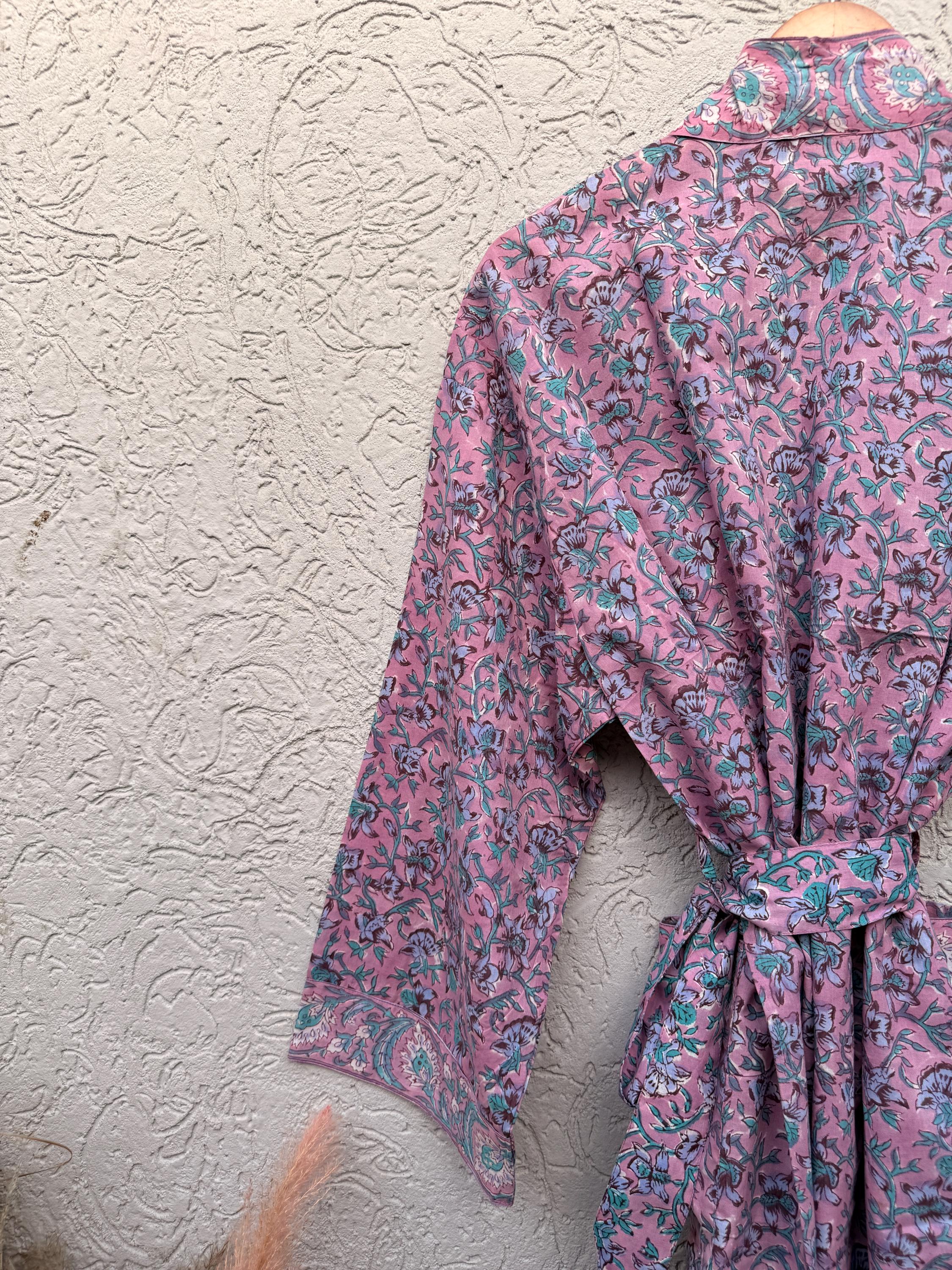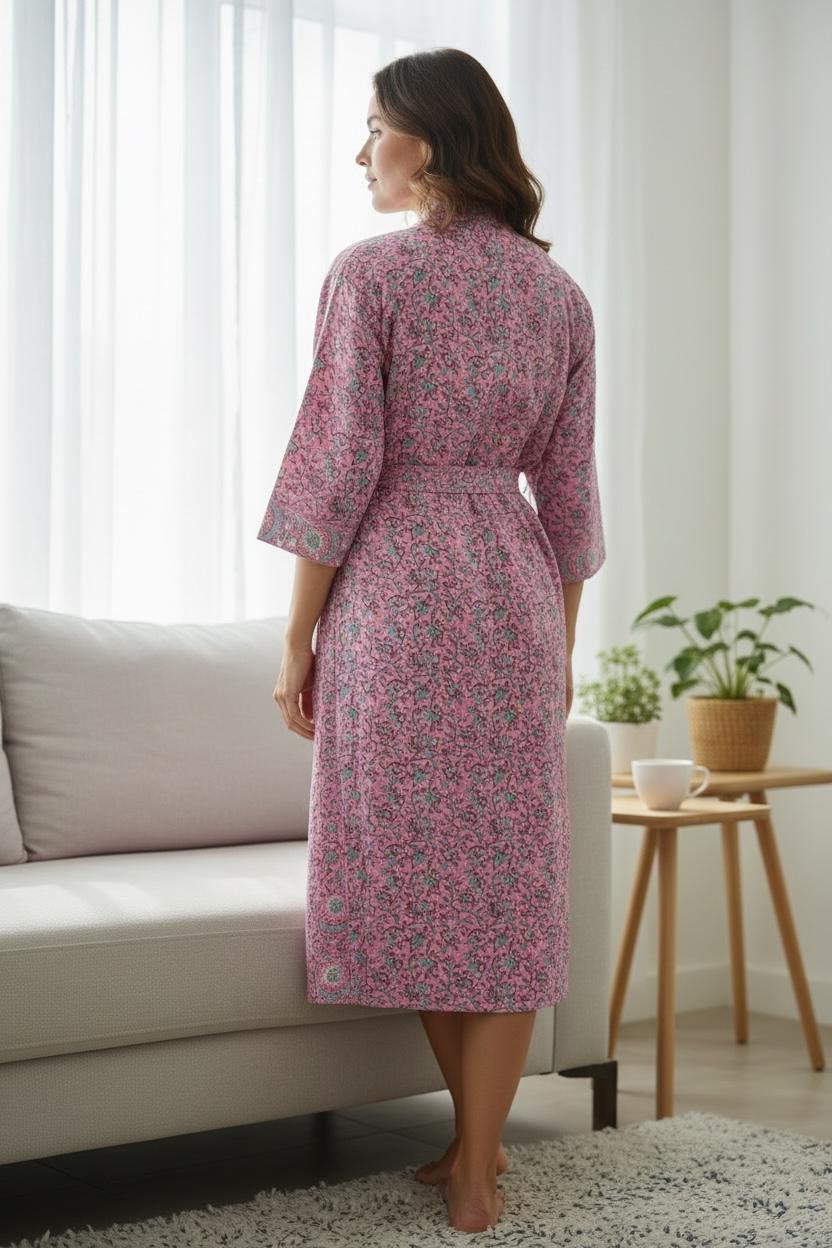 Pink Floral Block Print Cotton Bathrobe | Handmade Indian Robe | Lightweight Kimono Robe | Bridal Getting Ready Robe | Summer Loungewear