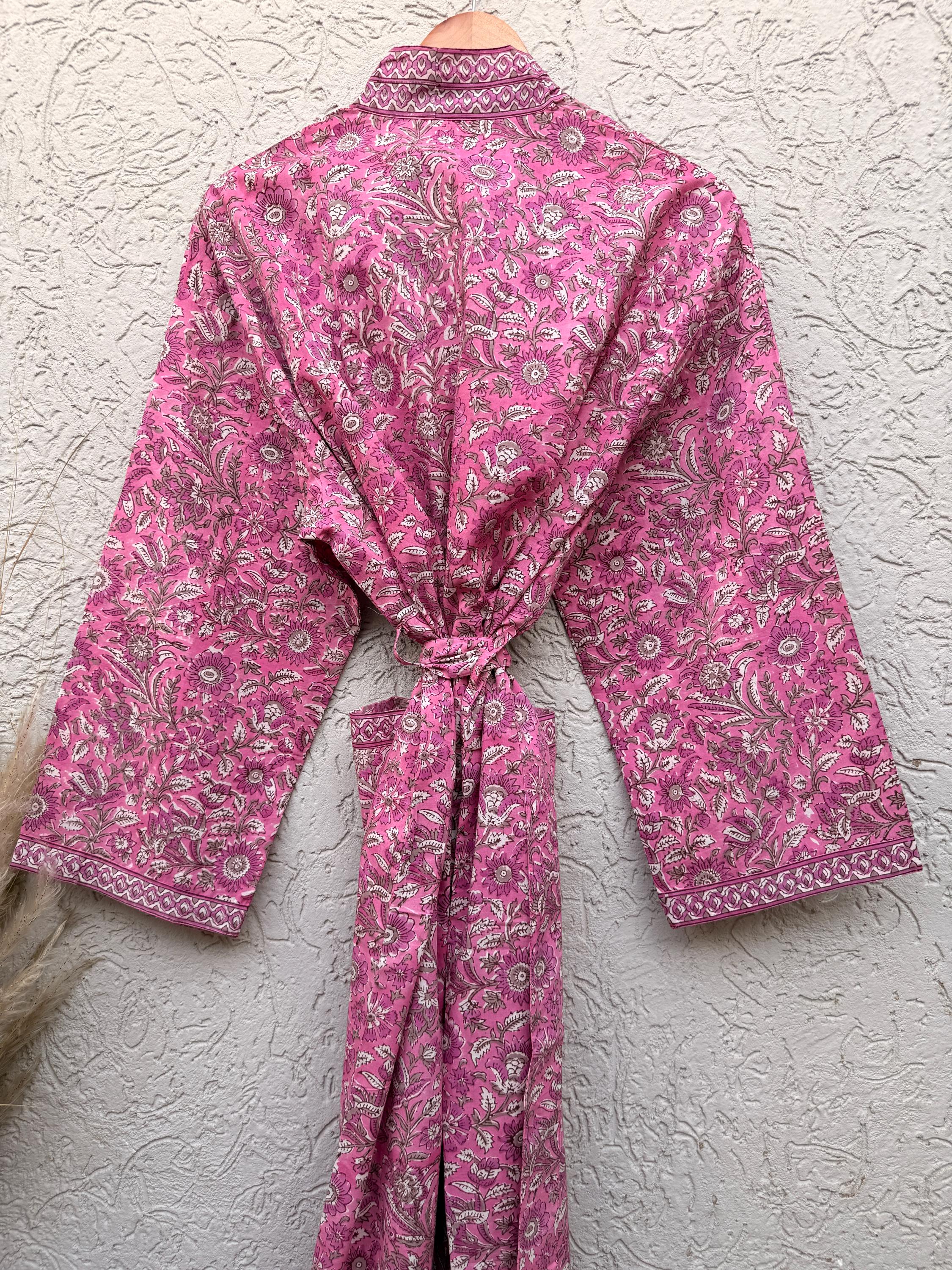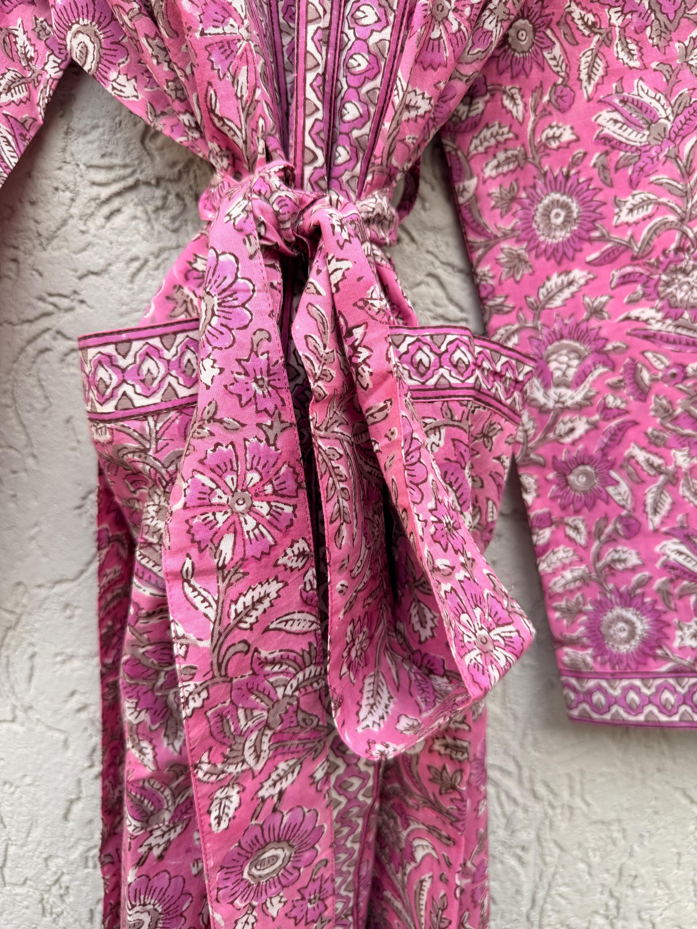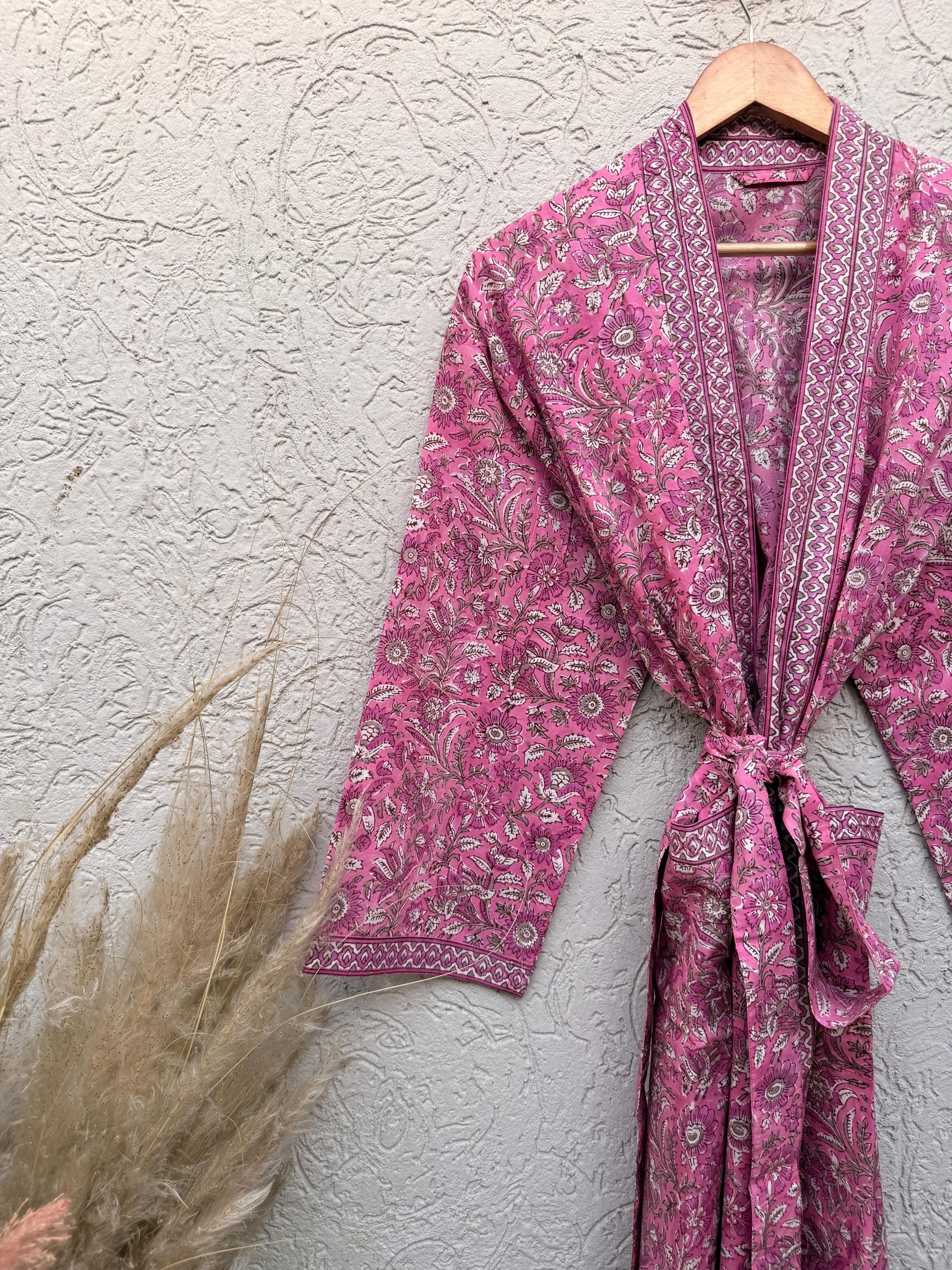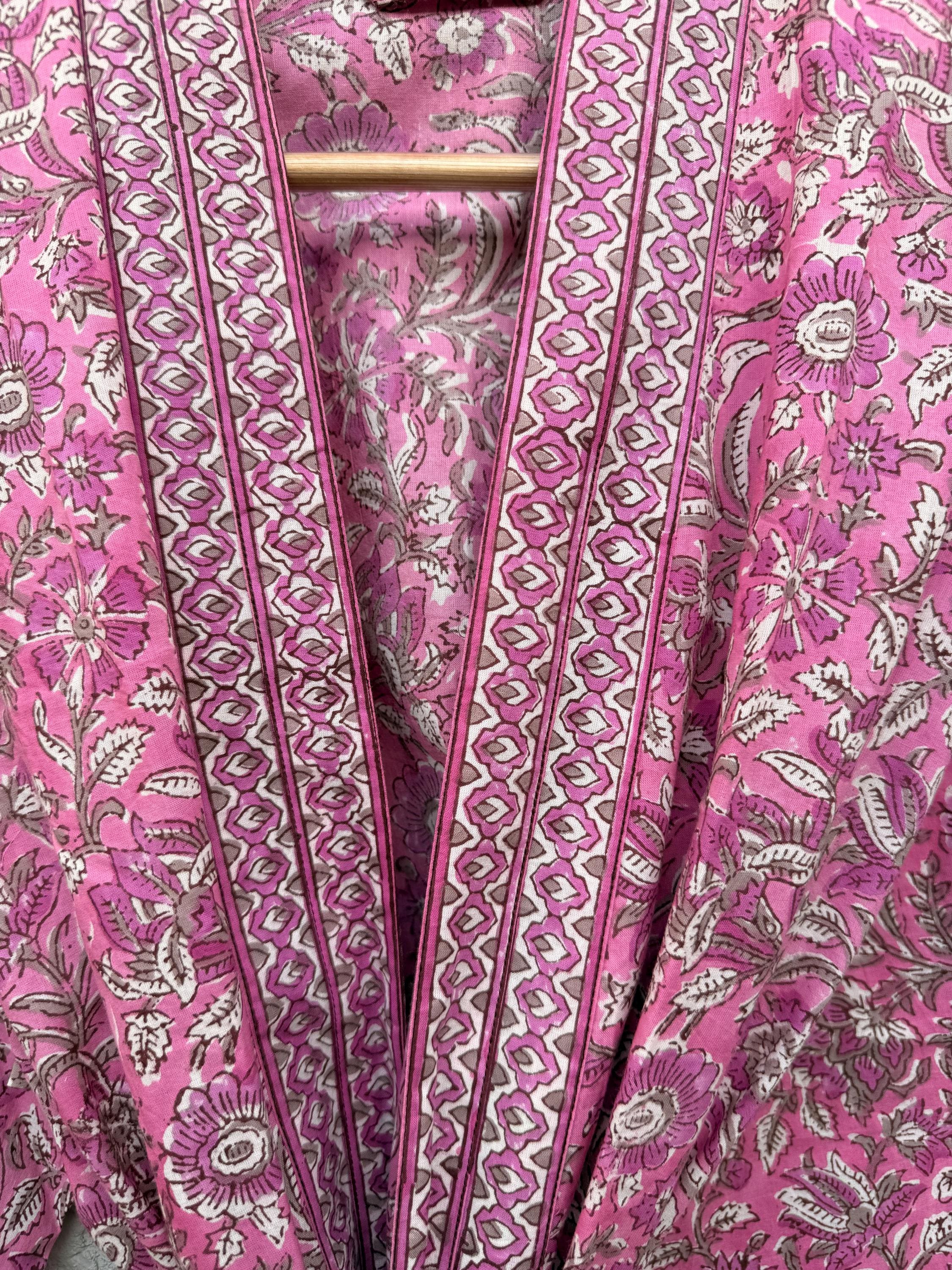 Hand Block Printed Cotton Bathrobe – Pink & White Floral Kimono Robe – Lightweight Boho Dressing Gown – Soft Spa Robe – Summer Loungewear
