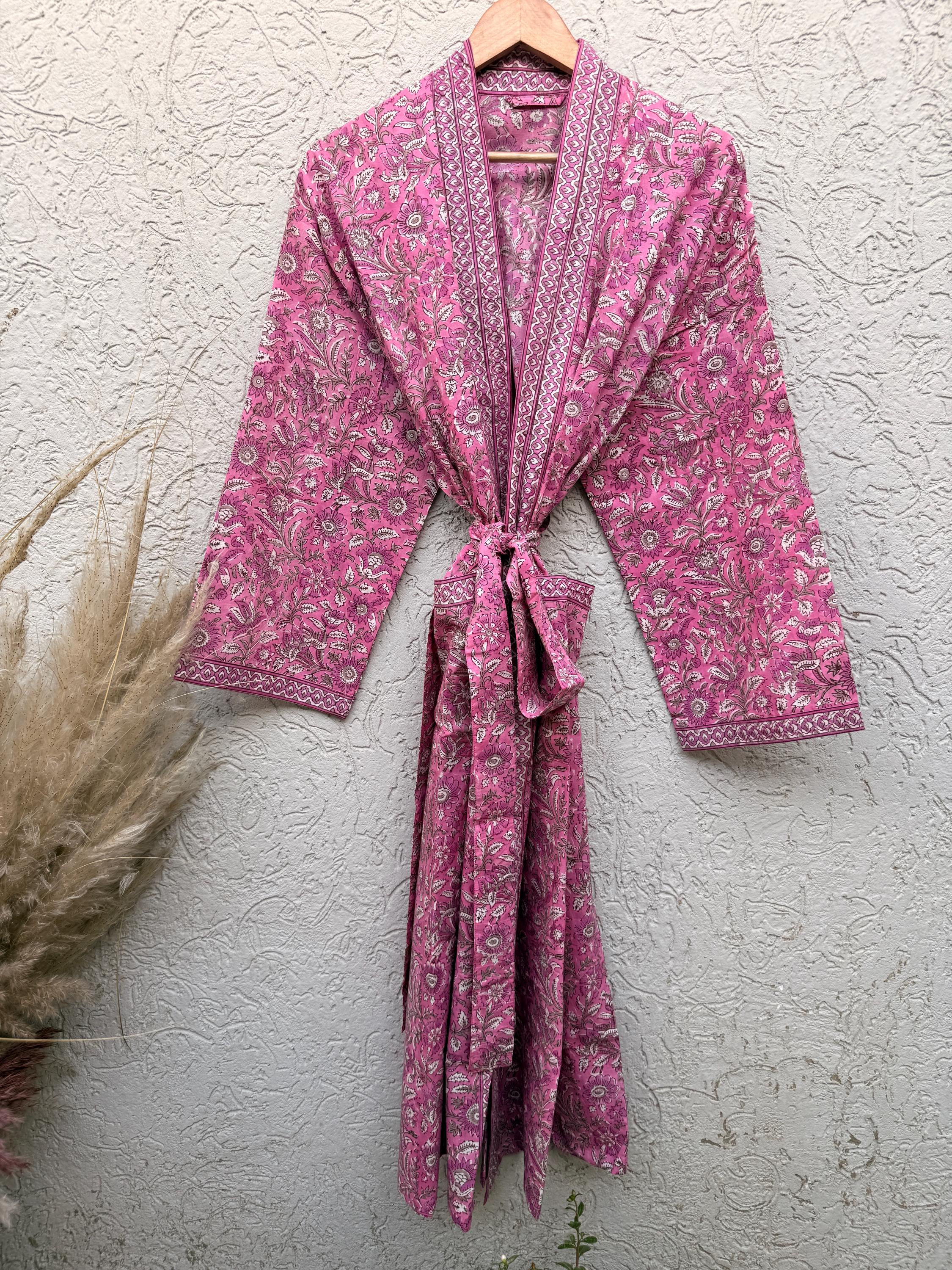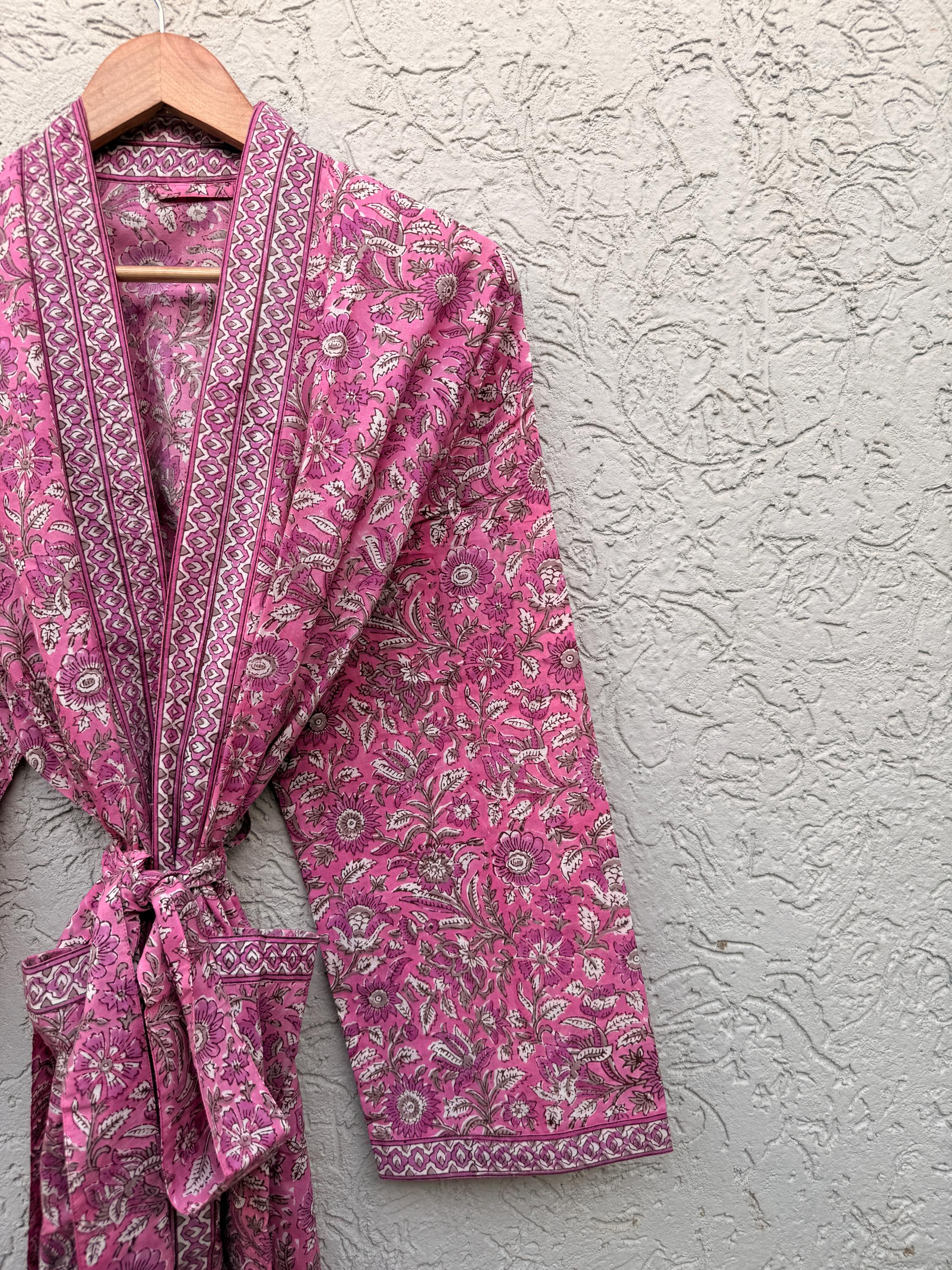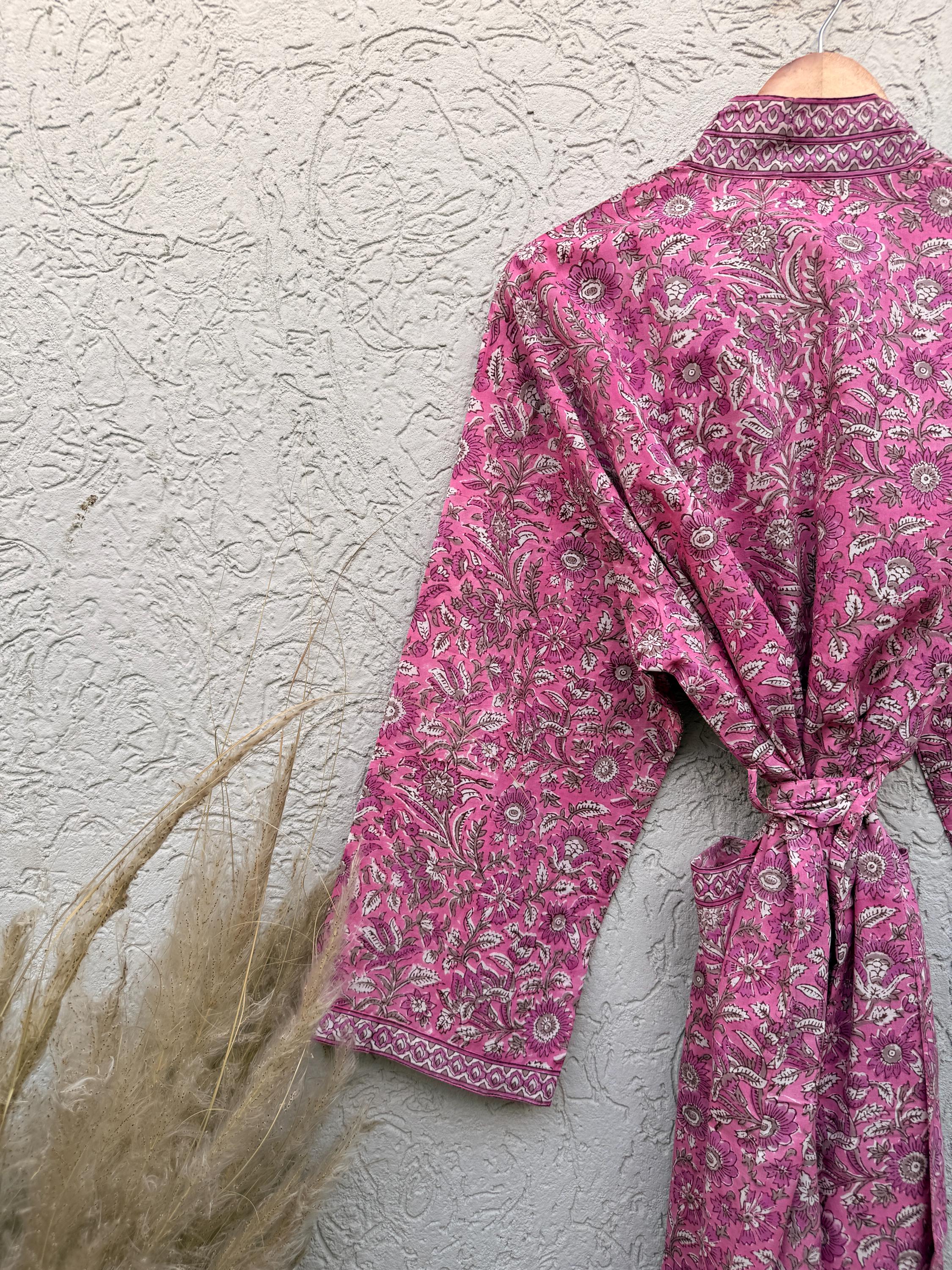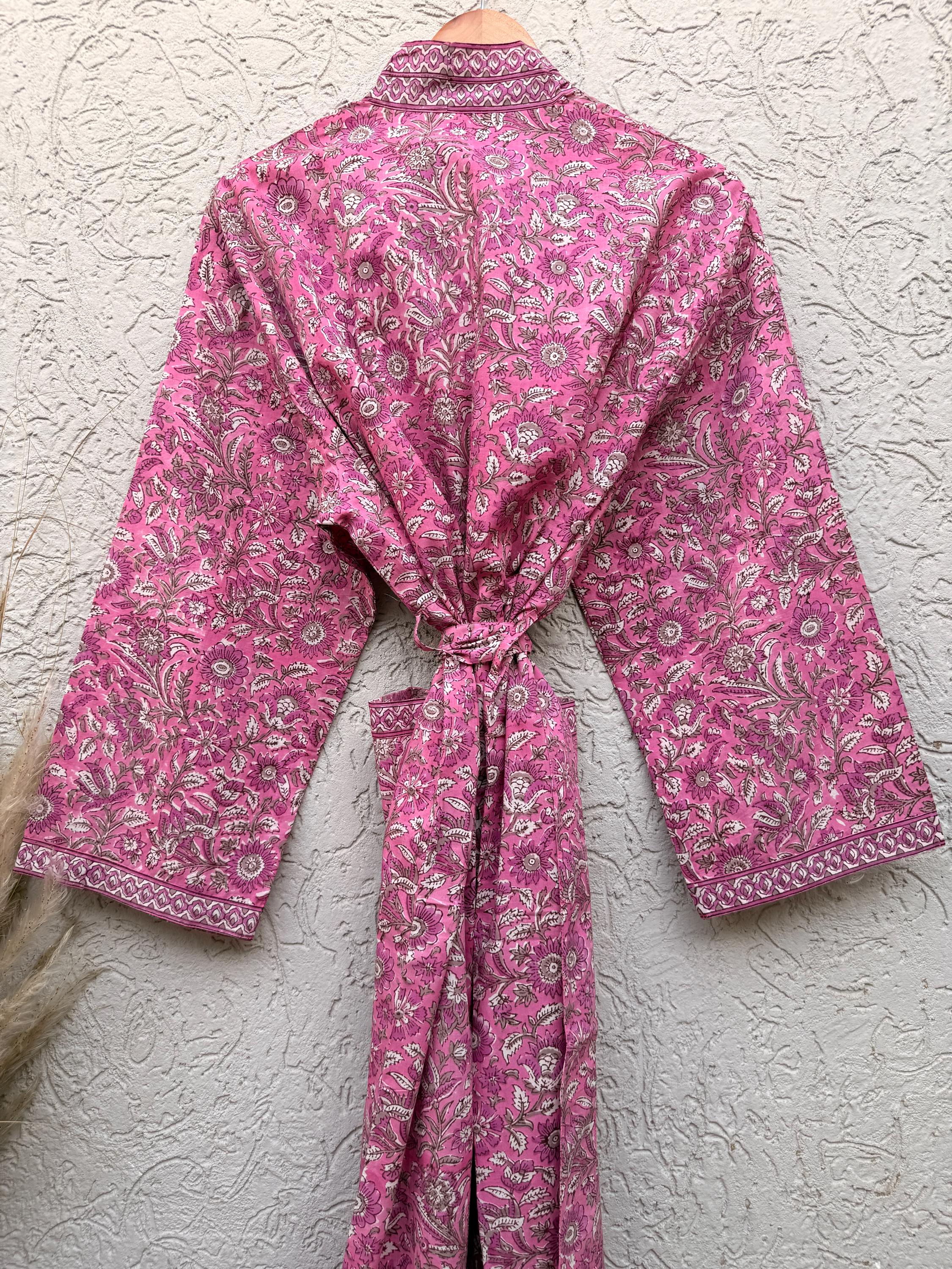 Hand Block Printed Cotton Bathrobe – Pink & White Floral Kimono Robe – Lightweight Boho Dressing Gown – Soft Spa Robe – Summer Loungewear