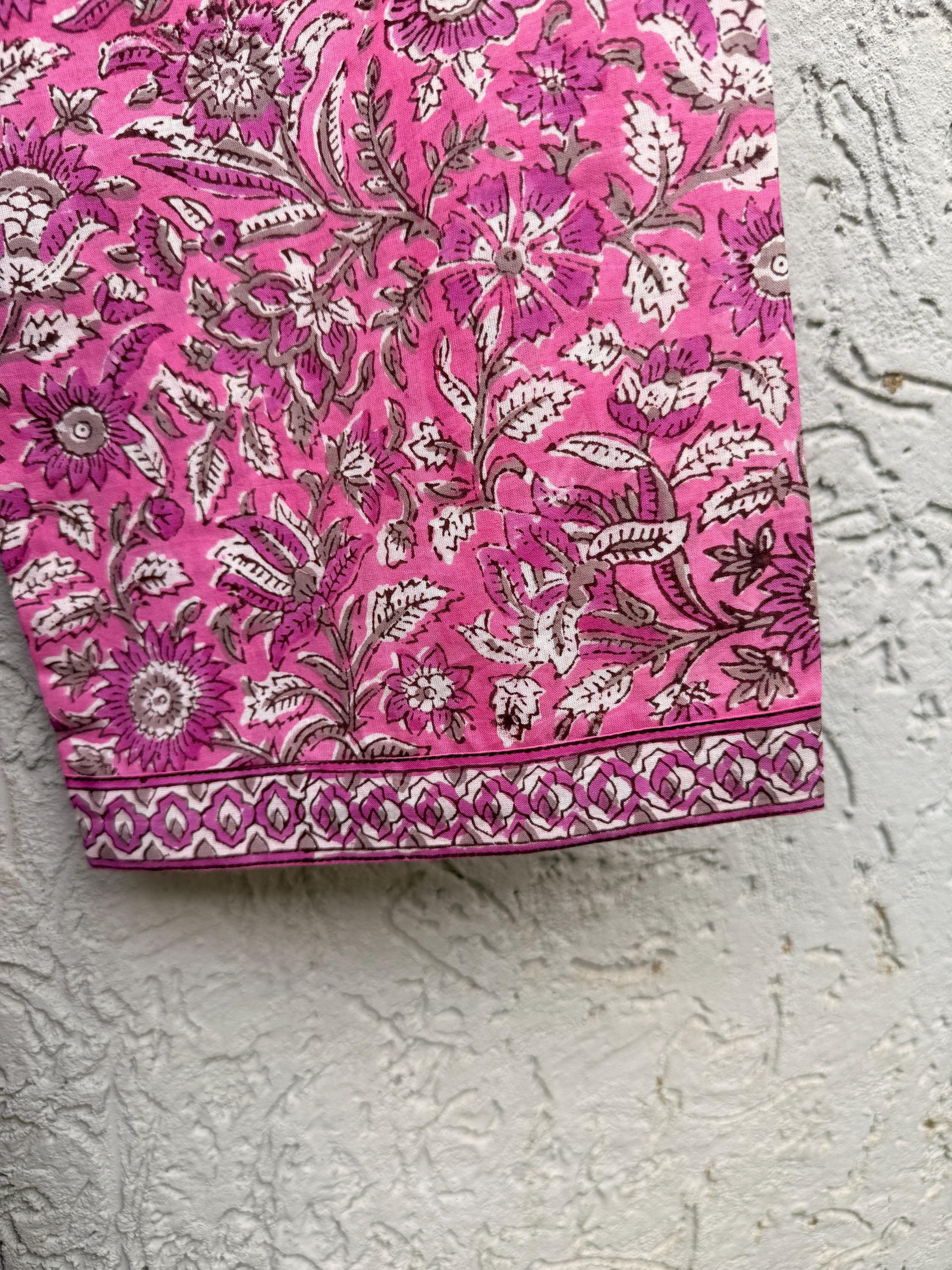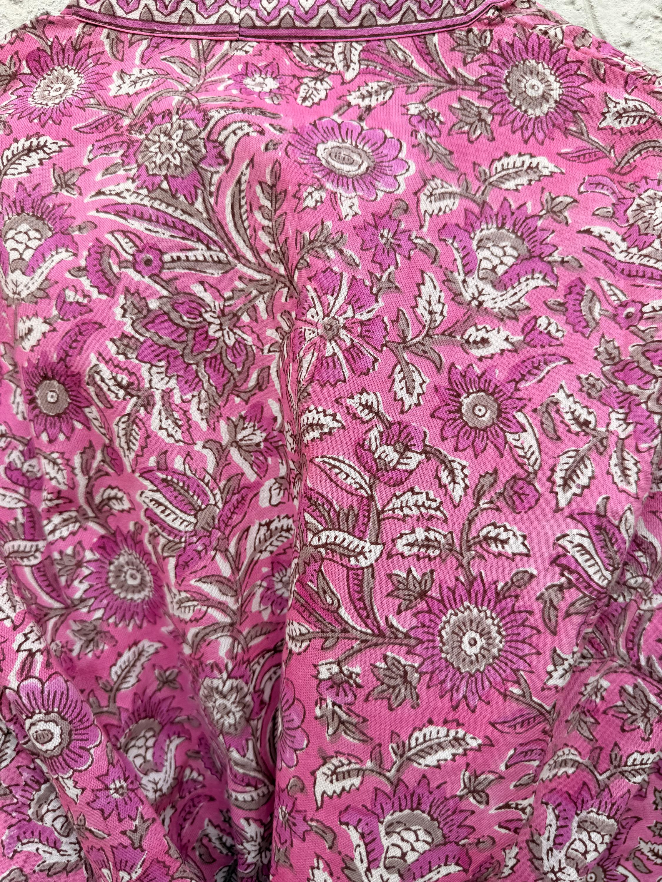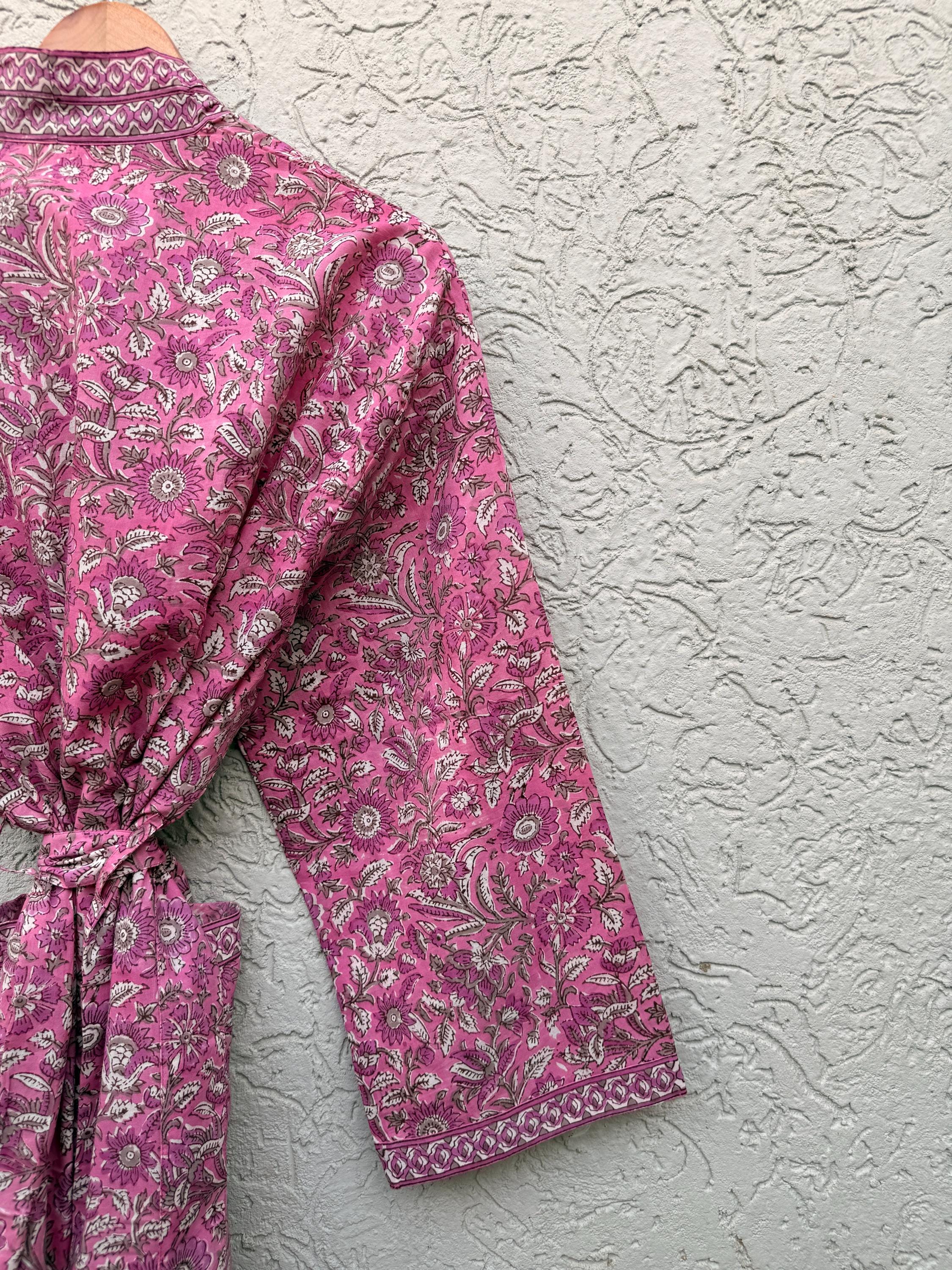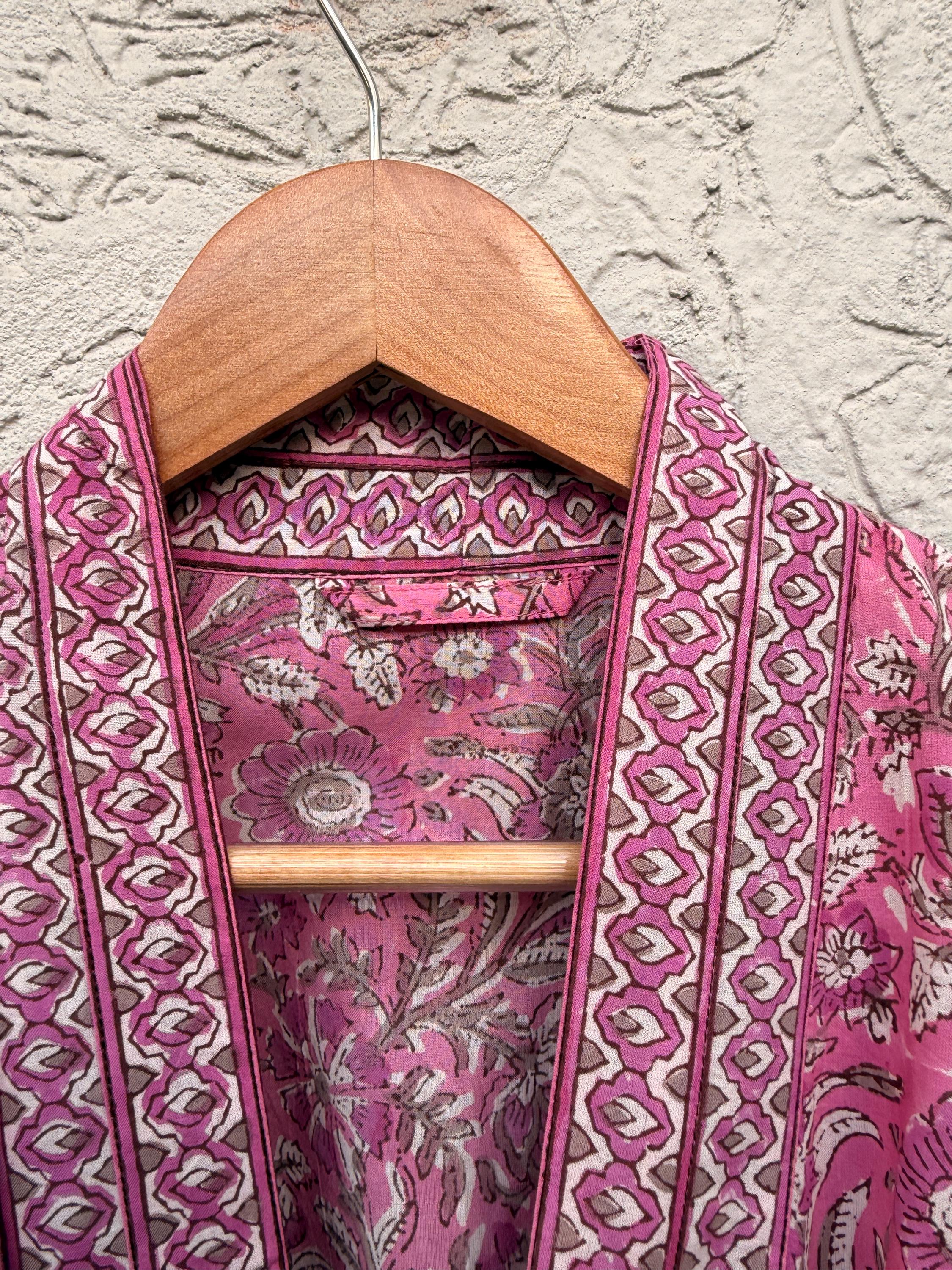 Hand Block Printed Cotton Bathrobe – Pink & White Floral Kimono Robe – Lightweight Boho Dressing Gown – Soft Spa Robe – Summer Loungewear