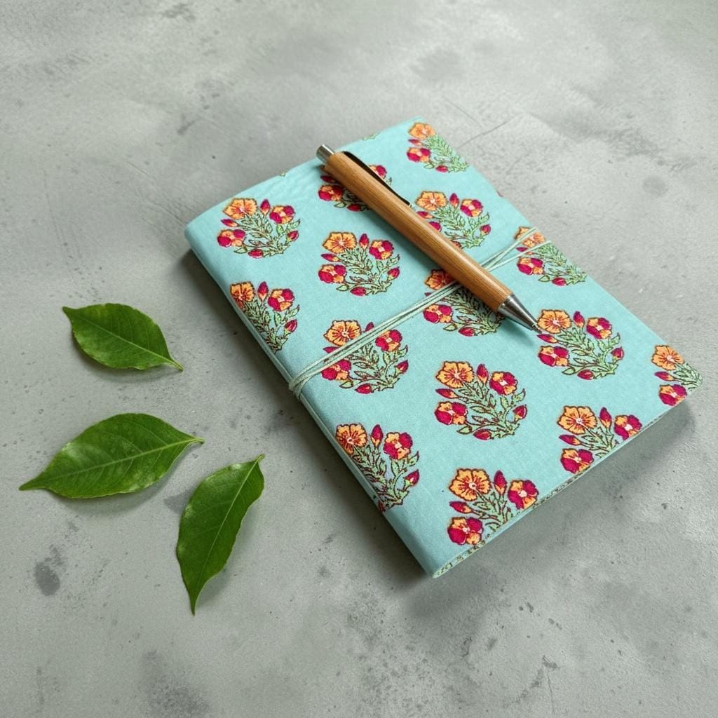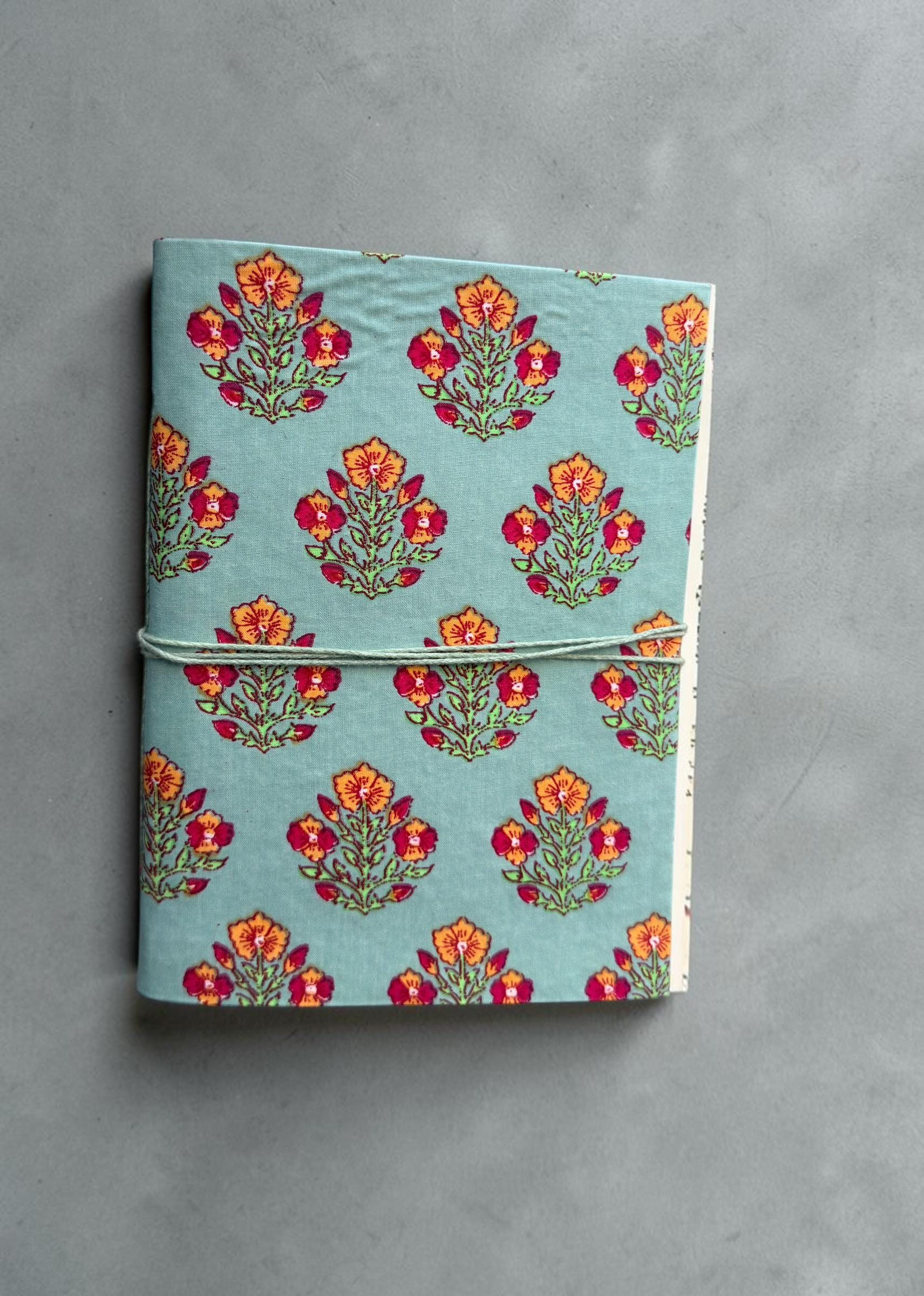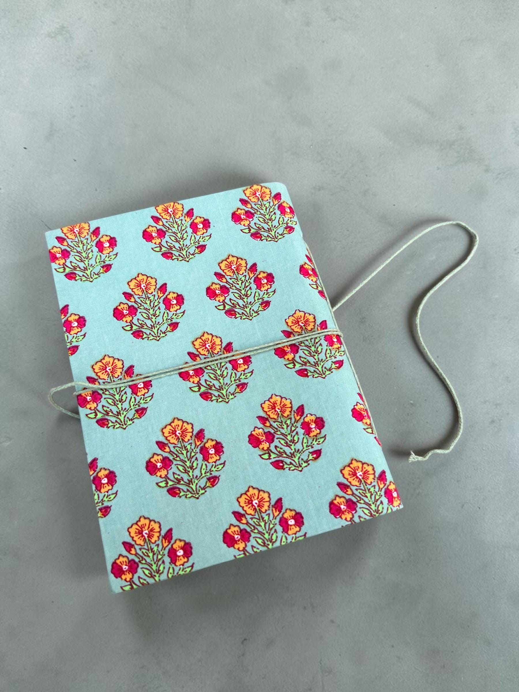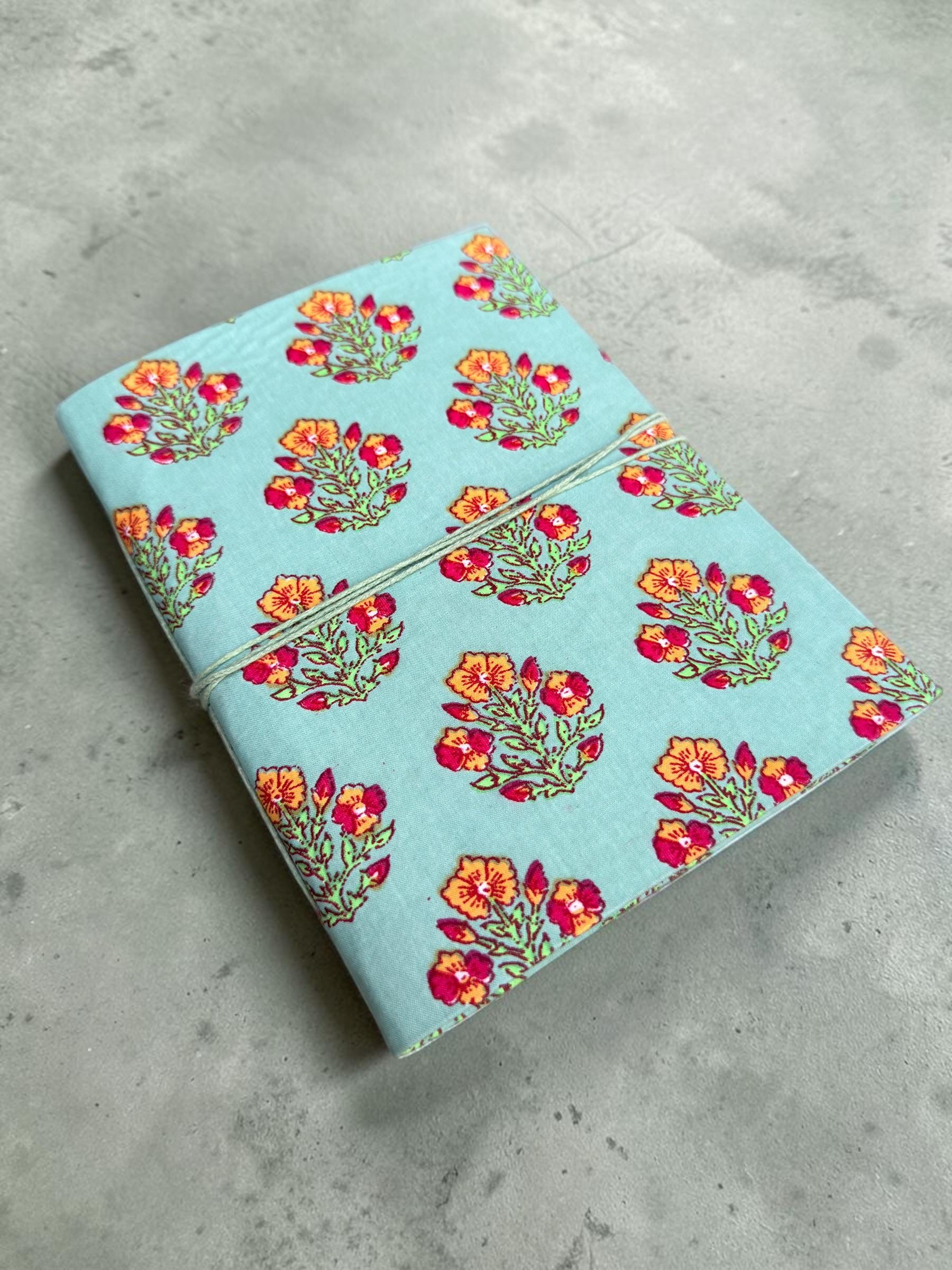 Handmade Floral Block Print Diary | Cotton Fabric Journal | Light Blue Notebook | Travel Journal | Artisan Handmade Gift for Writers