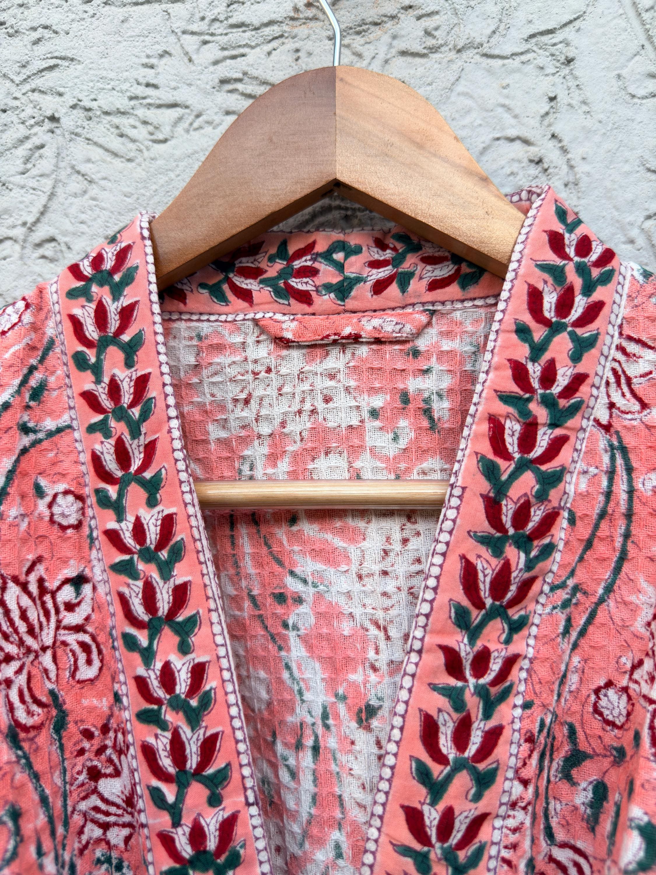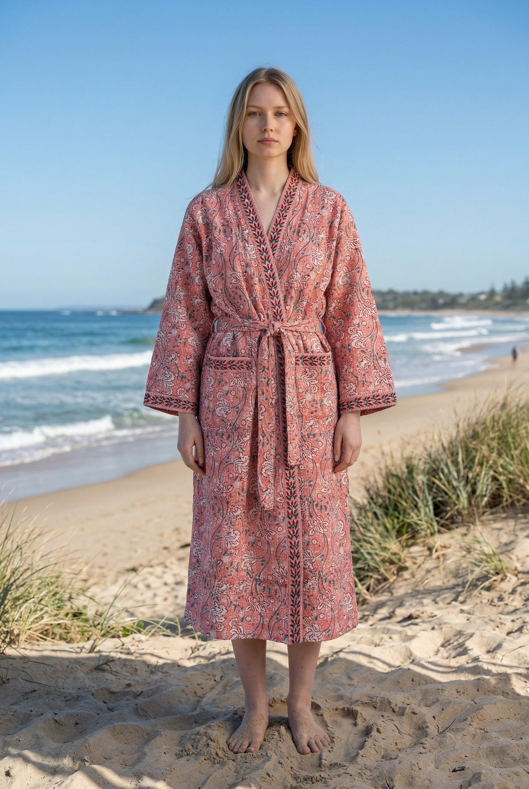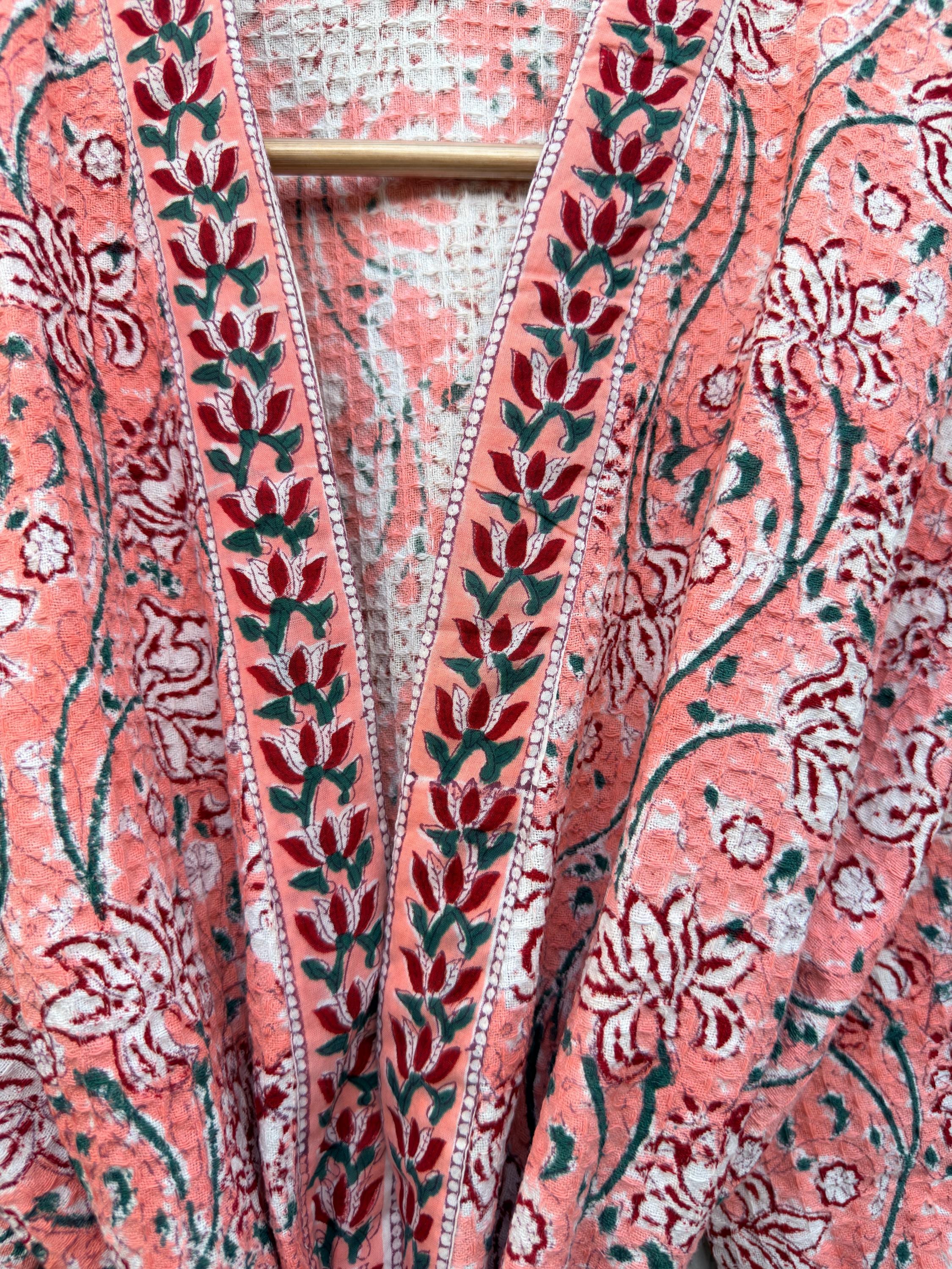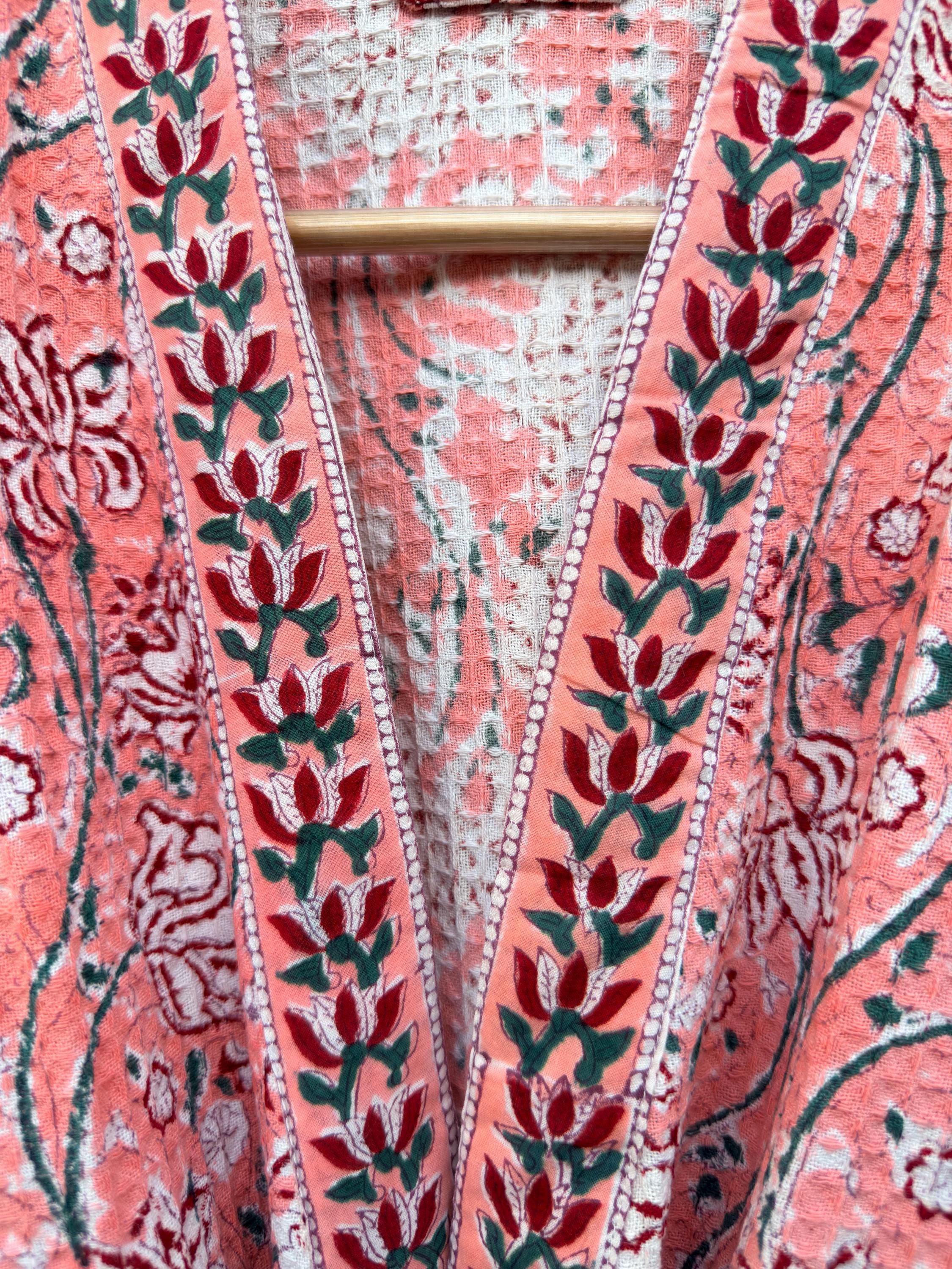 Wrap yourself in timeless elegance with this handcrafted block print cotton waffle kaftan robe, designed for comfort, beauty, and everyday luxury. Made using traditional Indian hand block printing techniques, this robe showcases a stunning coral pink base adorned with delicate floral motifs in soft ivory and earthy green tones.