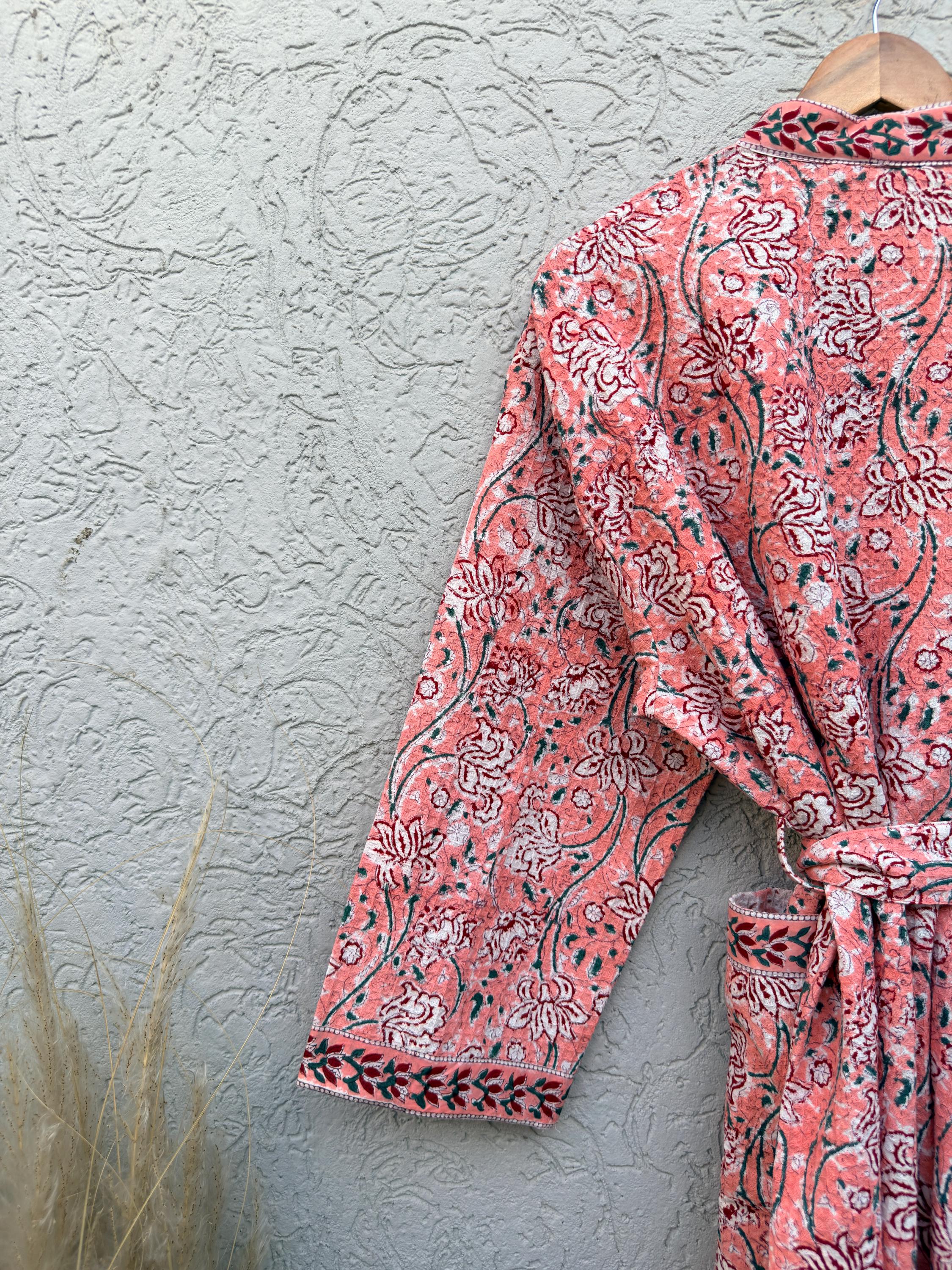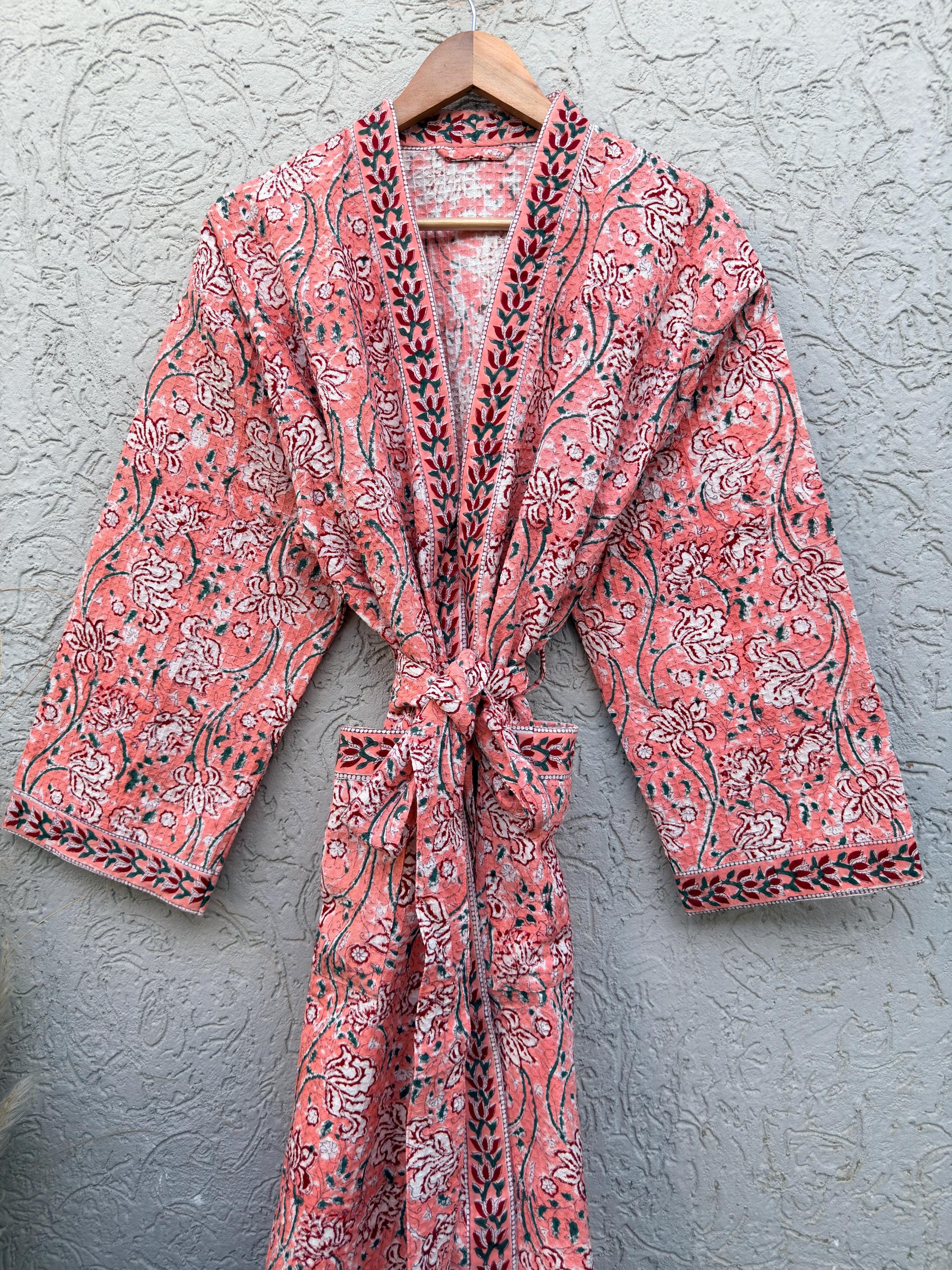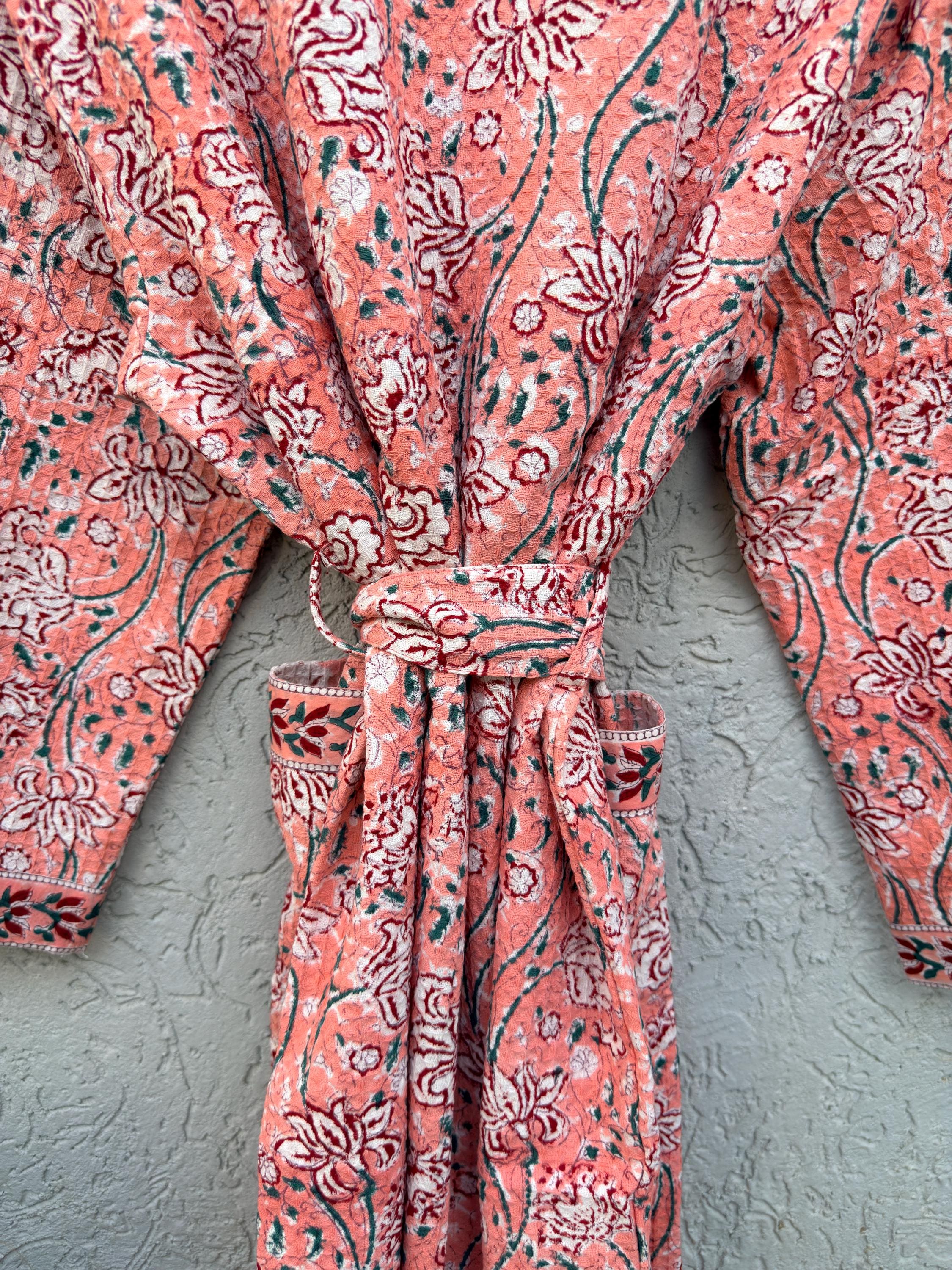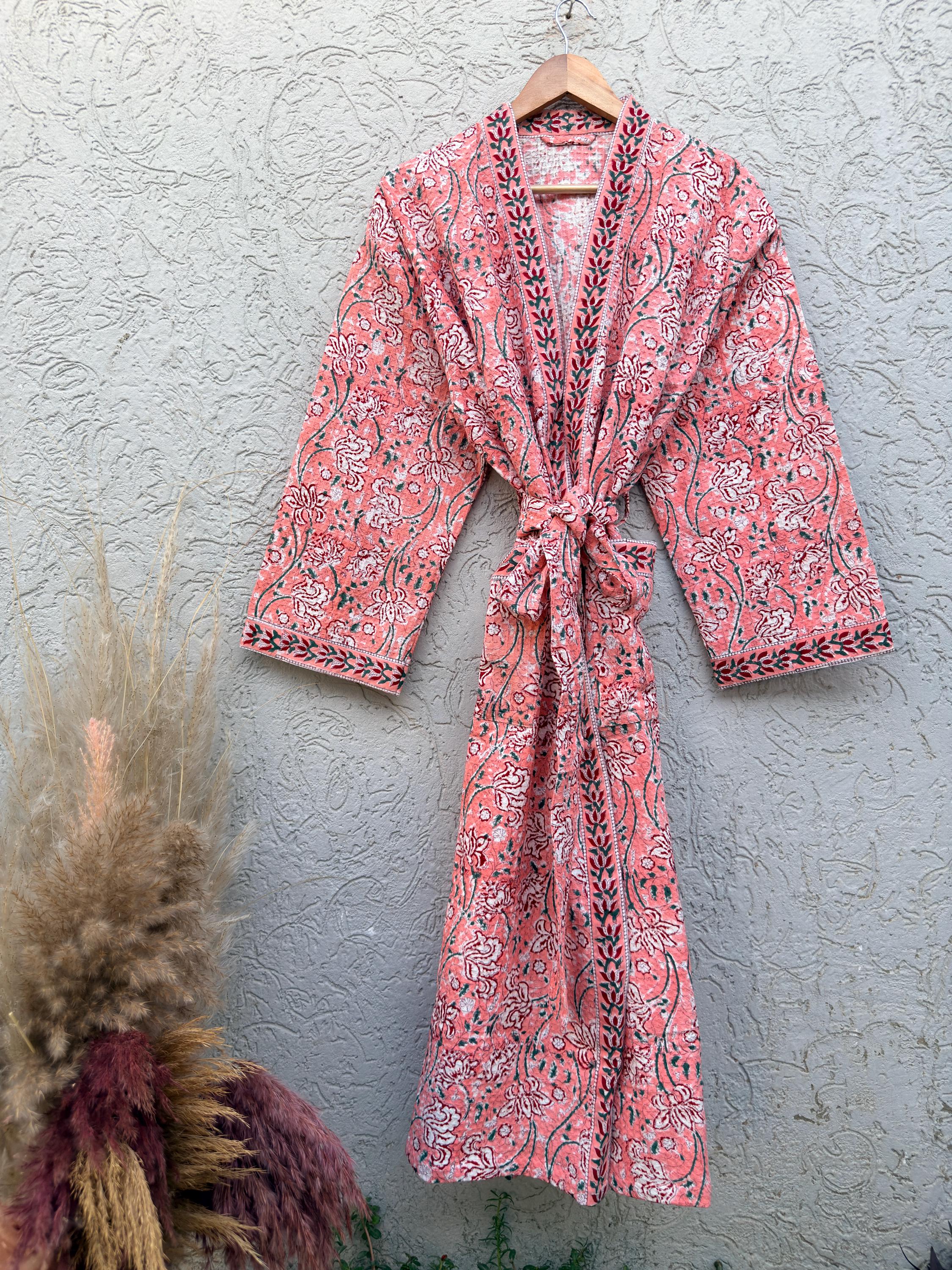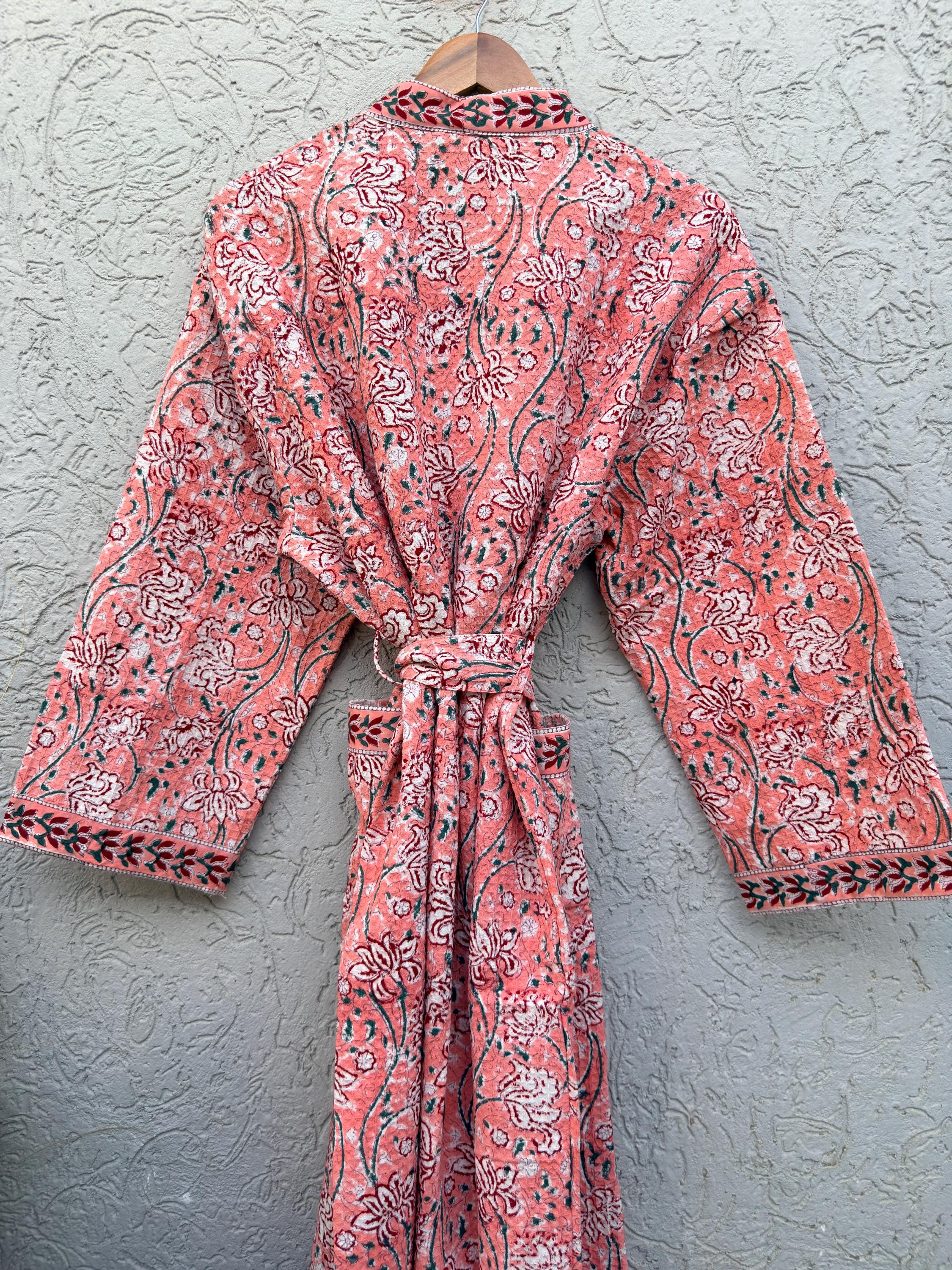 Wrap yourself in timeless elegance with this handcrafted block print cotton waffle kaftan robe, designed for comfort, beauty, and everyday luxury. Made using traditional Indian hand block printing techniques, this robe showcases a stunning coral pink base adorned with delicate floral motifs in soft ivory and earthy green tones.