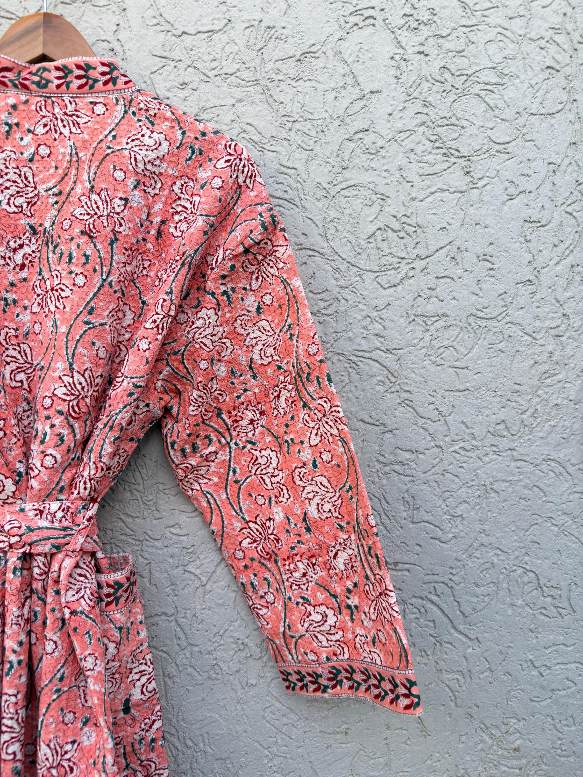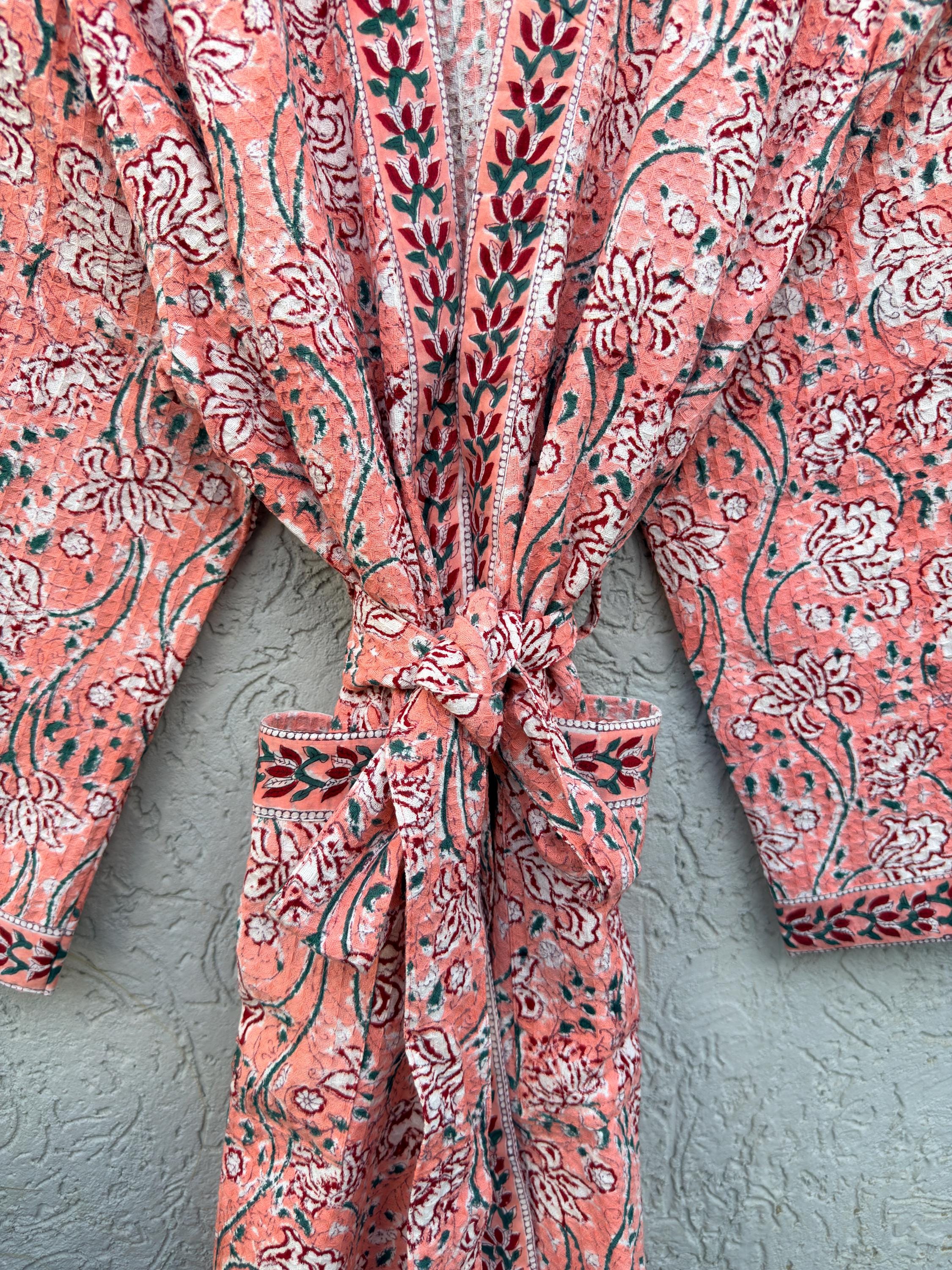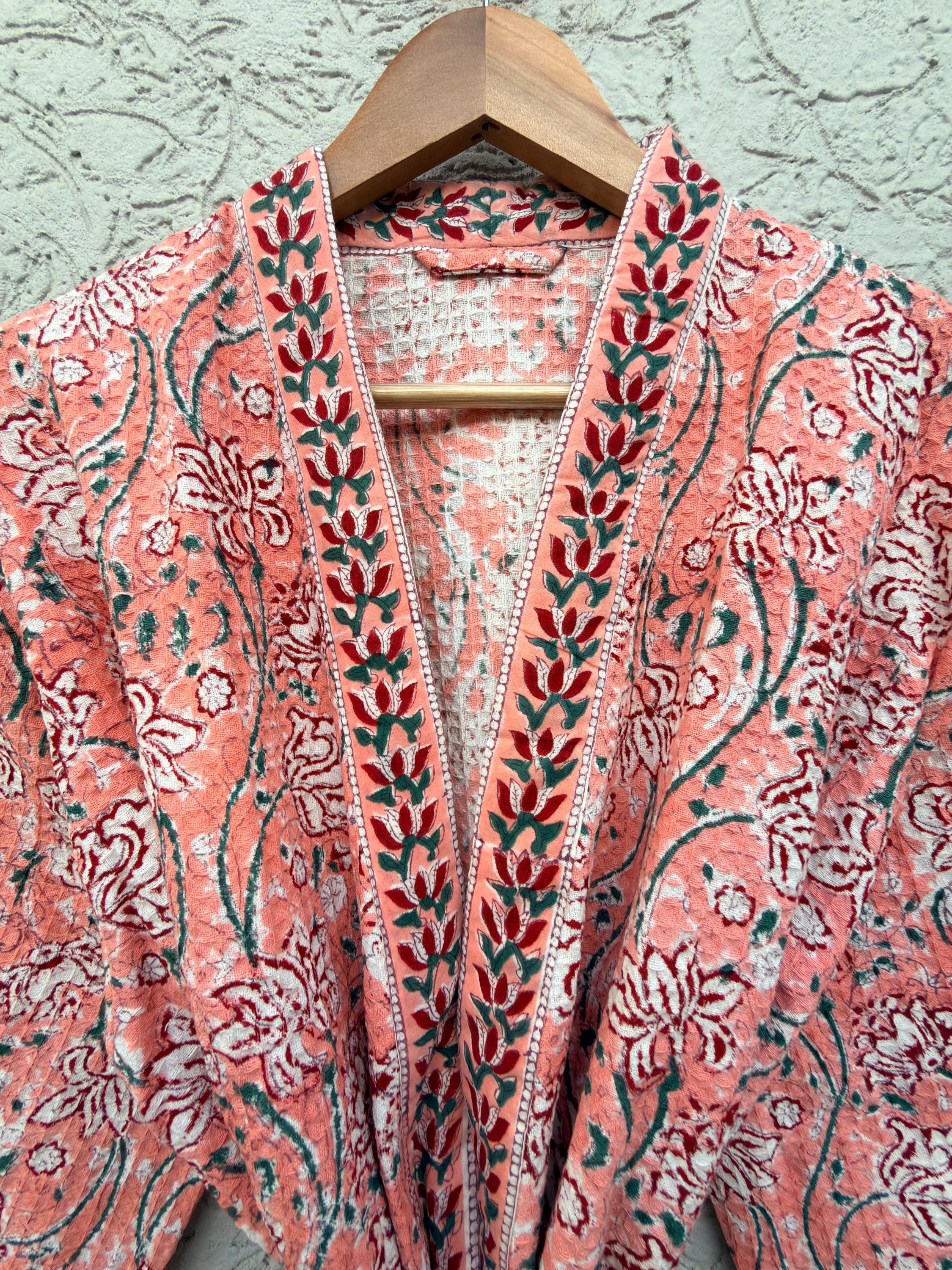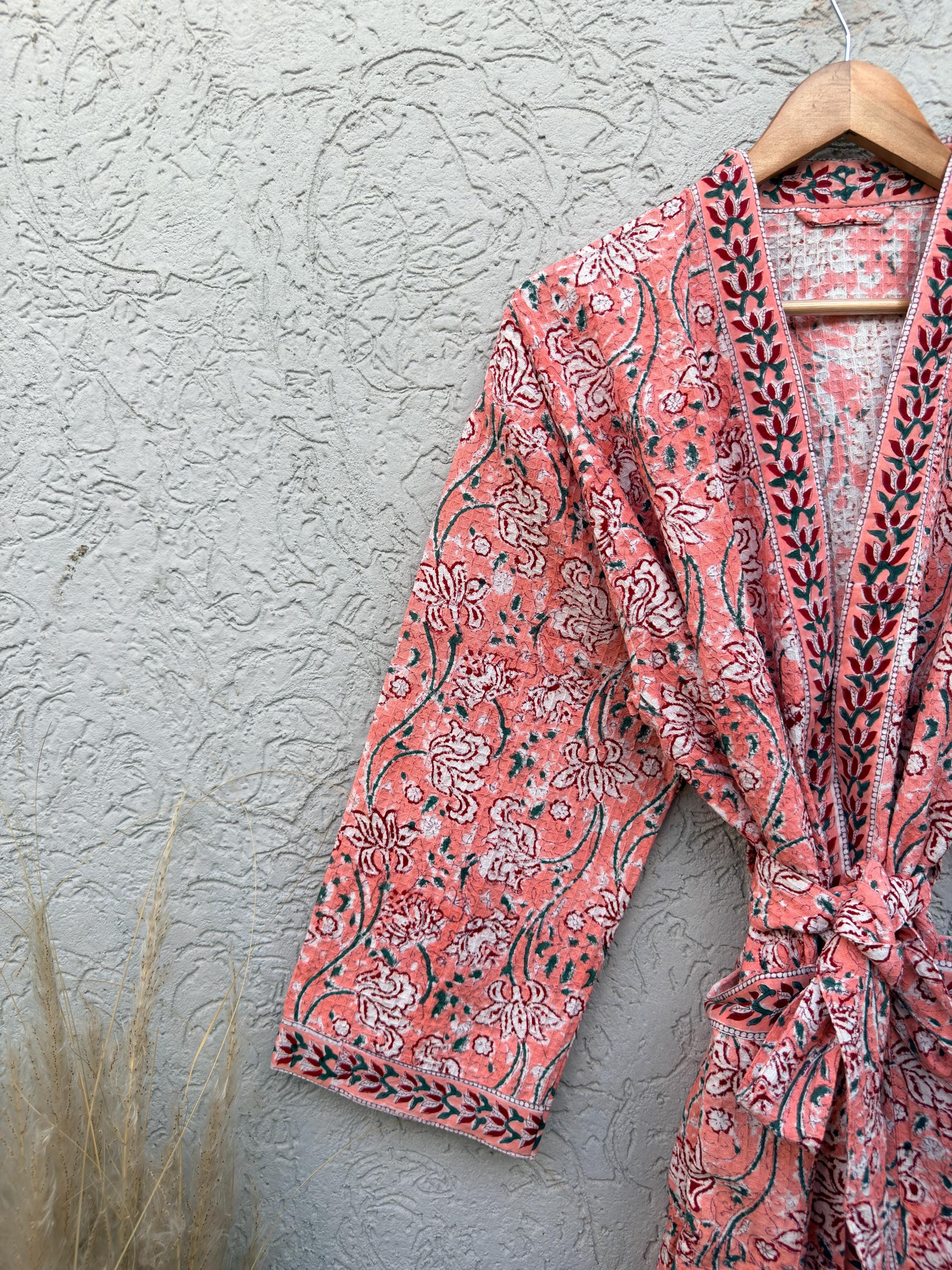 Wrap yourself in timeless elegance with this handcrafted block print cotton waffle kaftan robe, designed for comfort, beauty, and everyday luxury. Made using traditional Indian hand block printing techniques, this robe showcases a stunning coral pink base adorned with delicate floral motifs in soft ivory and earthy green tones.