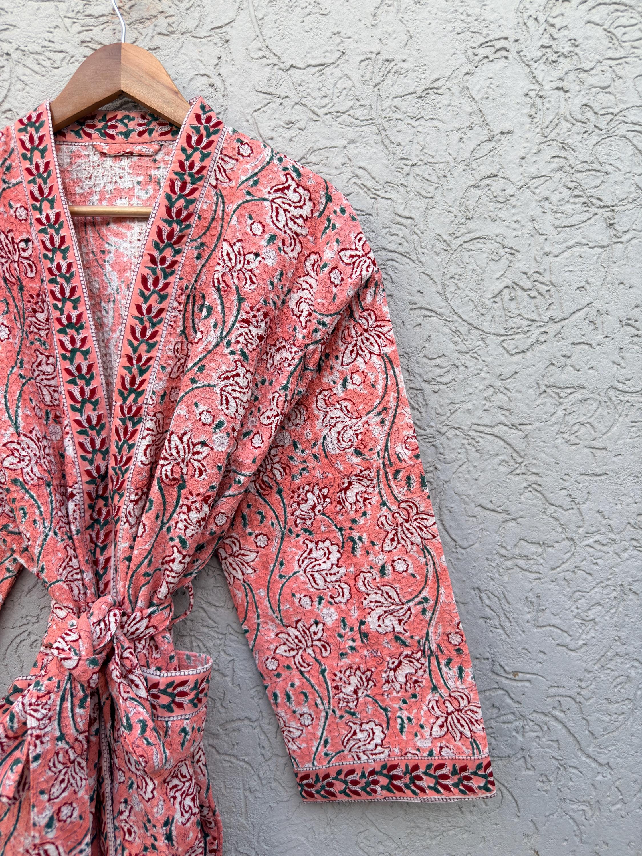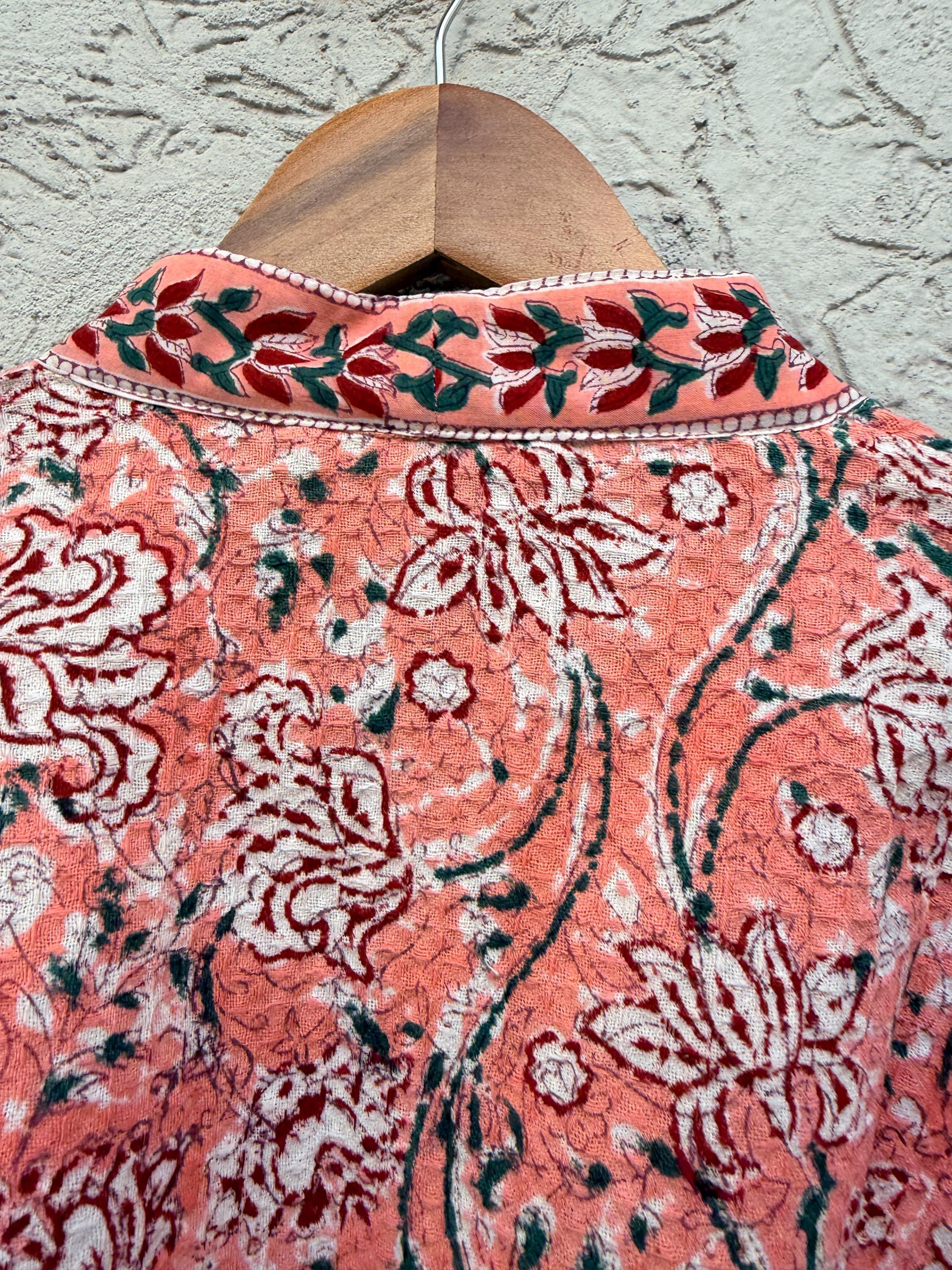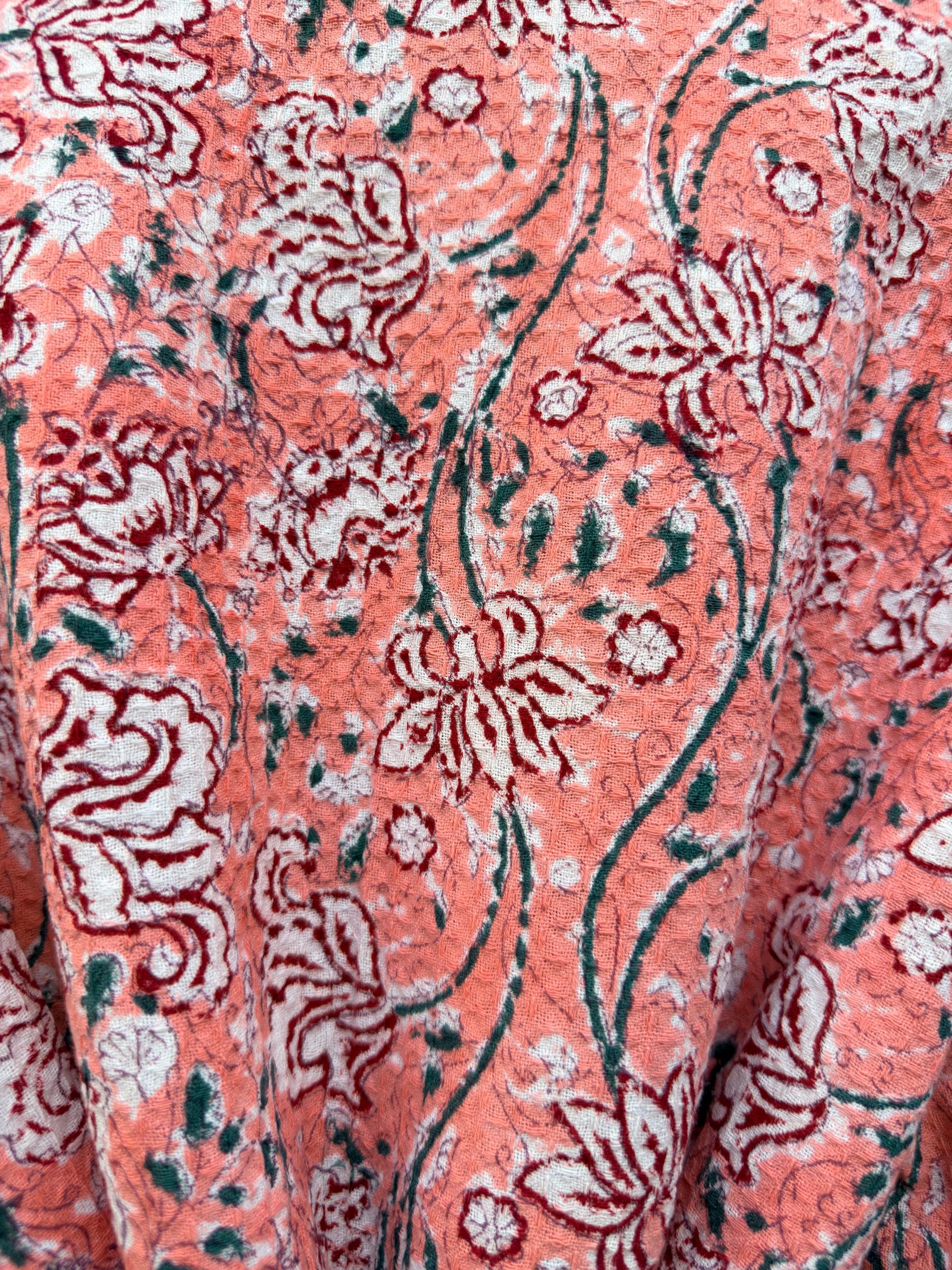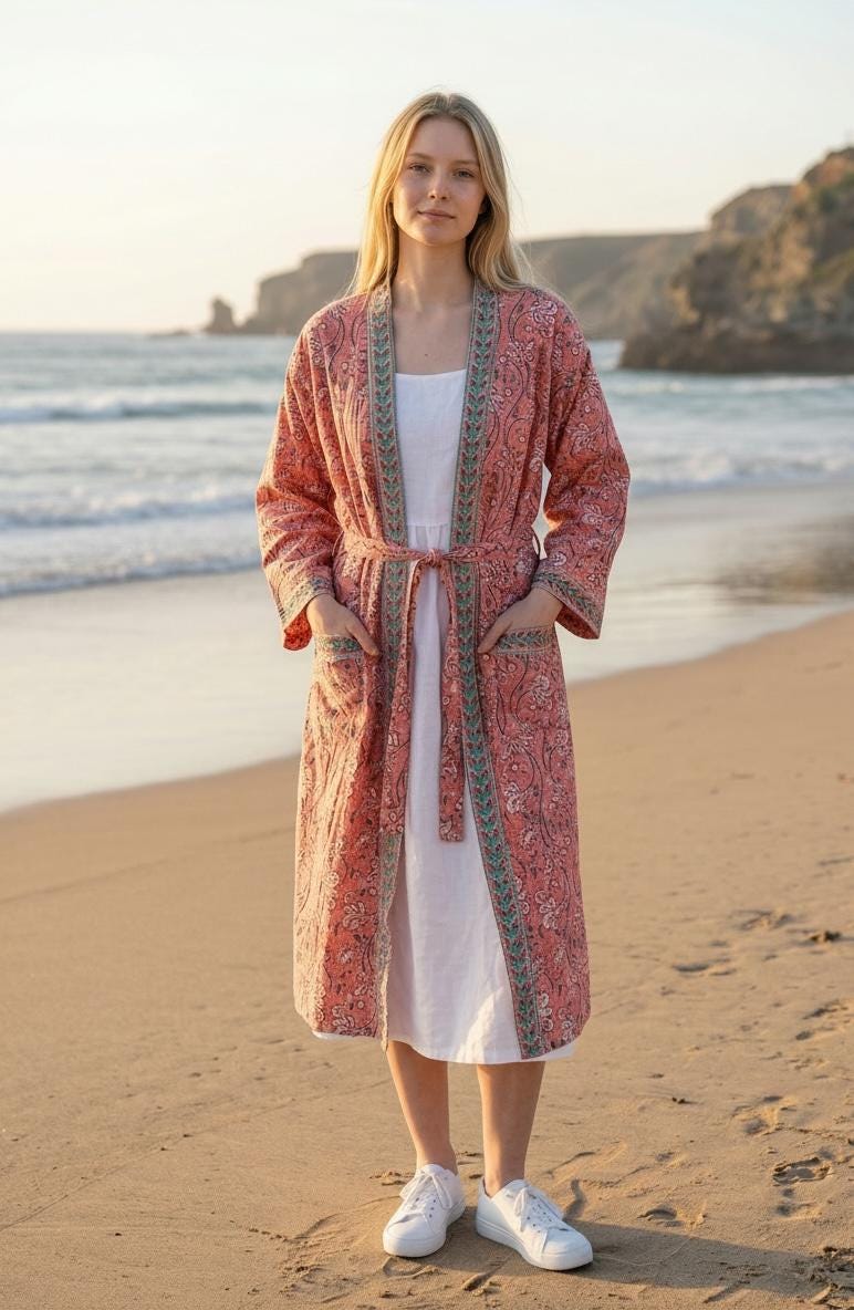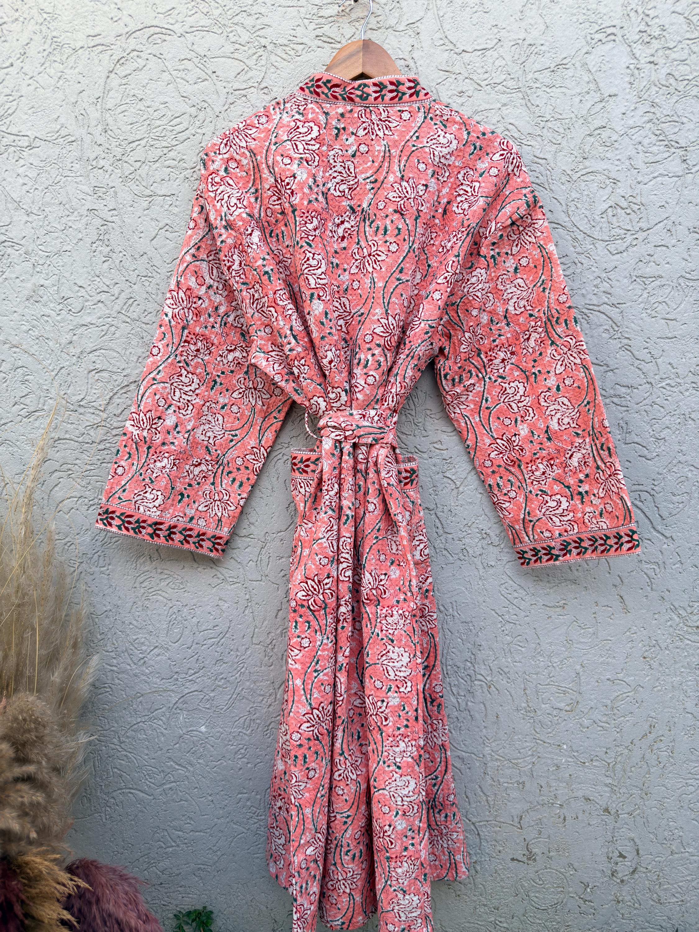 Wrap yourself in timeless elegance with this handcrafted block print cotton waffle kaftan robe, designed for comfort, beauty, and everyday luxury. Made using traditional Indian hand block printing techniques, this robe showcases a stunning coral pink base adorned with delicate floral motifs in soft ivory and earthy green tones.