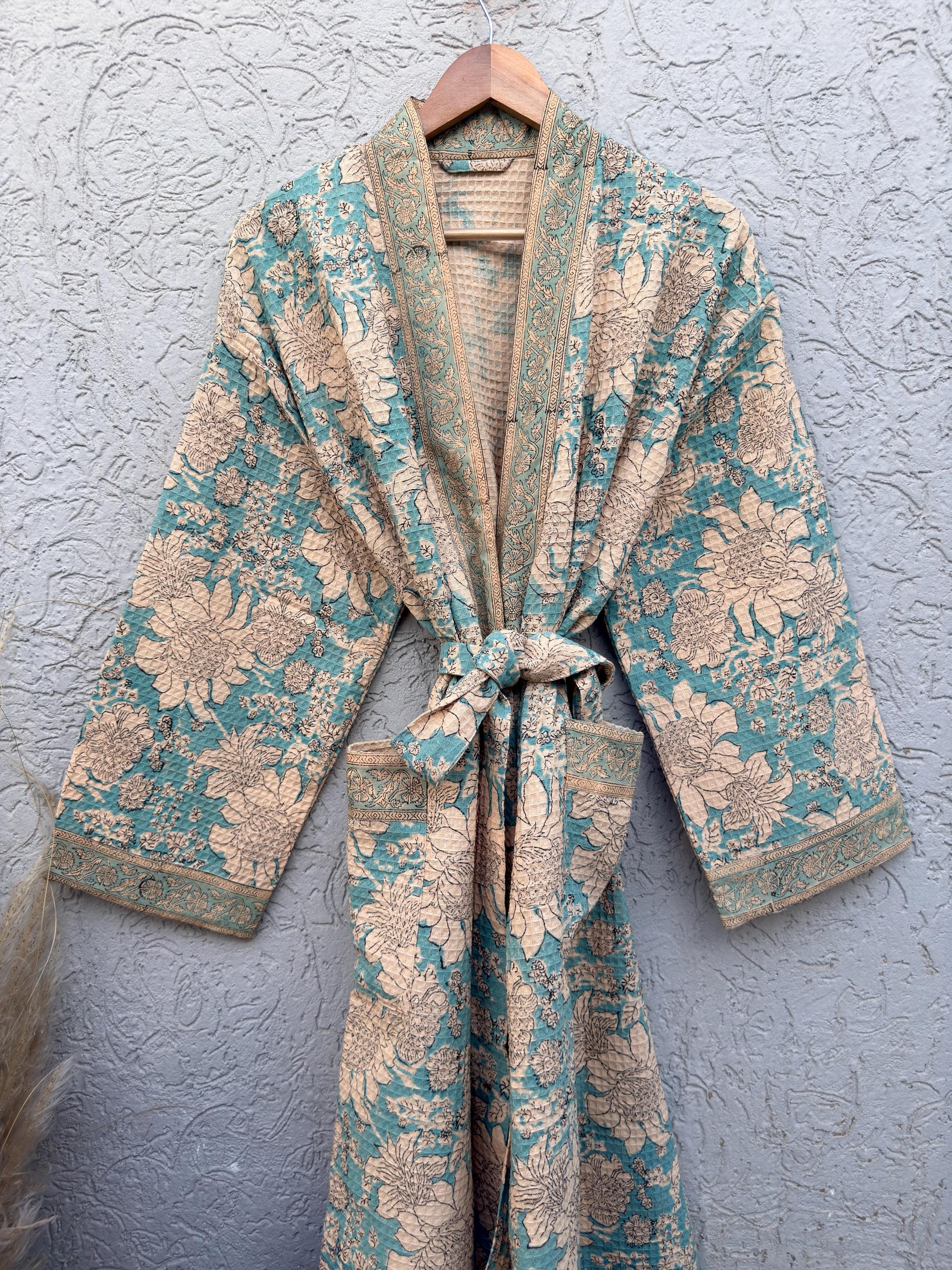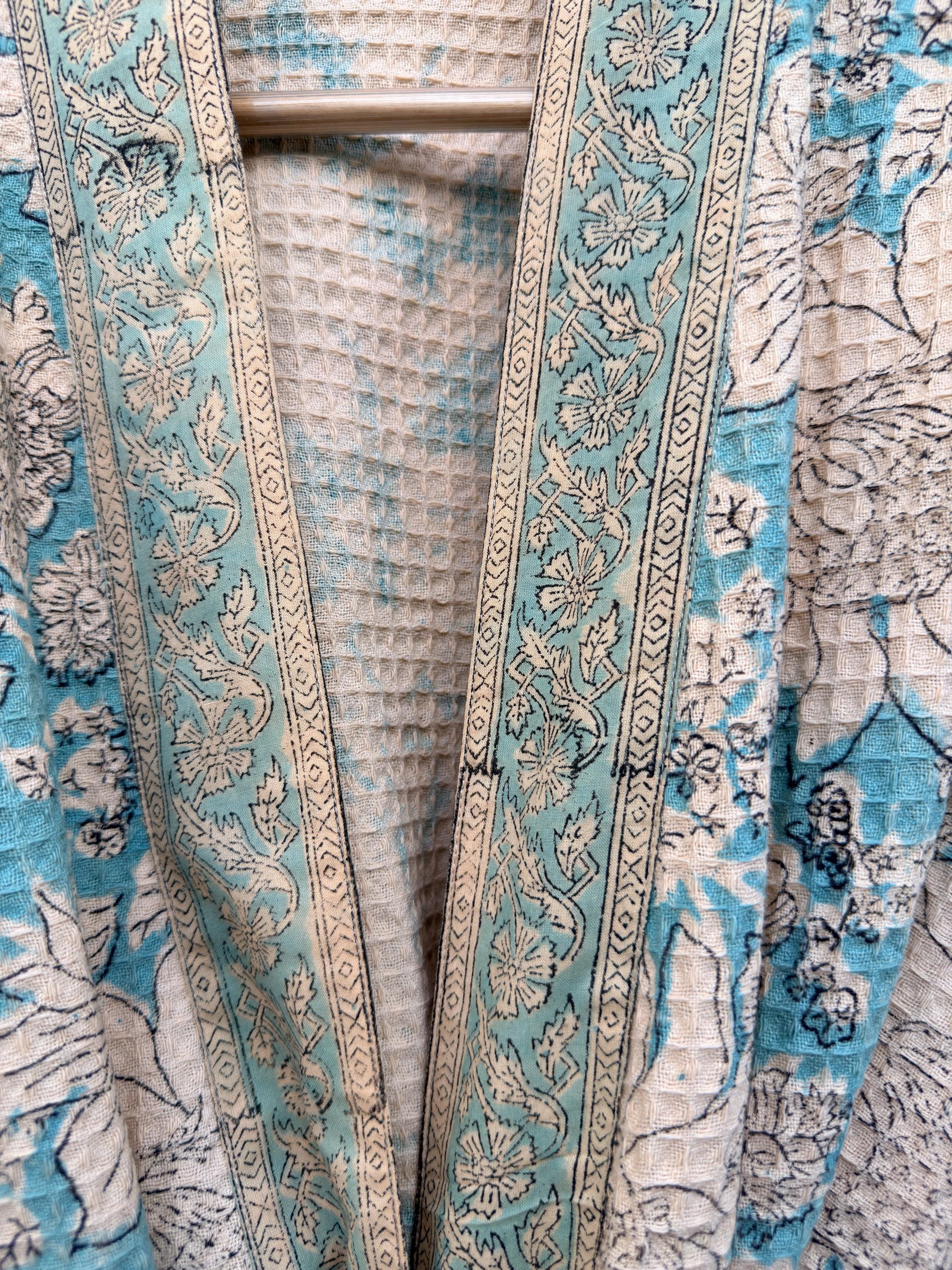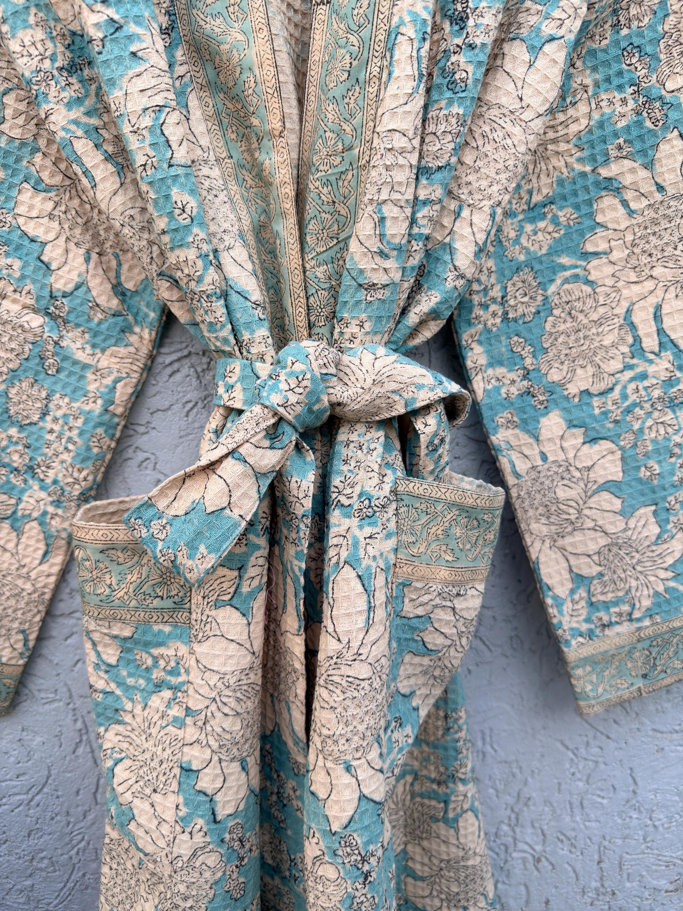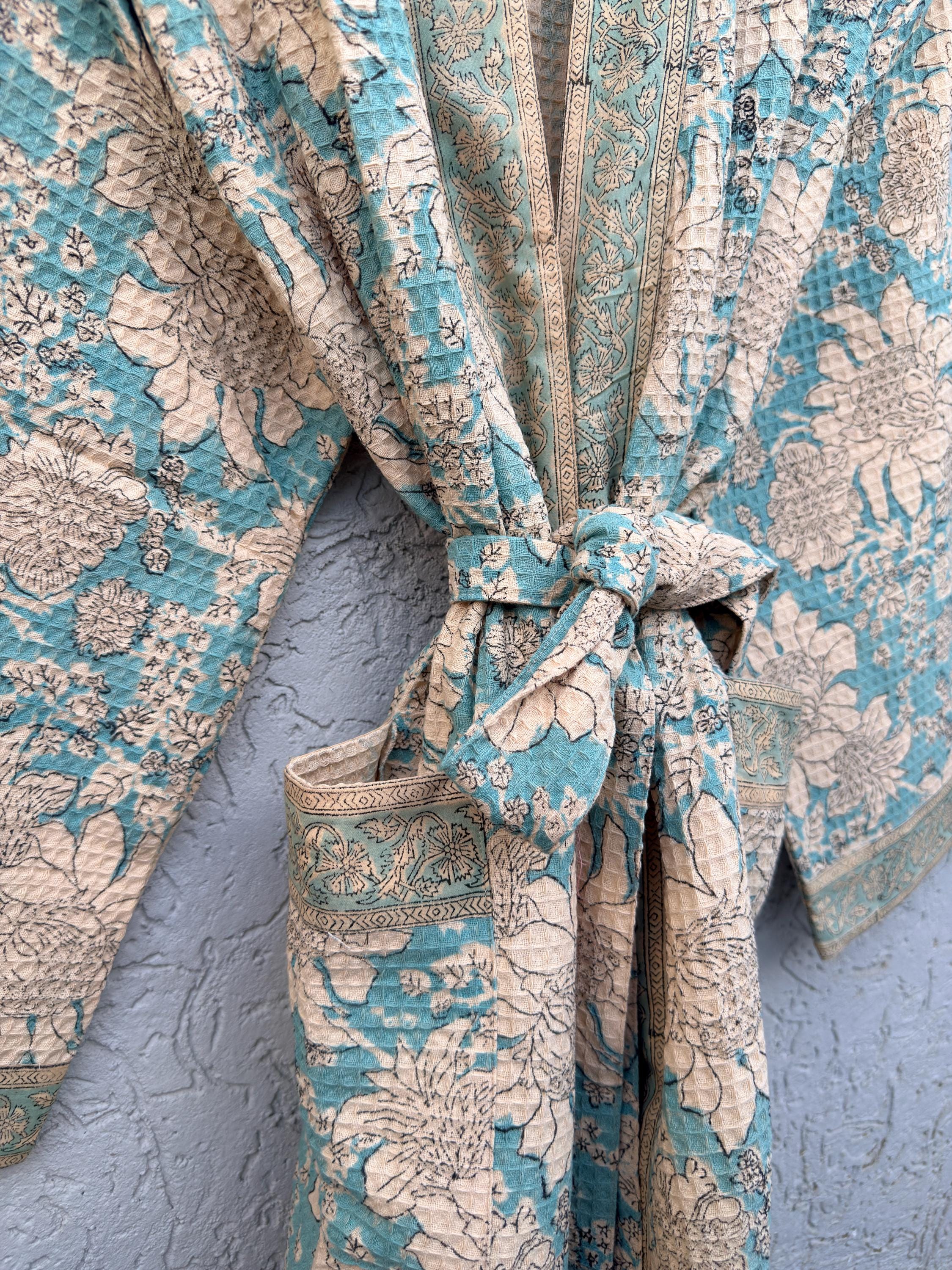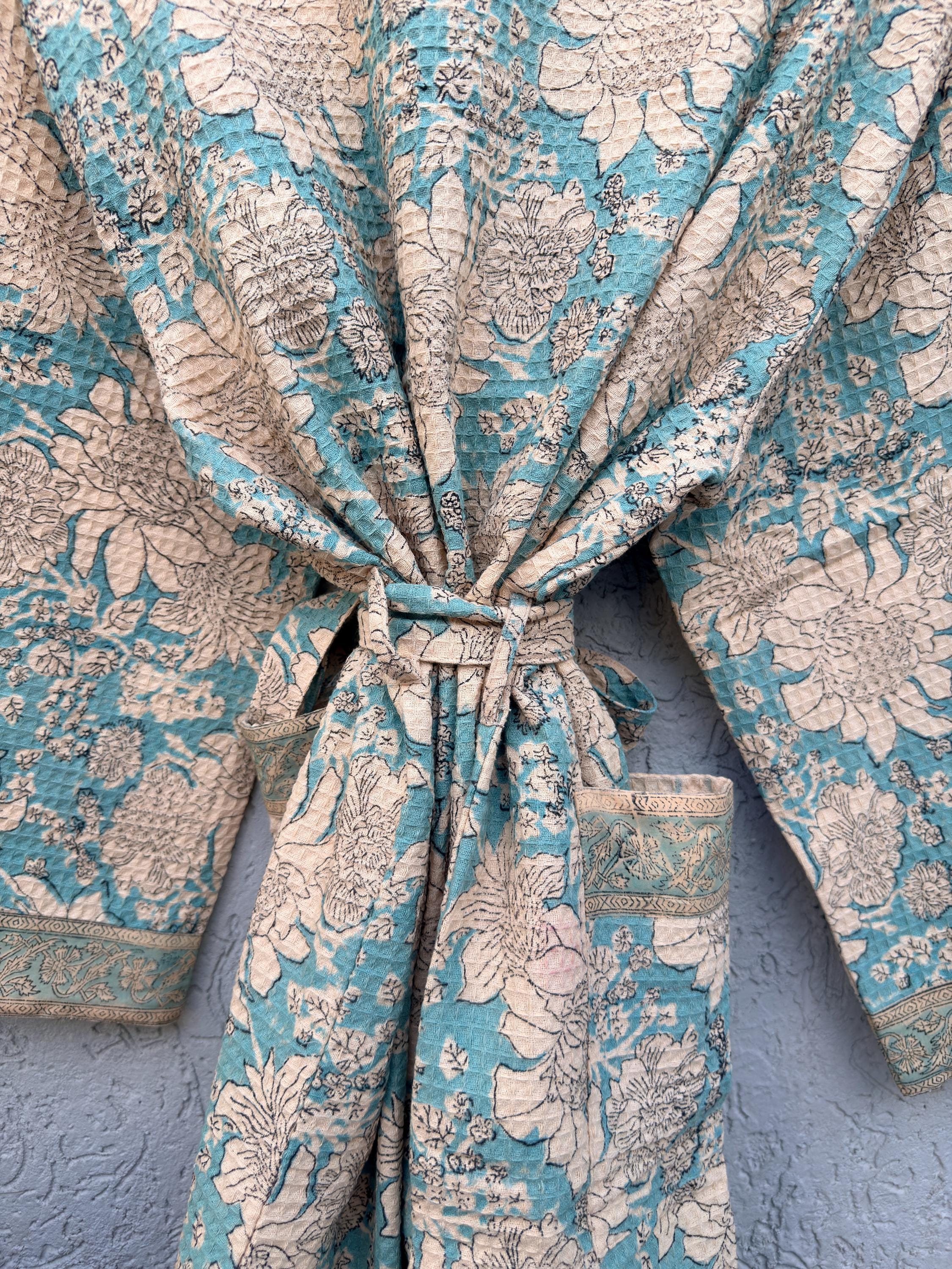 Elevate your everyday comfort with this beautifully handcrafted block print cotton waffle kaftan robe, designed with a calming yet elegant aesthetic. Featuring a soft turquoise blue base paired with intricate beige floral motifs, this robe captures the essence of traditional Indian artistry with a modern boho twist.