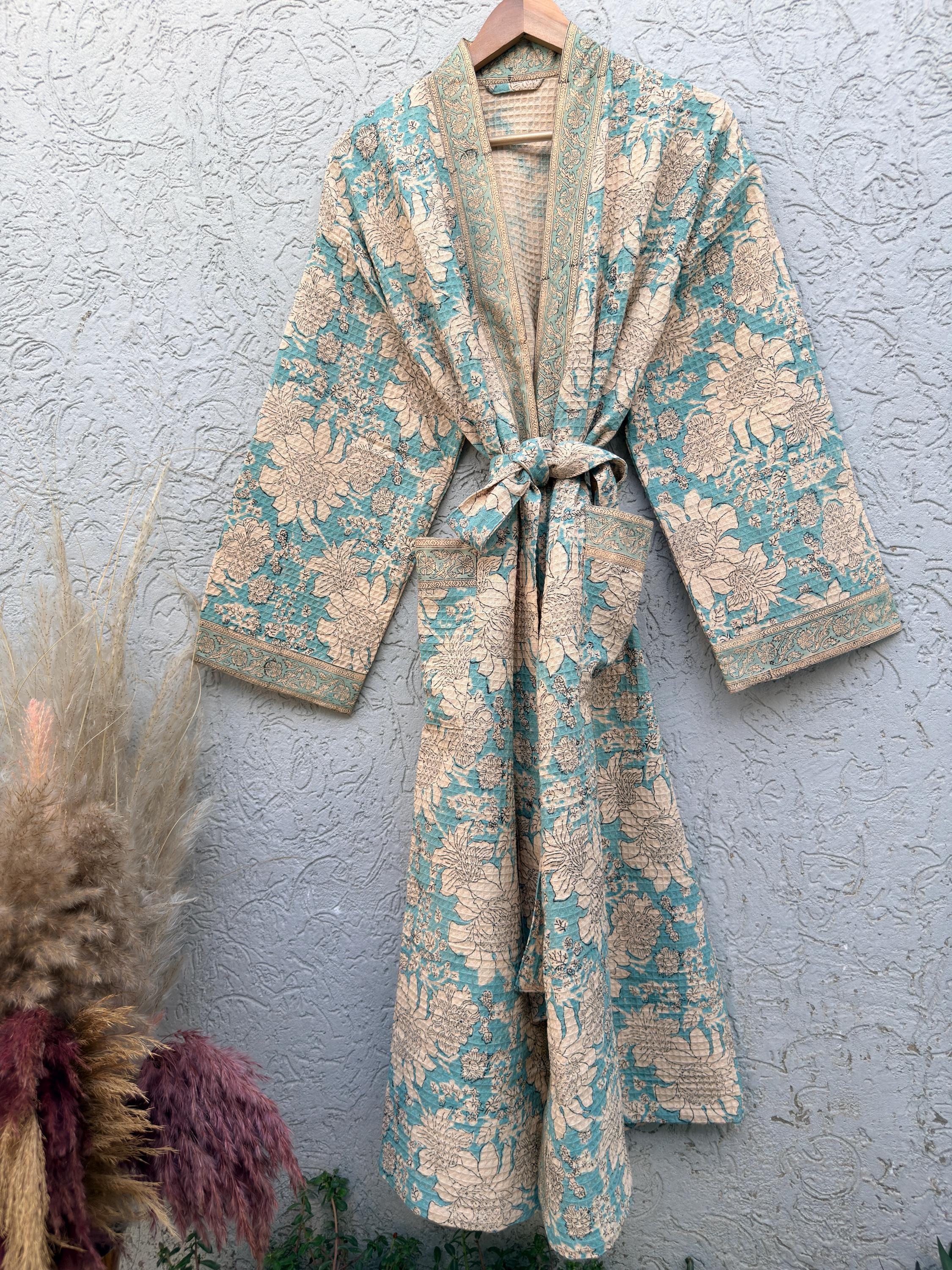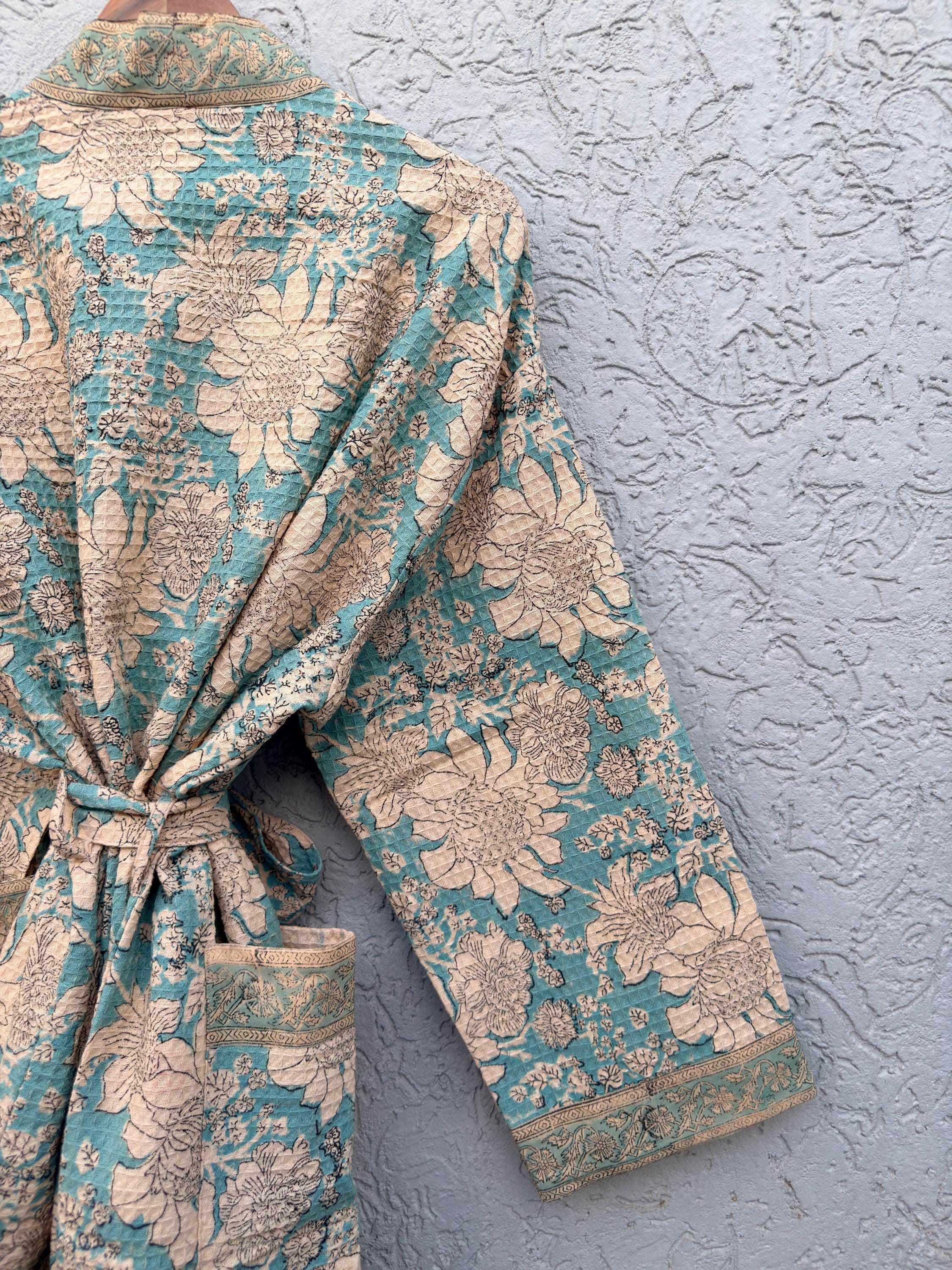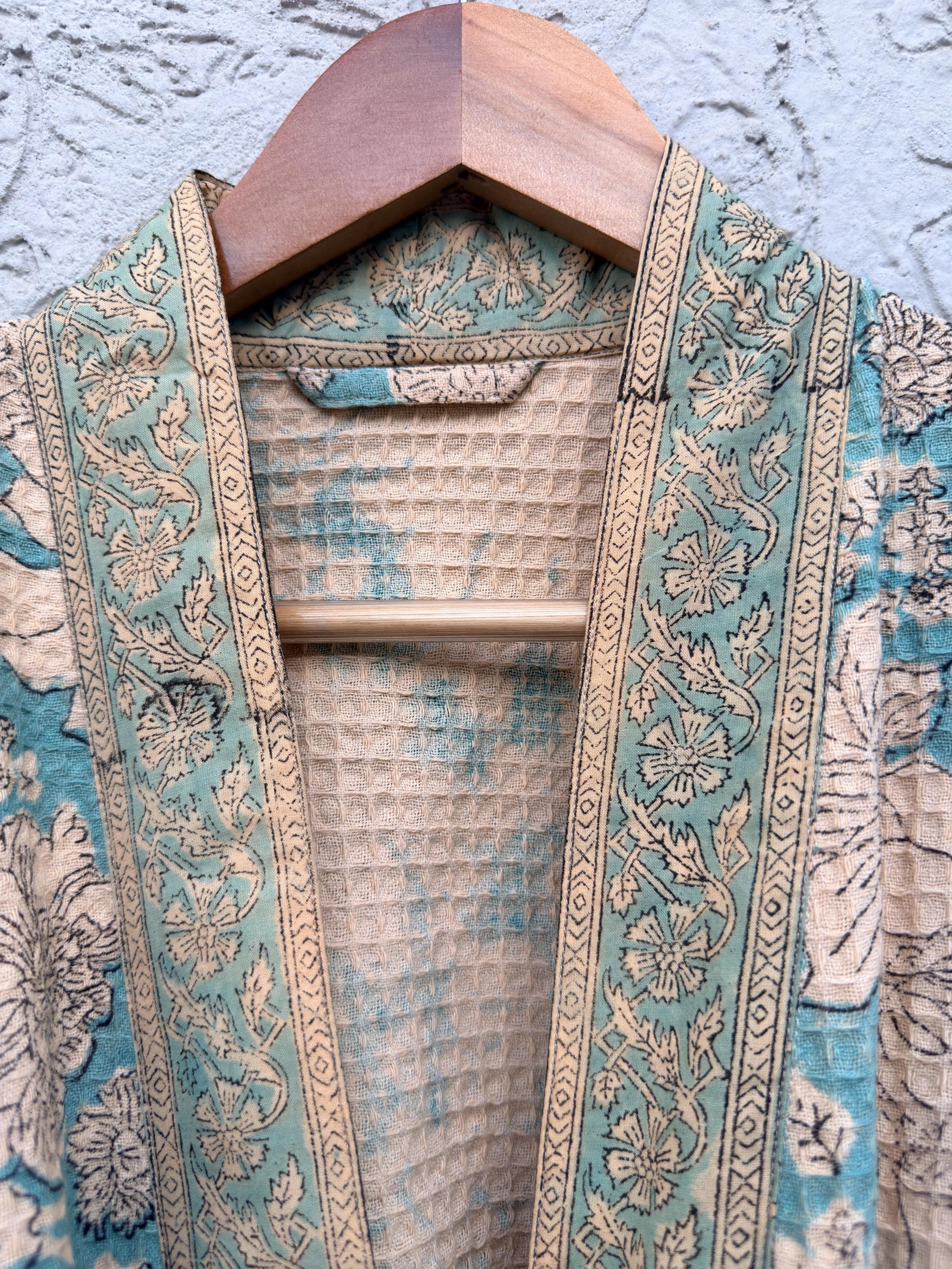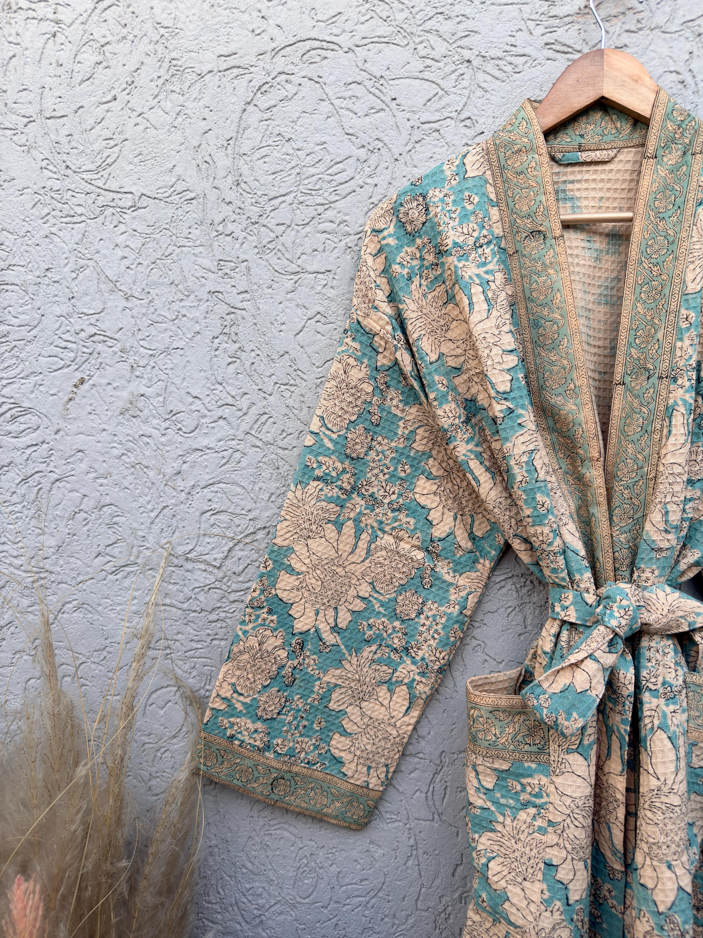 Elevate your everyday comfort with this beautifully handcrafted block print cotton waffle kaftan robe, designed with a calming yet elegant aesthetic. Featuring a soft turquoise blue base paired with intricate beige floral motifs, this robe captures the essence of traditional Indian artistry with a modern boho twist.