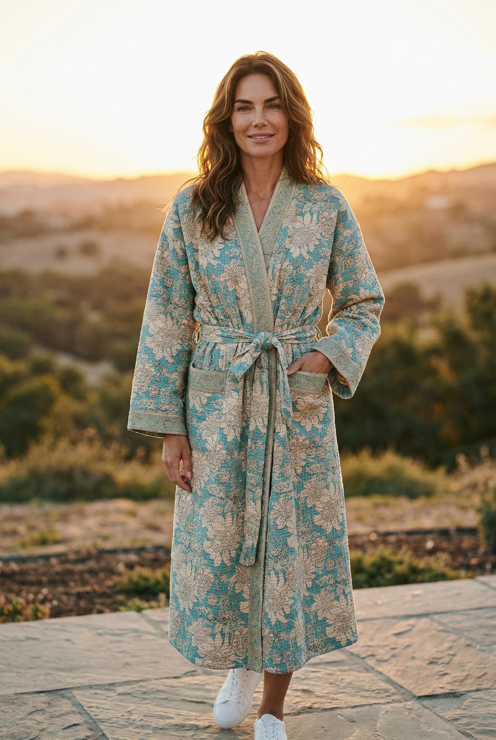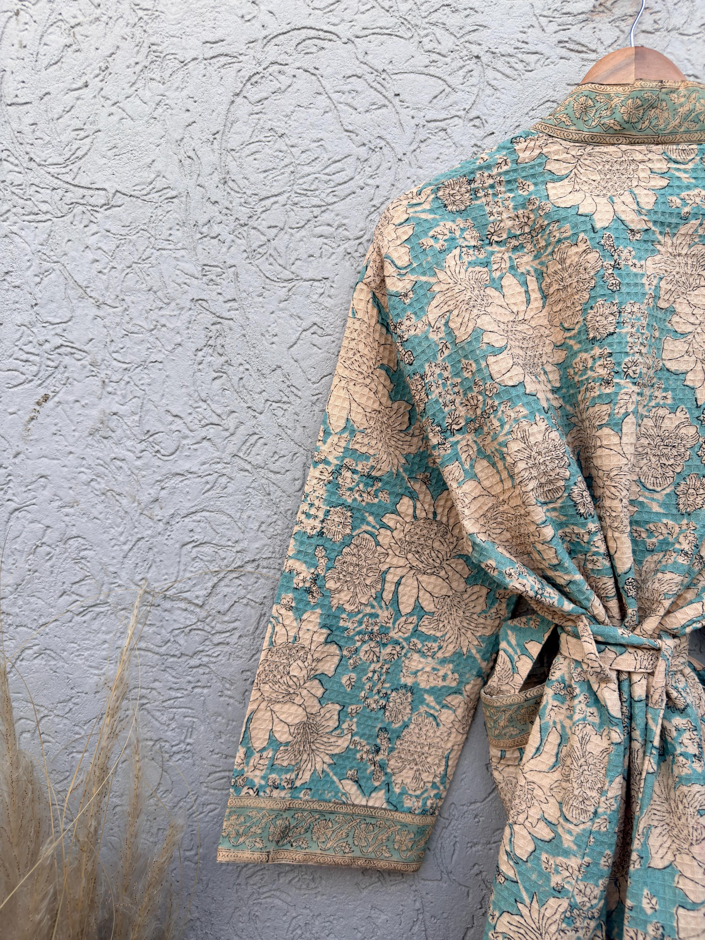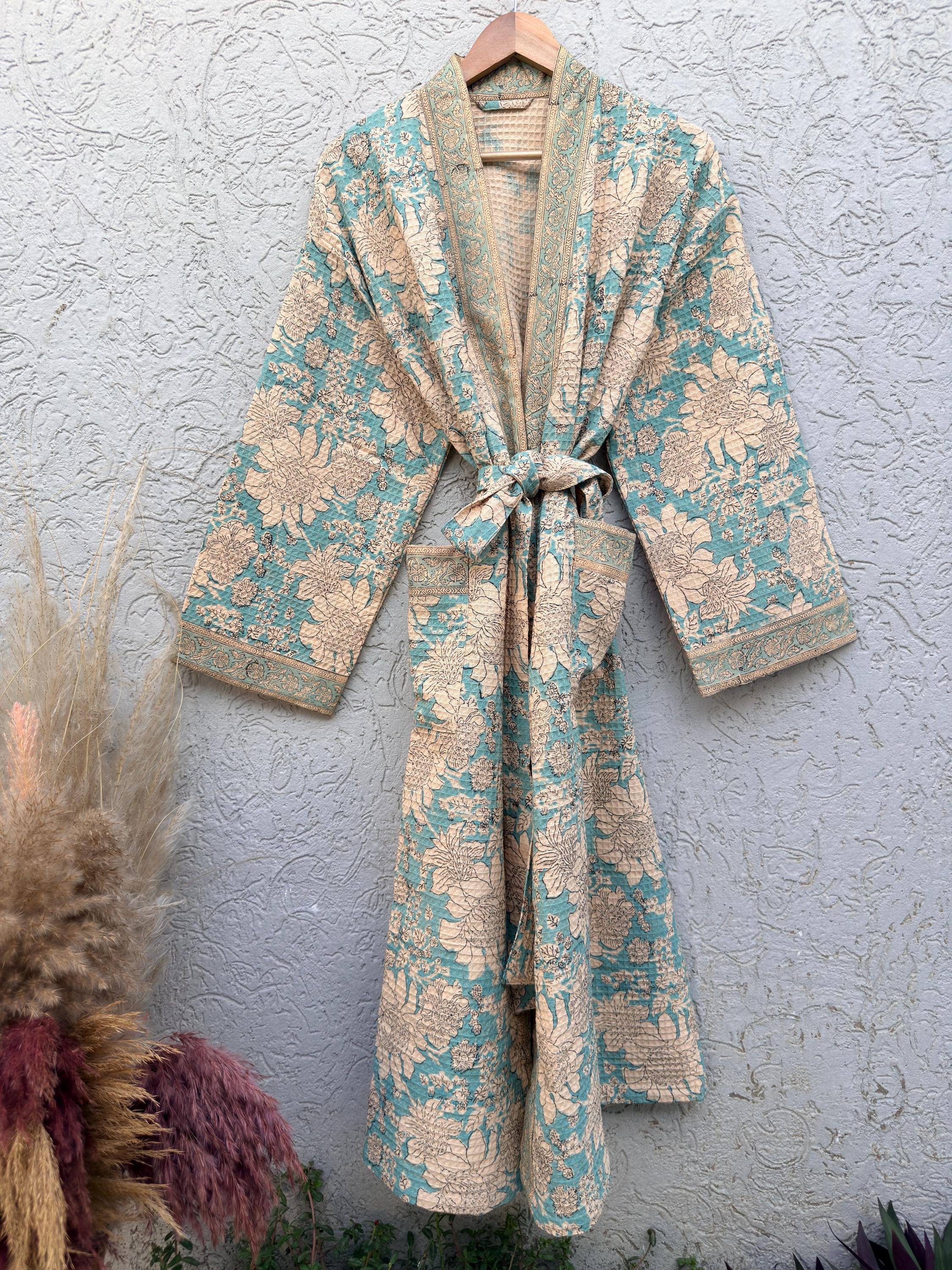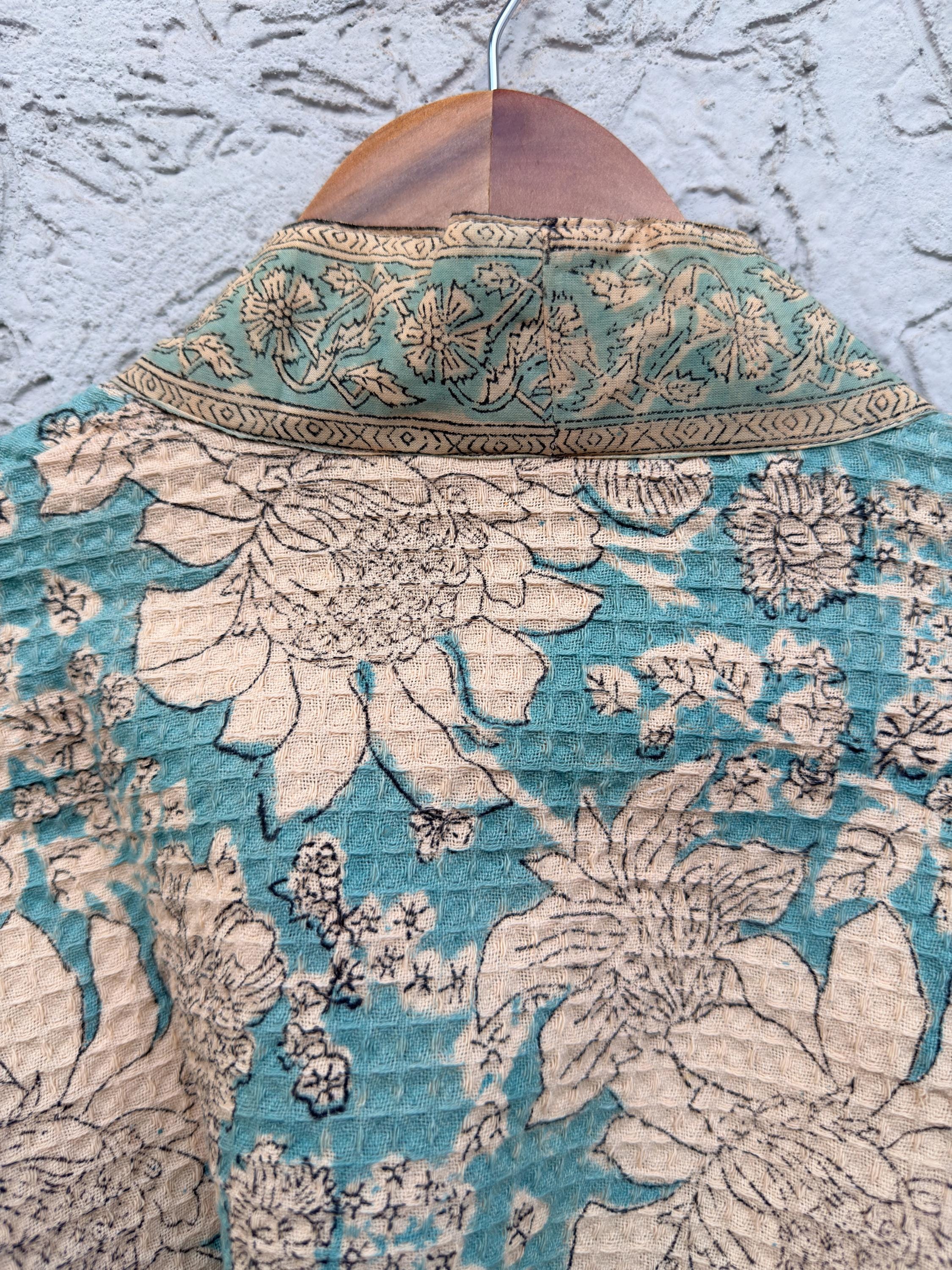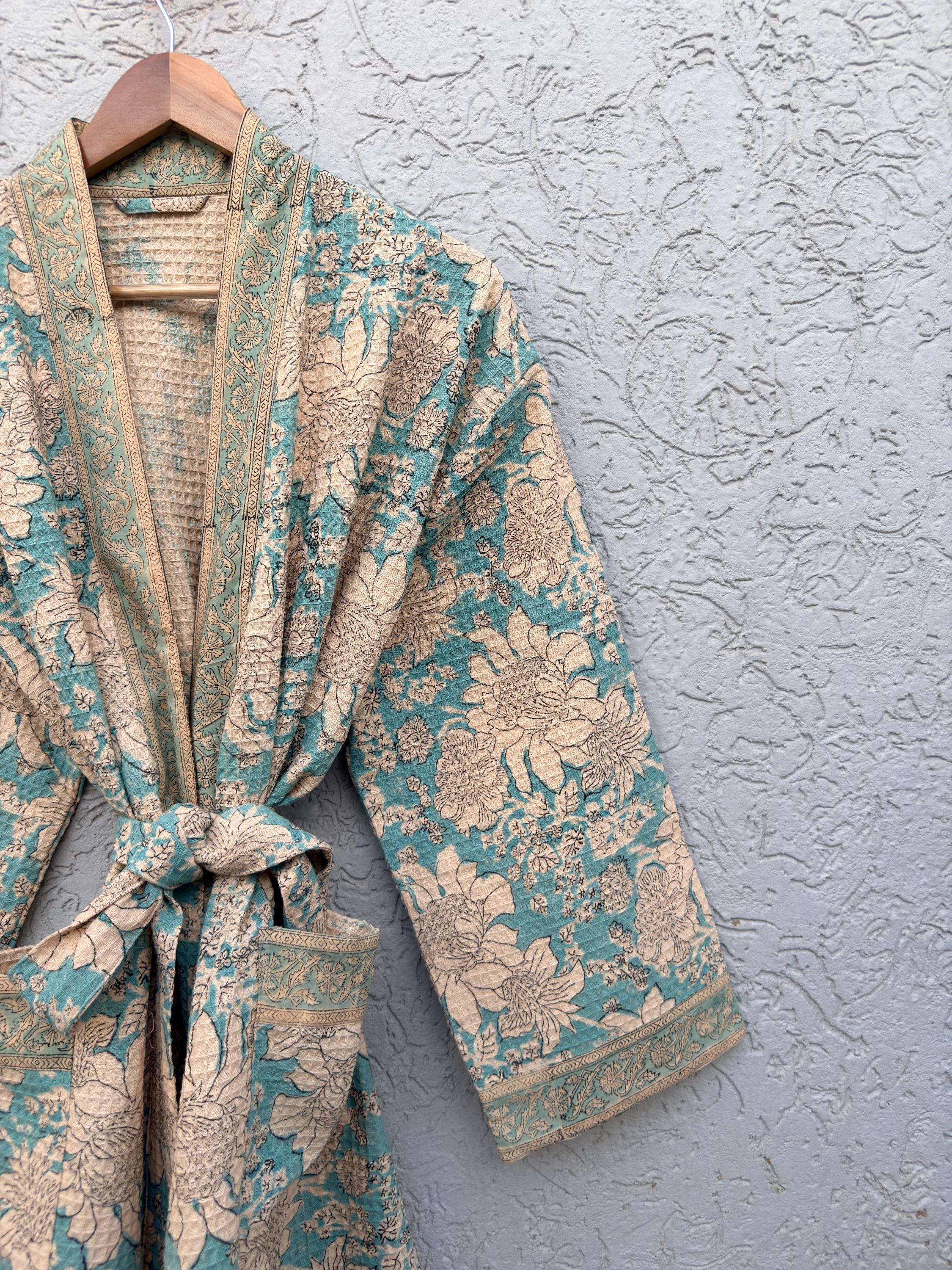 Elevate your everyday comfort with this beautifully handcrafted block print cotton waffle kaftan robe, designed with a calming yet elegant aesthetic. Featuring a soft turquoise blue base paired with intricate beige floral motifs, this robe captures the essence of traditional Indian artistry with a modern boho twist.