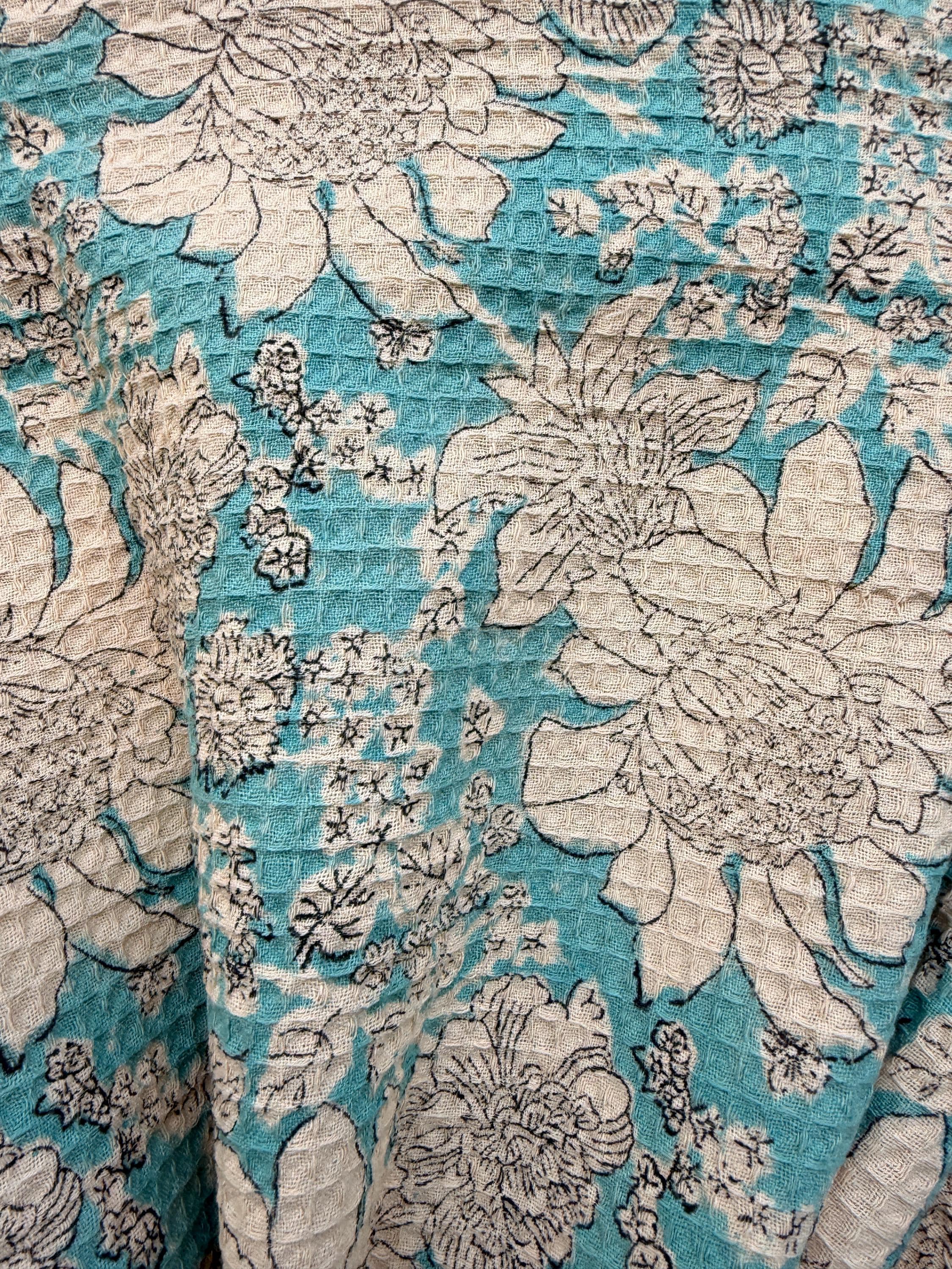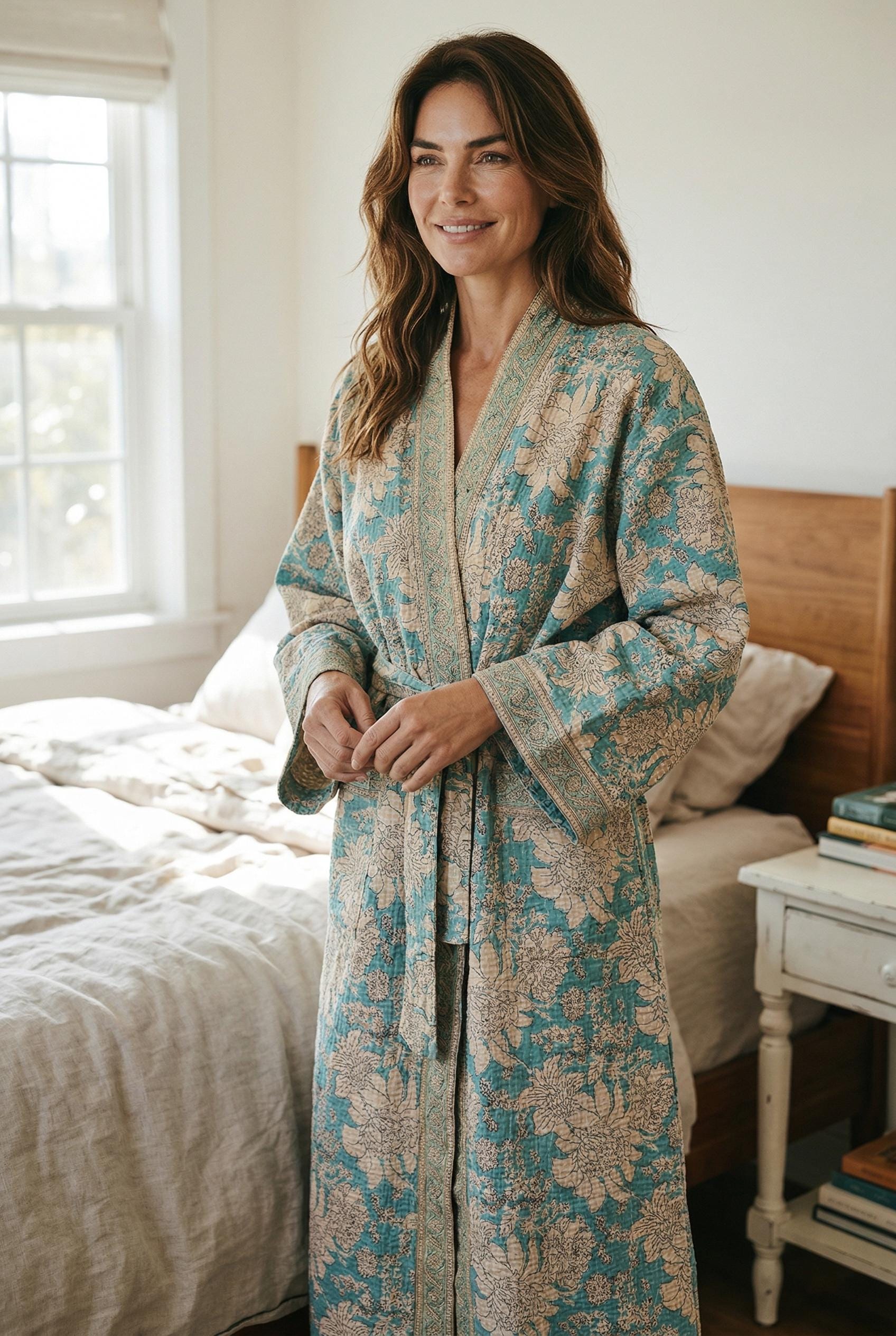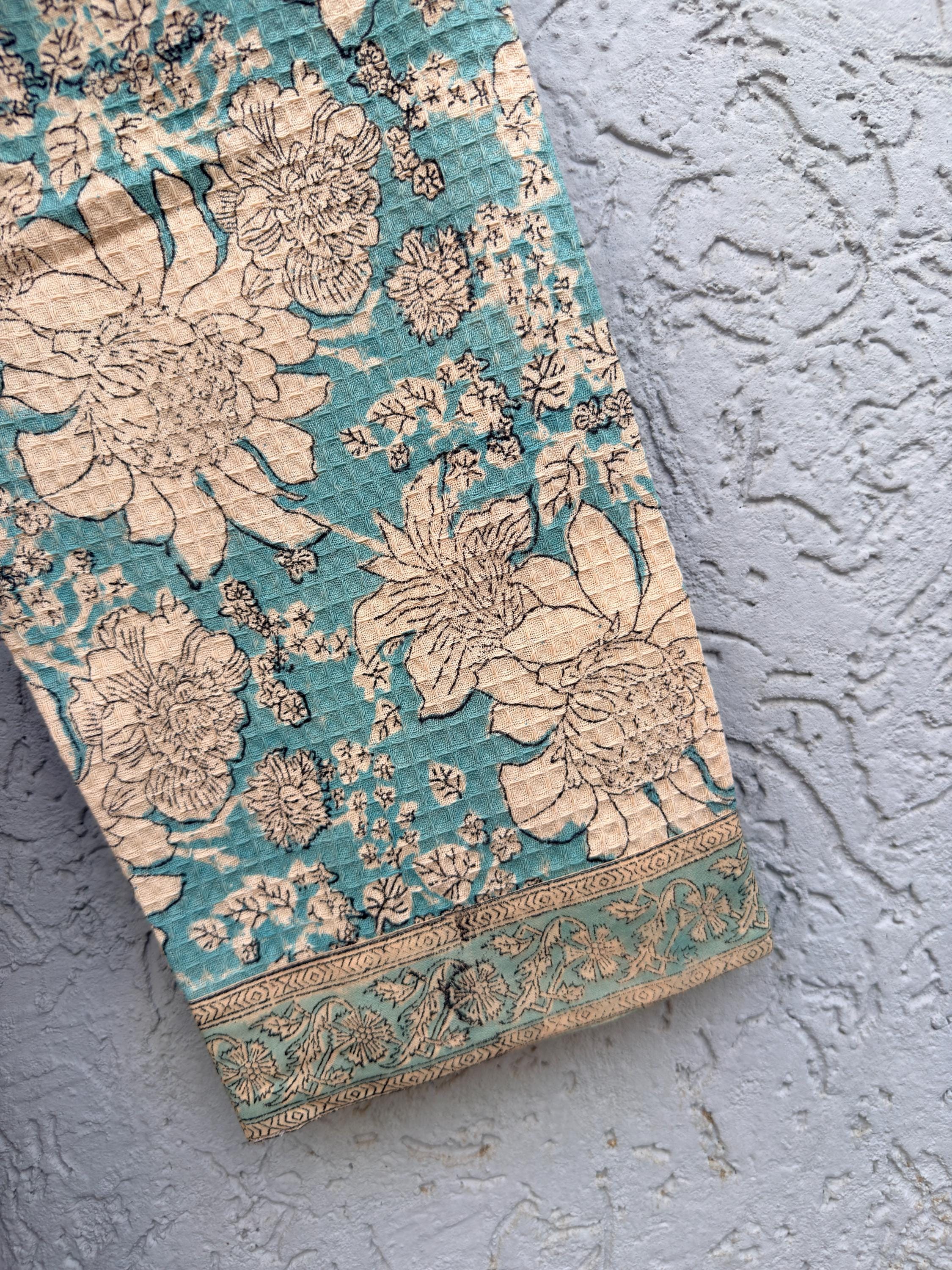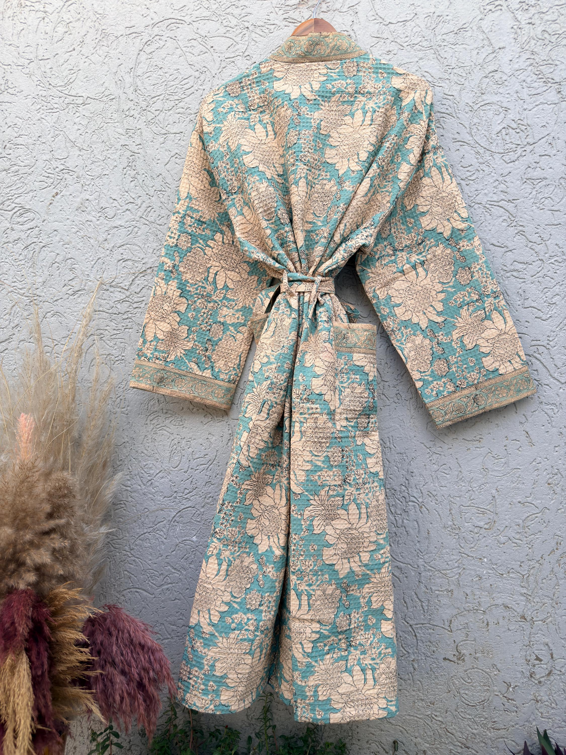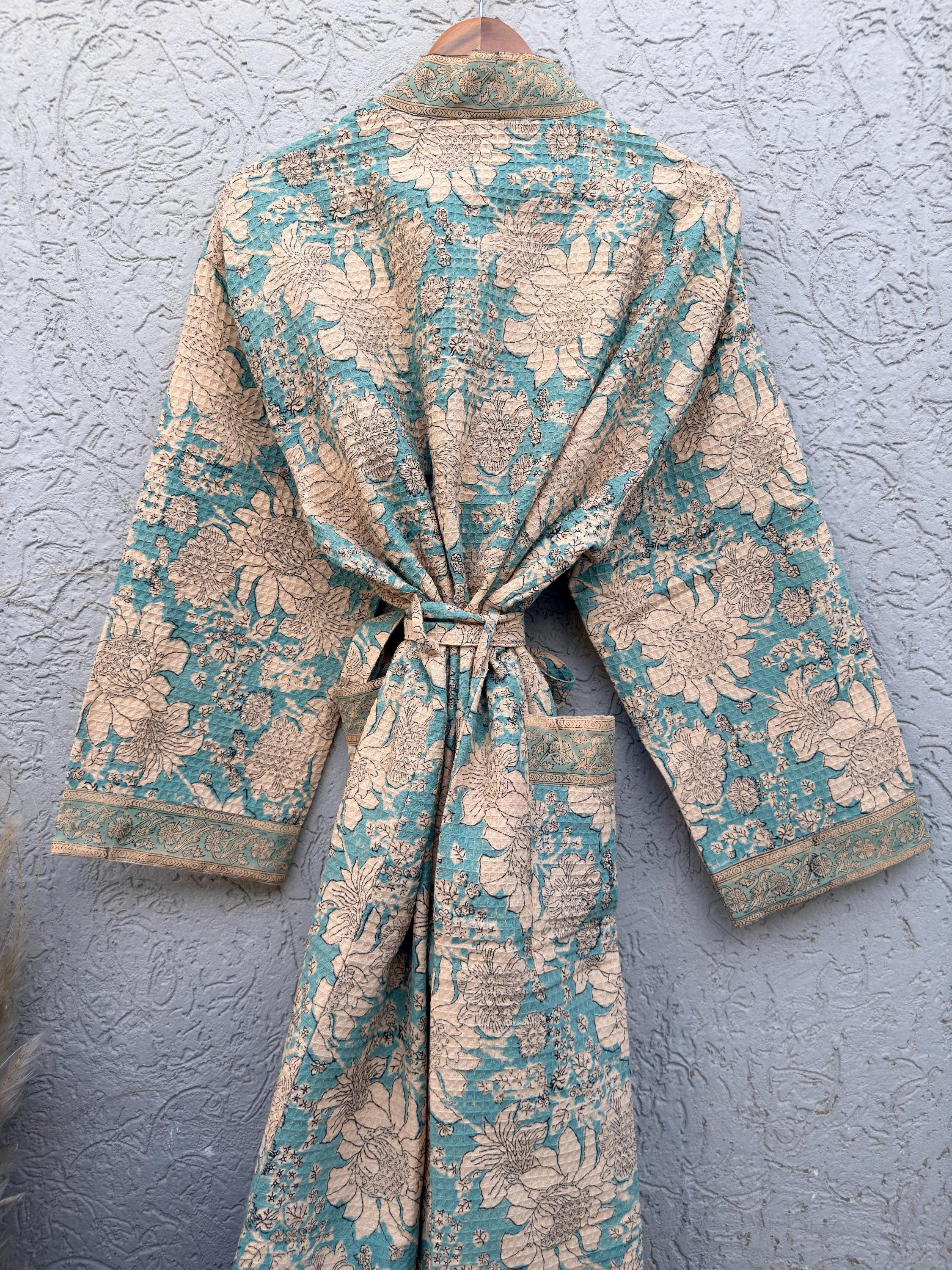 Elevate your everyday comfort with this beautifully handcrafted block print cotton waffle kaftan robe, designed with a calming yet elegant aesthetic. Featuring a soft turquoise blue base paired with intricate beige floral motifs, this robe captures the essence of traditional Indian artistry with a modern boho twist.