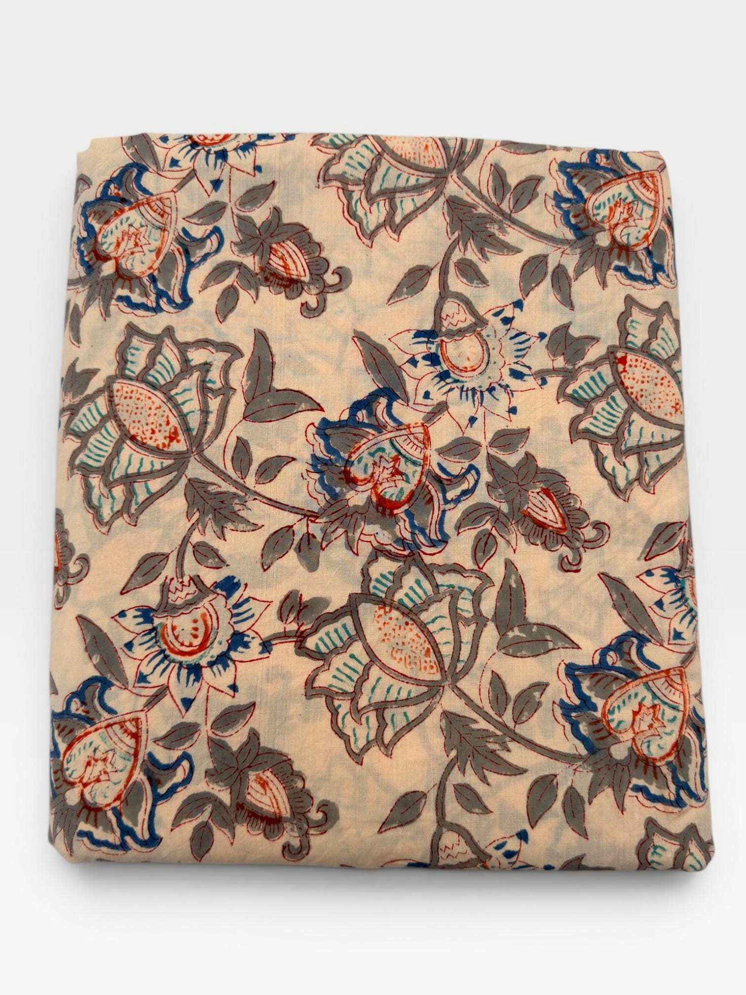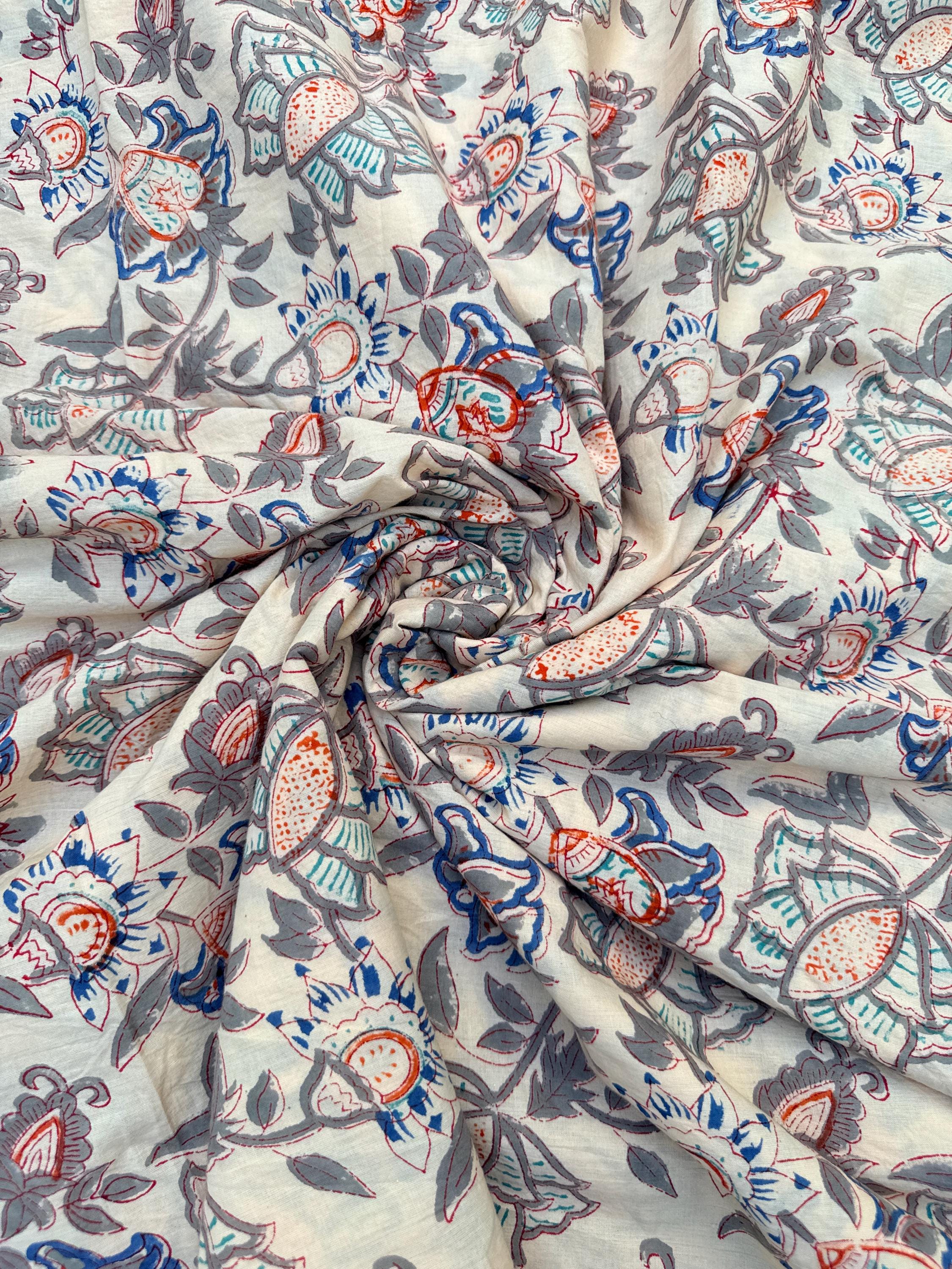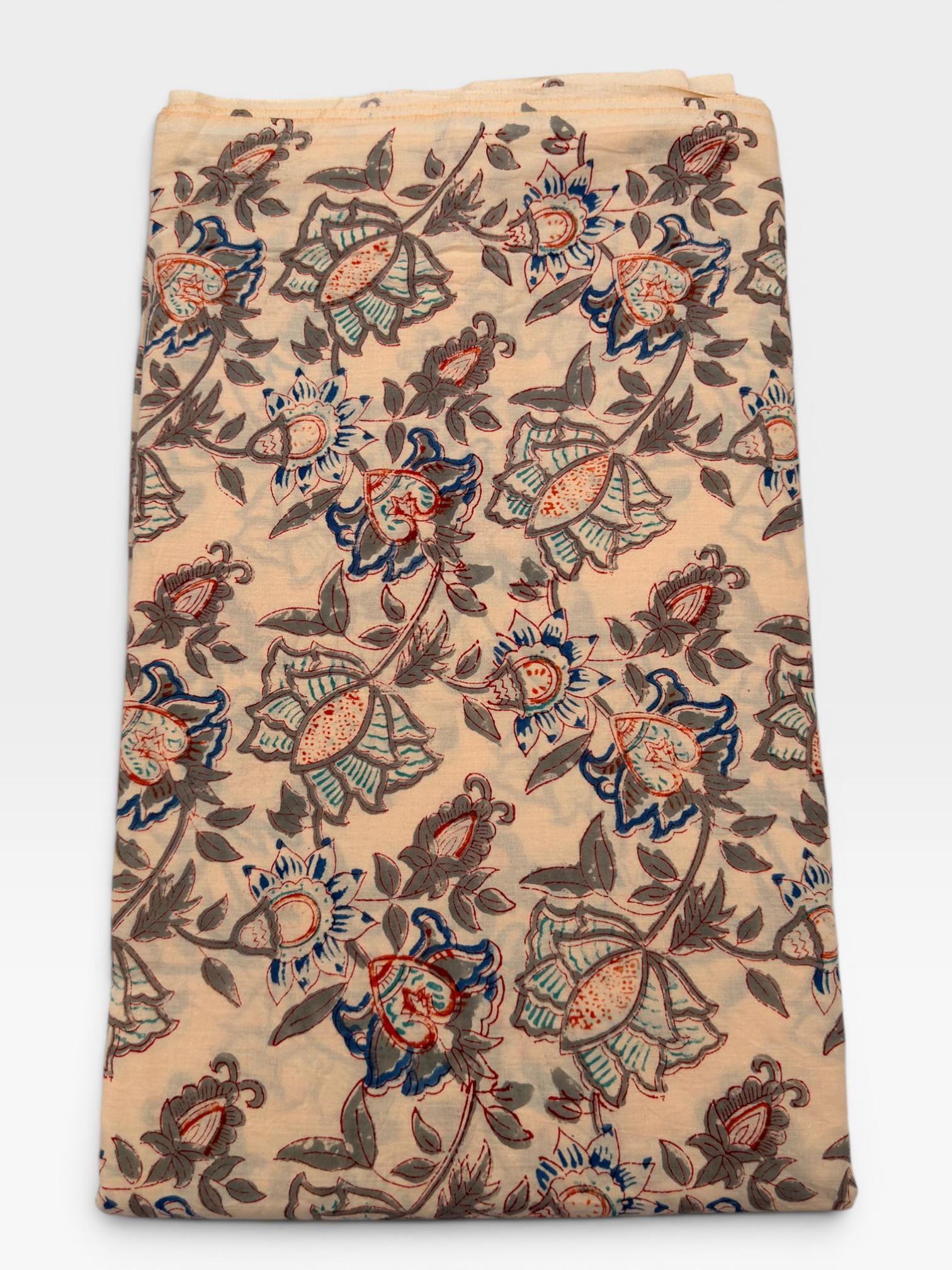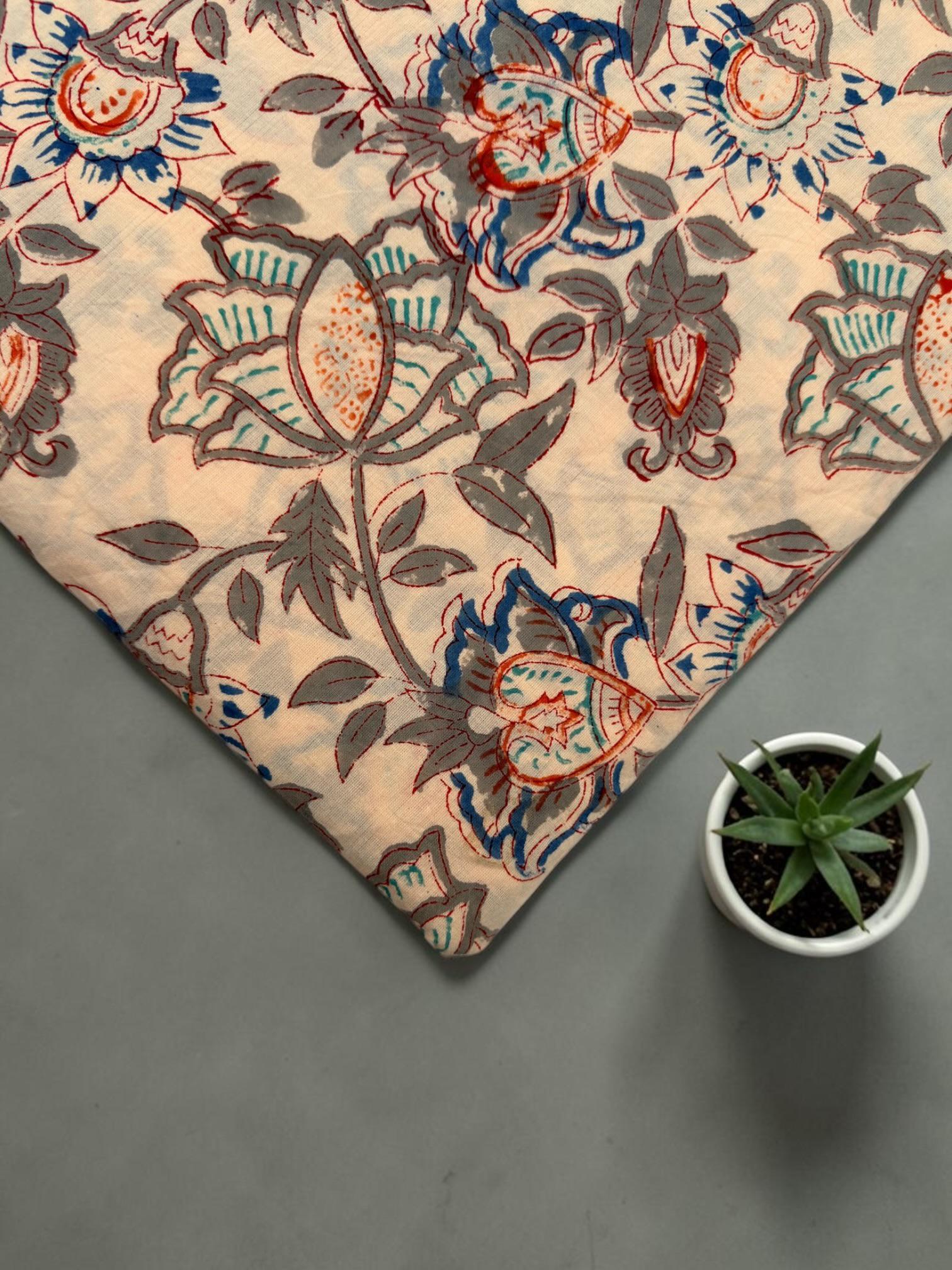 Beige Floral Hand Block Print Cotton Fabric by Yard | Vintage Boho Indian Fabric | Cream Base Blue Rust Grey Floral Textile | Soft Sewing