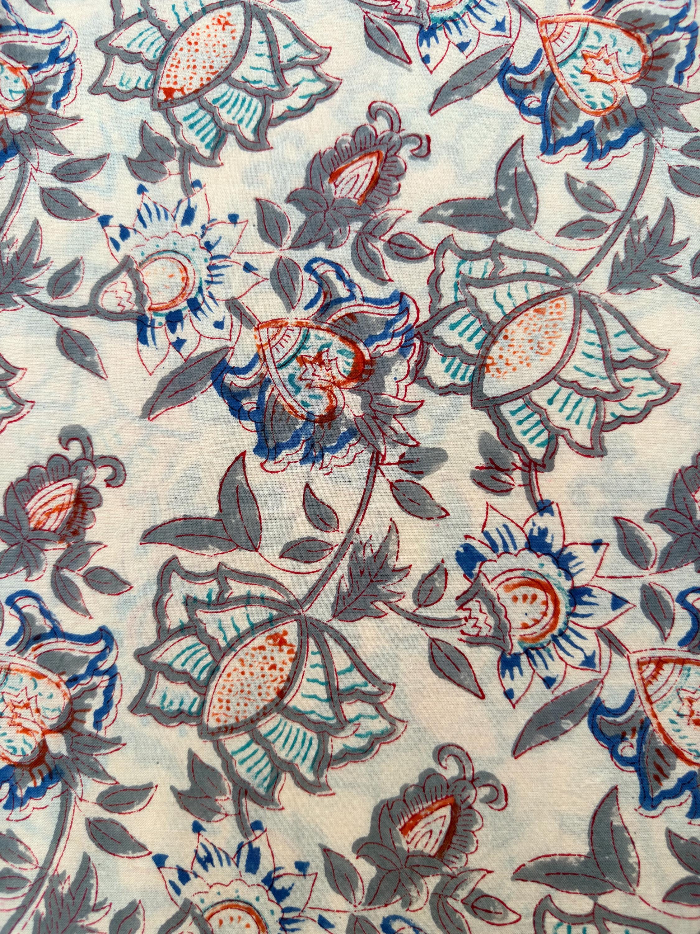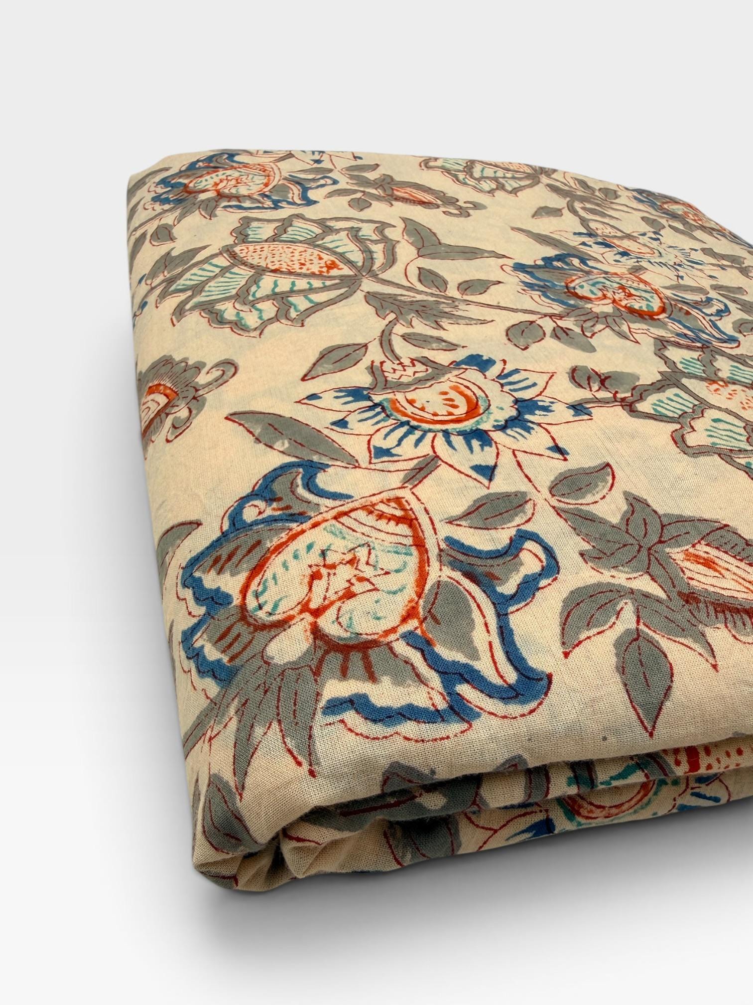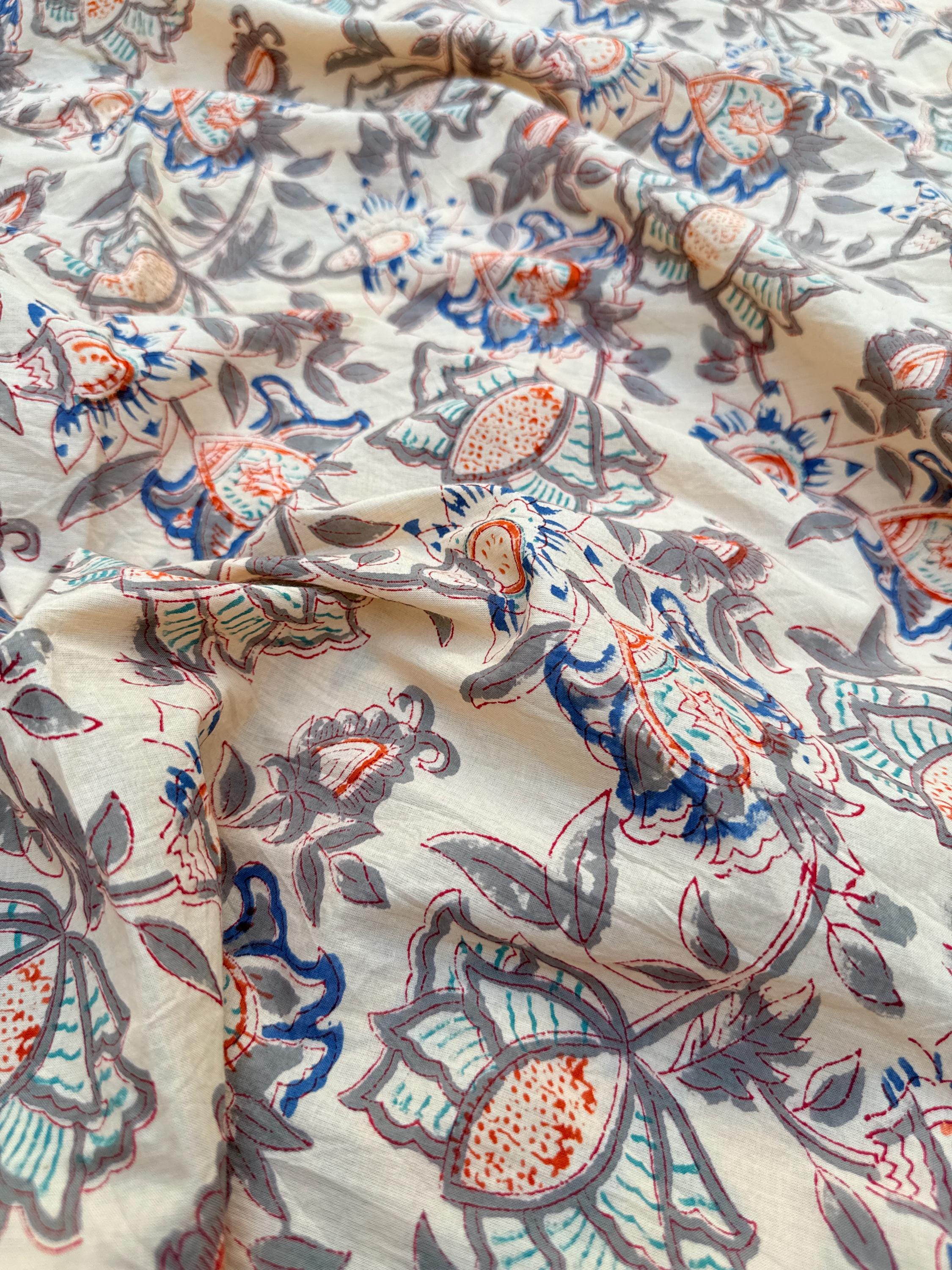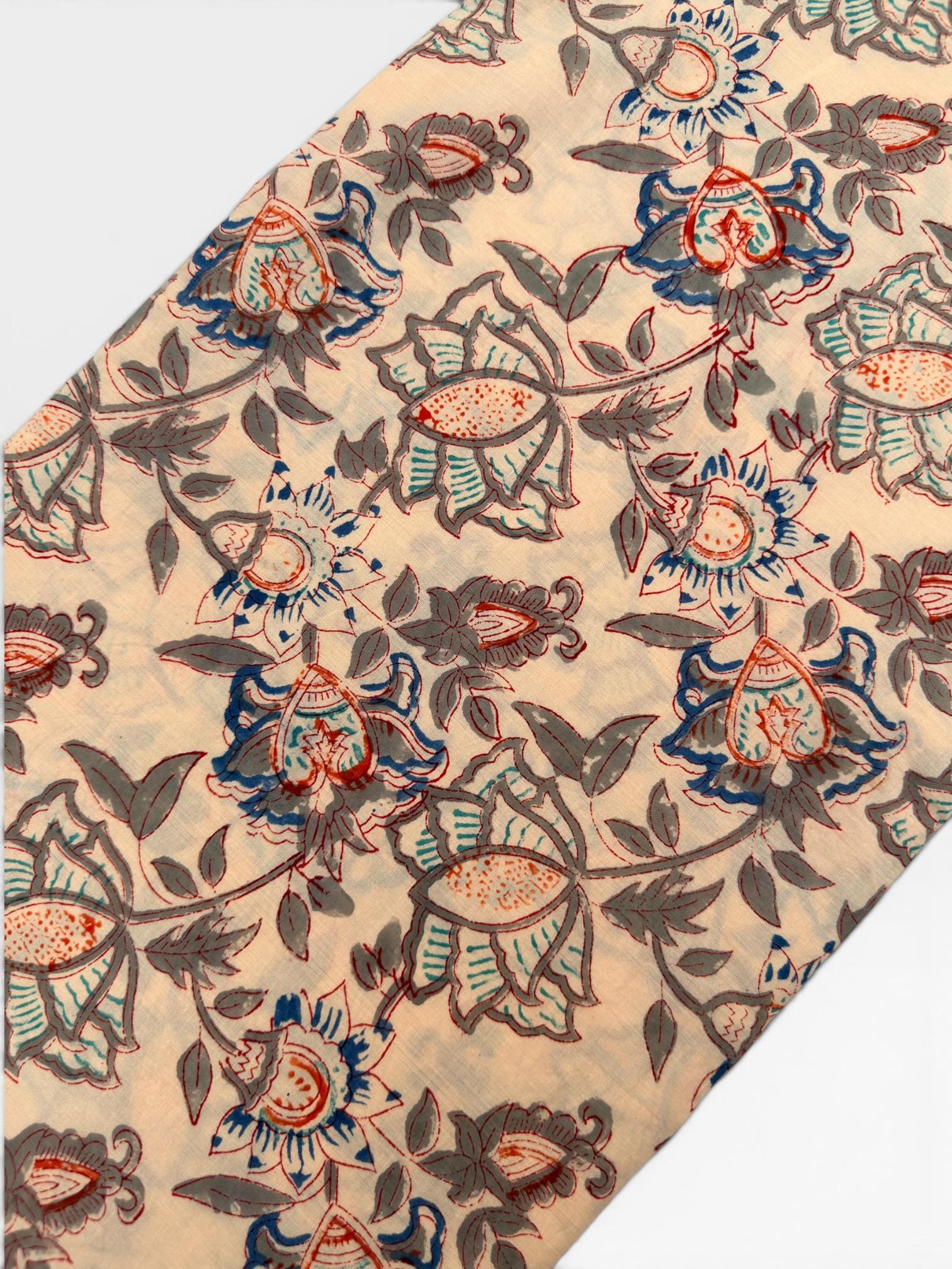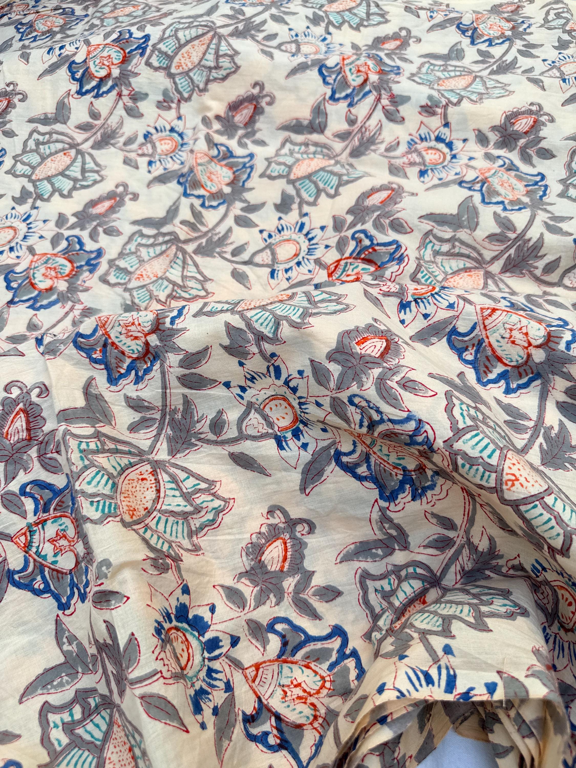 Beige Floral Hand Block Print Cotton Fabric by Yard | Vintage Boho Indian Fabric | Cream Base Blue Rust Grey Floral Textile | Soft Sewing