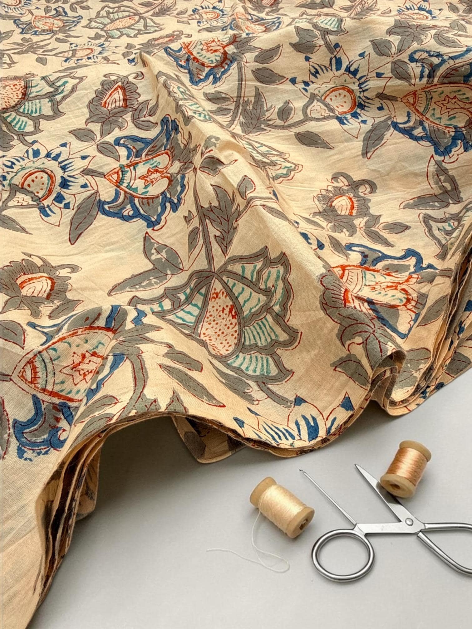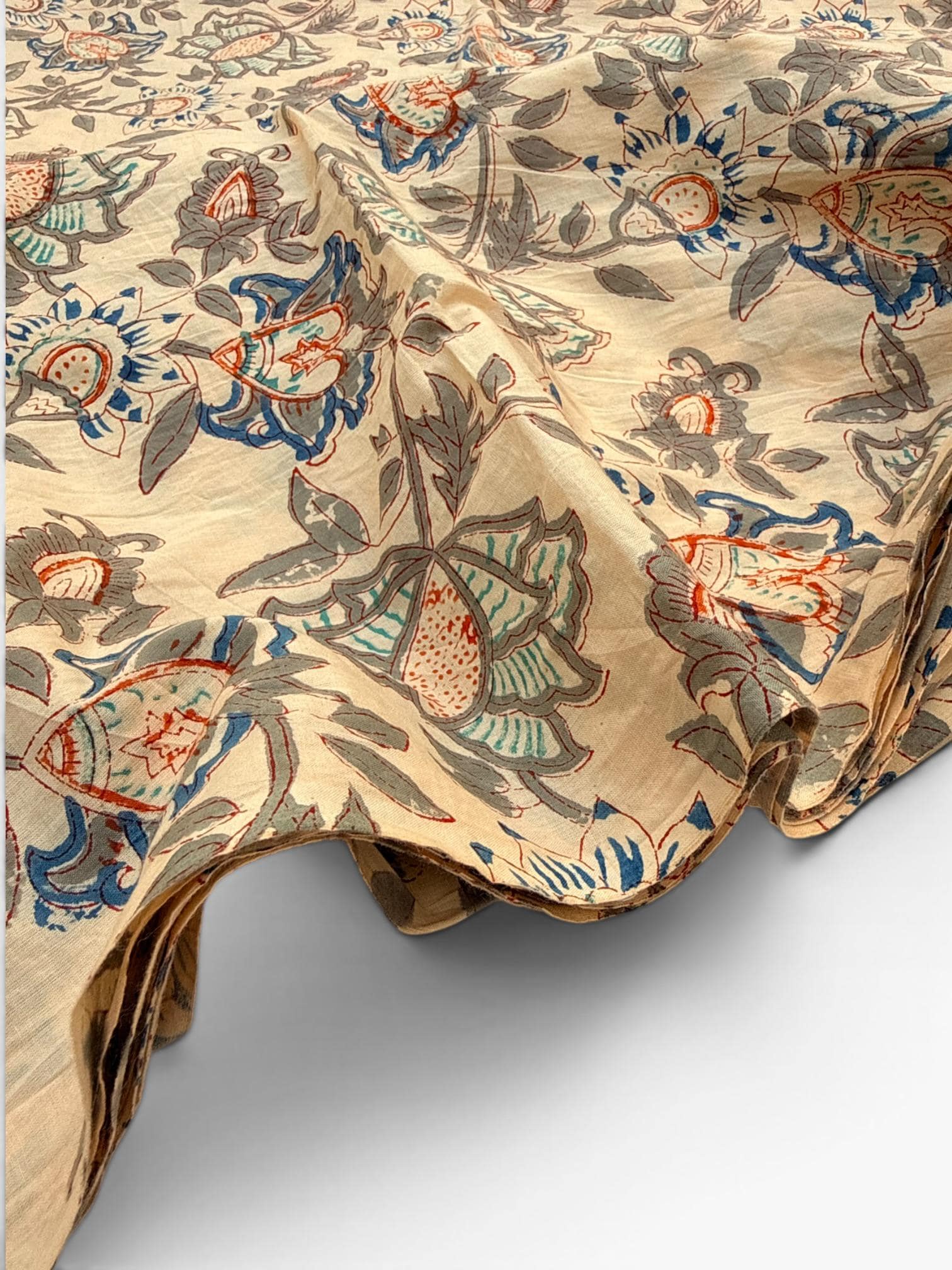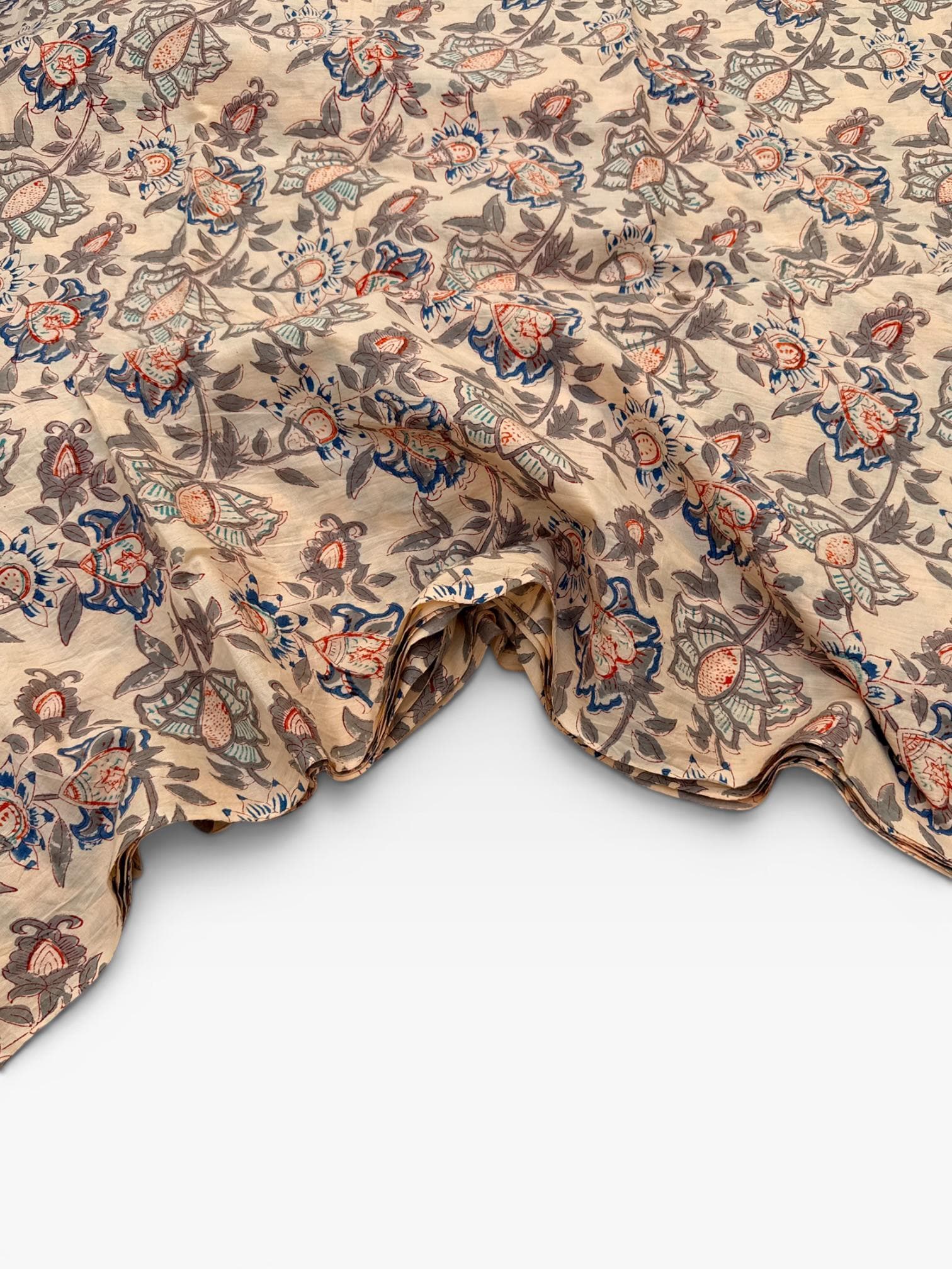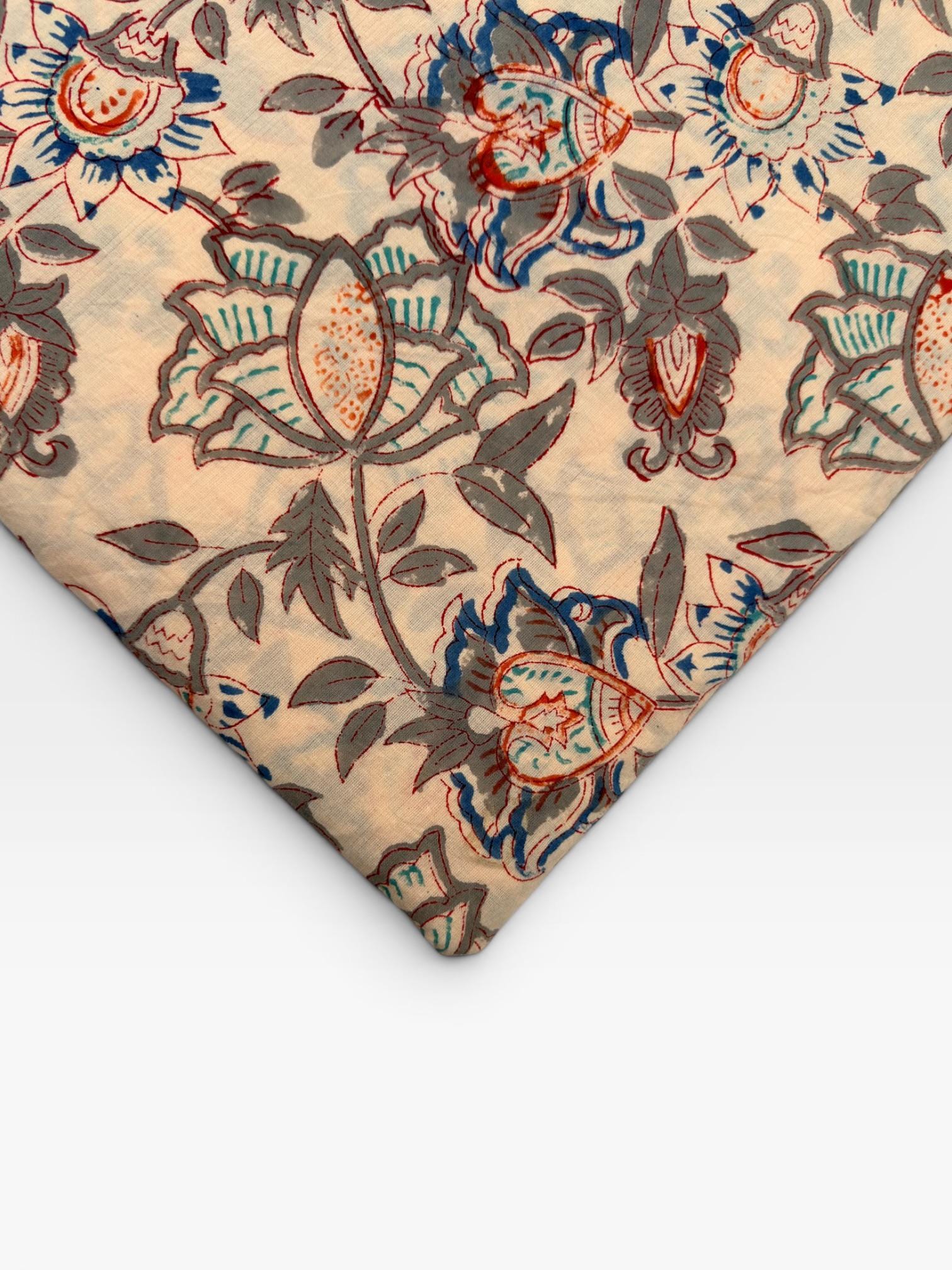 Beige Floral Hand Block Print Cotton Fabric by Yard | Vintage Boho Indian Fabric | Cream Base Blue Rust Grey Floral Textile | Soft Sewing