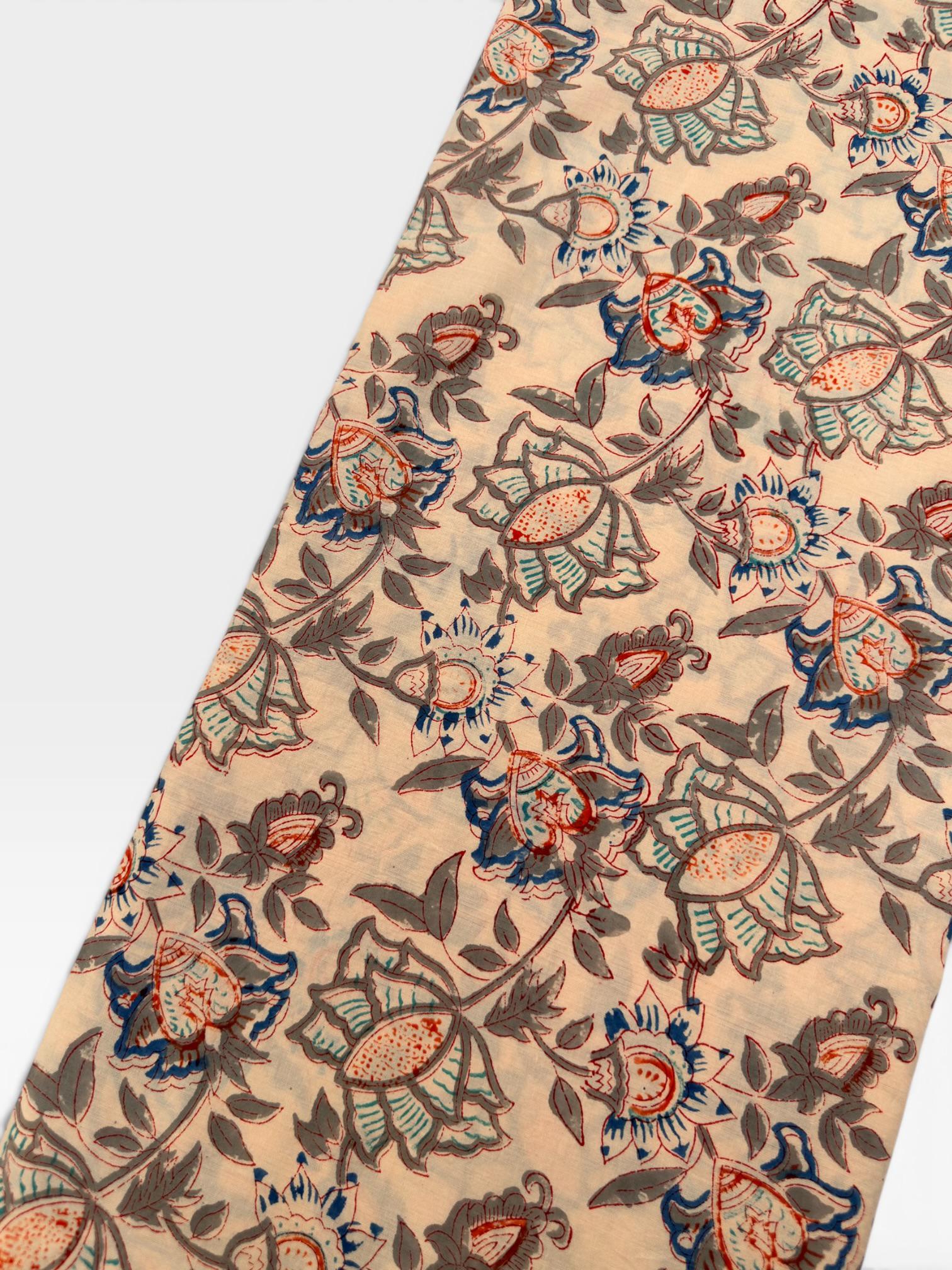 Add a touch of vintage elegance to your creations with this handcrafted block print cotton fabric, featuring a beautifully balanced blend of soft neutrals and rich accents. Designed on a warm beige (cream) base, this fabric showcases intricate floral motifs in shades of dusty blue, rust red, and muted grey, creating a timeless and artistic appeal.