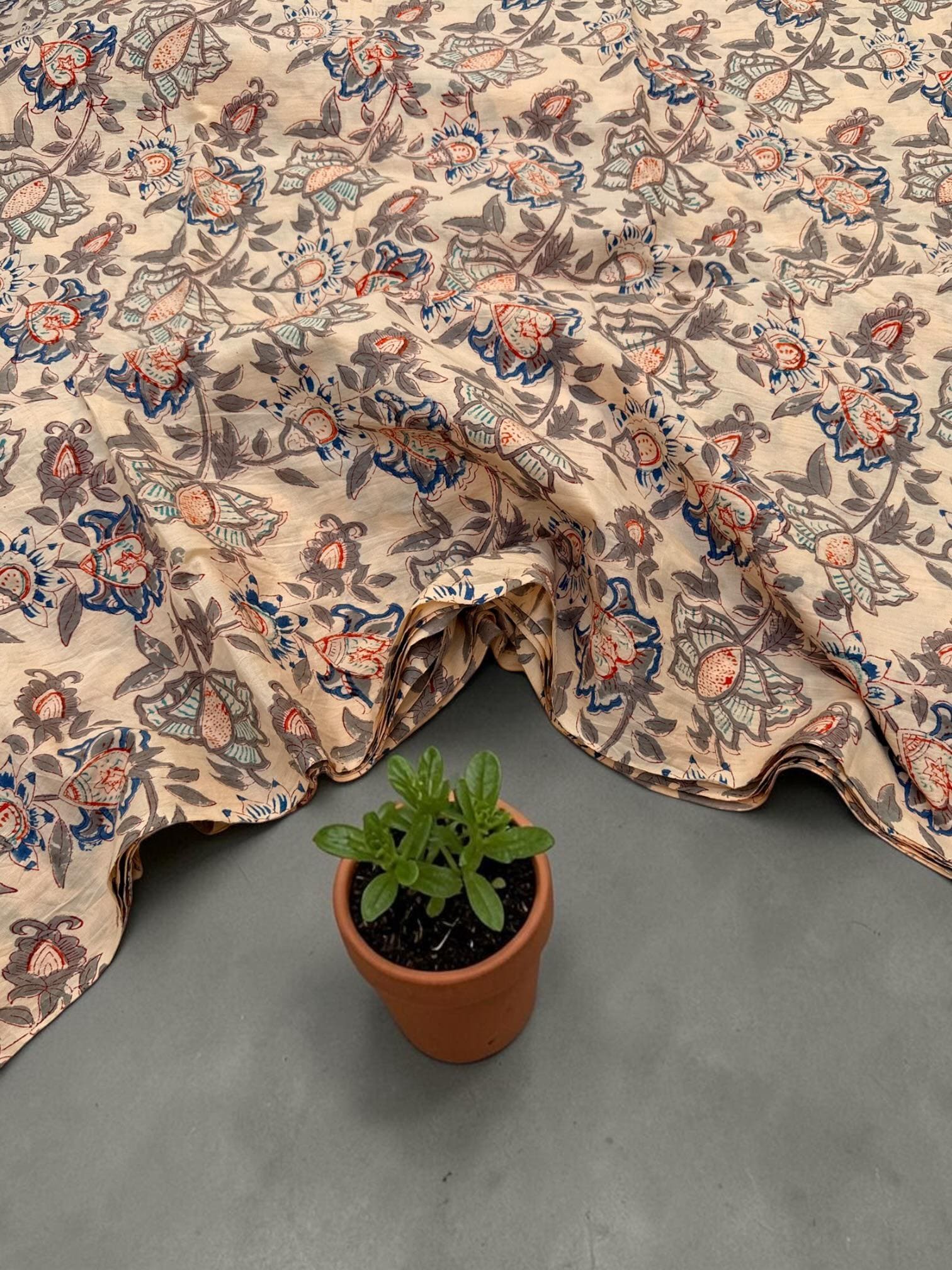 The flowing botanical pattern is inspired by traditional Indian craftsmanship, where each design is carefully hand-stamped using wooden blocks. The subtle yet striking color combination makes this fabric perfect for both modern minimal aesthetics and classic boho styles.