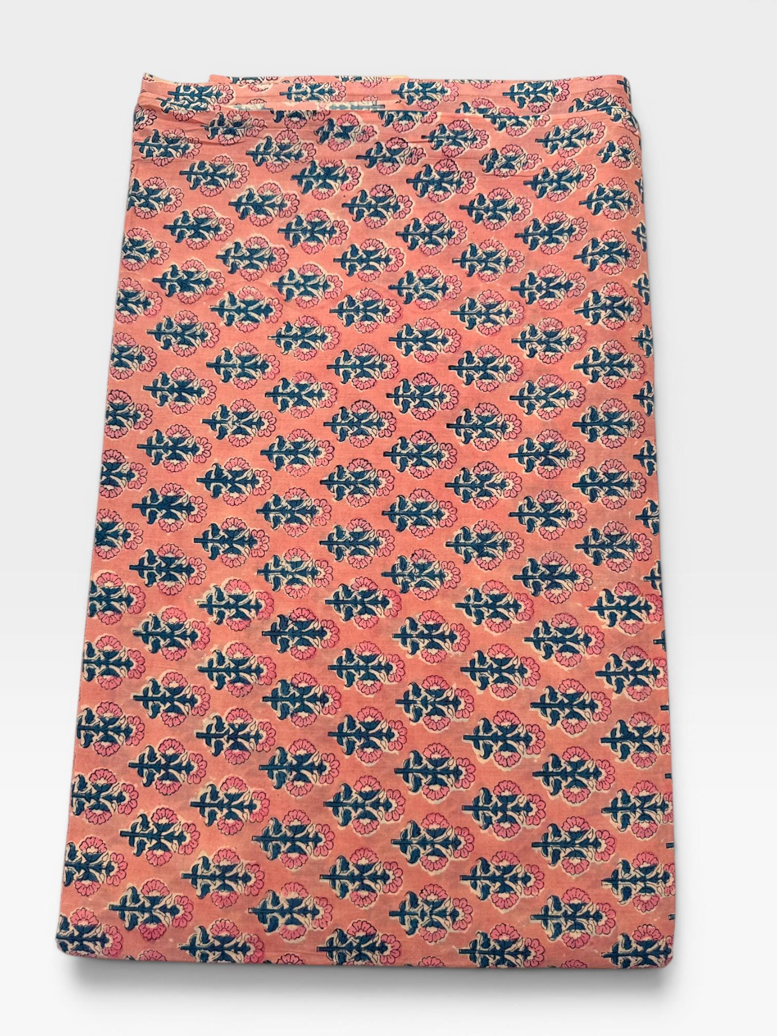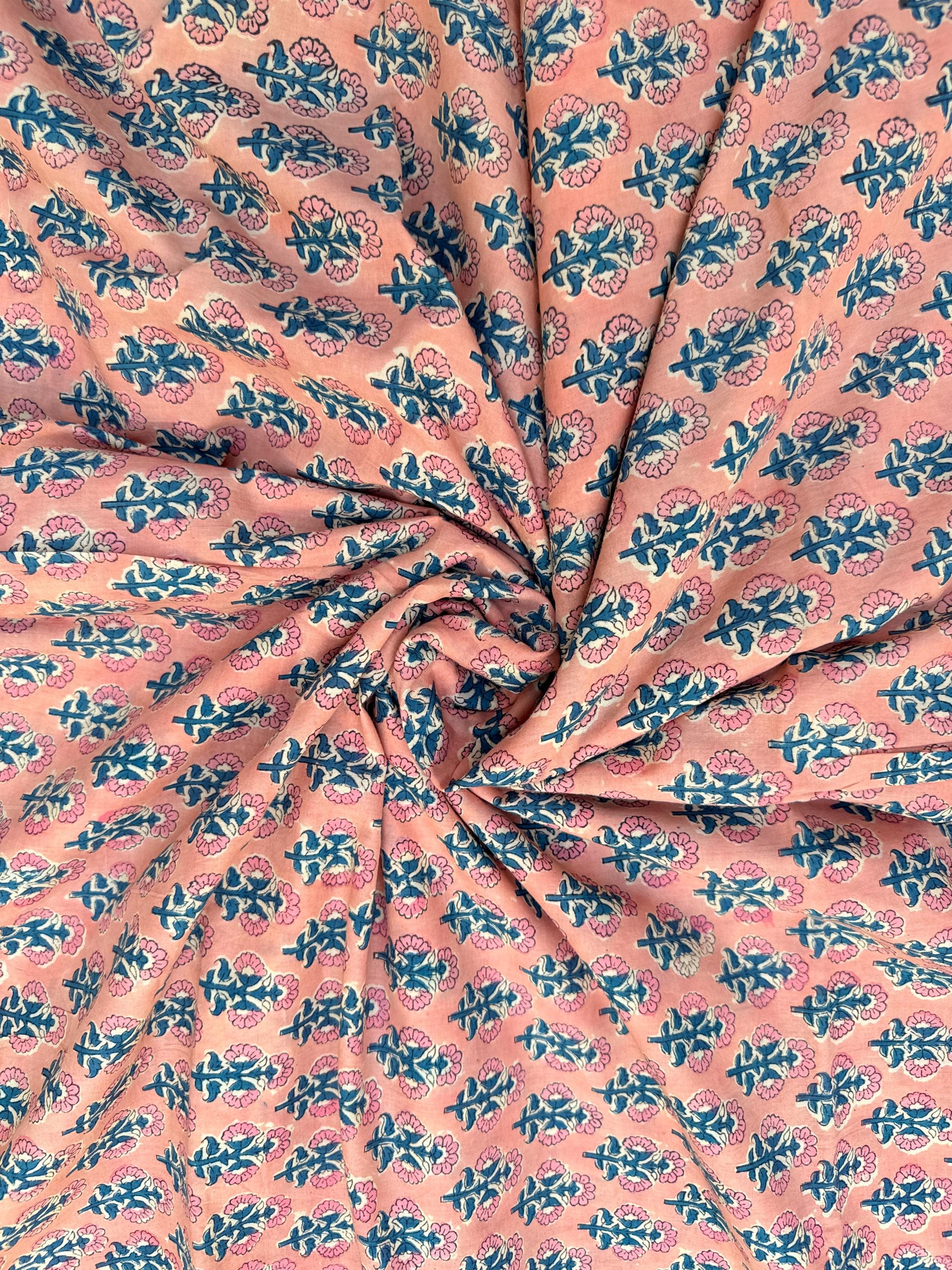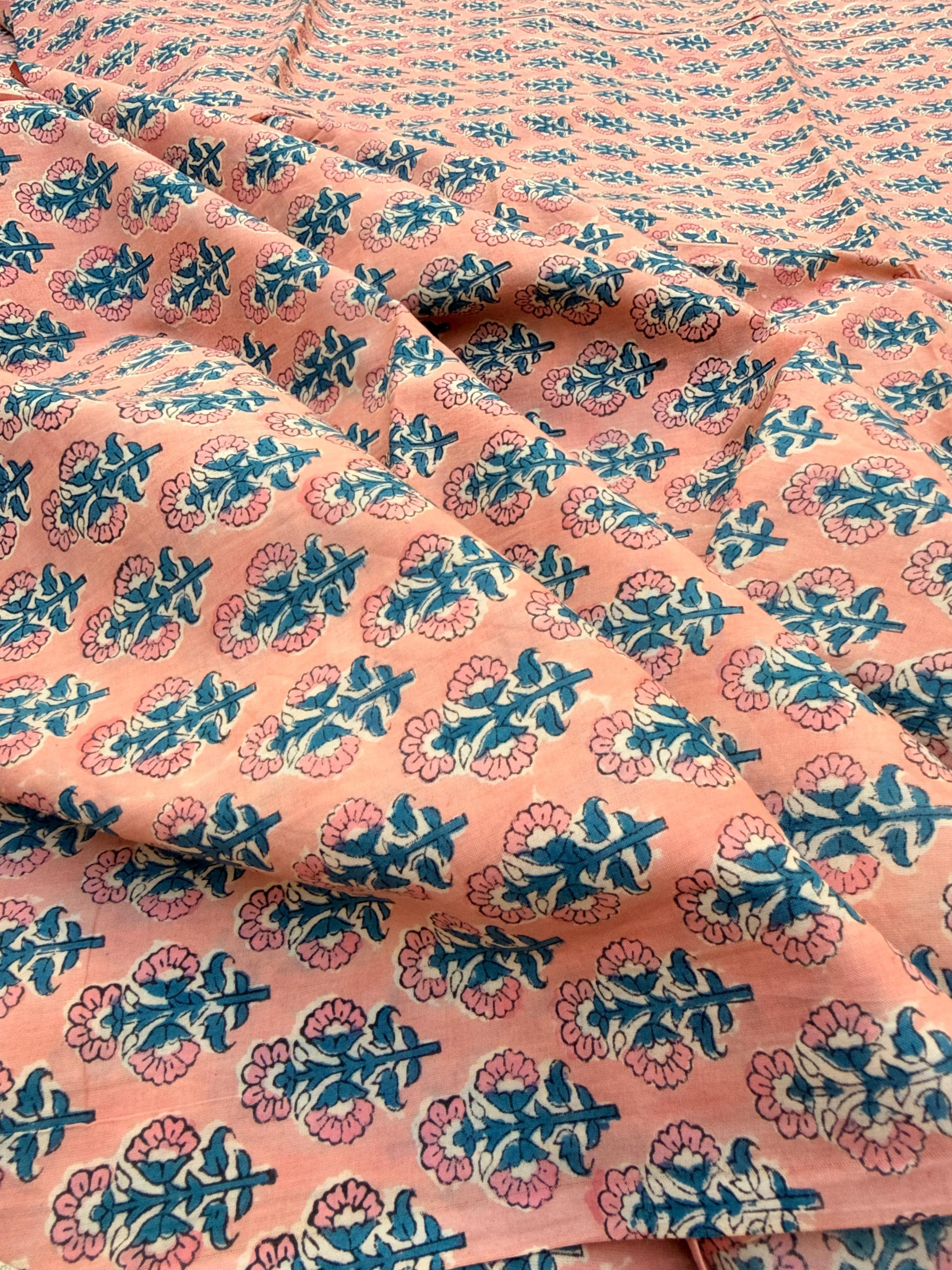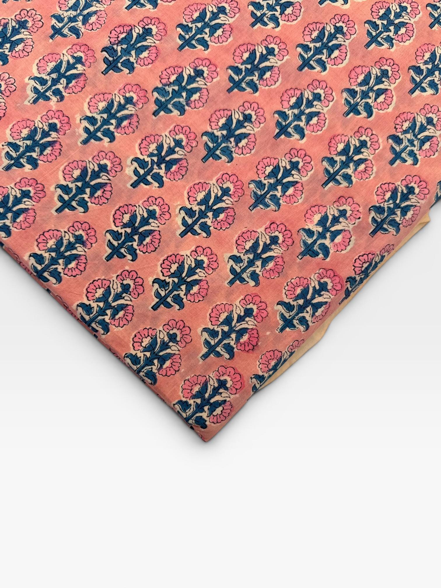 Add a soft, romantic touch to your designs with this beautiful hand block print cotton fabric, crafted using traditional Indian techniques. Featuring a warm peachy pink base, this fabric is adorned with charming small floral motifs in deep blue and soft rose pink, arranged in a delicate, repeating pattern.