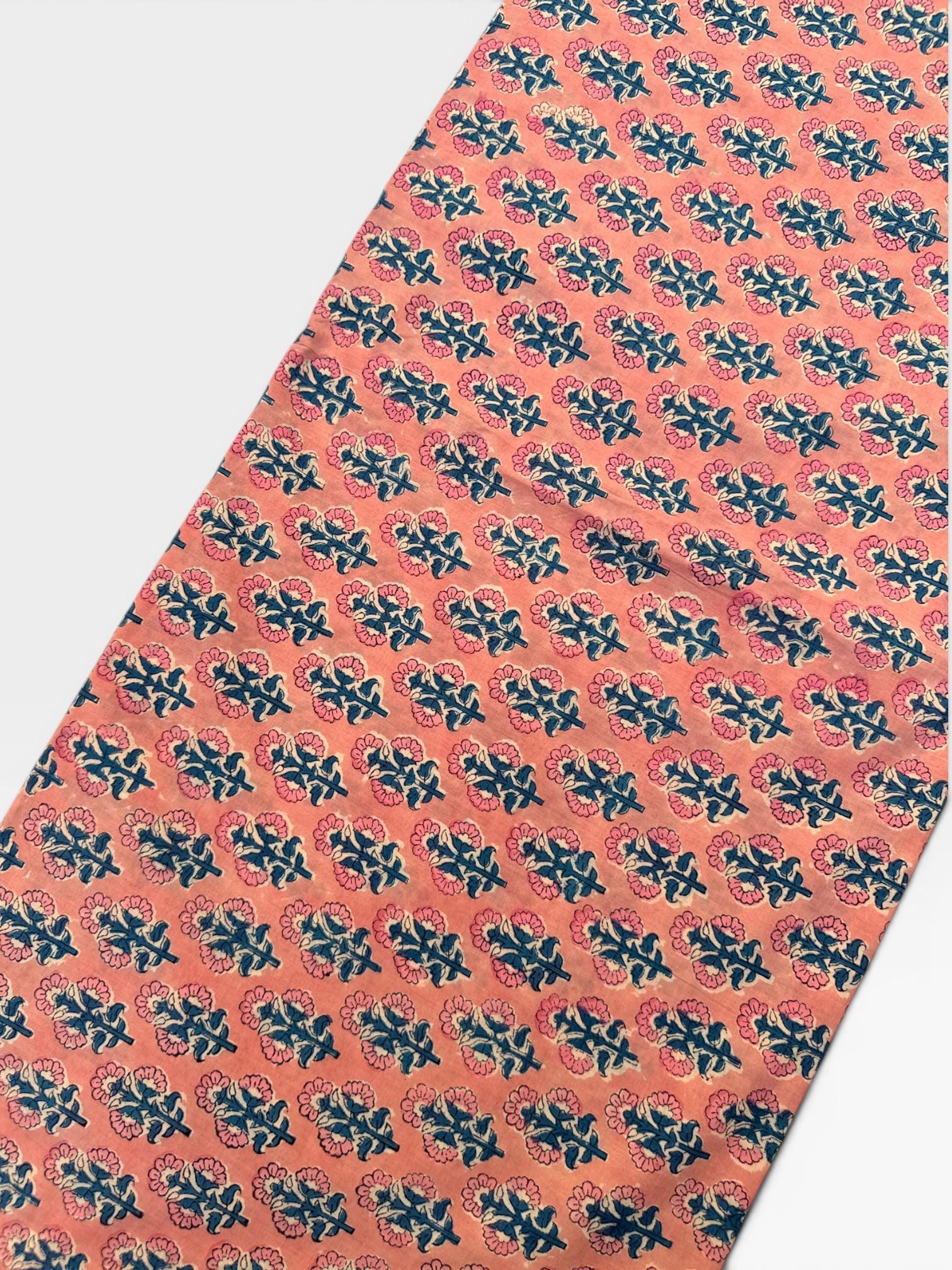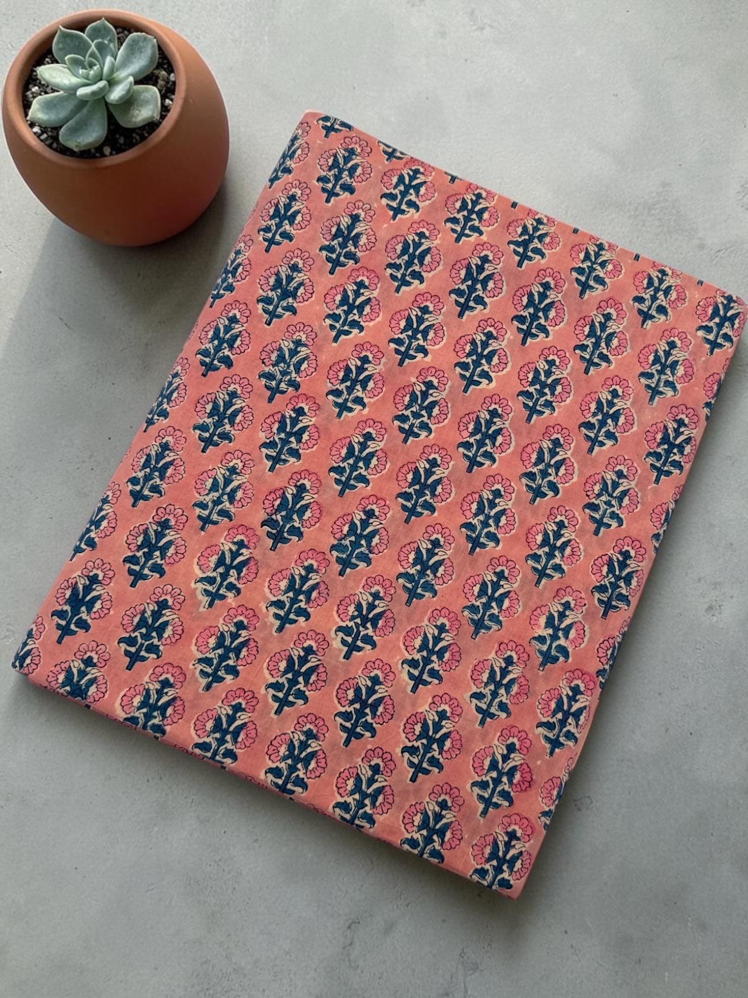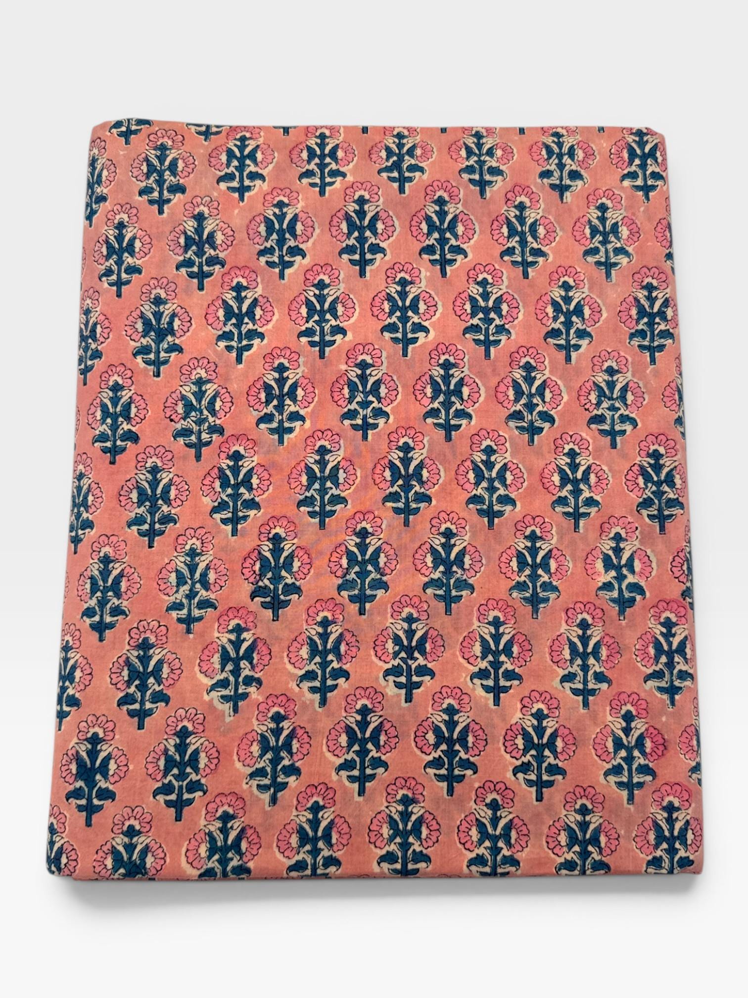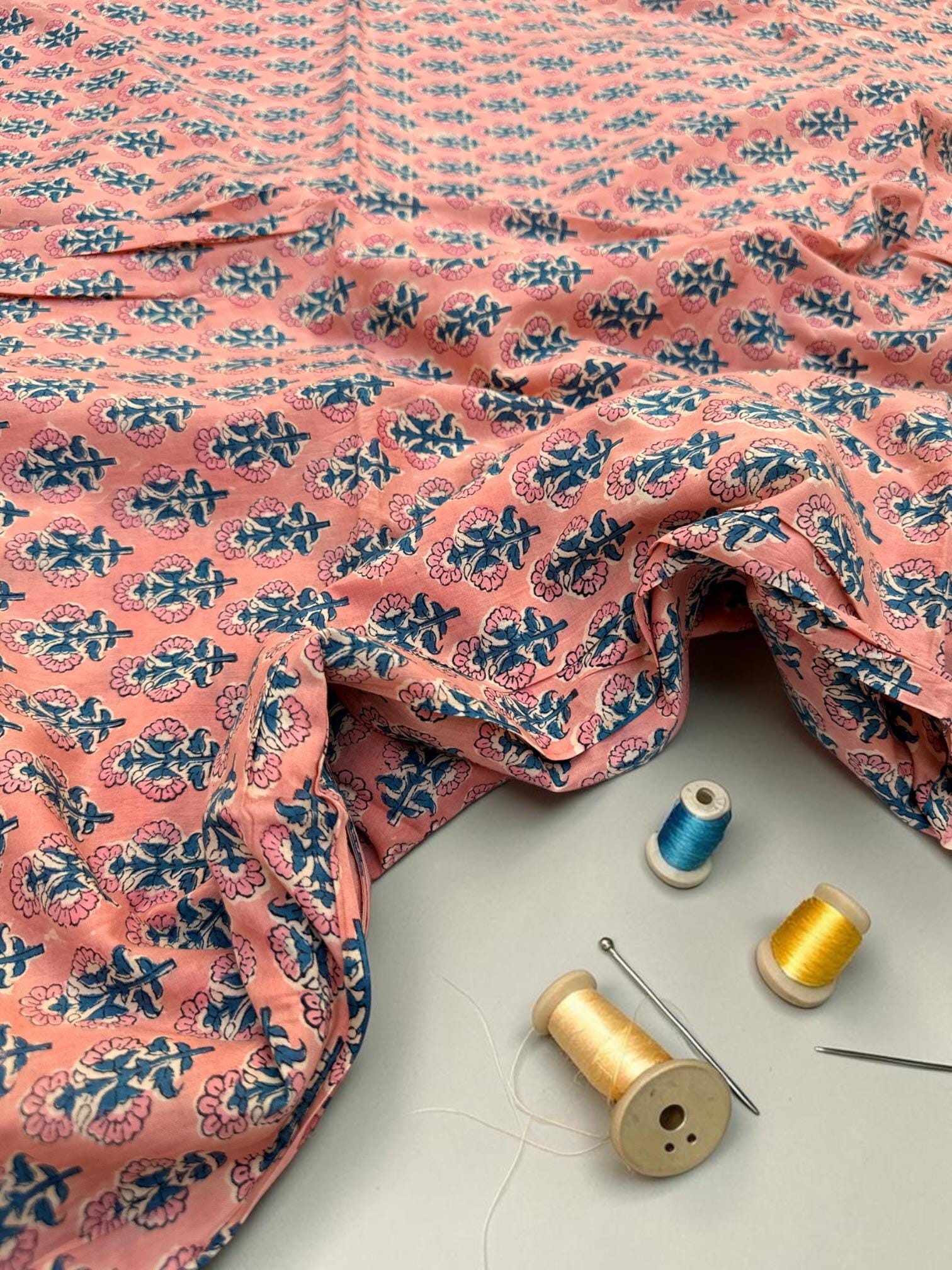 Add a soft, romantic touch to your designs with this beautiful hand block print cotton fabric, crafted using traditional Indian techniques. Featuring a warm peachy pink base, this fabric is adorned with charming small floral motifs in deep blue and soft rose pink, arranged in a delicate, repeating pattern.