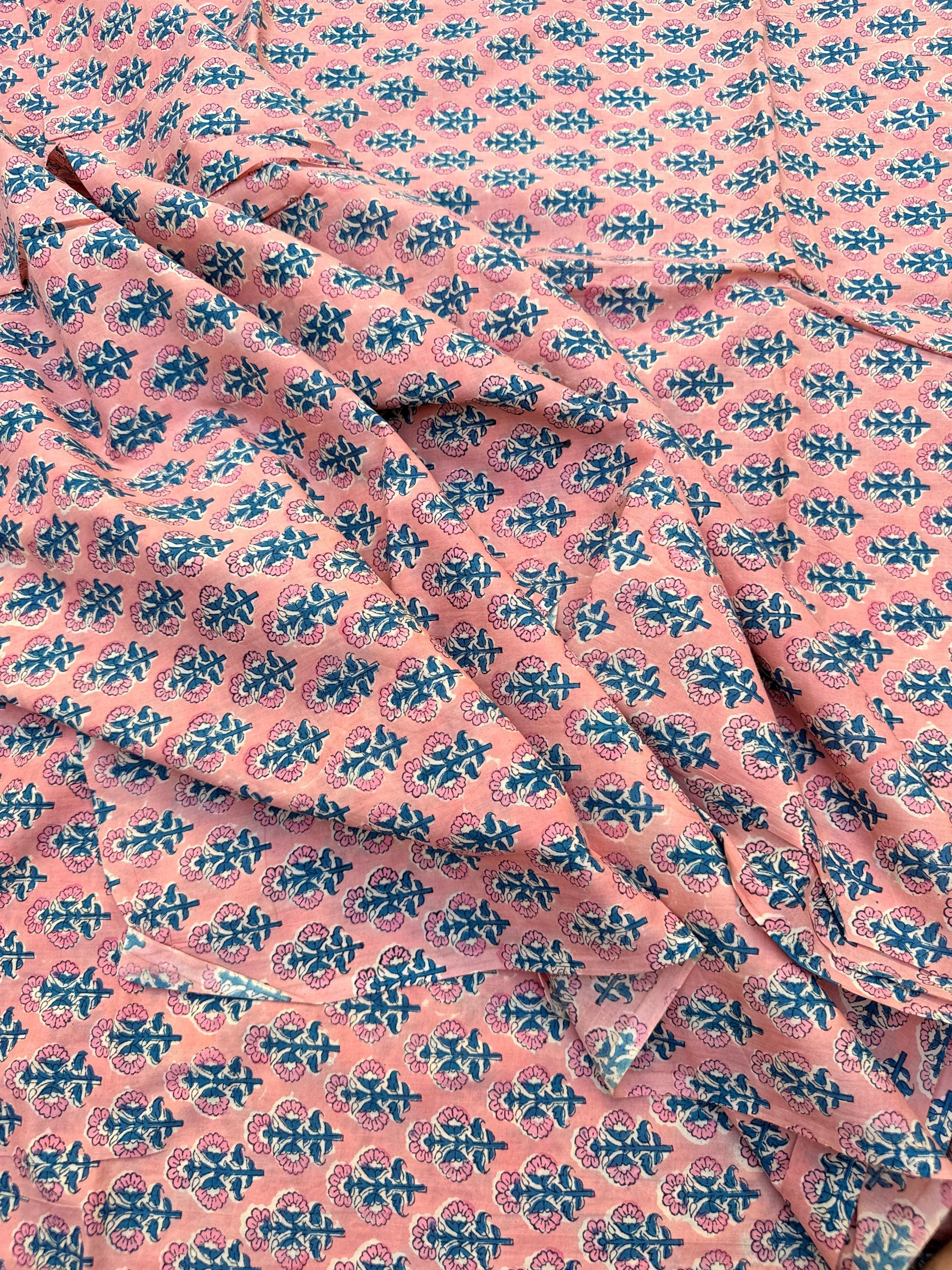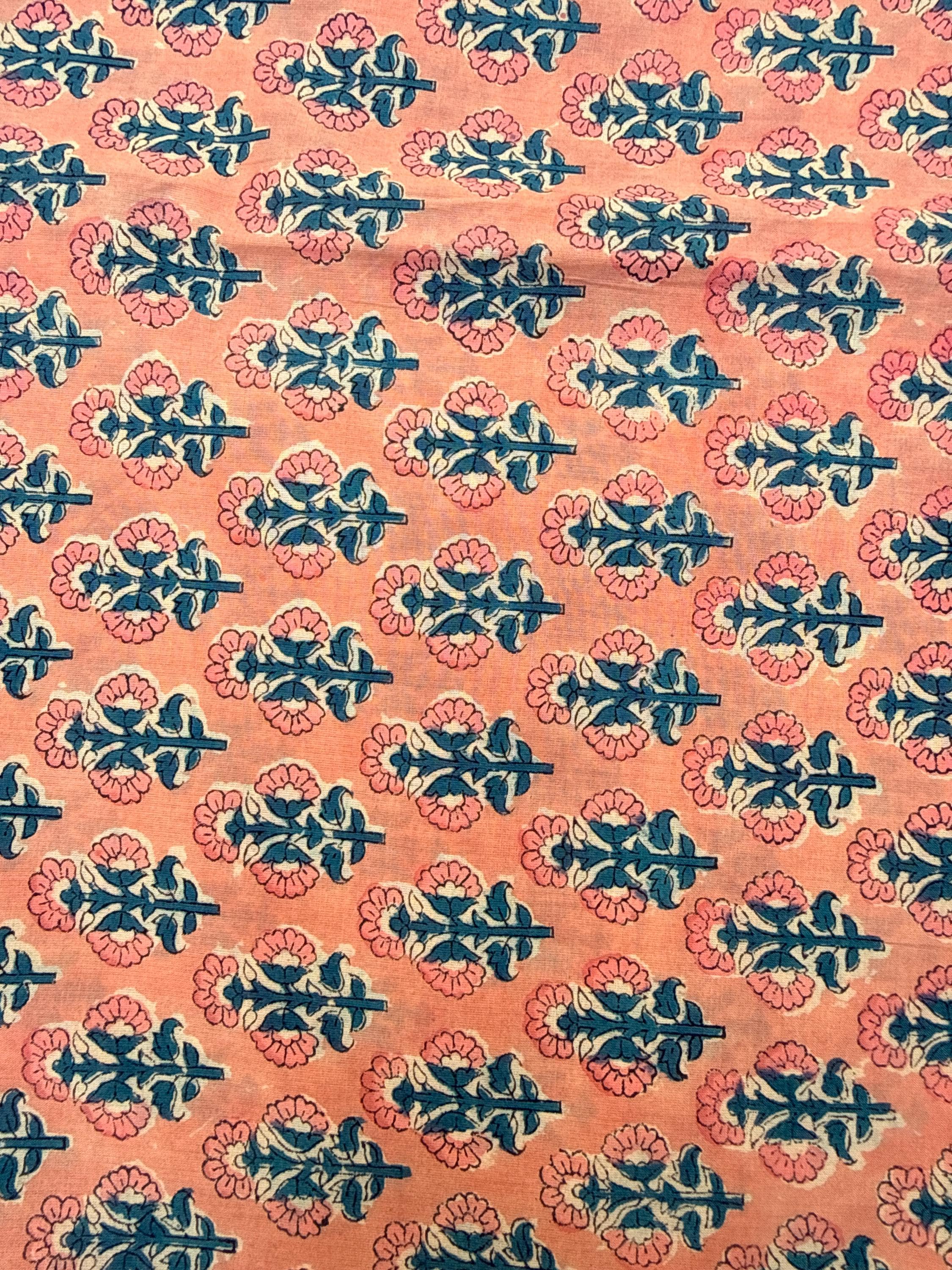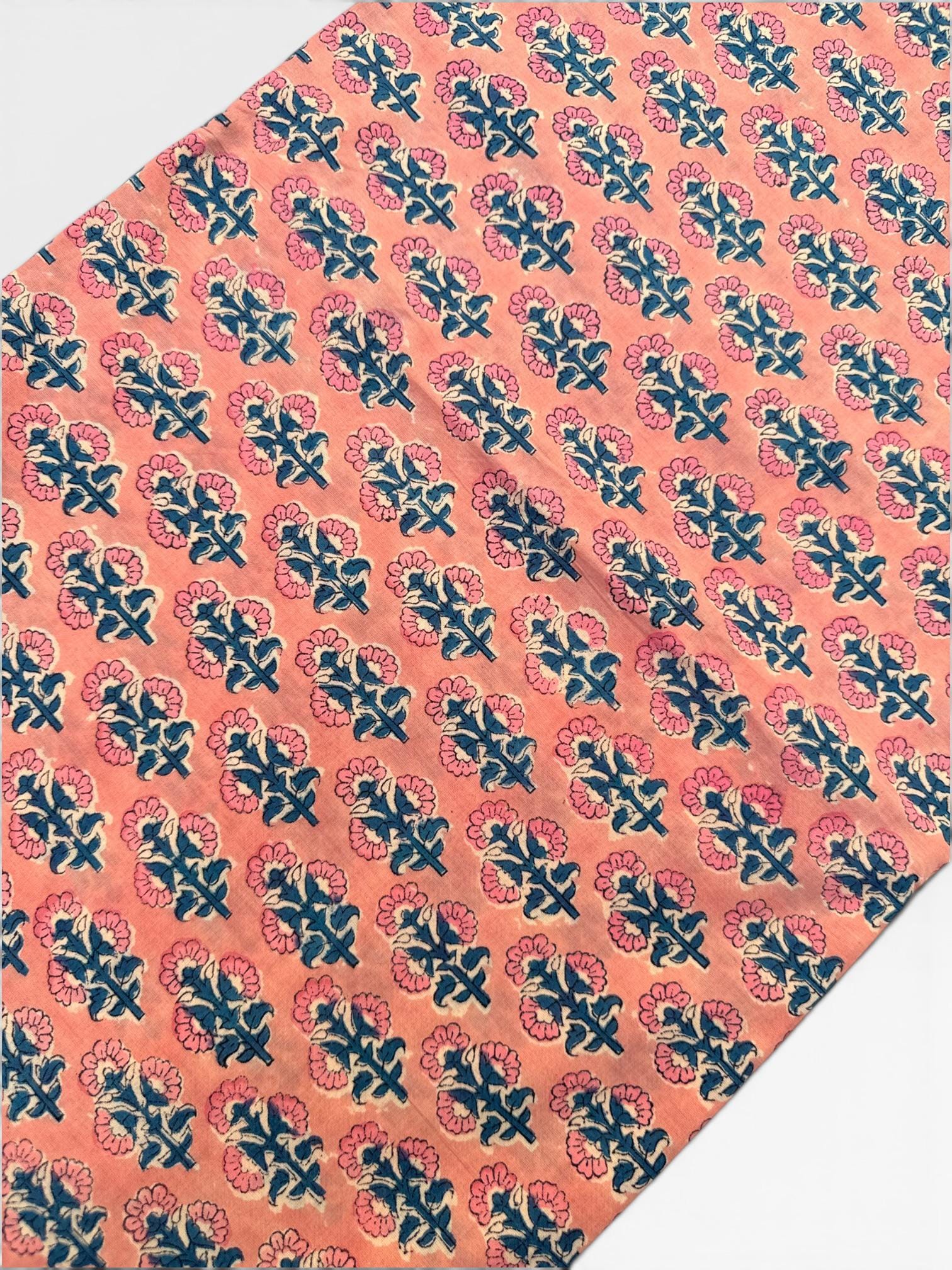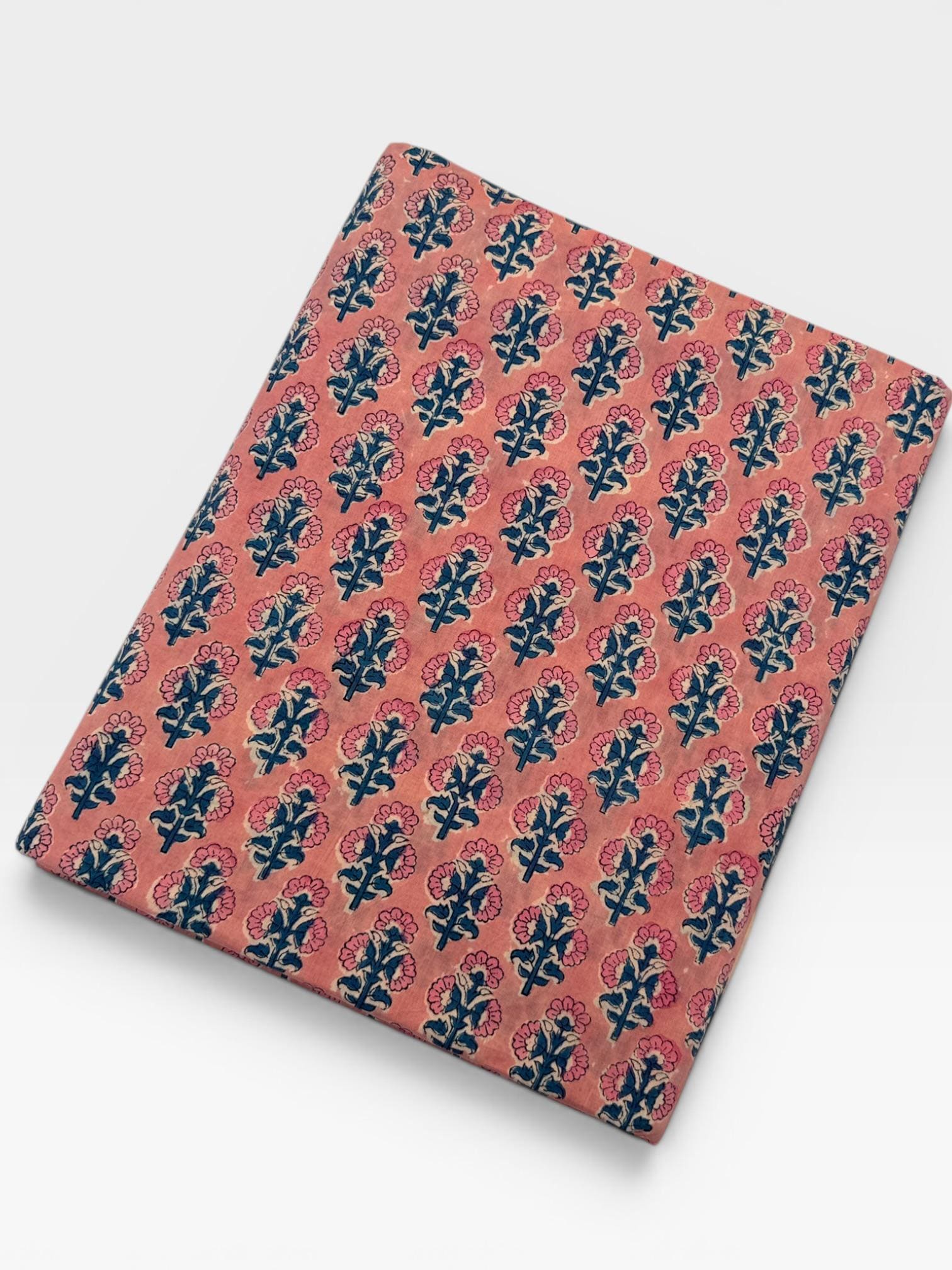 Add a soft, romantic touch to your designs with this beautiful hand block print cotton fabric, crafted using traditional Indian techniques. Featuring a warm peachy pink base, this fabric is adorned with charming small floral motifs in deep blue and soft rose pink, arranged in a delicate, repeating pattern.