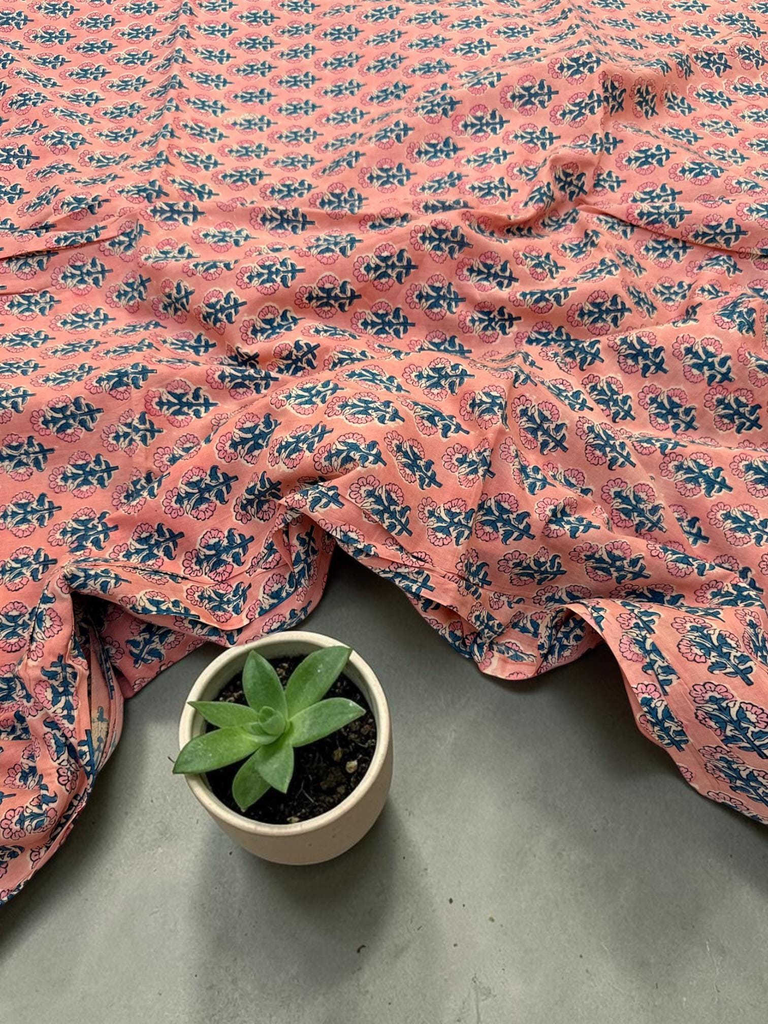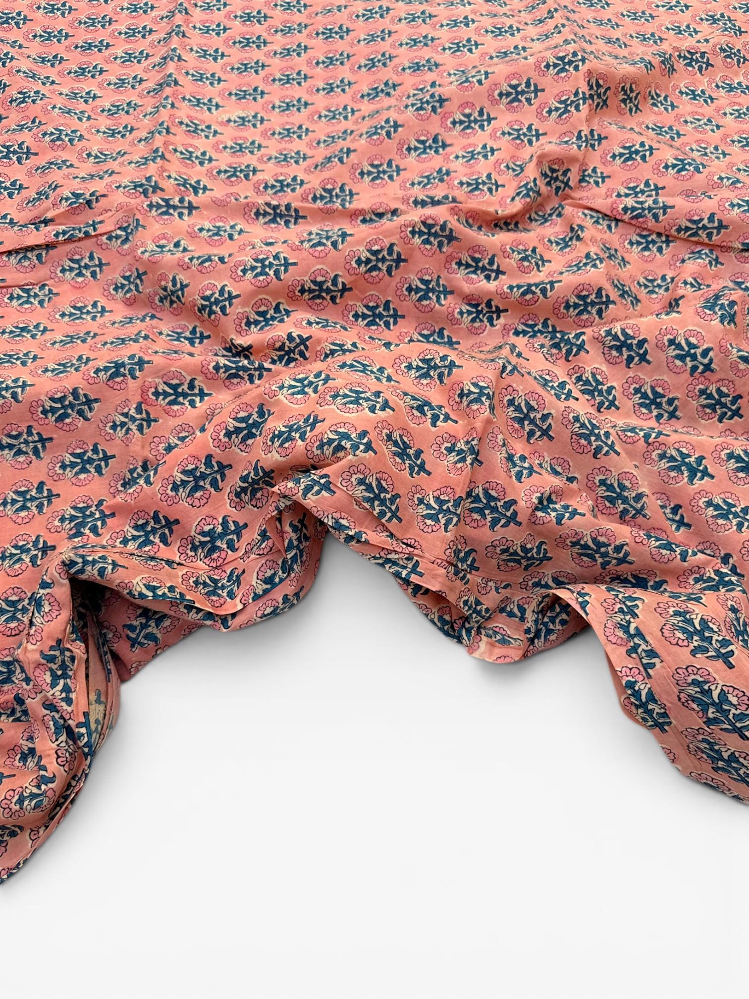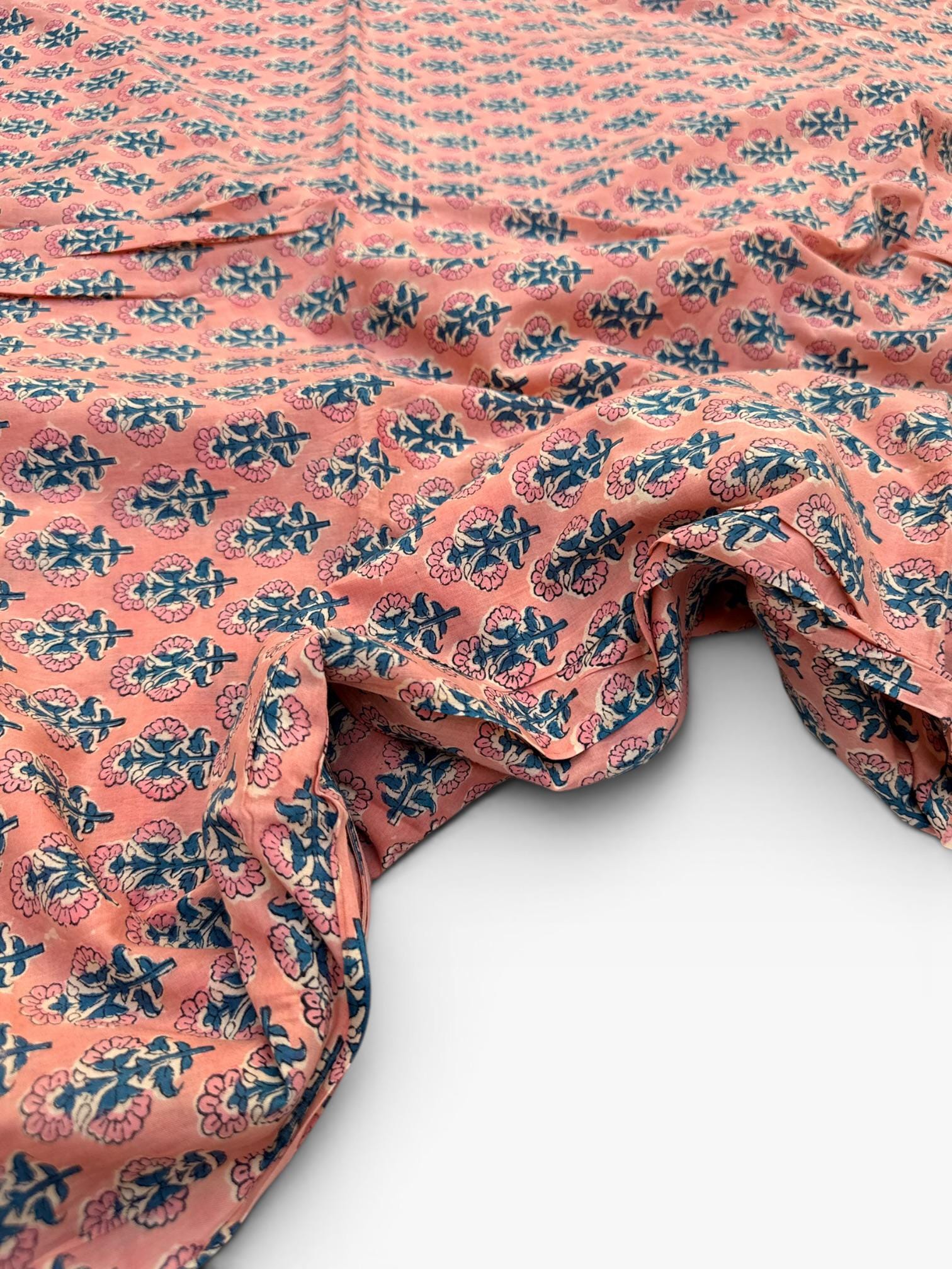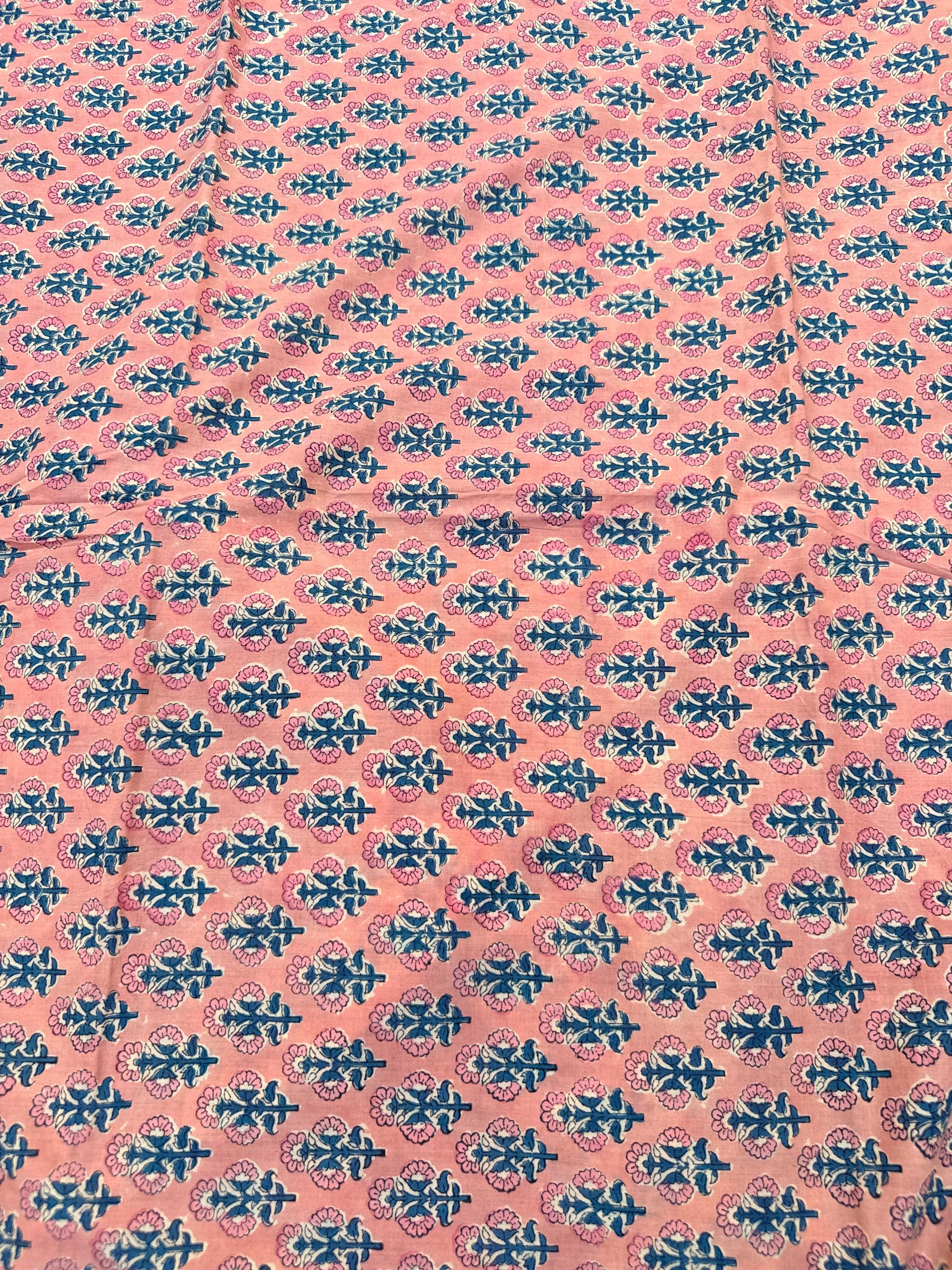 Add a soft, romantic touch to your designs with this beautiful hand block print cotton fabric, crafted using traditional Indian techniques. Featuring a warm peachy pink base, this fabric is adorned with charming small floral motifs in deep blue and soft rose pink, arranged in a delicate, repeating pattern.