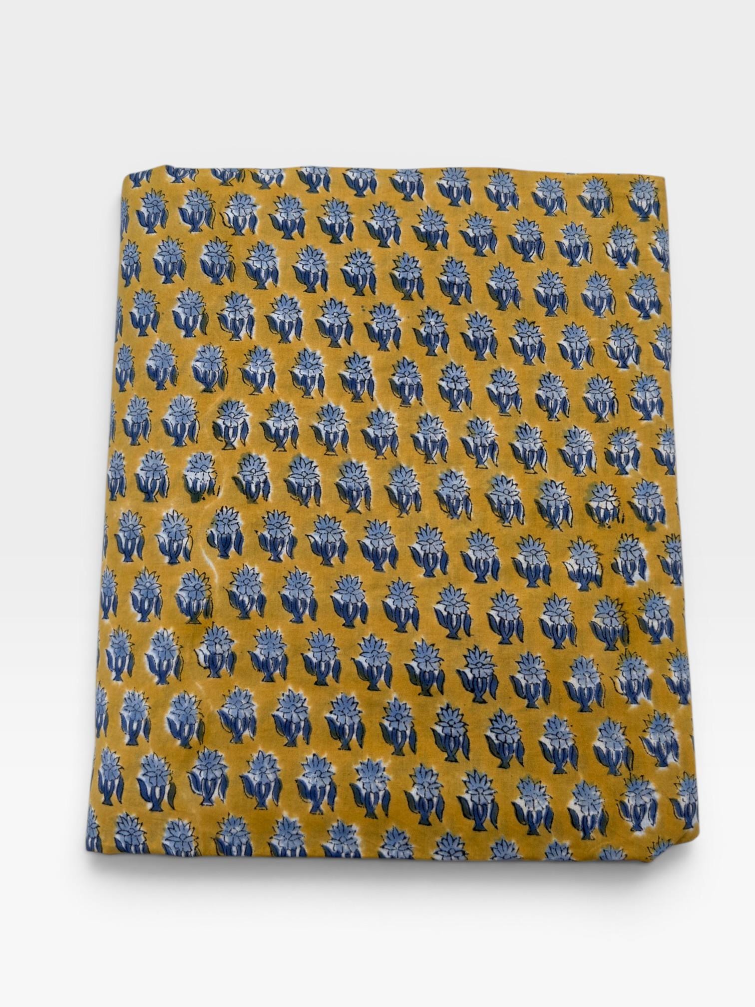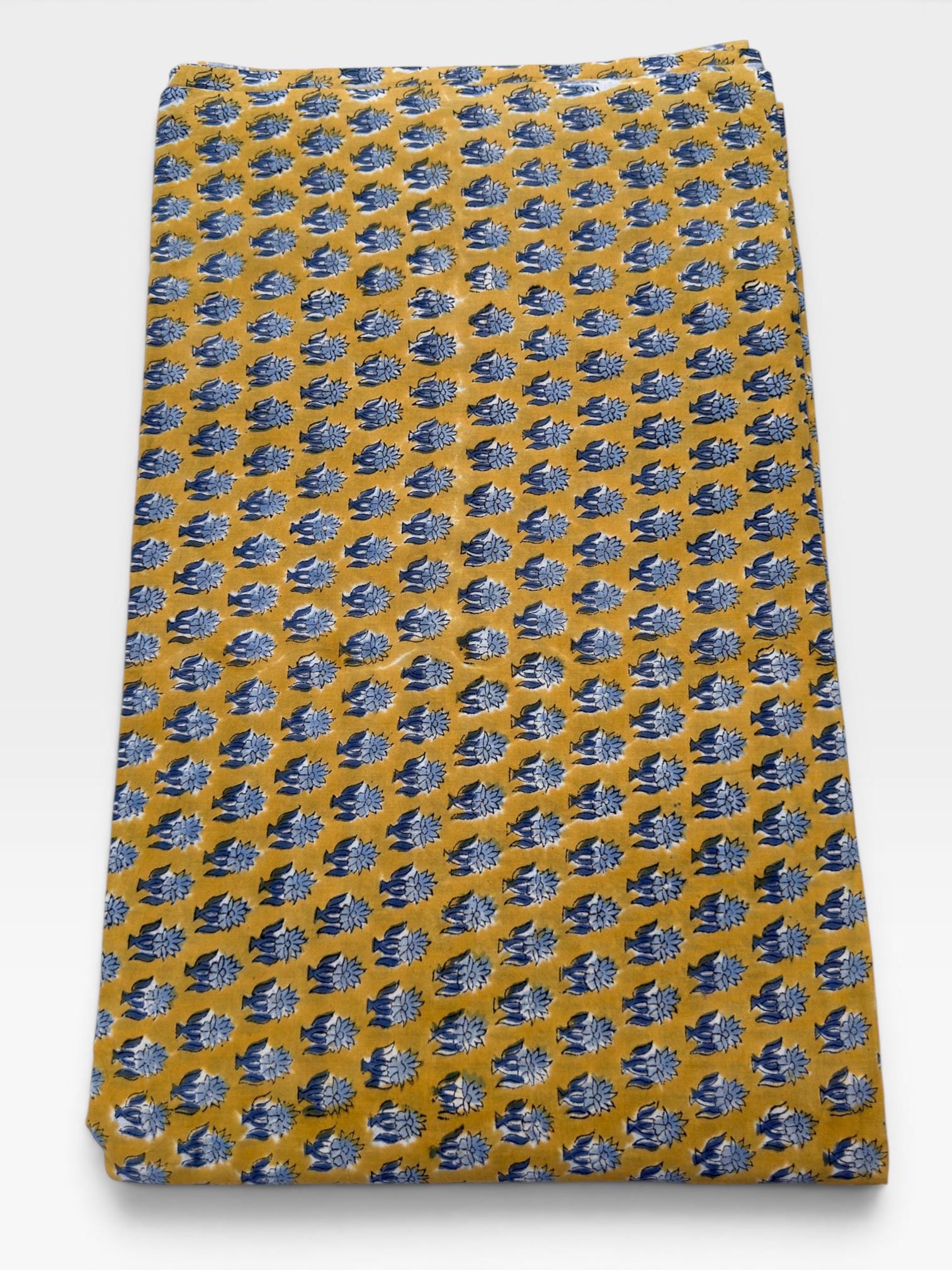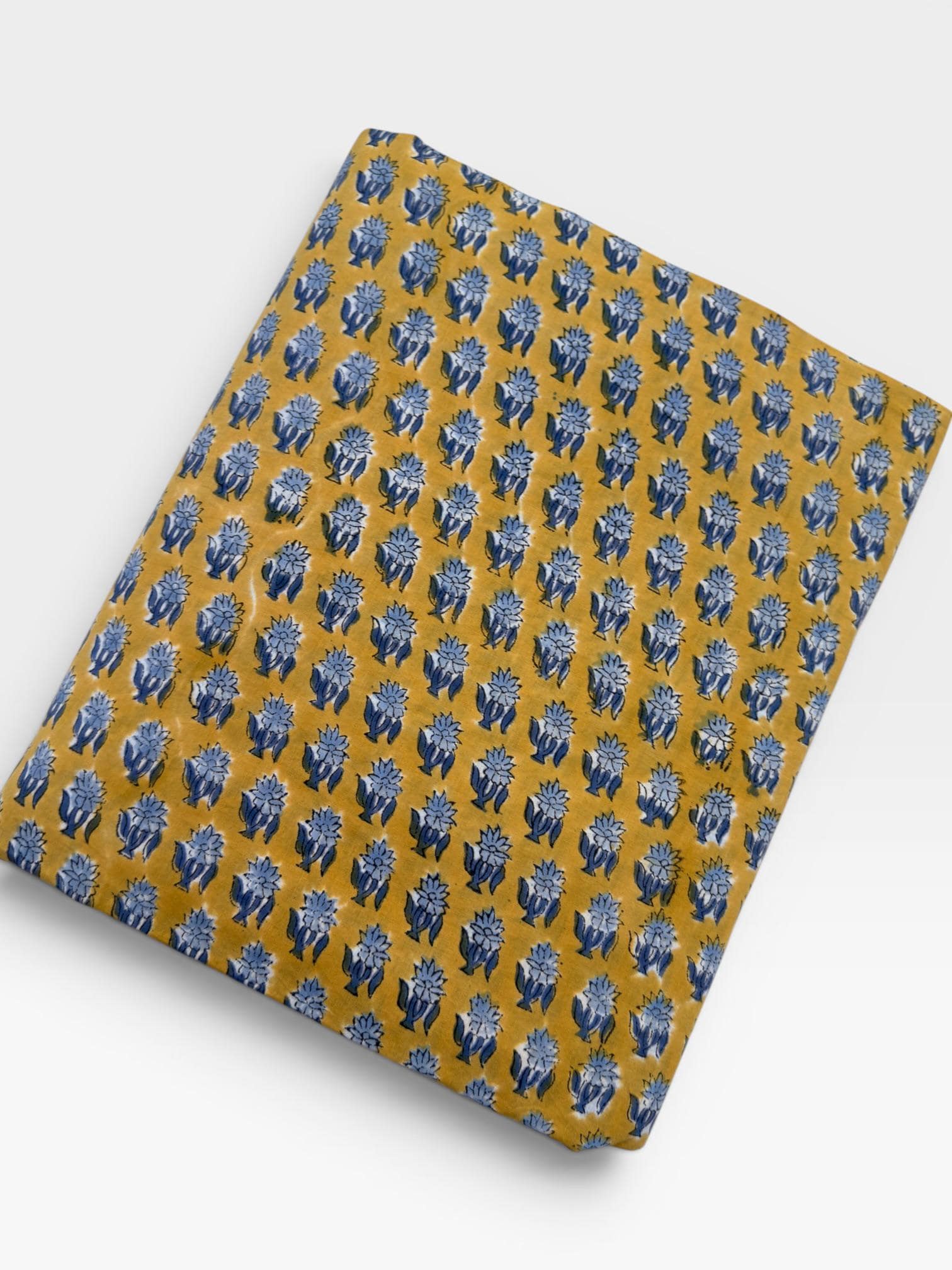 Bring warmth and timeless charm to your creations with this beautifully handcrafted block print cotton fabric. Featuring a rich mustard yellow base adorned with delicate indigo blue floral motifs, this textile captures the essence of traditional Indian artistry with a modern bohemian appeal.