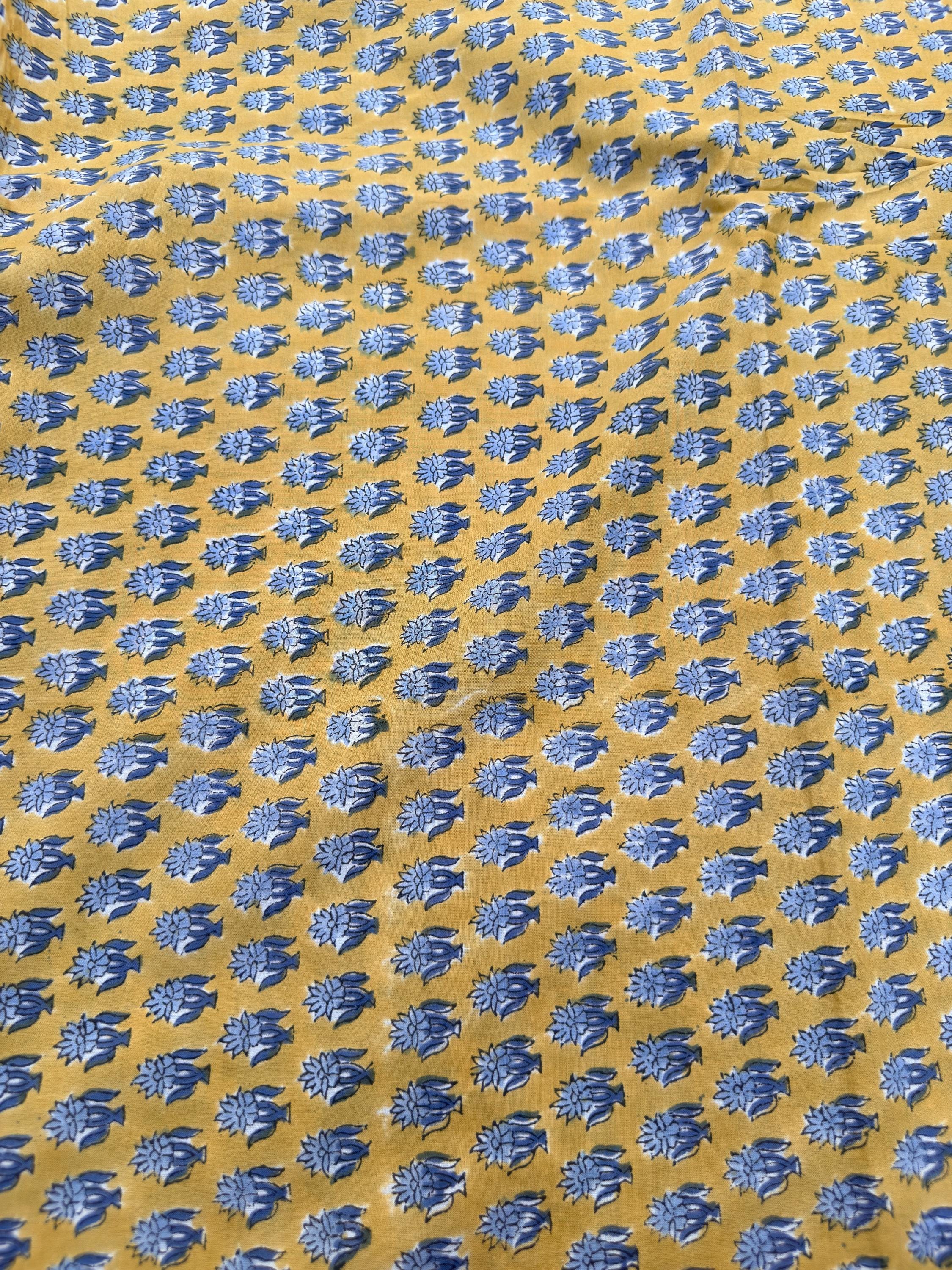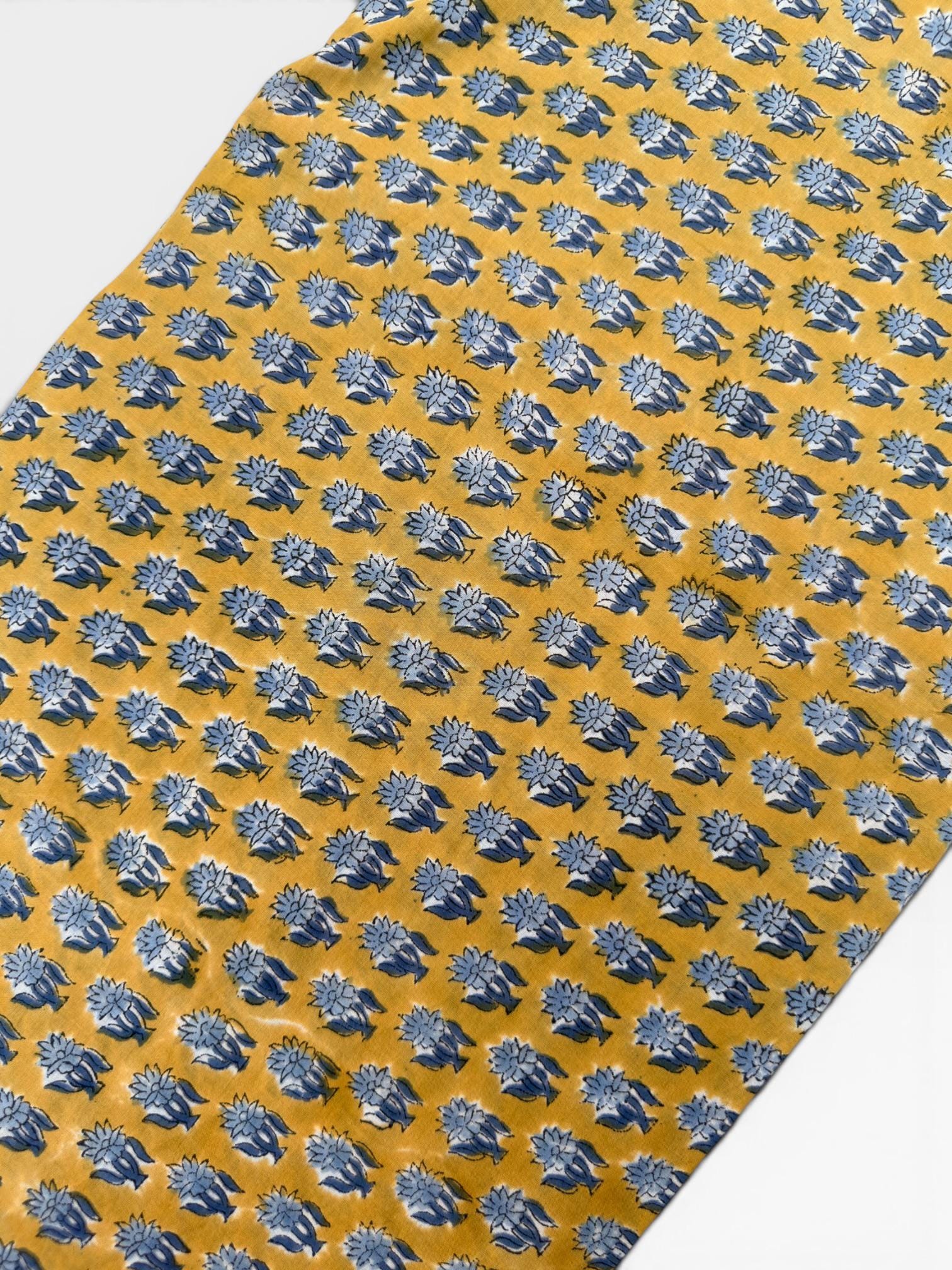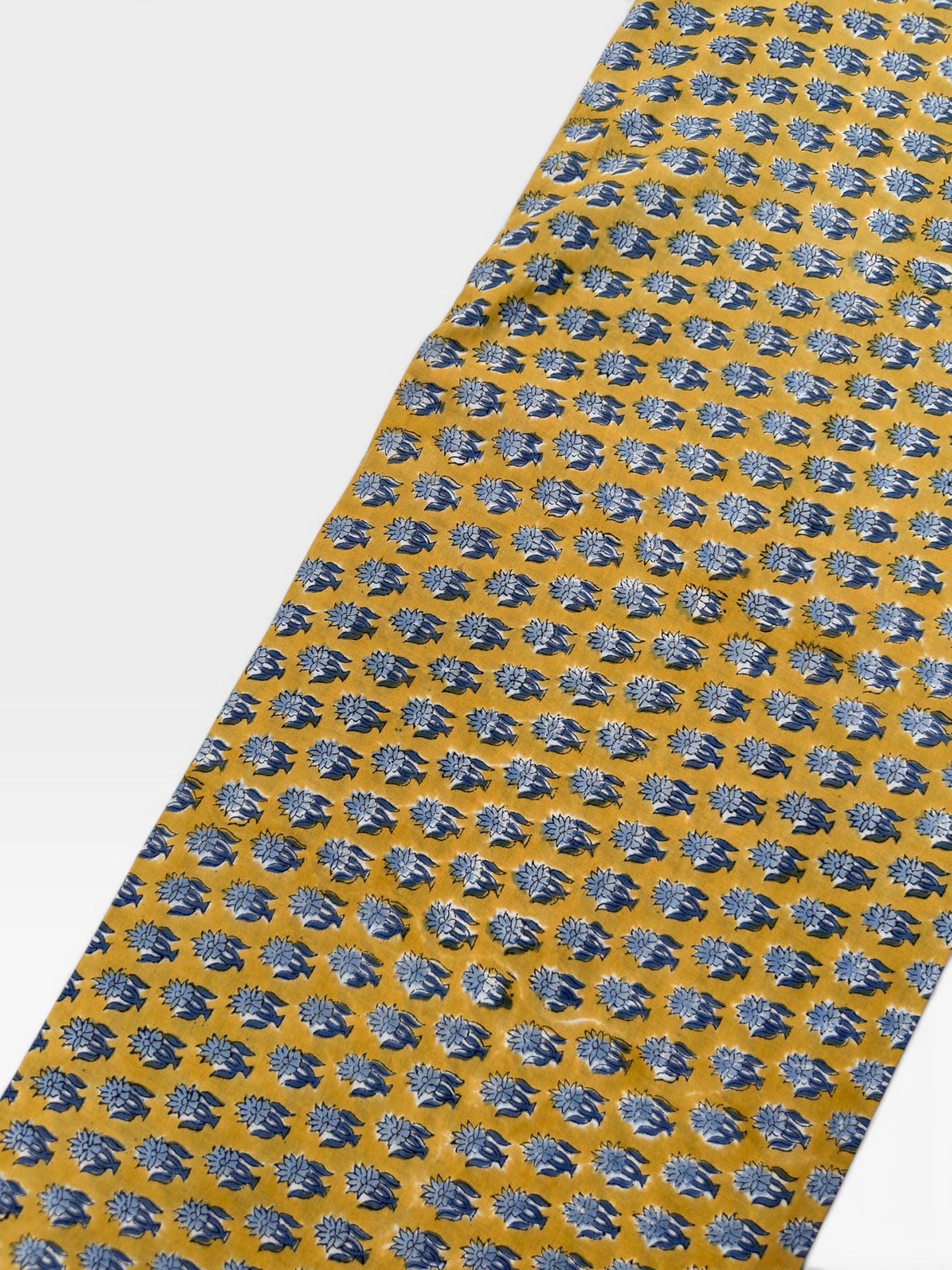 Bring warmth and timeless charm to your creations with this beautifully handcrafted block print cotton fabric. Featuring a rich mustard yellow base adorned with delicate indigo blue floral motifs, this textile captures the essence of traditional Indian artistry with a modern bohemian appeal.