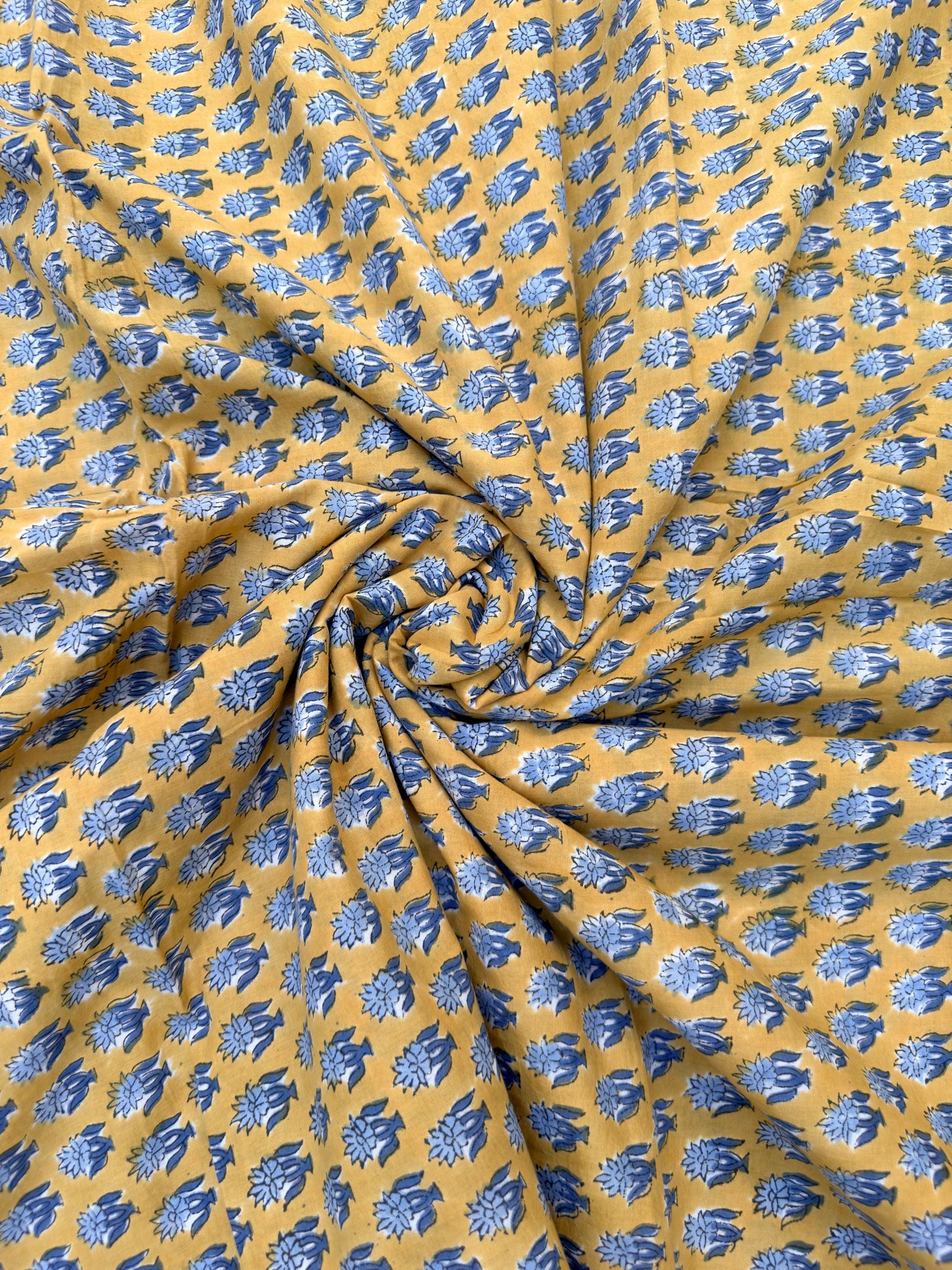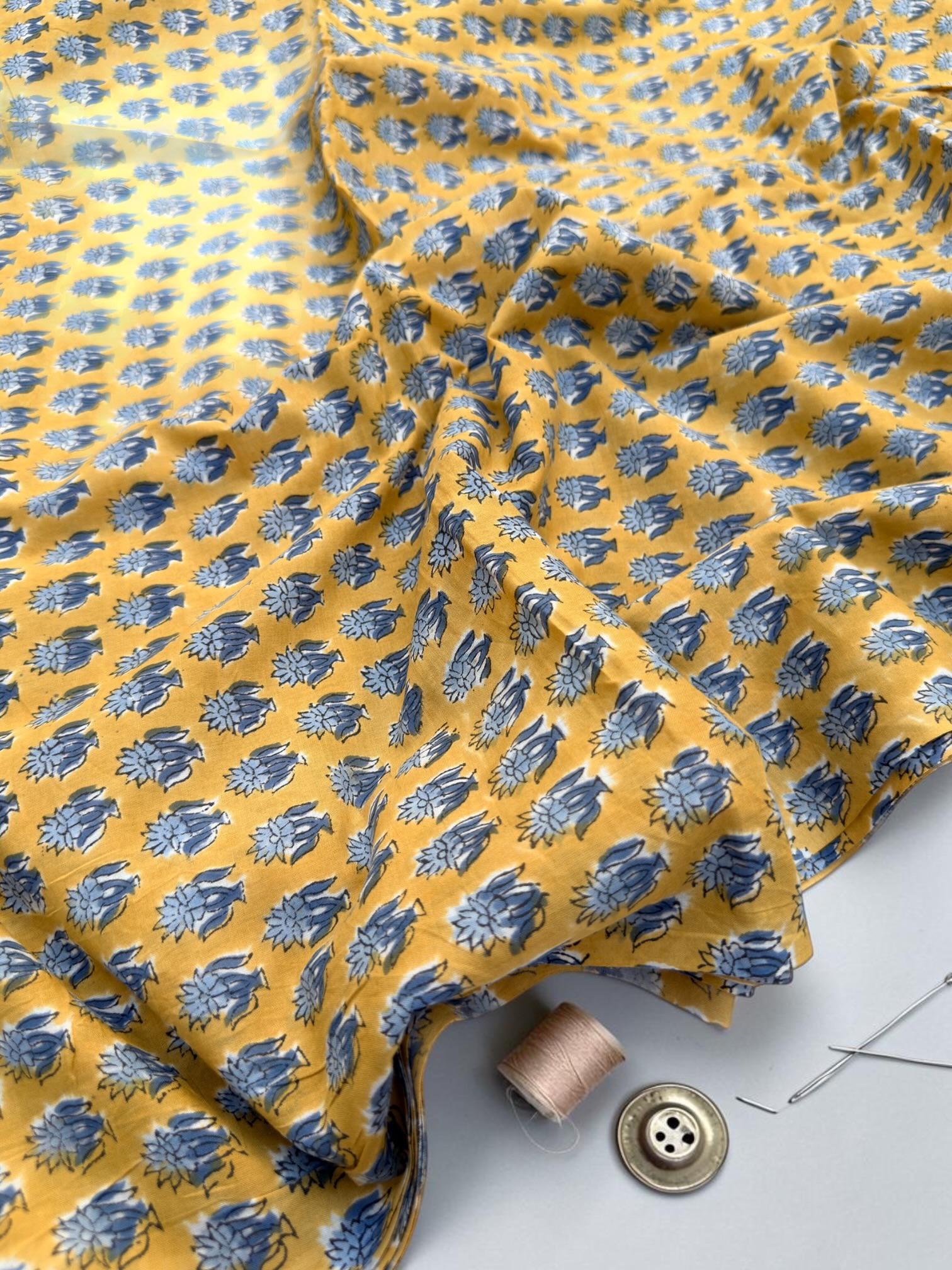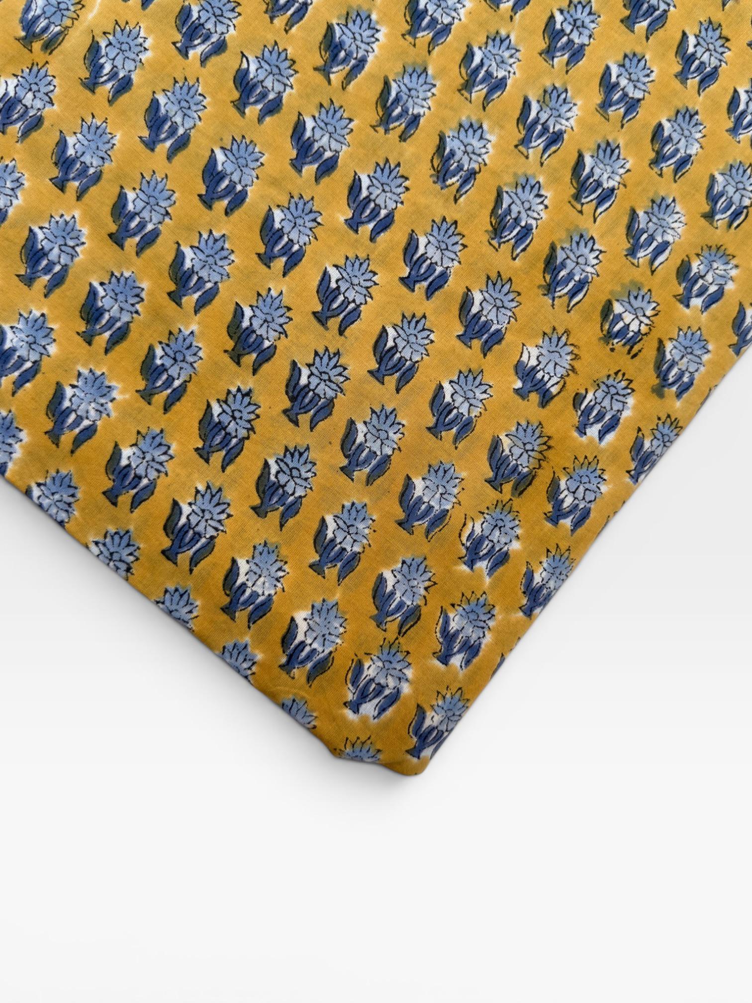 Mustard Yellow & Indigo Blue Floral Block Print Cotton Fabric | Hand Block Printed Indian Cotton | Boho Floral Fabric by Yard