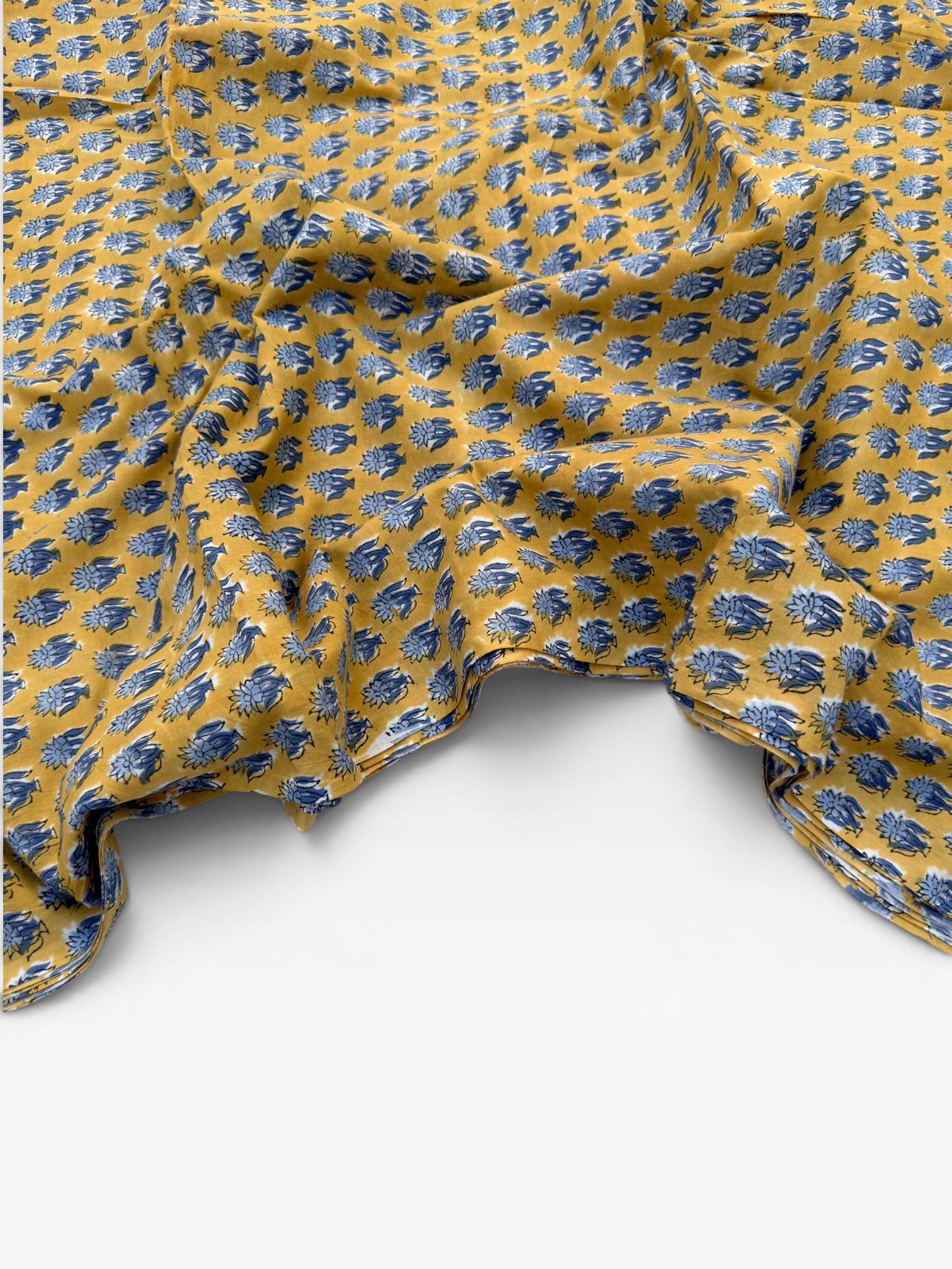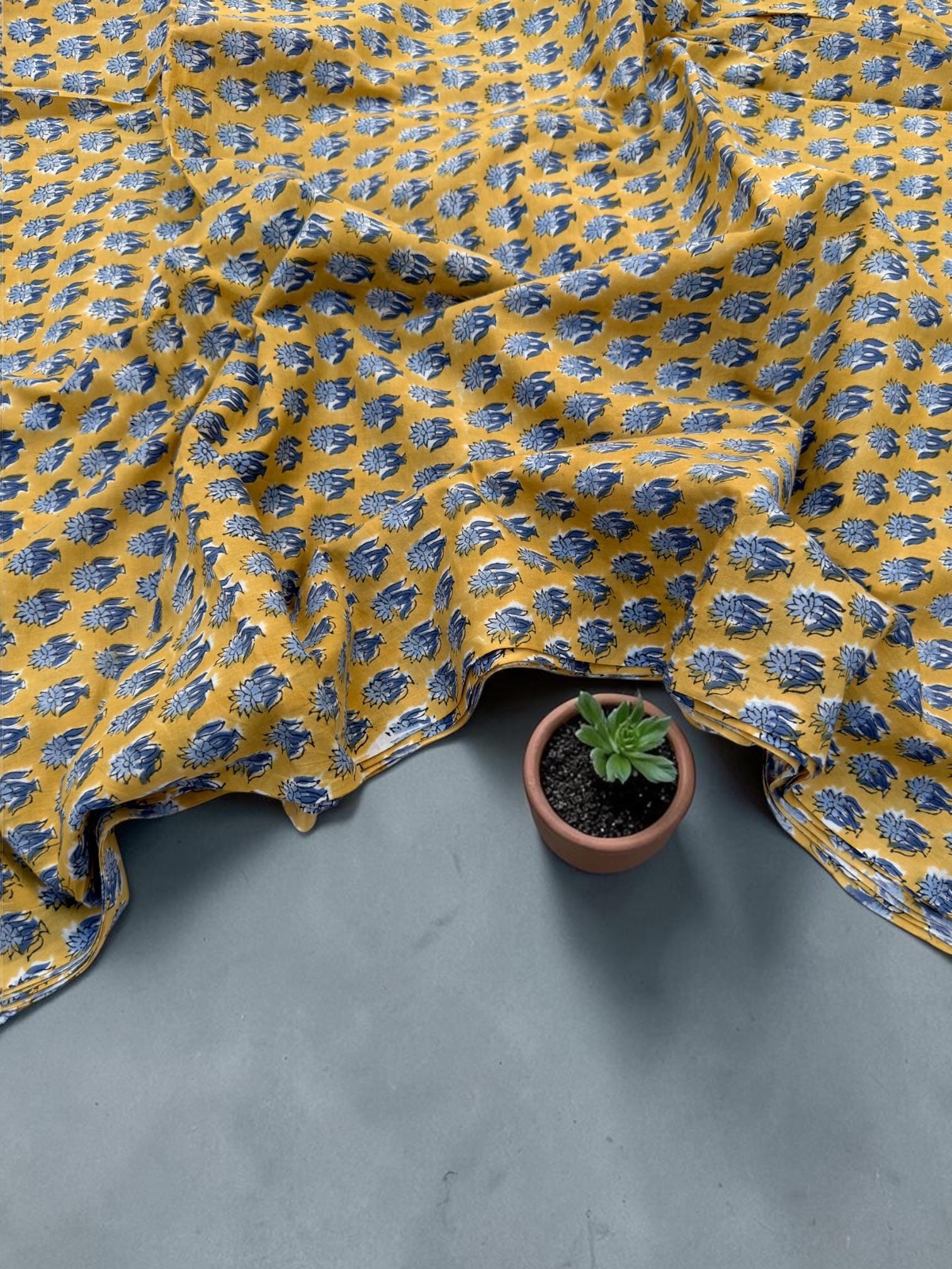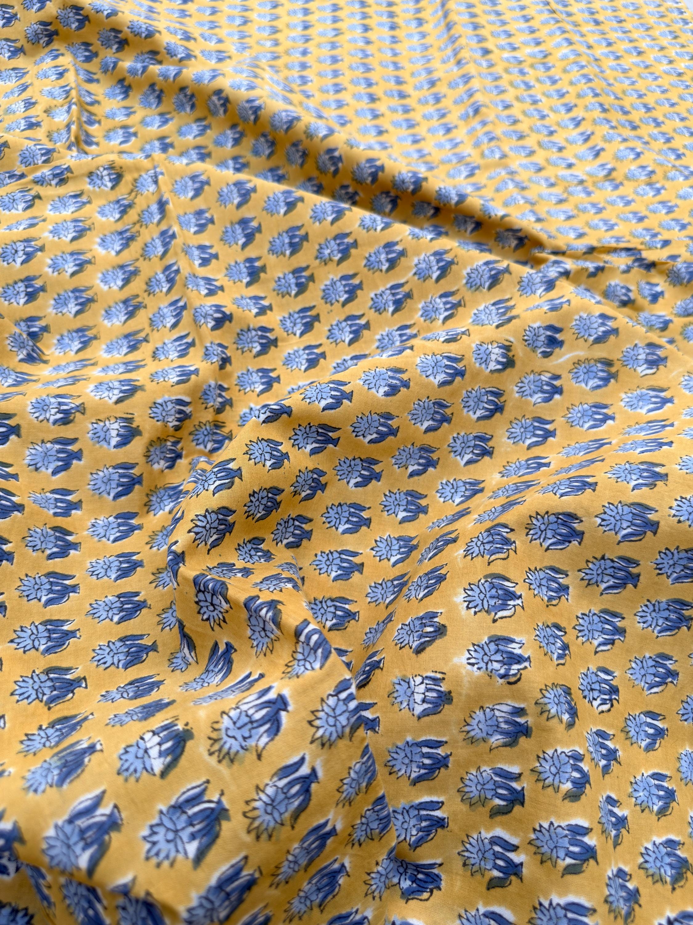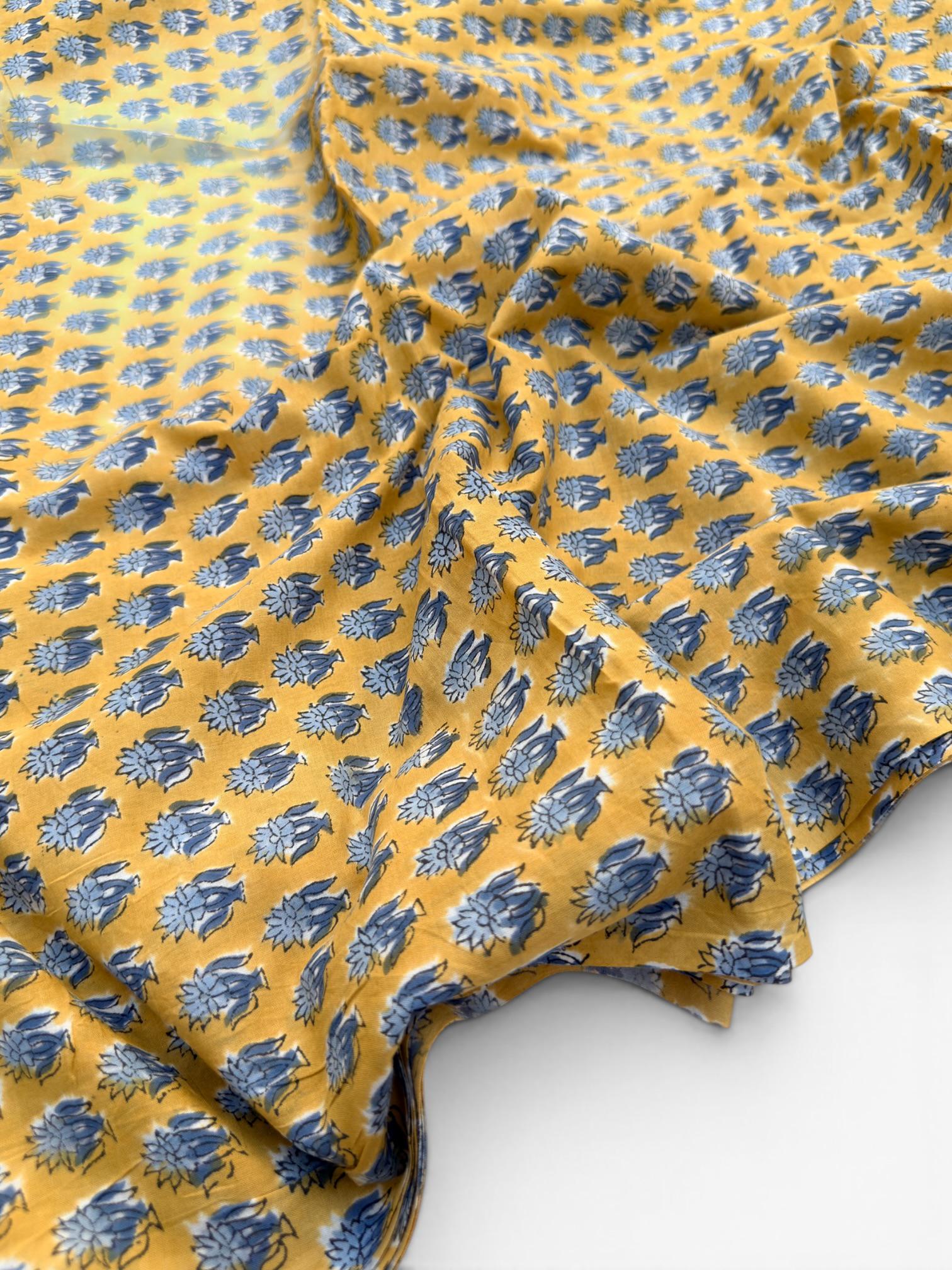 Mustard Yellow & Indigo Blue Floral Block Print Cotton Fabric | Hand Block Printed Indian Cotton | Boho Floral Fabric by Yard