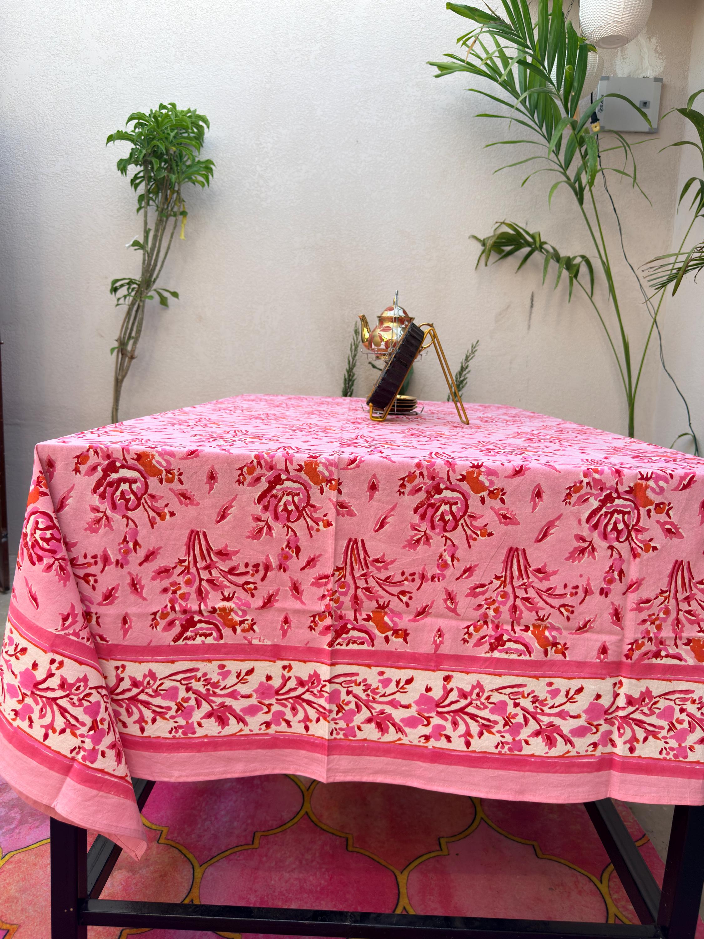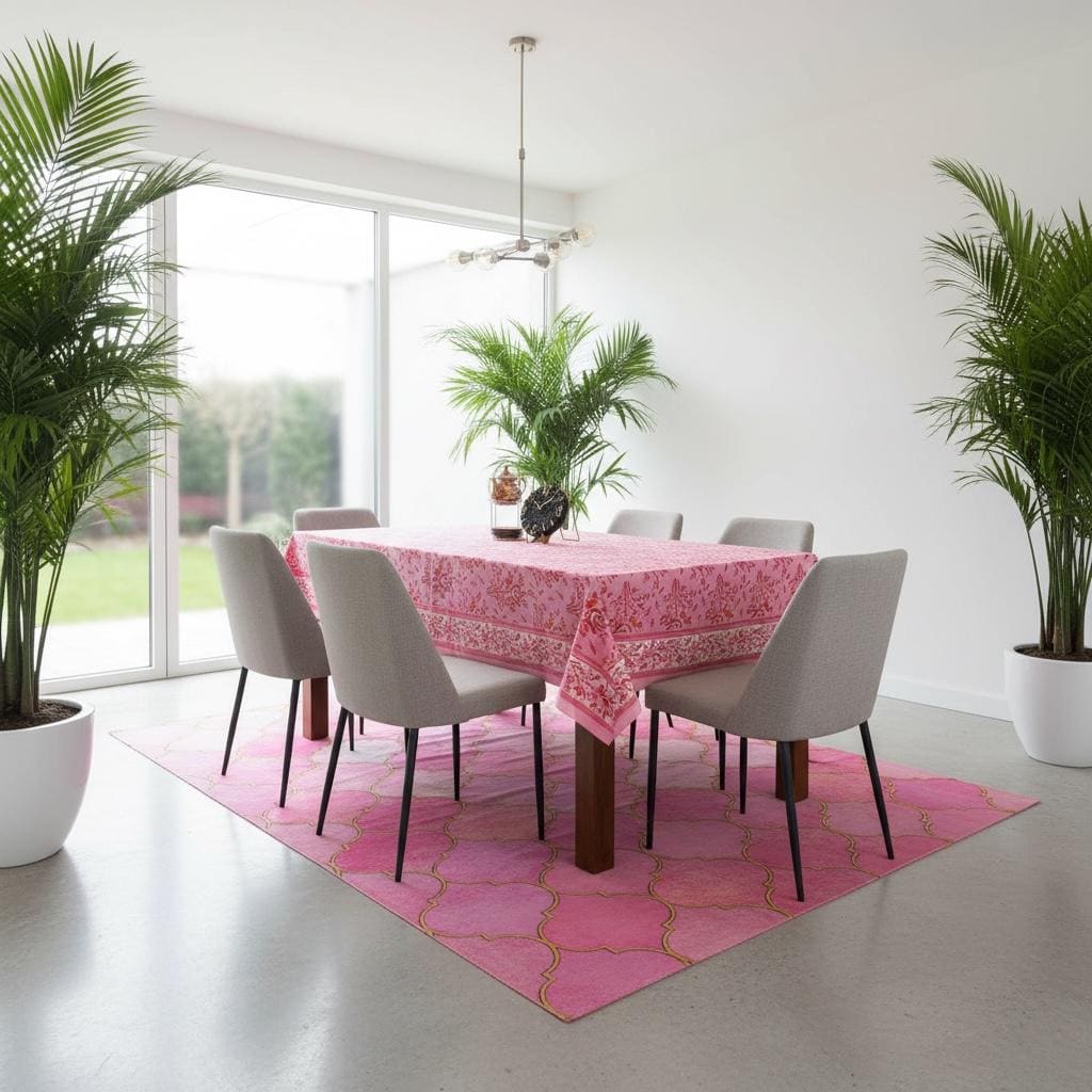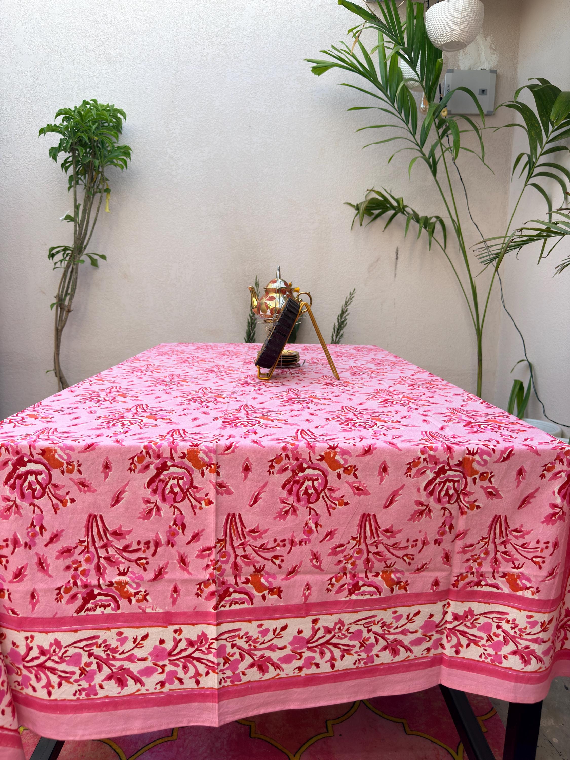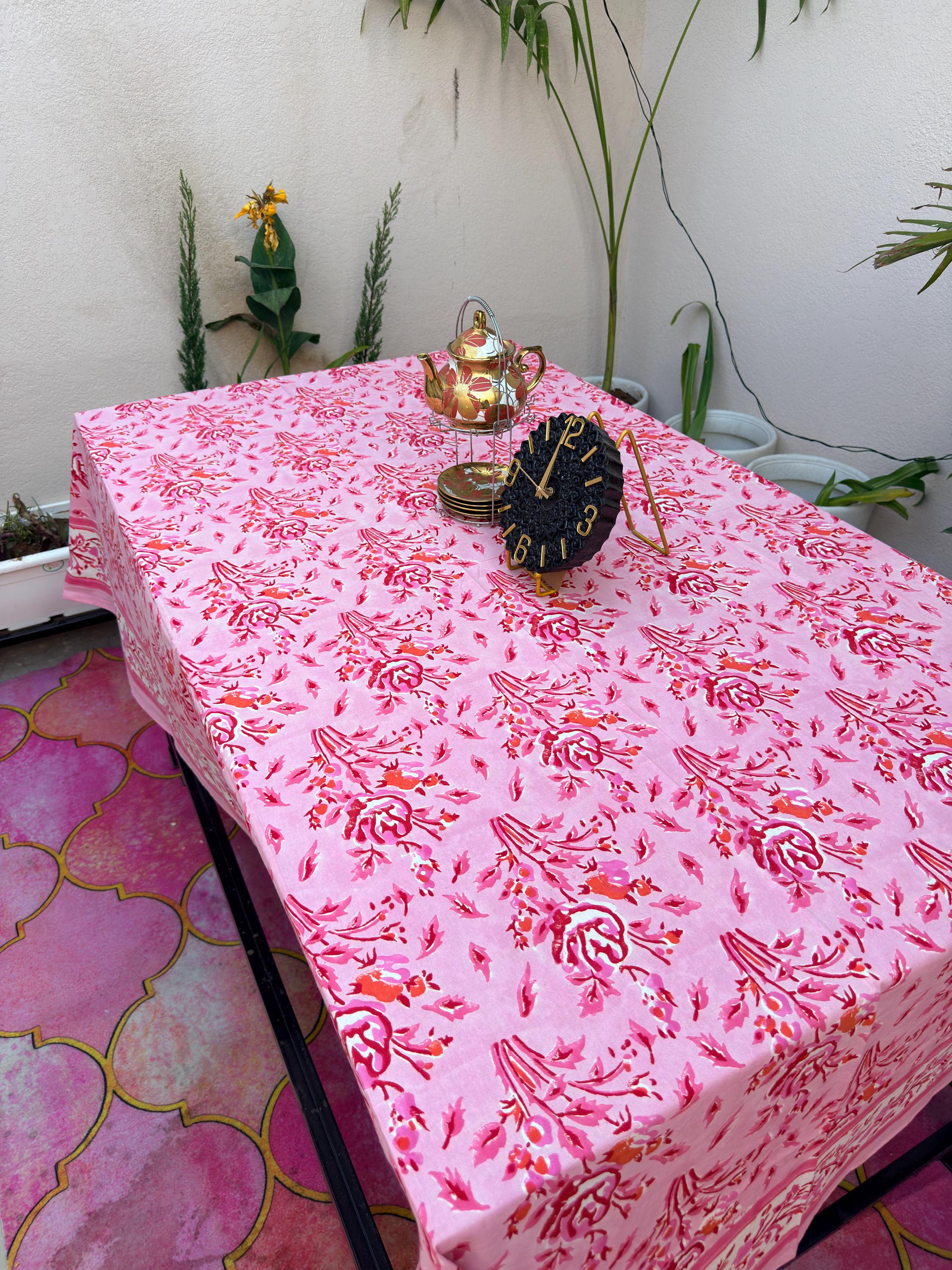 Add a touch of timeless charm and artisanal beauty to your dining space with this handcrafted block print cotton tablecloth. Featuring an elegant floral motif in radiant shades of pink, this table cover transforms any table into a warm, inviting focal point—perfect for everyday dining or special gatherings.