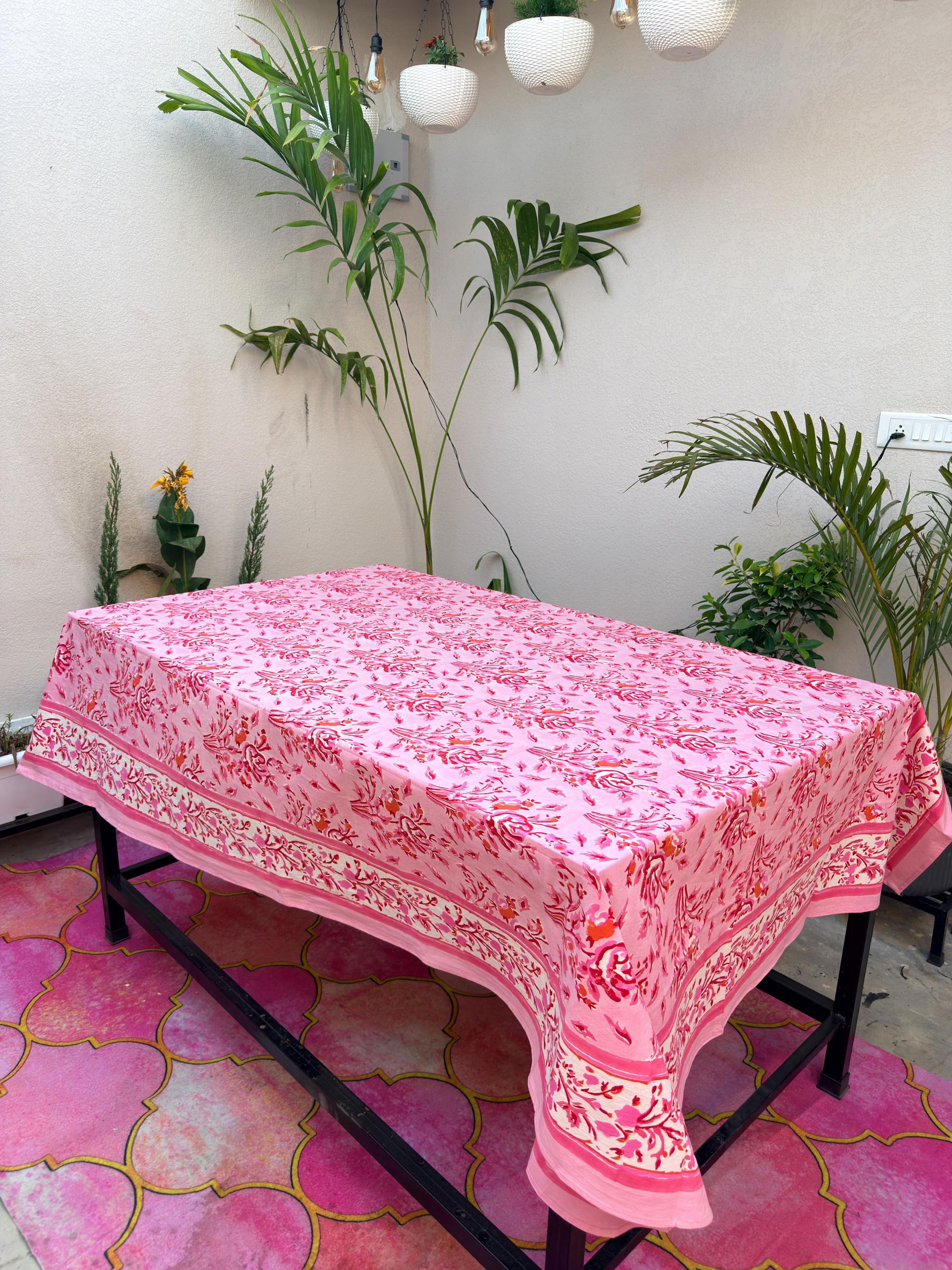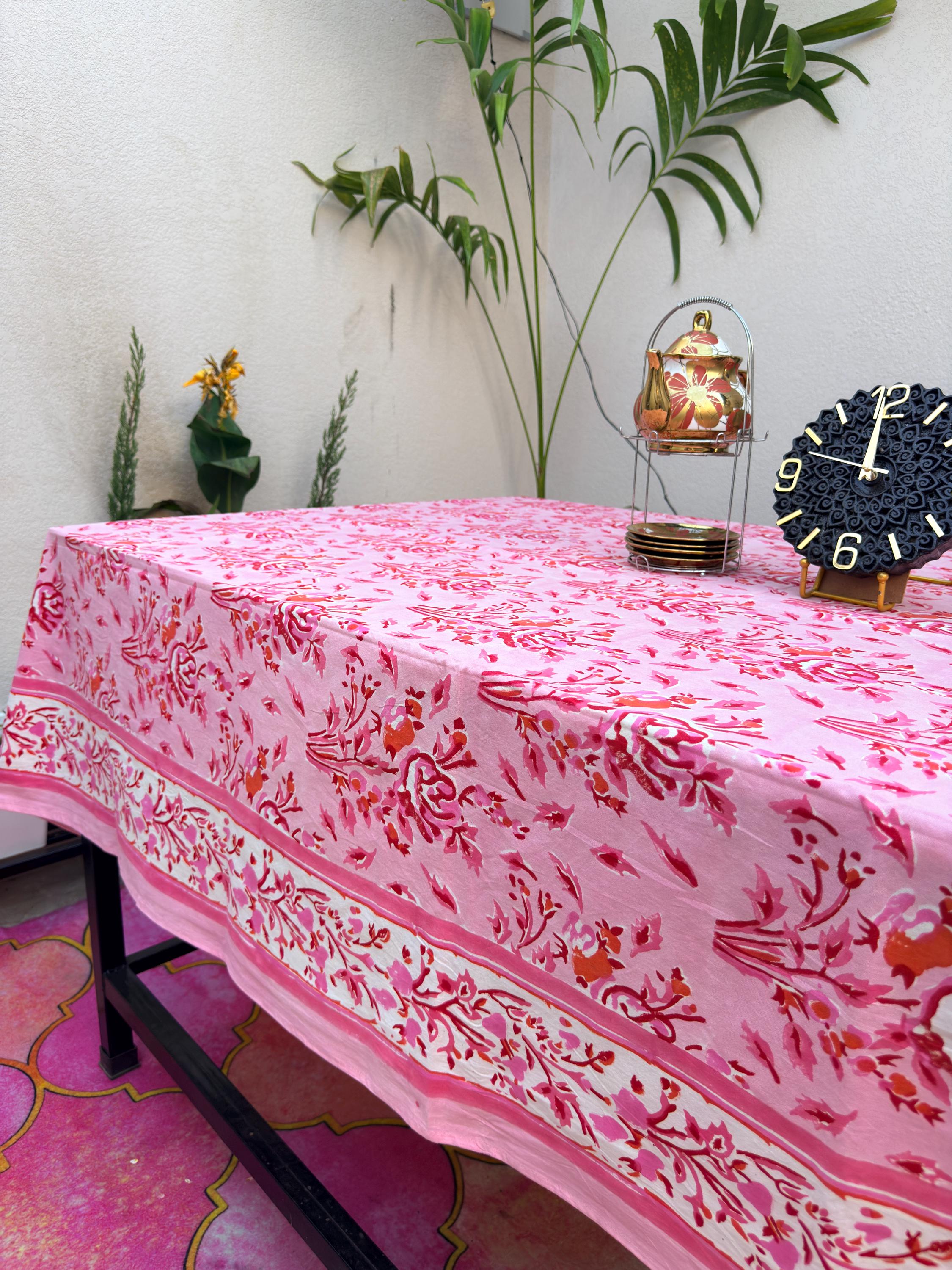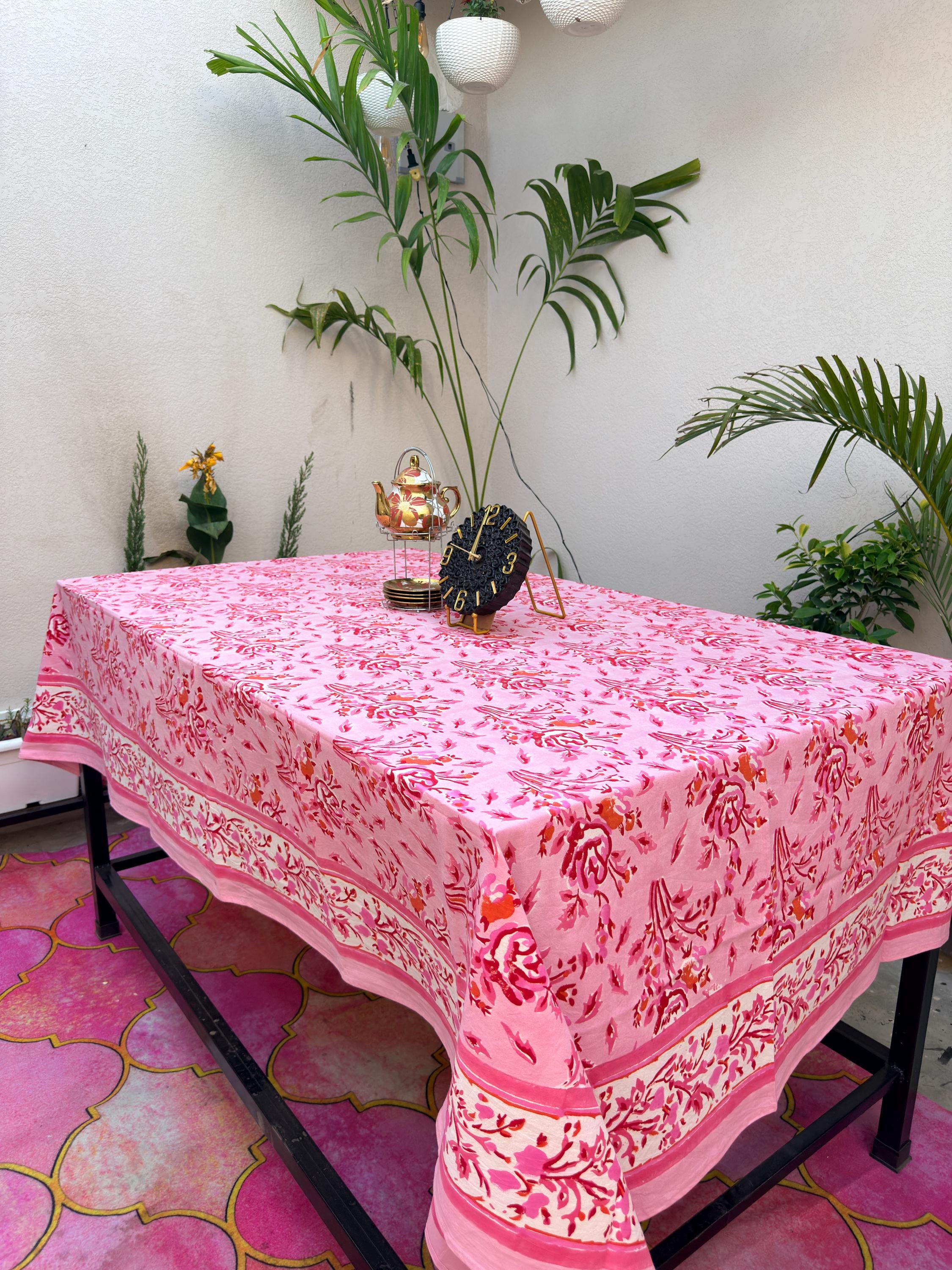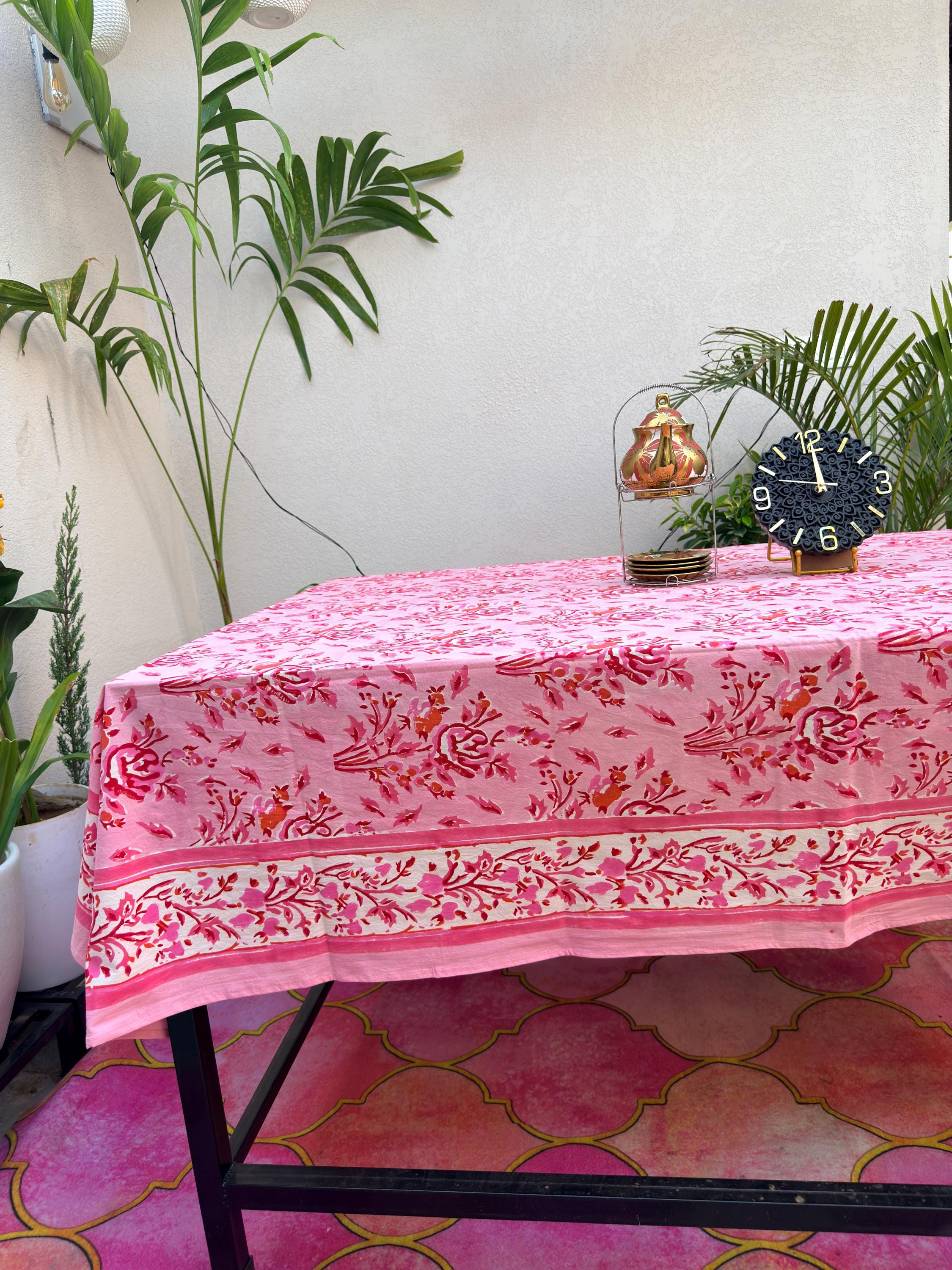 Add a touch of timeless charm and artisanal beauty to your dining space with this handcrafted block print cotton tablecloth. Featuring an elegant floral motif in radiant shades of pink, this table cover transforms any table into a warm, inviting focal point—perfect for everyday dining or special gatherings.