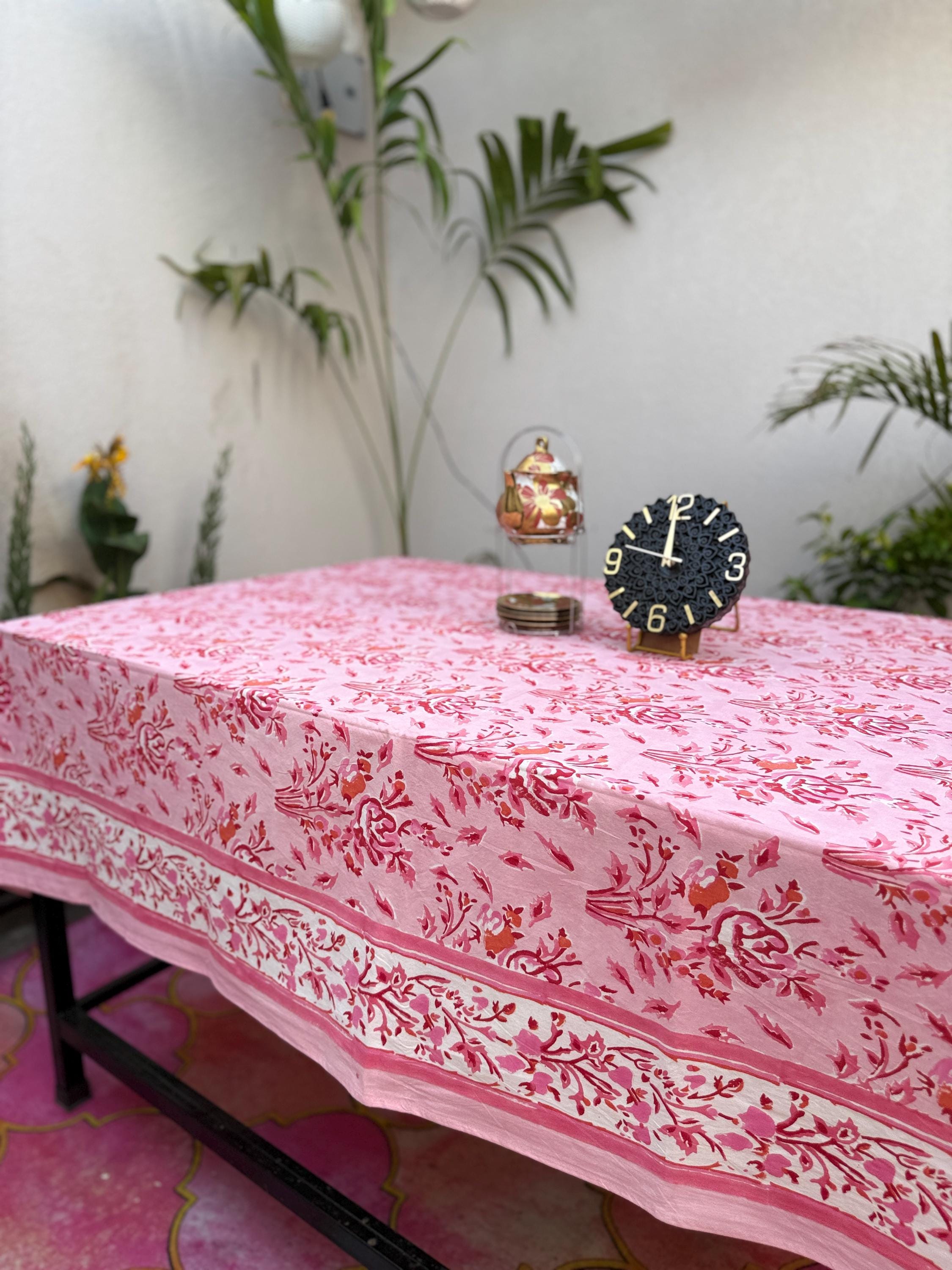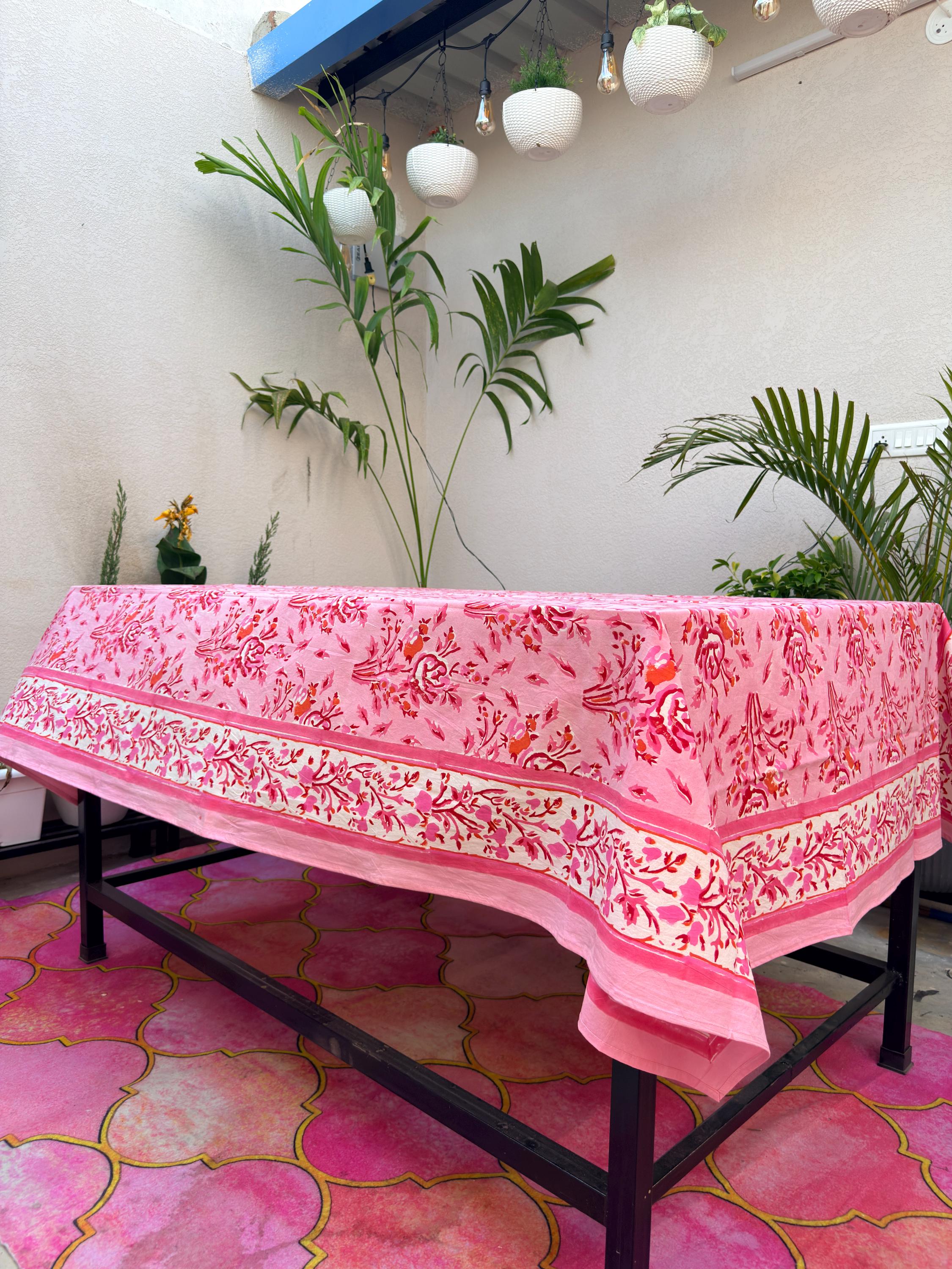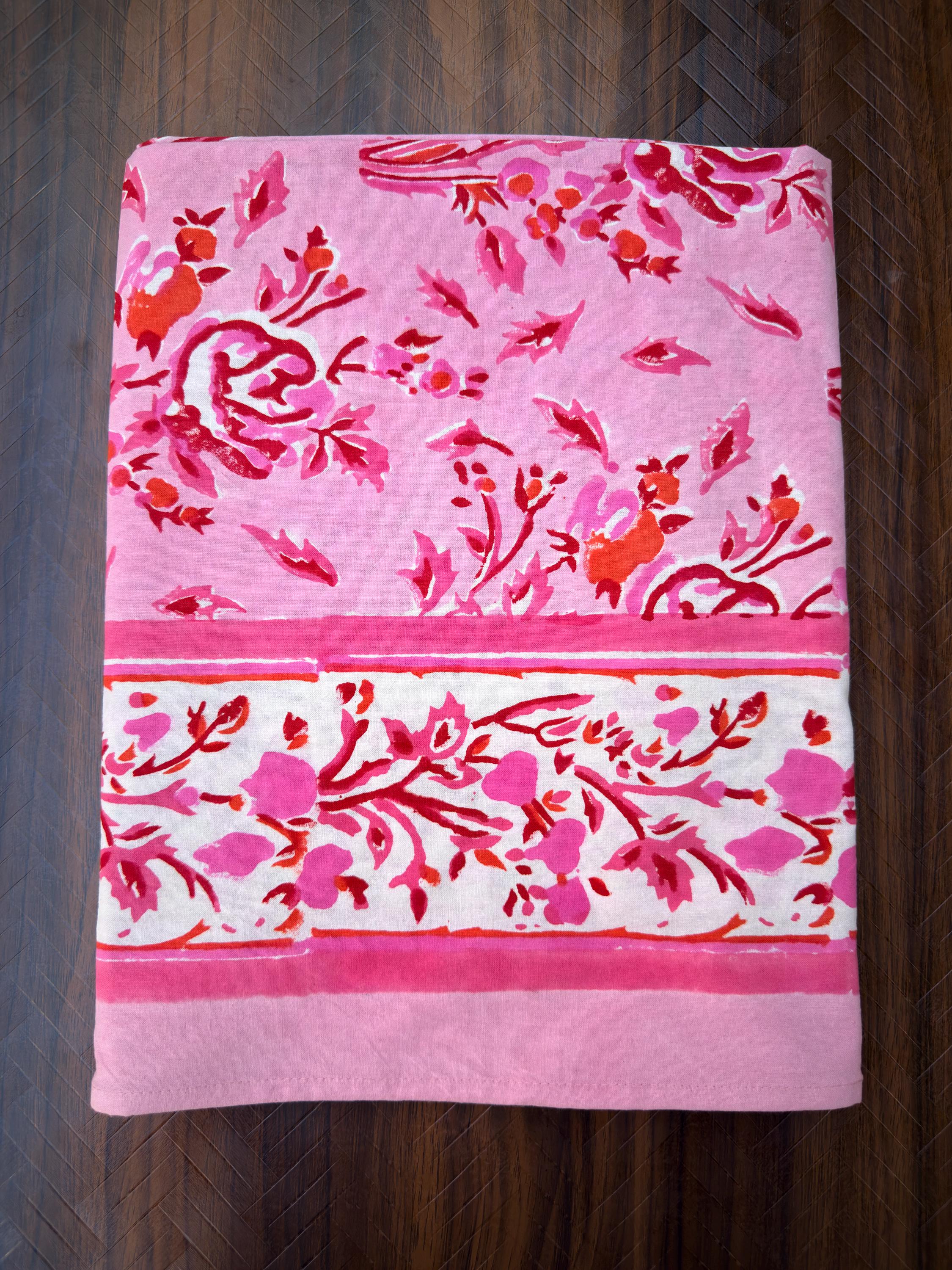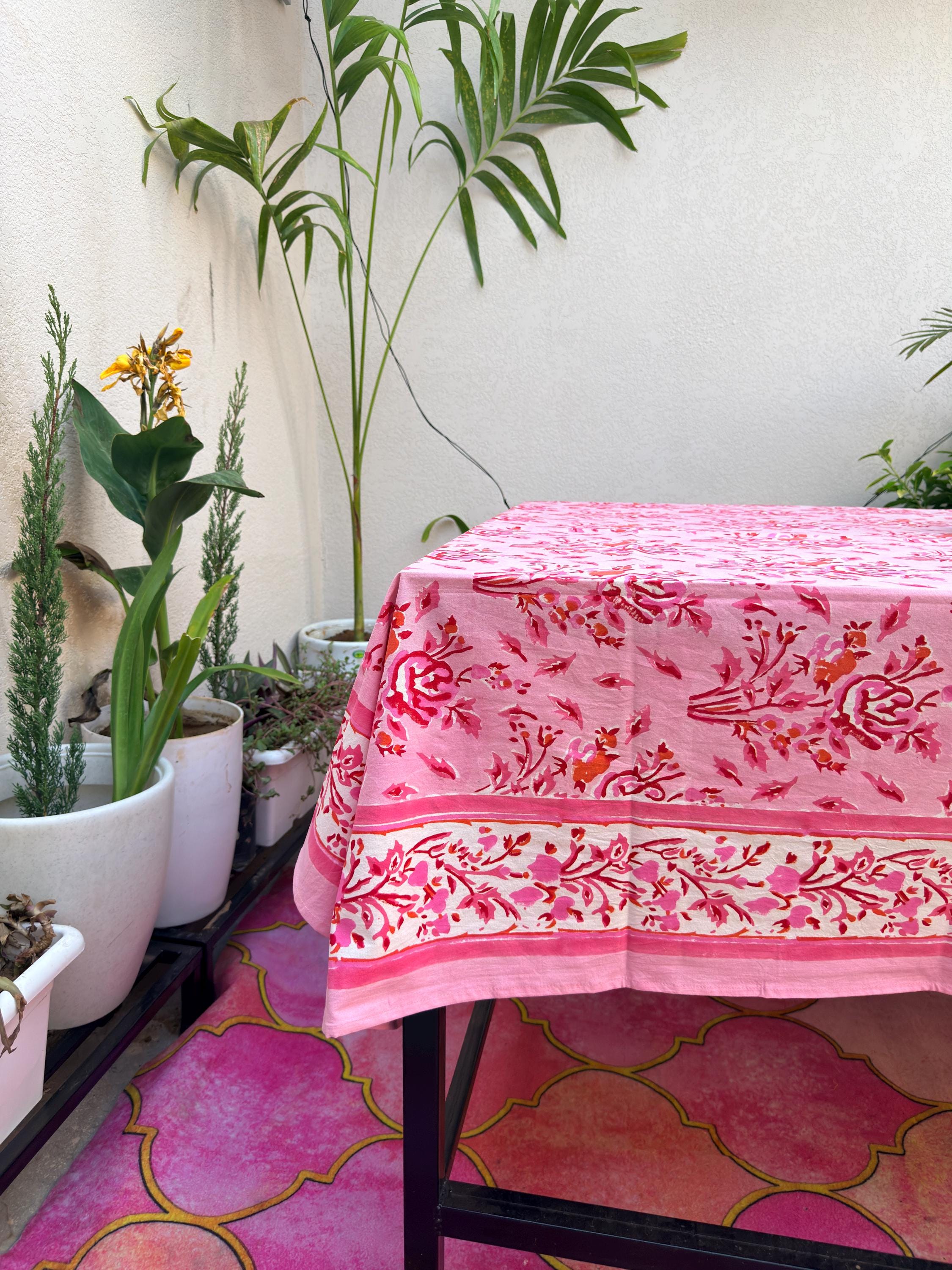 Add a touch of timeless charm and artisanal beauty to your dining space with this handcrafted block print cotton tablecloth. Featuring an elegant floral motif in radiant shades of pink, this table cover transforms any table into a warm, inviting focal point—perfect for everyday dining or special gatherings.