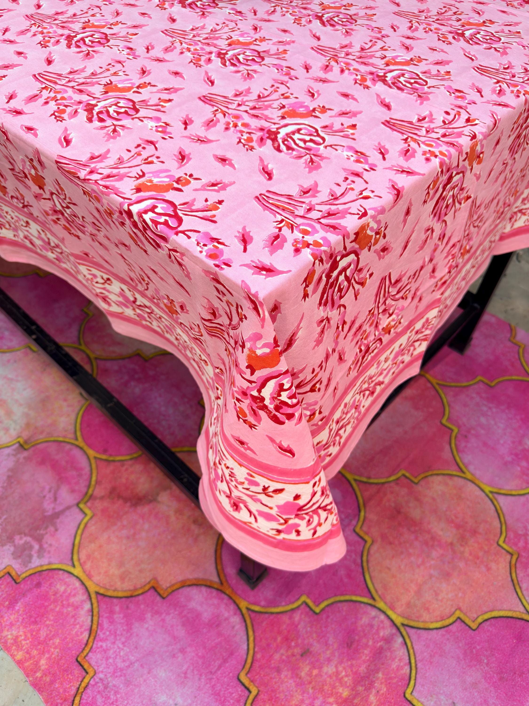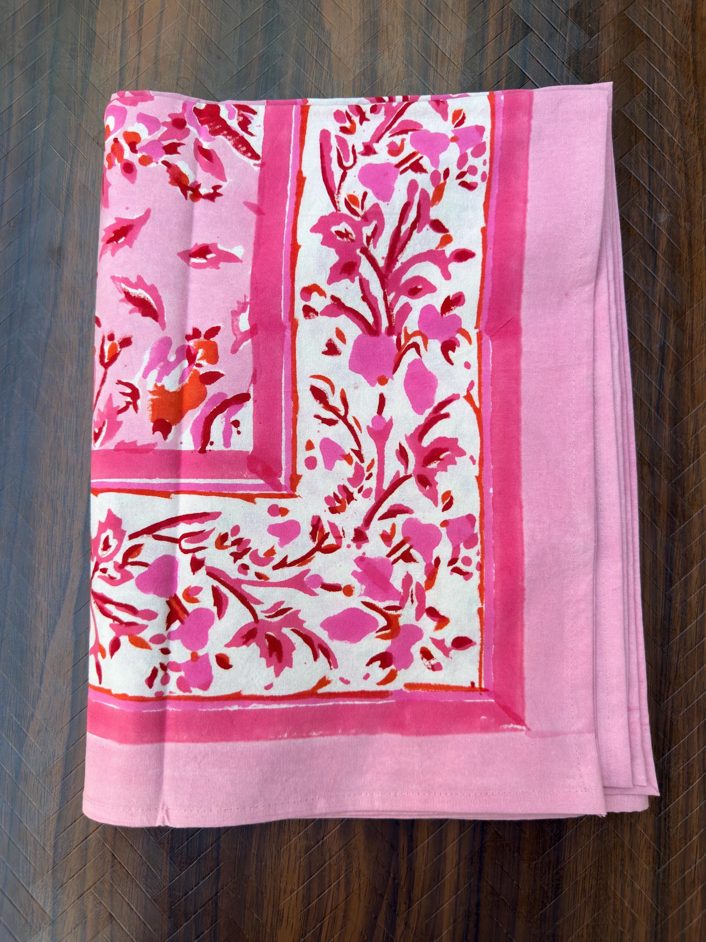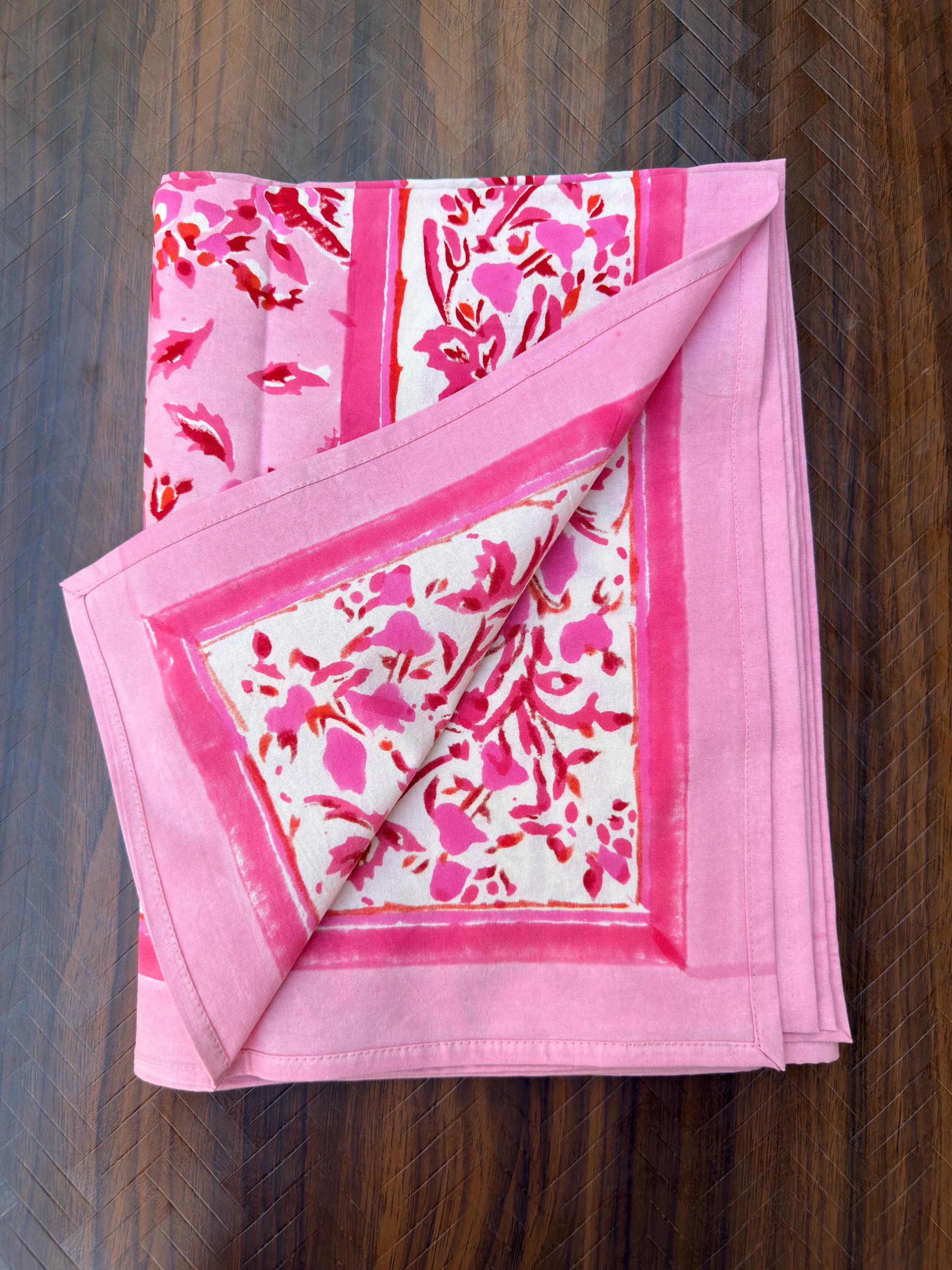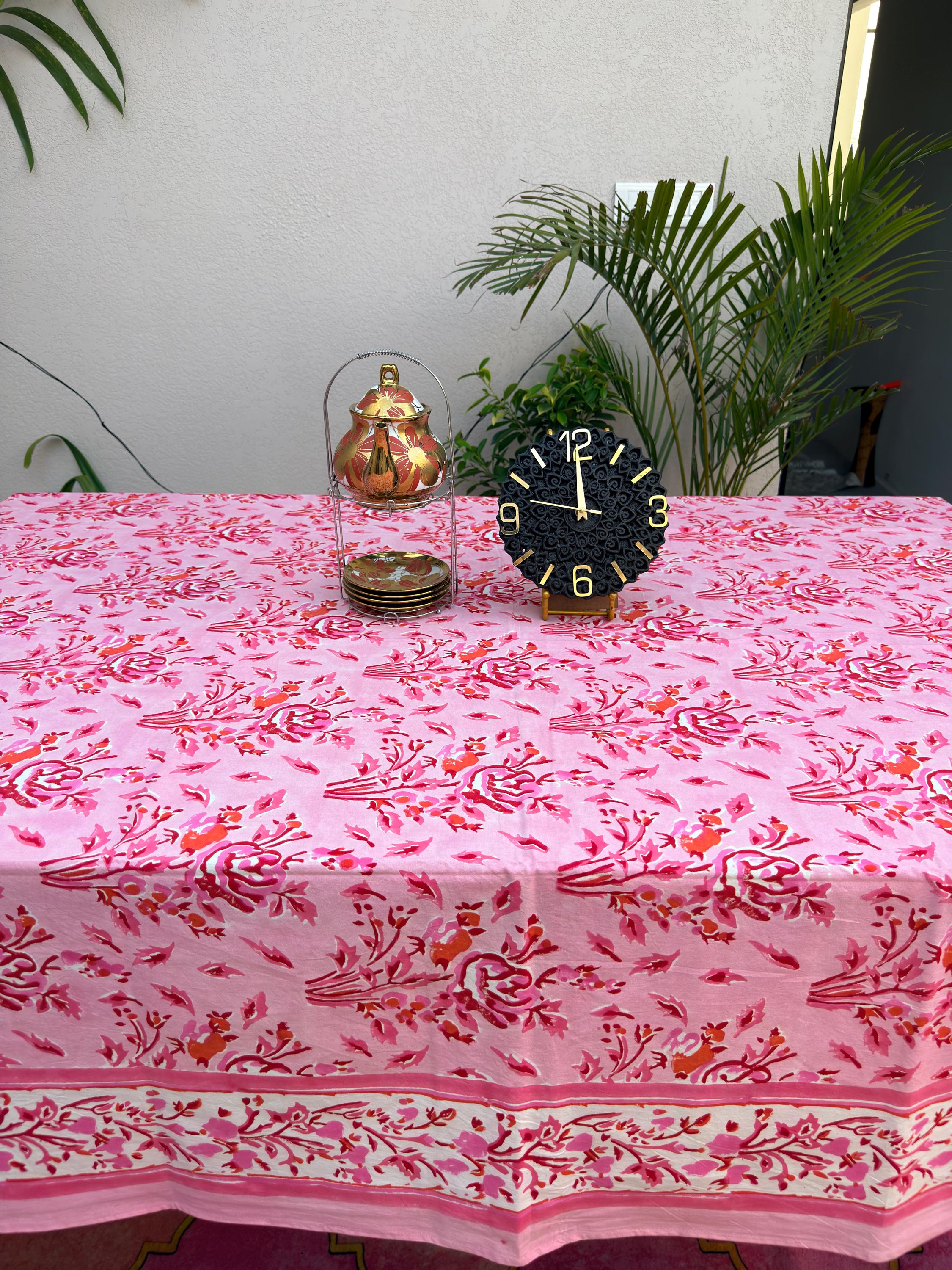 Add a touch of timeless charm and artisanal beauty to your dining space with this handcrafted block print cotton tablecloth. Featuring an elegant floral motif in radiant shades of pink, this table cover transforms any table into a warm, inviting focal point—perfect for everyday dining or special gatherings.