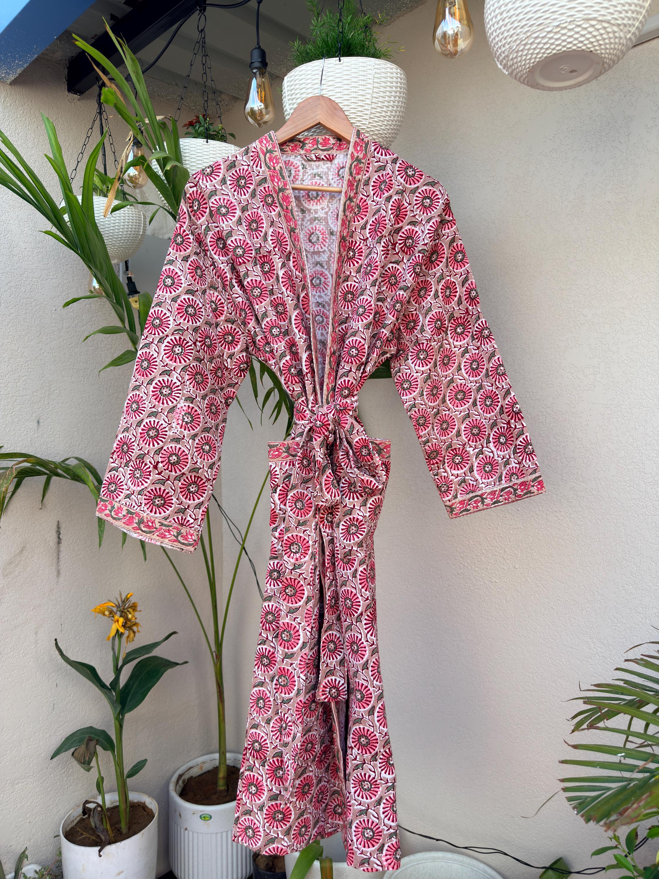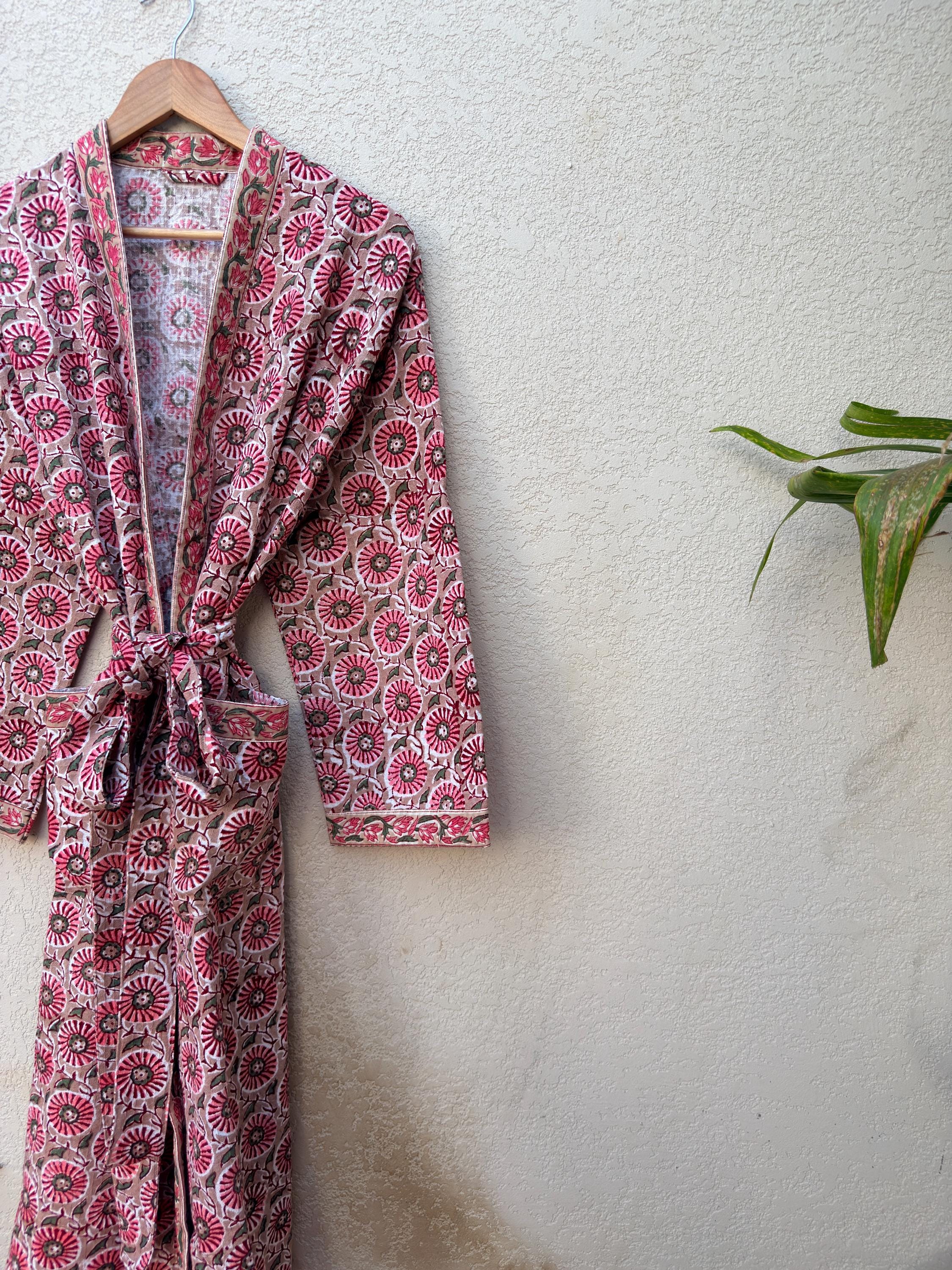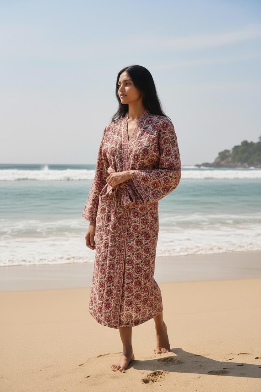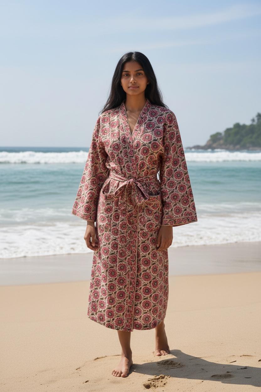 Featuring a delicate hand block printed floral pattern, this robe is created using traditional techniques from Rajasthan, making each piece subtly unique. The soft waffle cotton texture adds breathability and light absorbency—perfect for slow mornings, relaxed evenings, or vacation lounging.