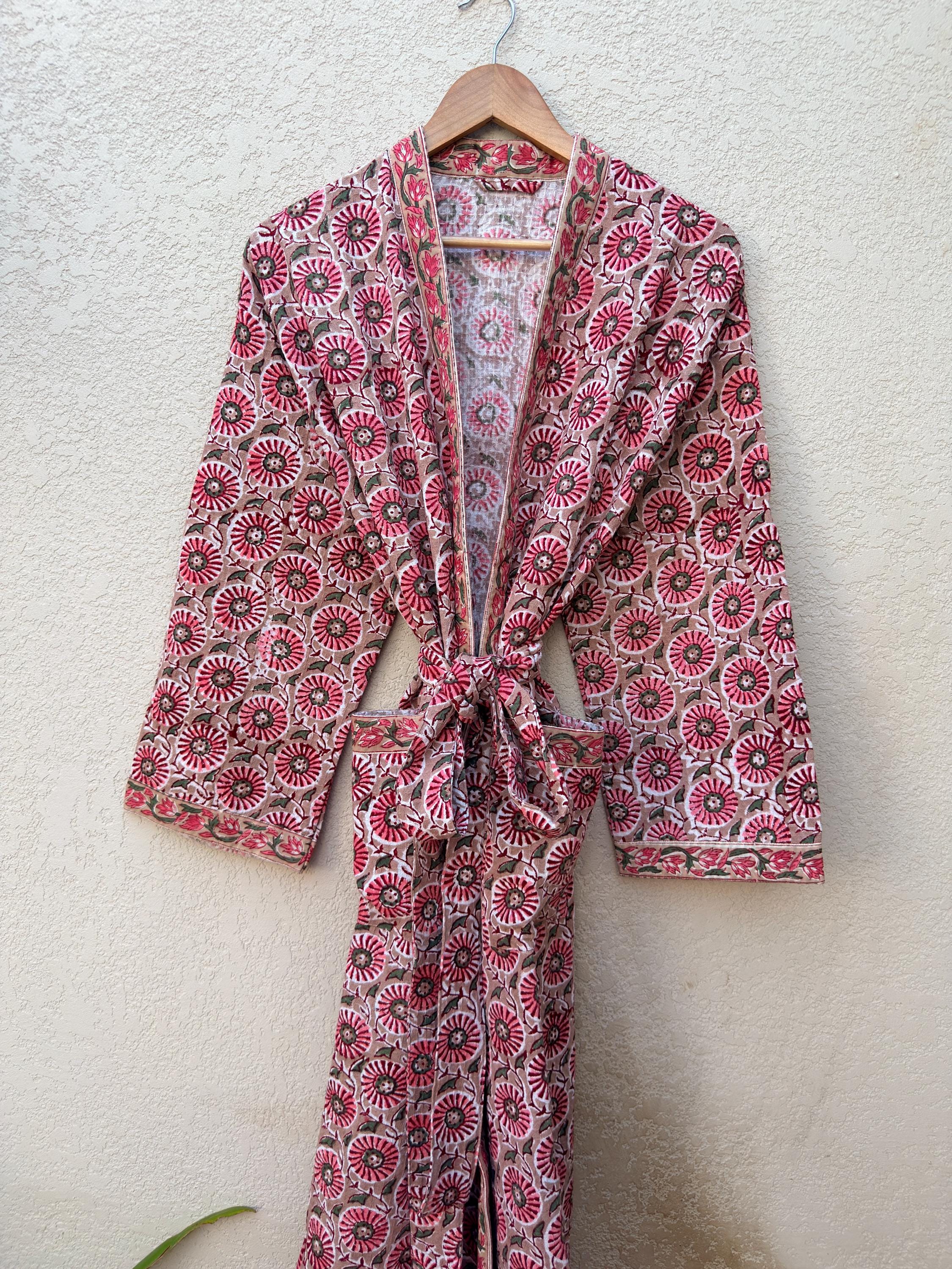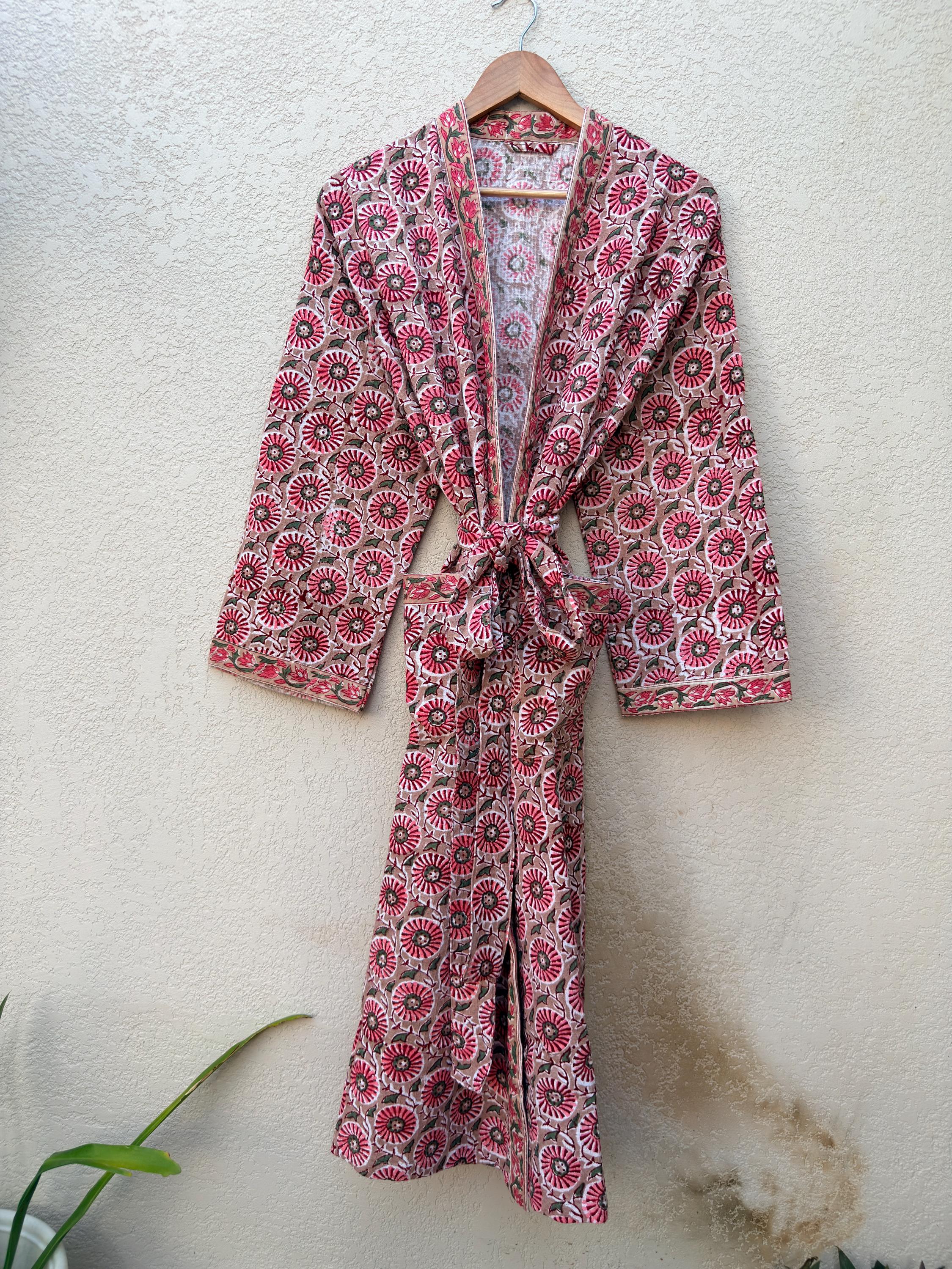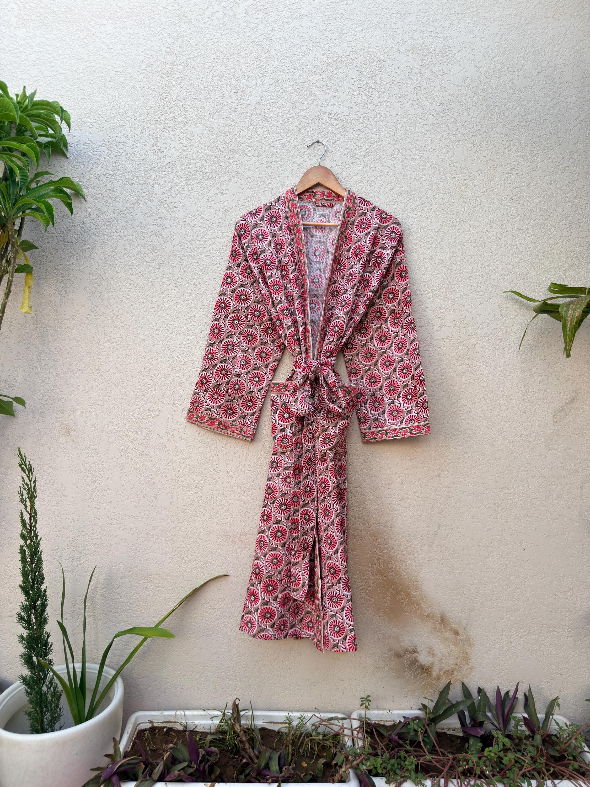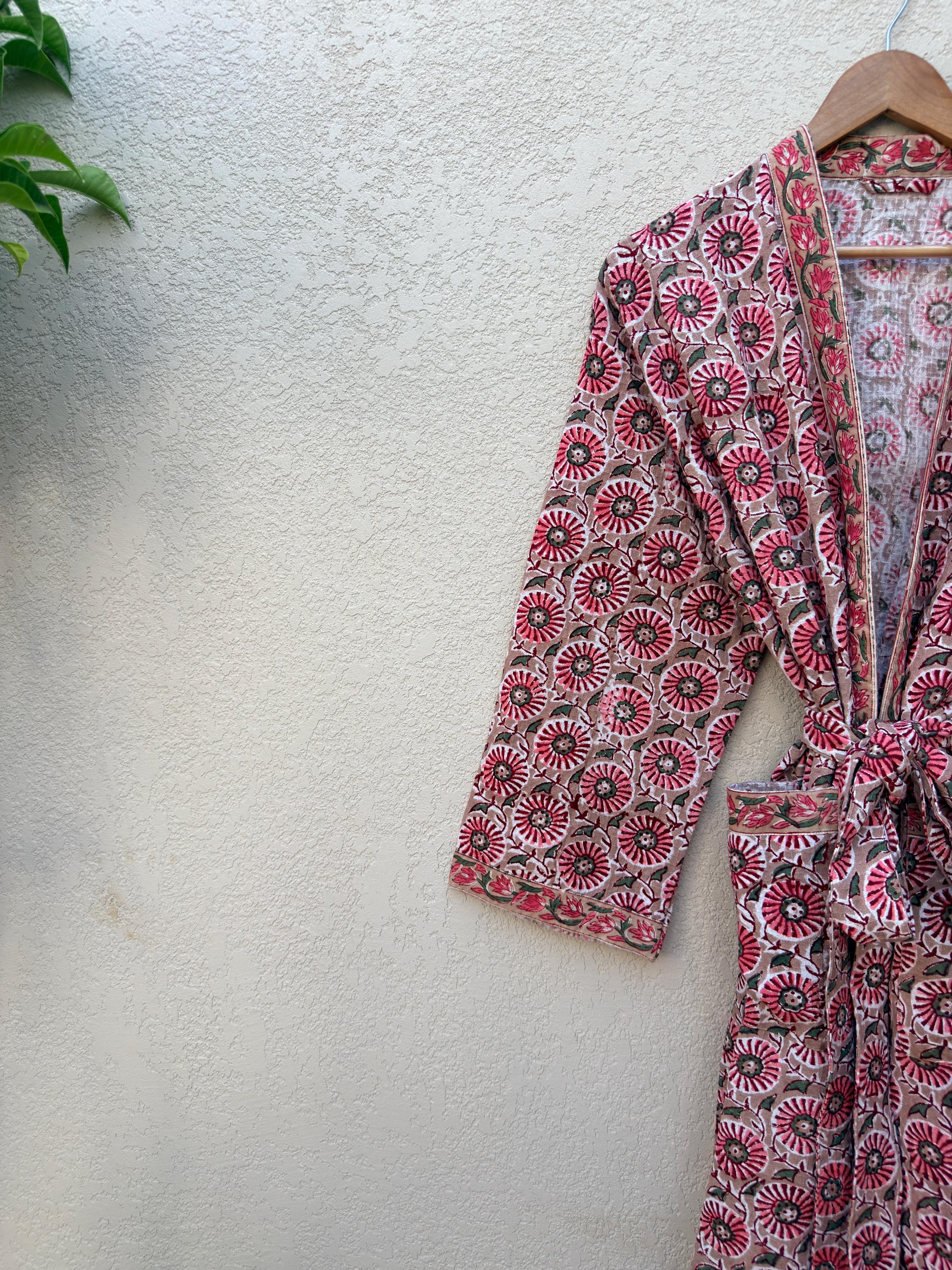 Featuring a delicate hand block printed floral pattern, this robe is created using traditional techniques from Rajasthan, making each piece subtly unique. The soft waffle cotton texture adds breathability and light absorbency—perfect for slow mornings, relaxed evenings, or vacation lounging.
