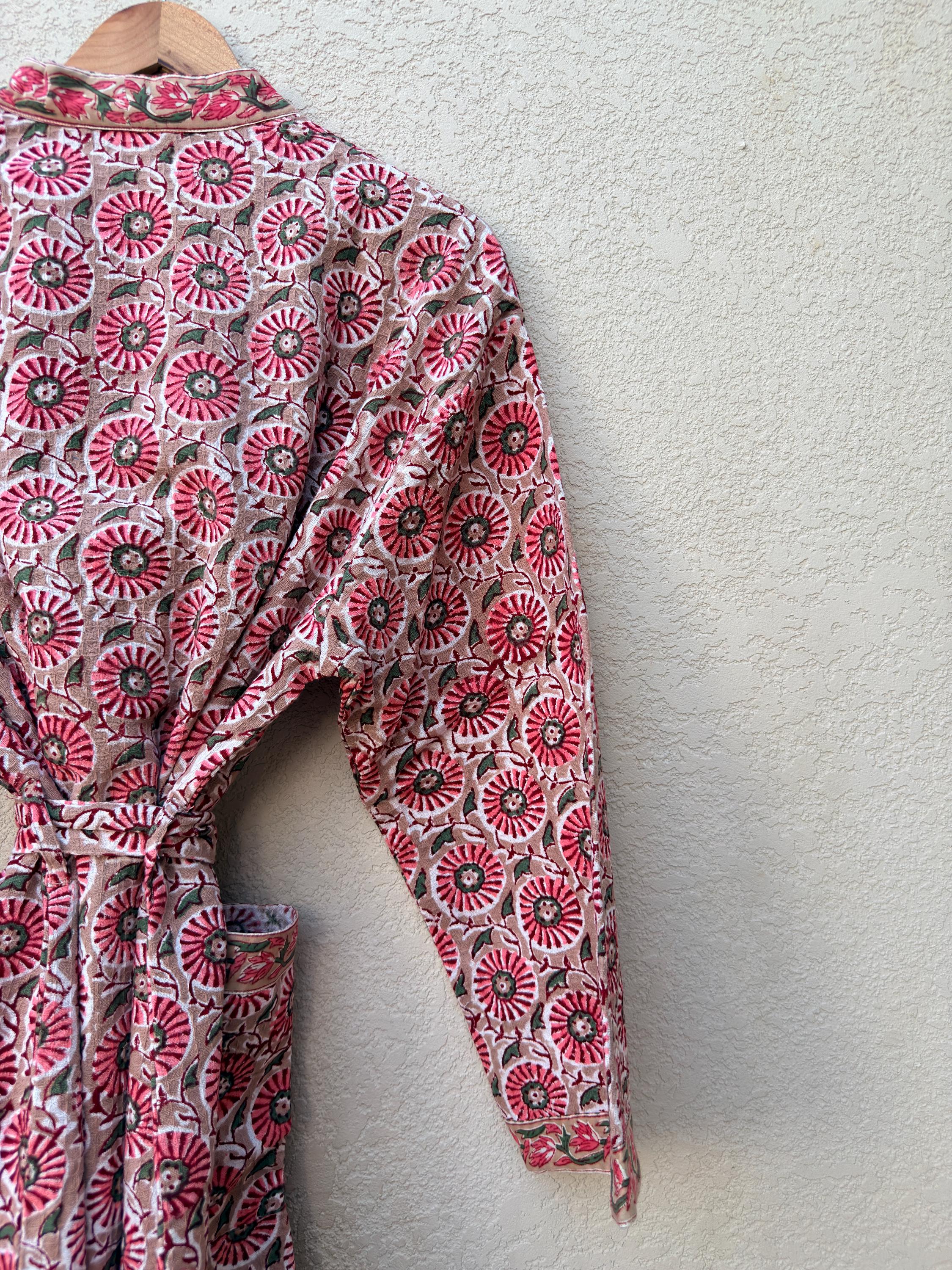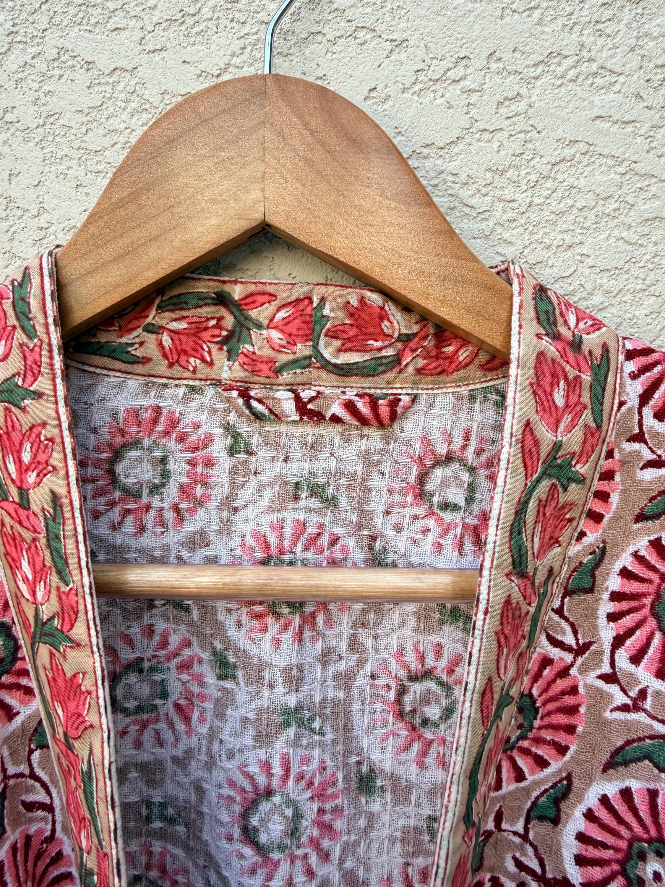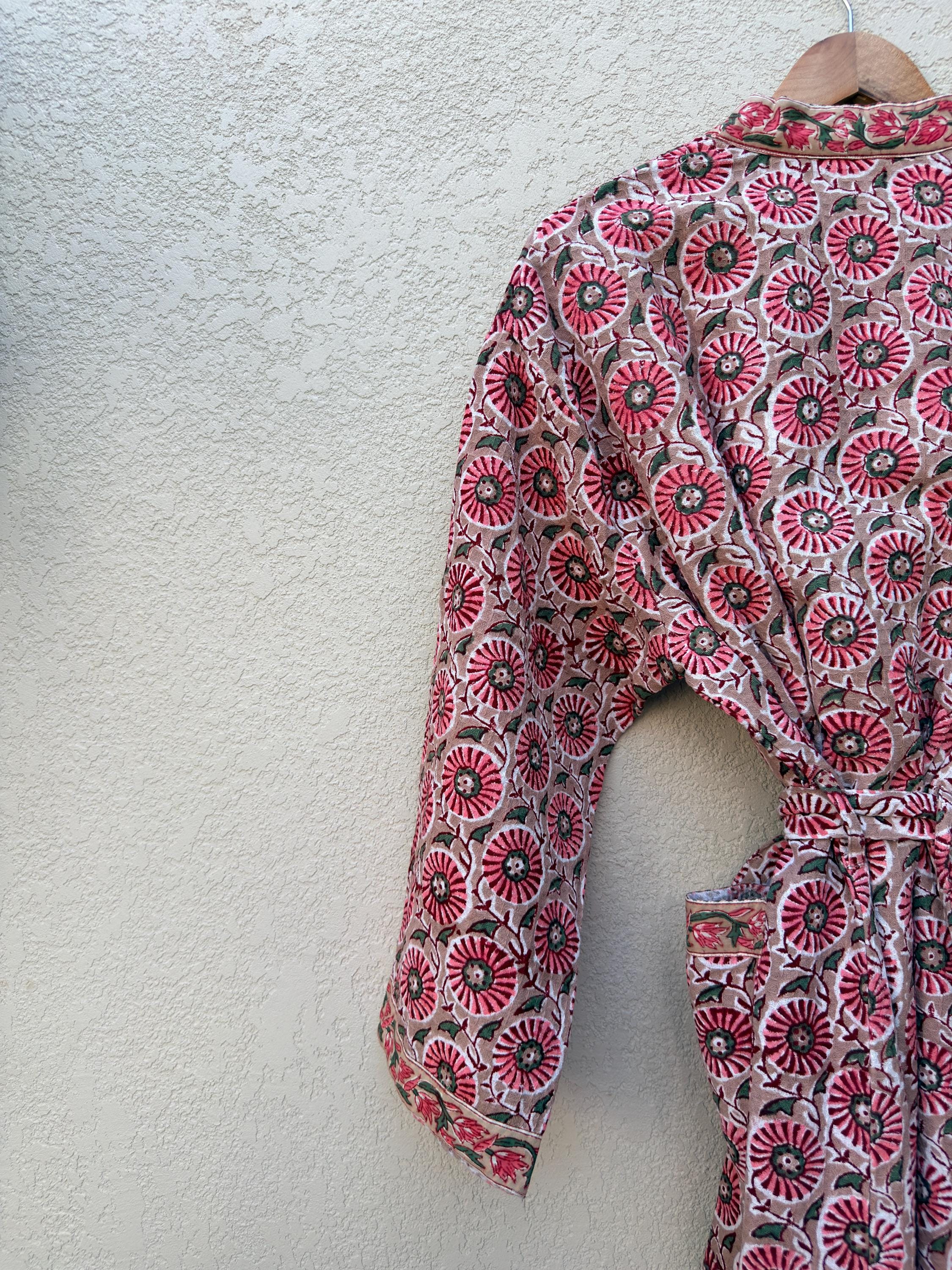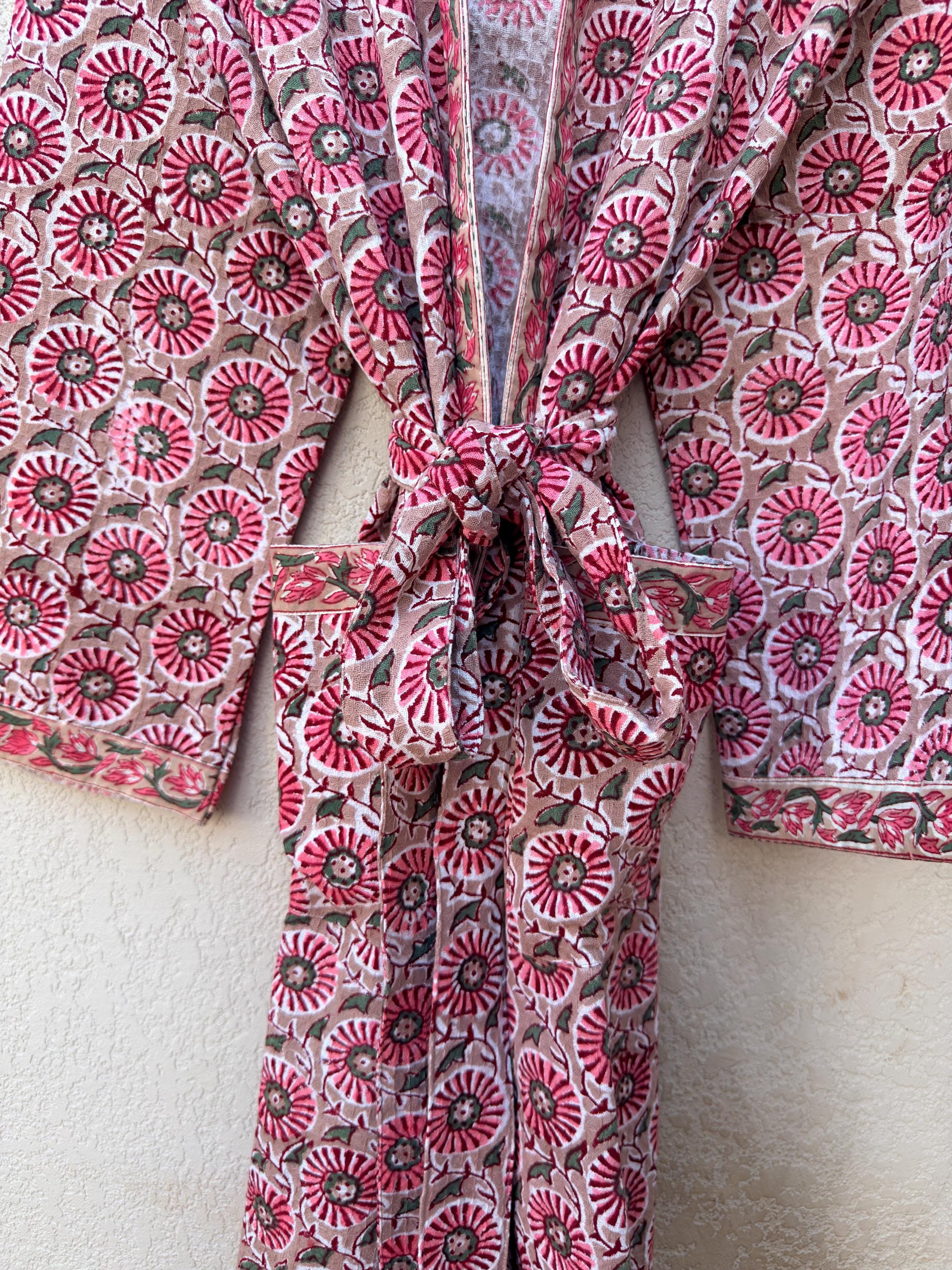 Featuring a delicate hand block printed floral pattern, this robe is created using traditional techniques from Rajasthan, making each piece subtly unique. The soft waffle cotton texture adds breathability and light absorbency—perfect for slow mornings, relaxed evenings, or vacation lounging.
