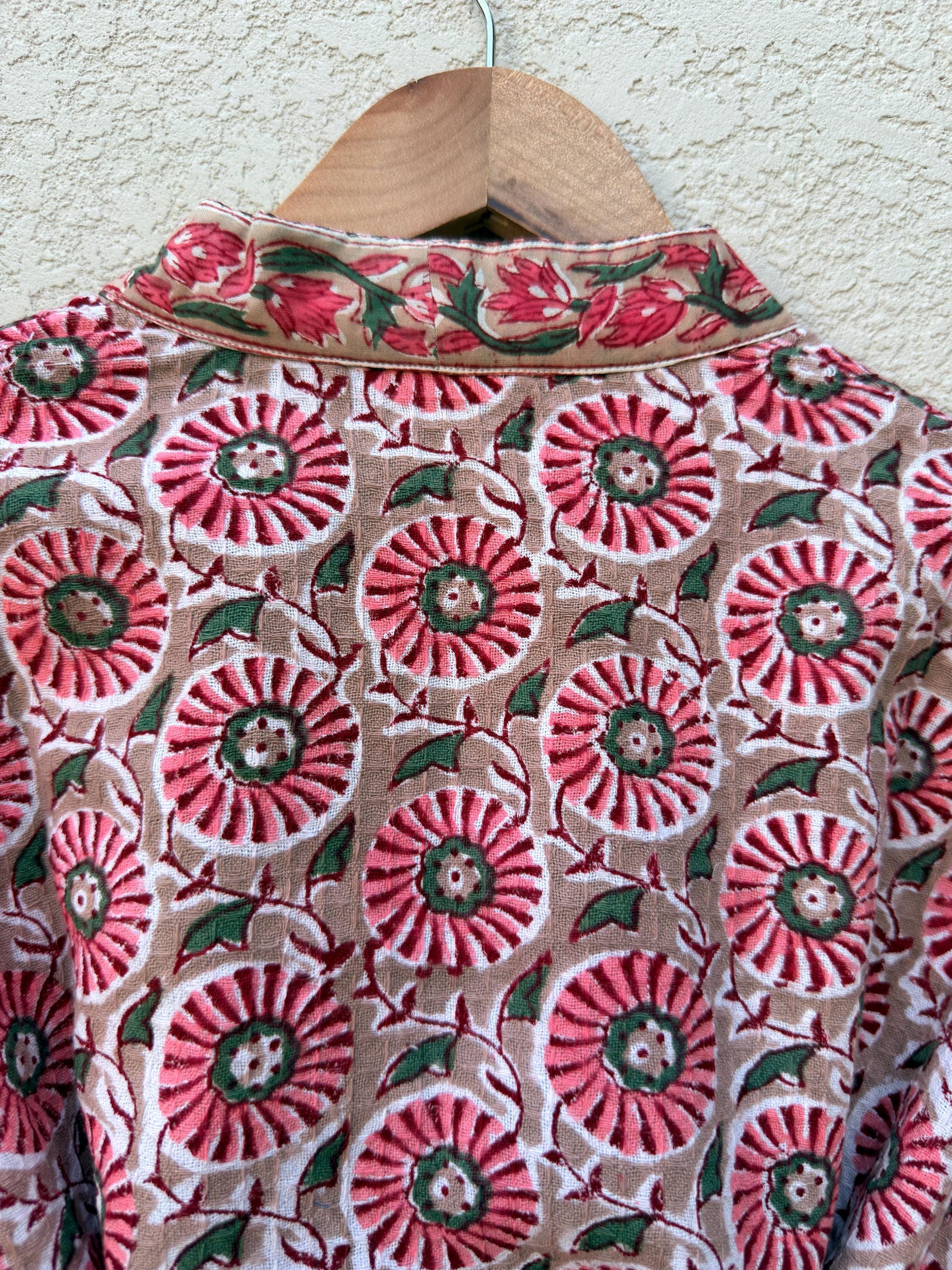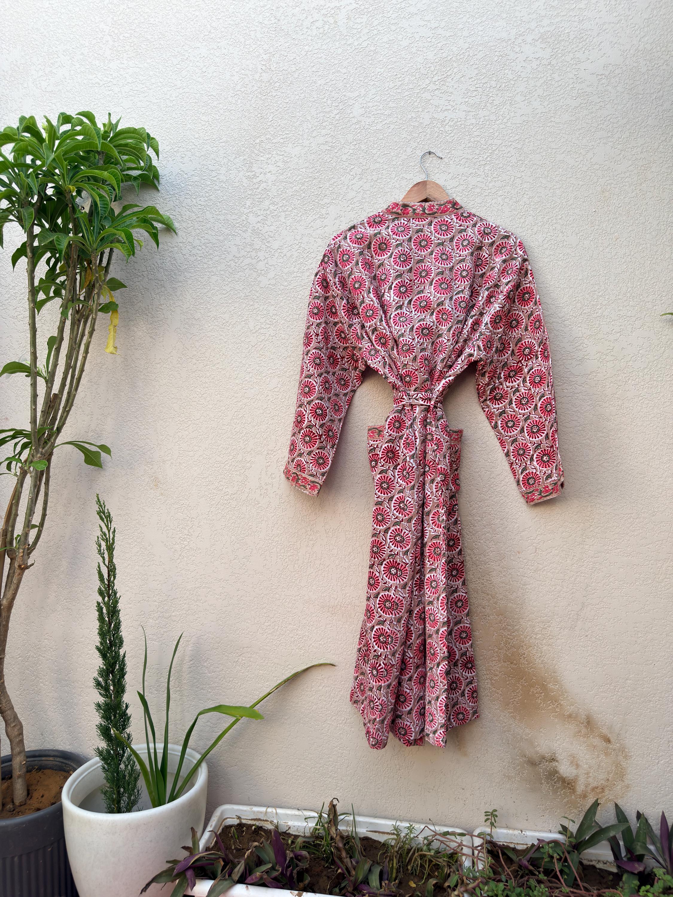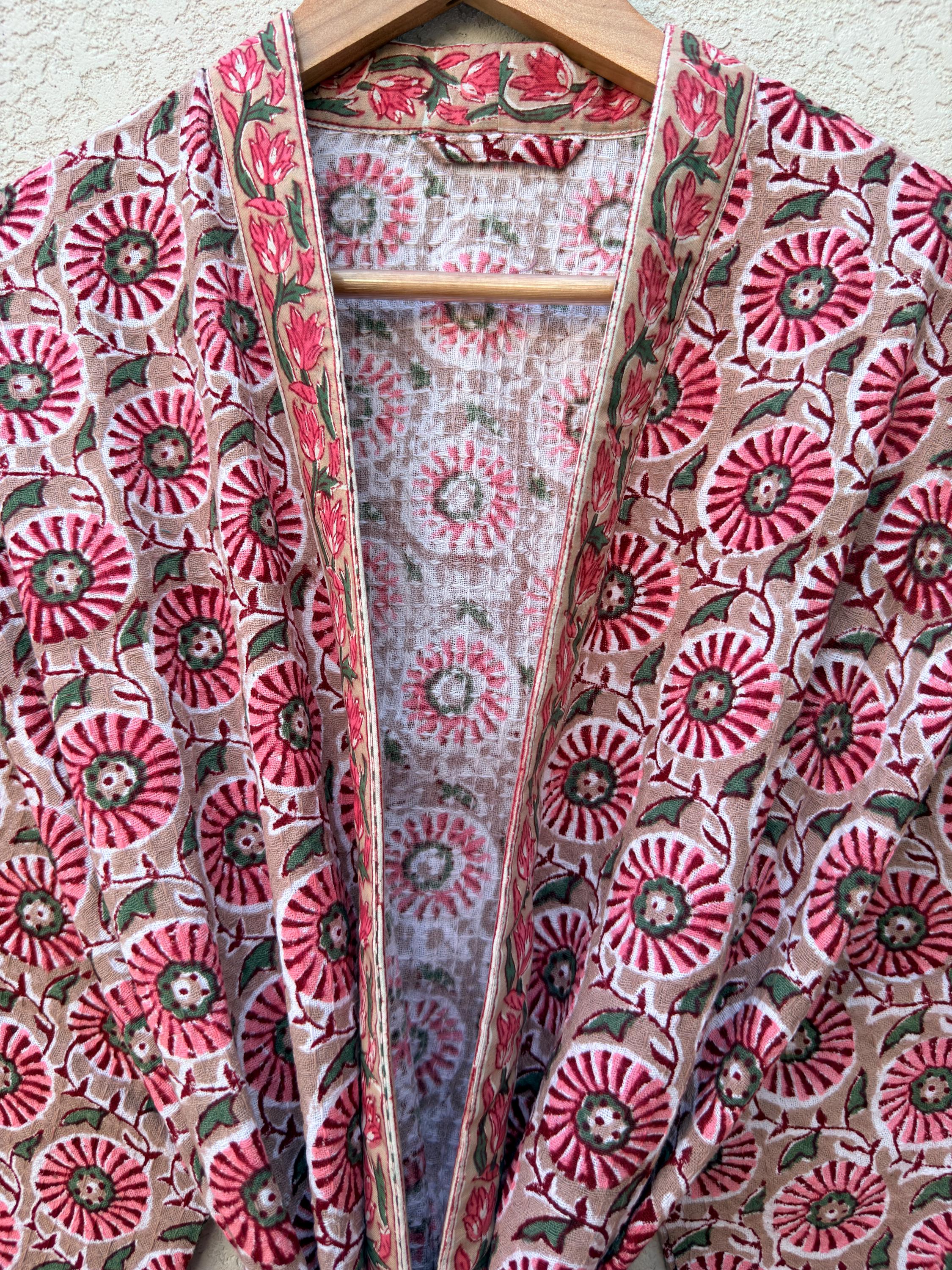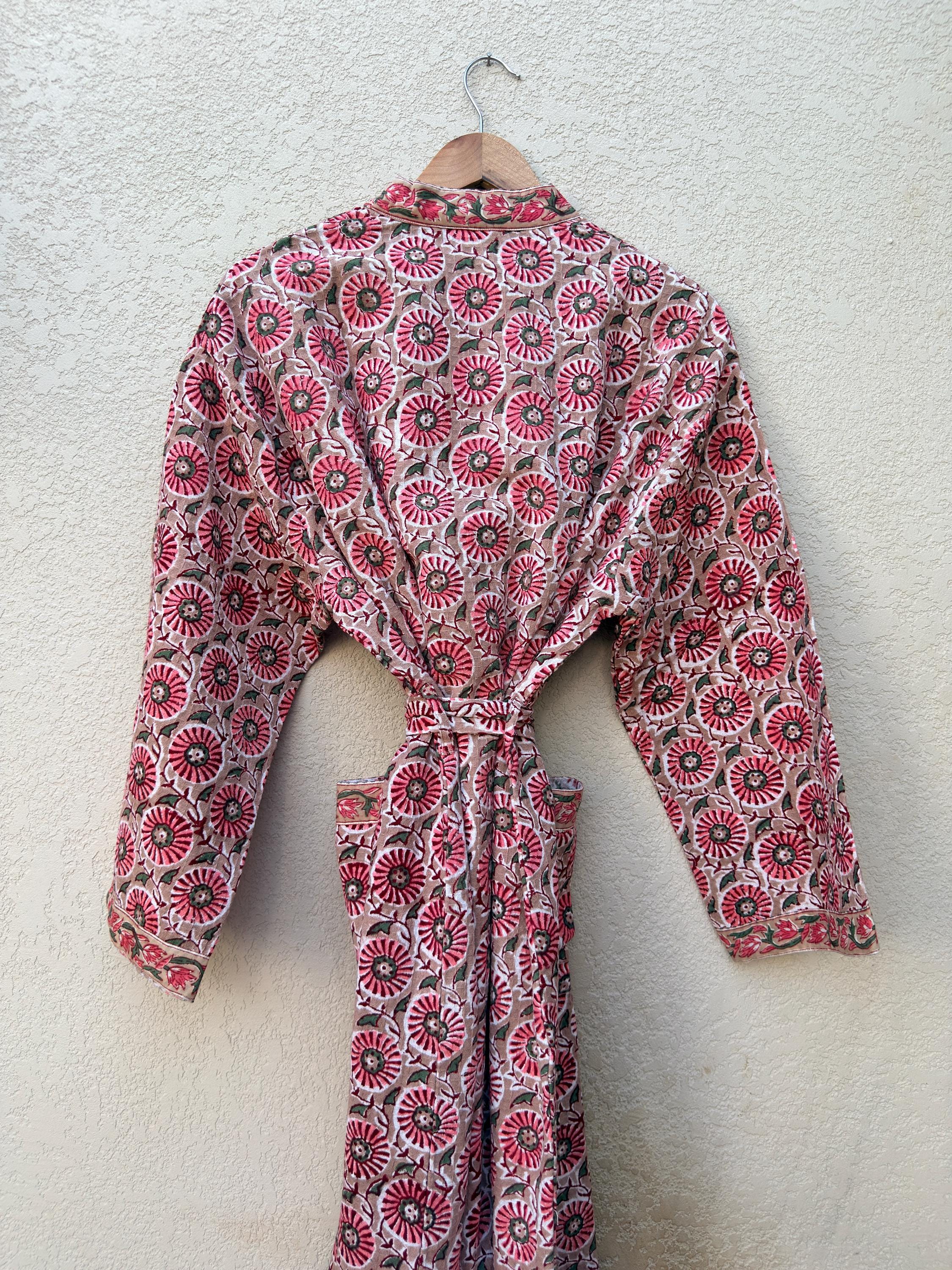 Featuring a delicate hand block printed floral pattern, this robe is created using traditional techniques from Rajasthan, making each piece subtly unique. The soft waffle cotton texture adds breathability and light absorbency—perfect for slow mornings, relaxed evenings, or vacation lounging.