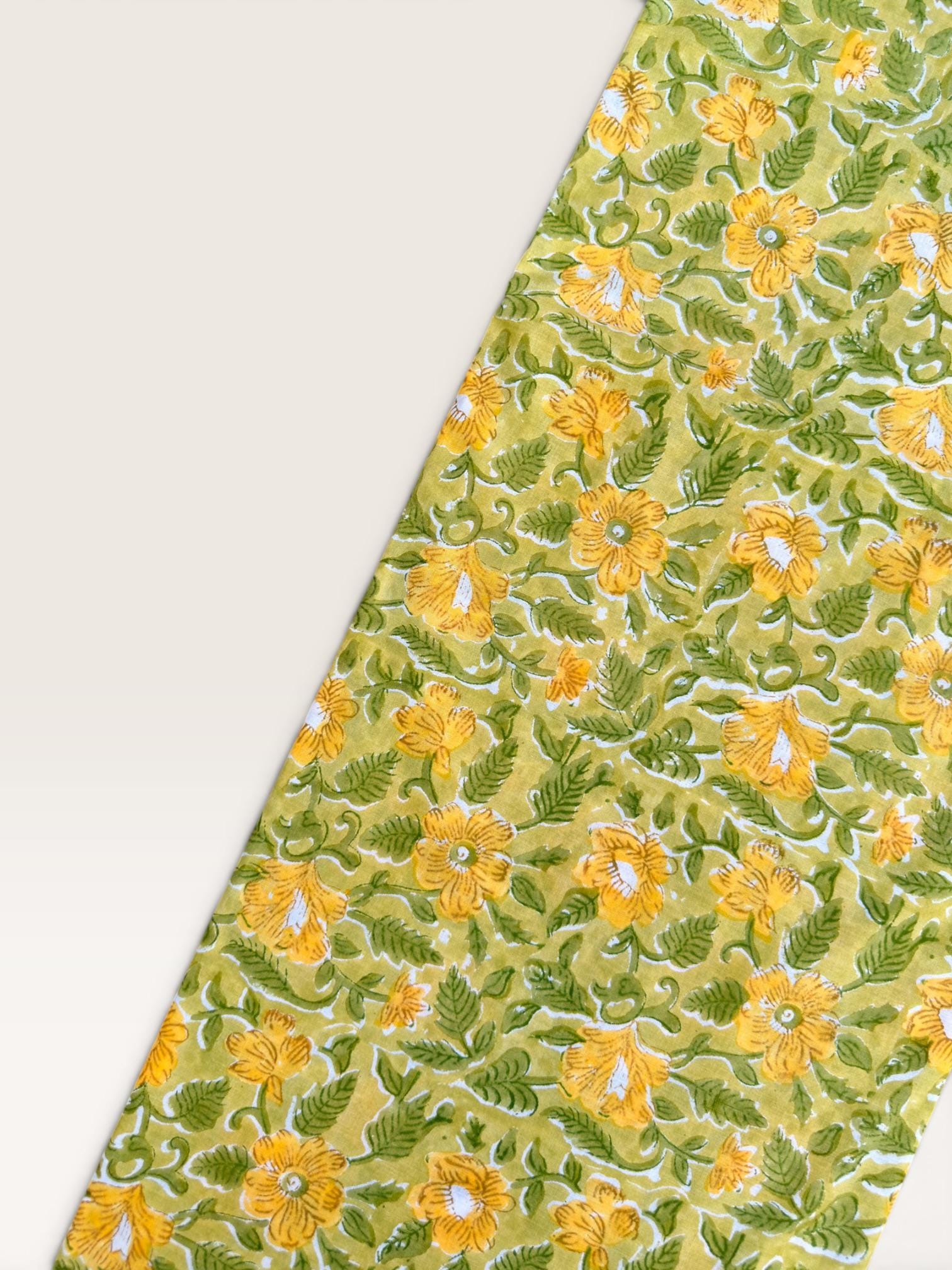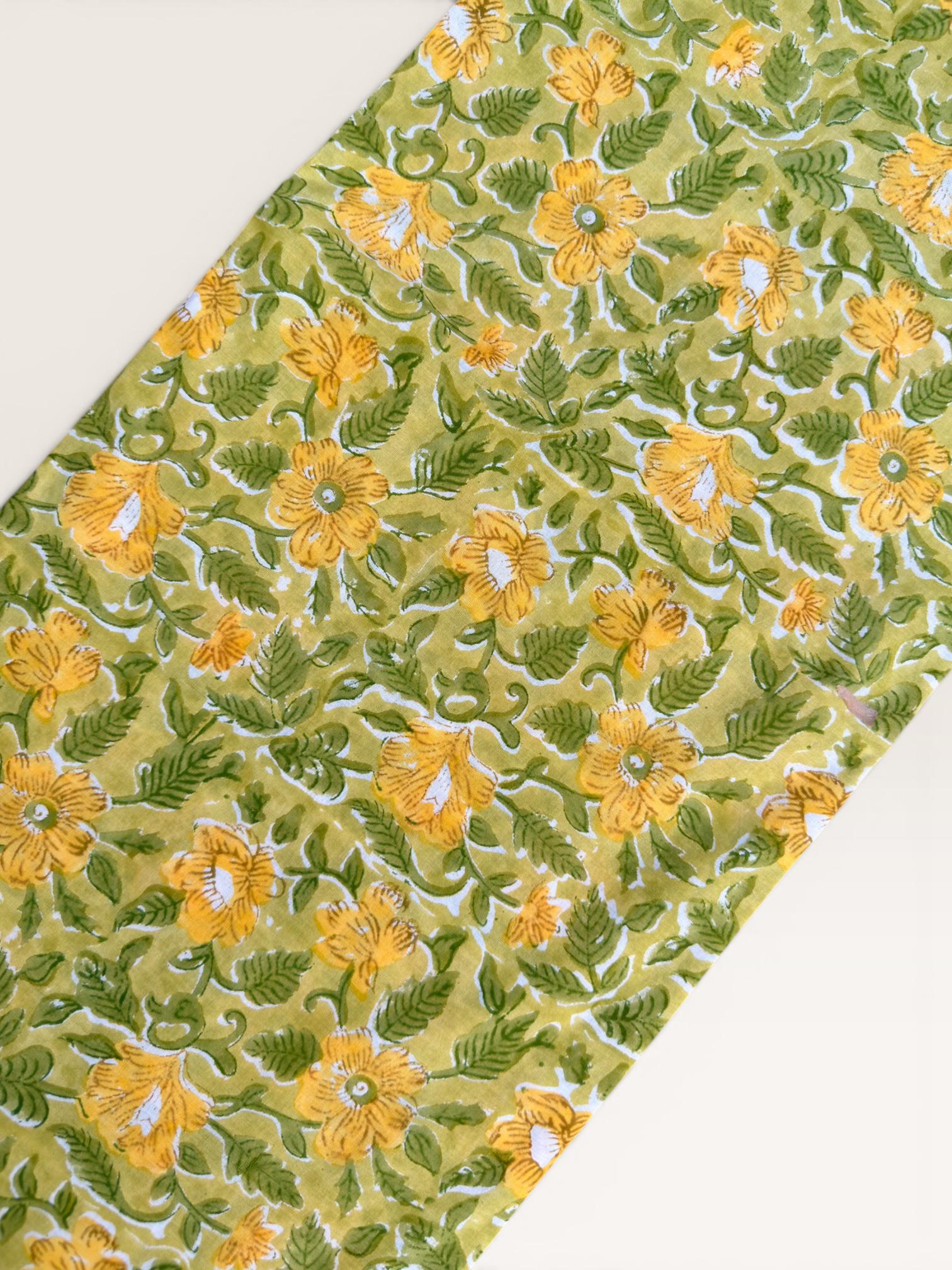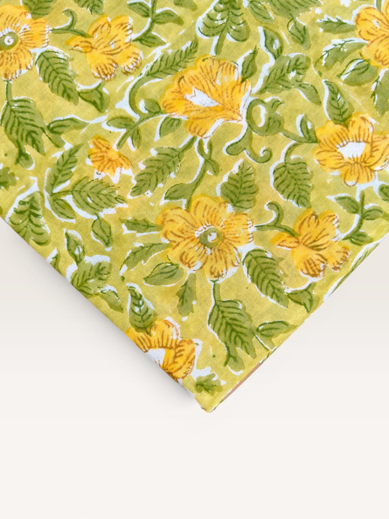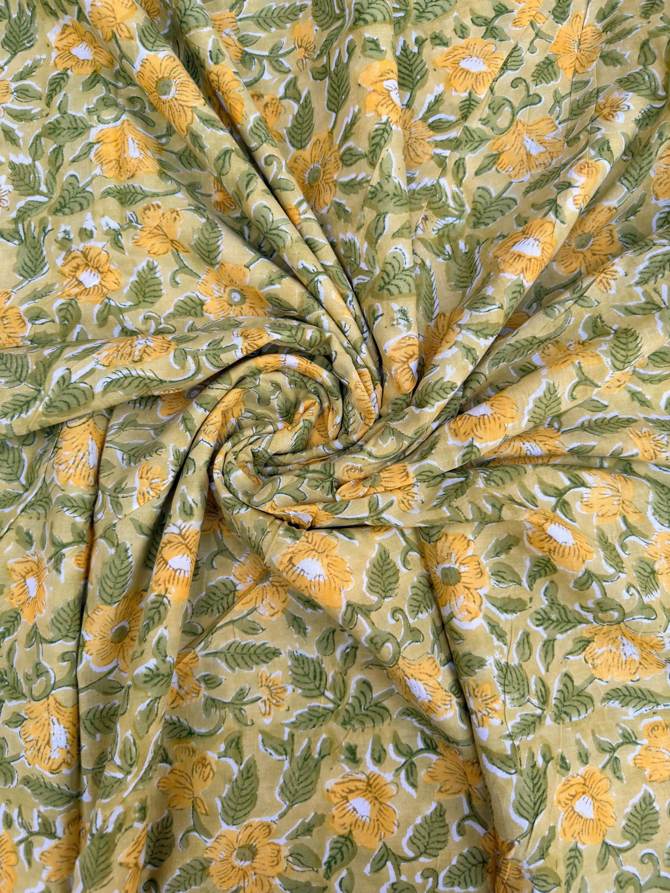 Brighten up your creations with this cheerful hand block printed cotton fabric, featuring a lively floral pattern inspired by nature. Set on a warm mustard yellow base, the design showcases beautifully detailed yellow blossoms with fresh green leaves, creating a vibrant yet earthy aesthetic.