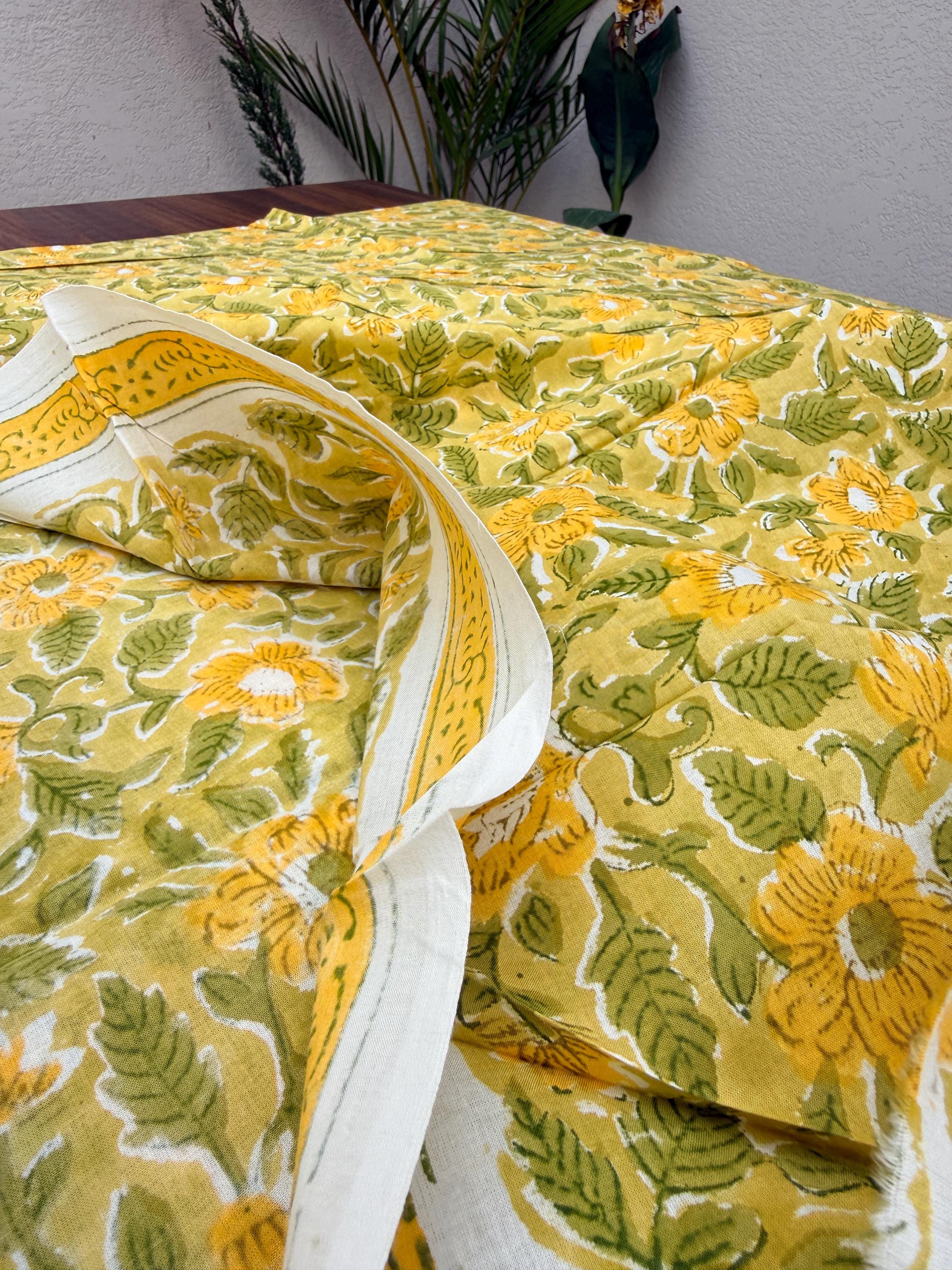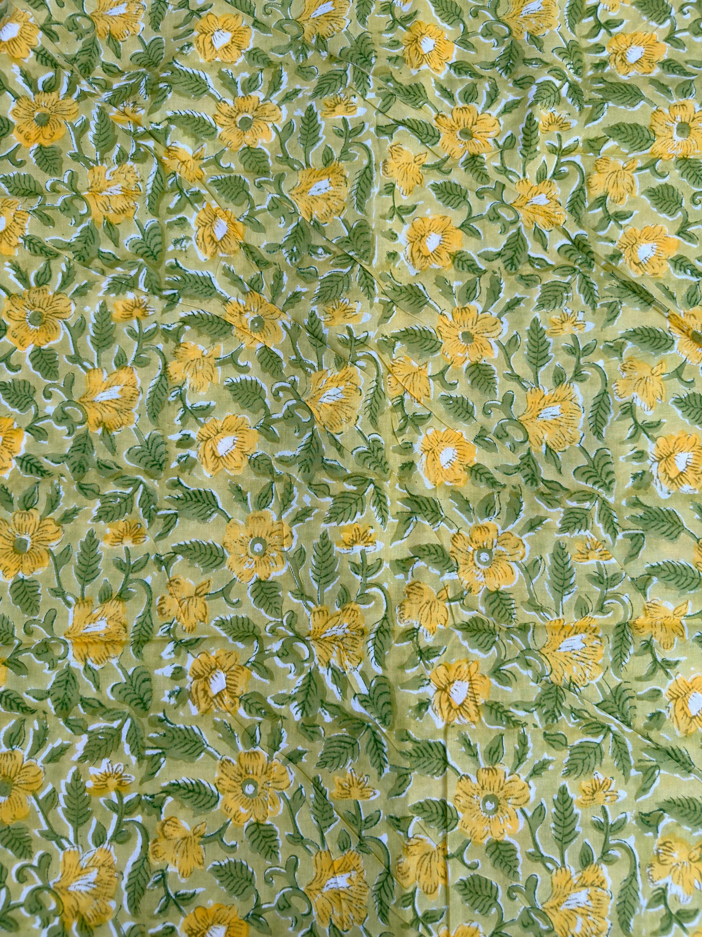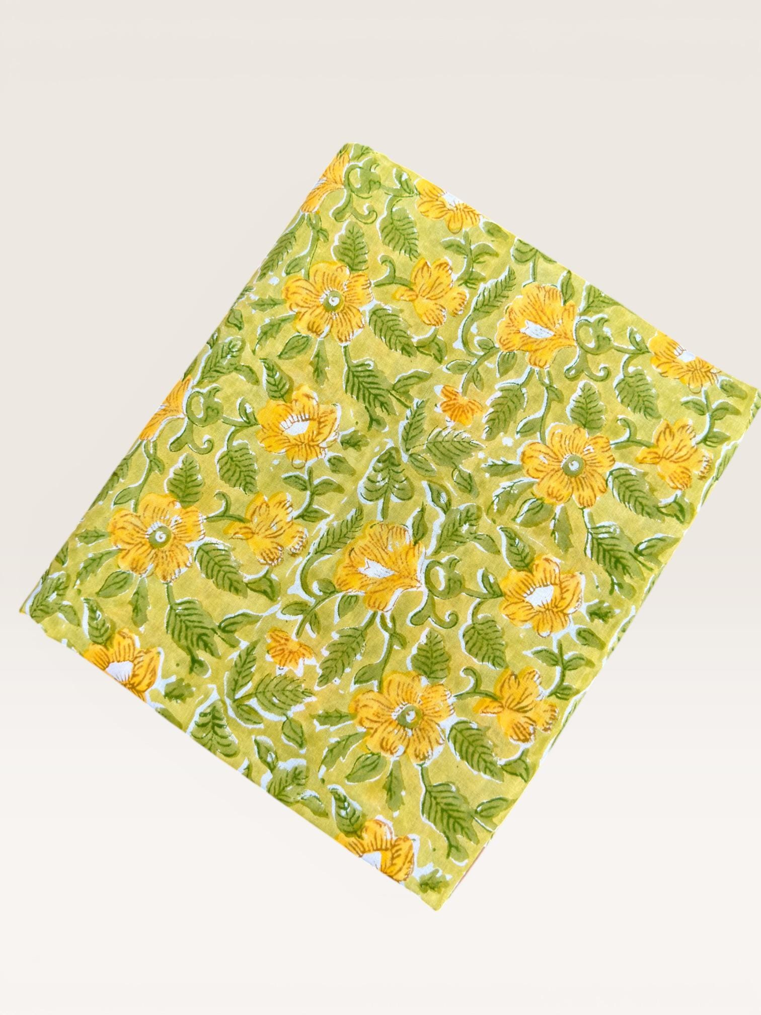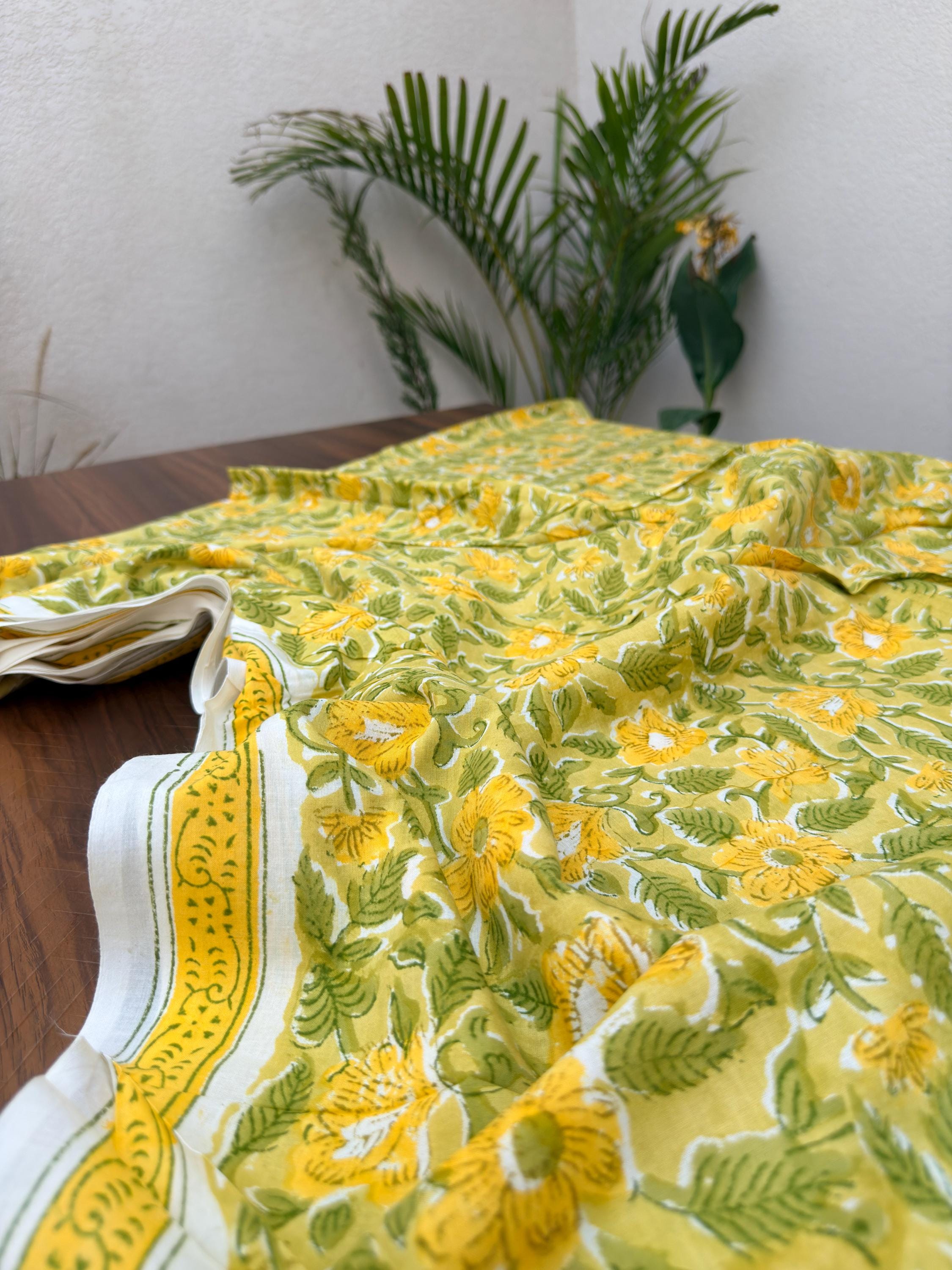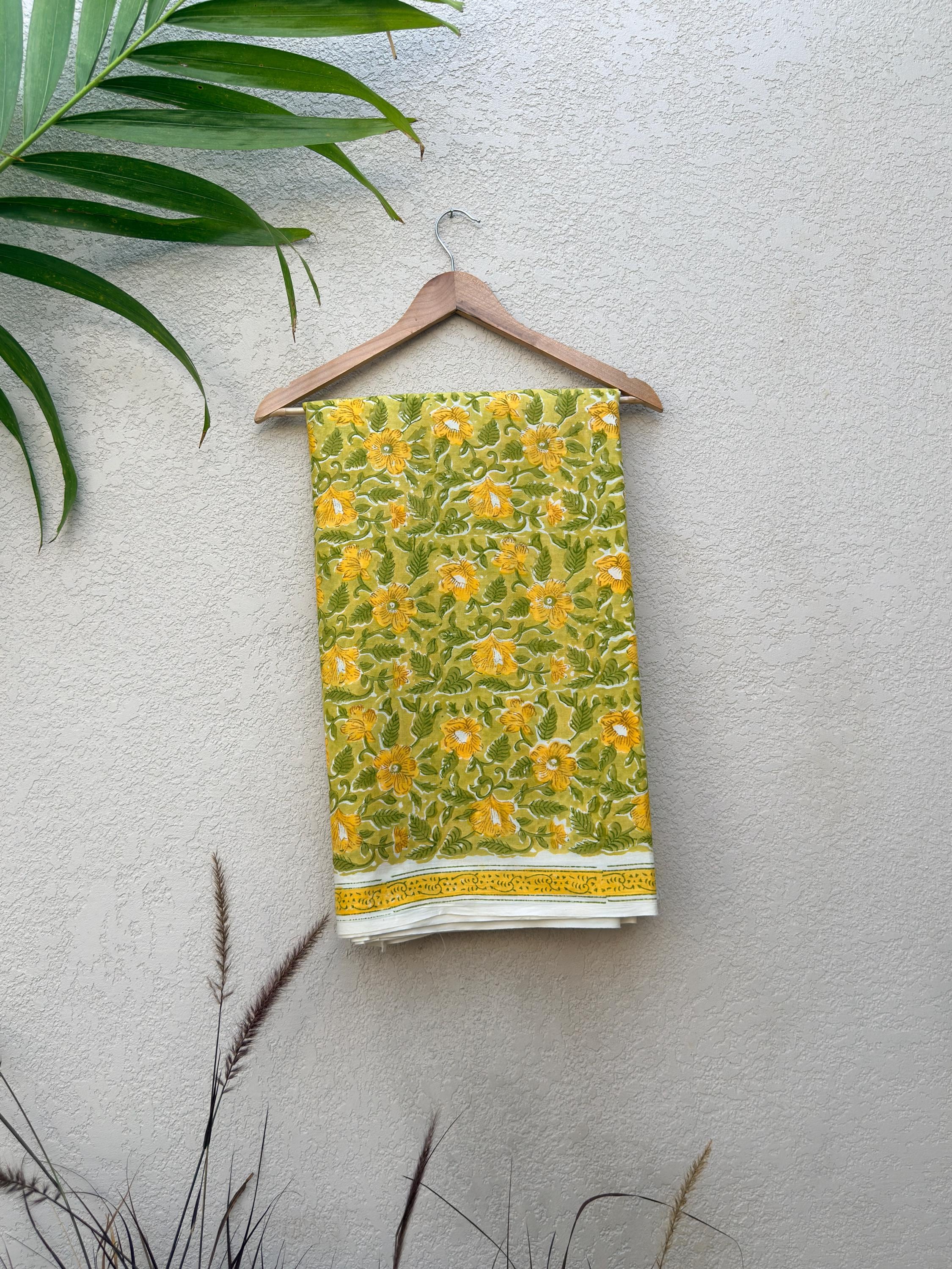 Brighten up your creations with this cheerful hand block printed cotton fabric, featuring a lively floral pattern inspired by nature. Set on a warm mustard yellow base, the design showcases beautifully detailed yellow blossoms with fresh green leaves, creating a vibrant yet earthy aesthetic.
