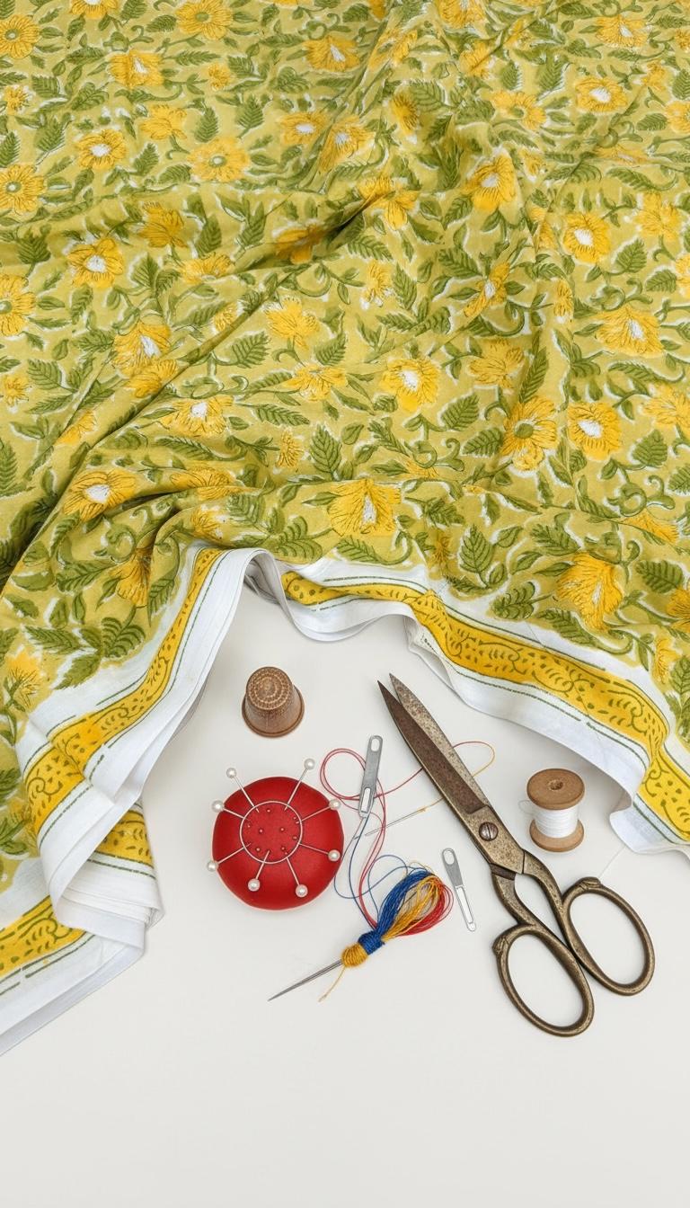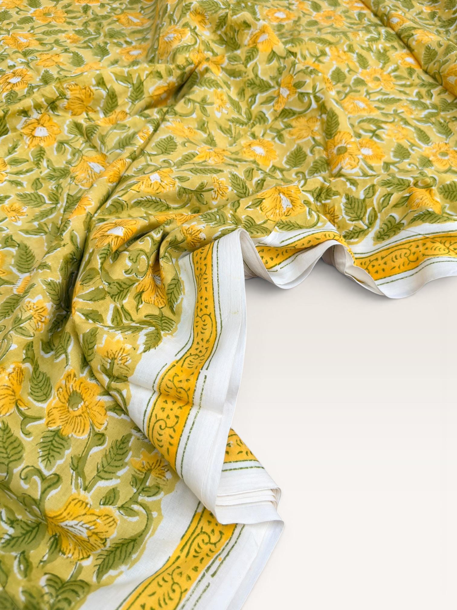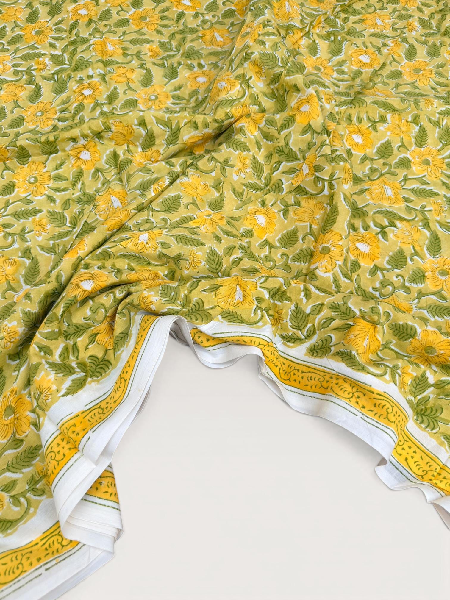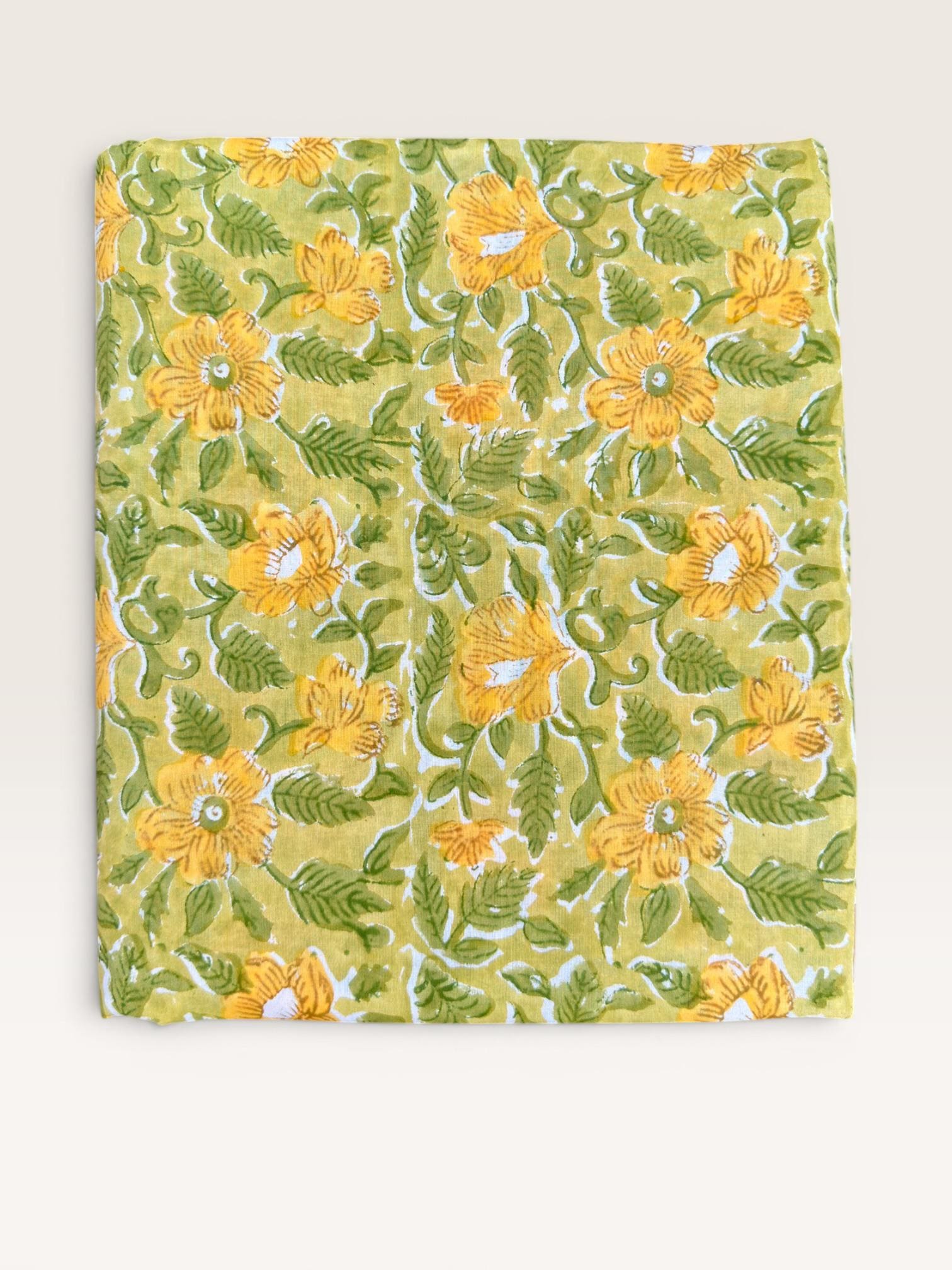 Brighten up your creations with this cheerful hand block printed cotton fabric, featuring a lively floral pattern inspired by nature. Set on a warm mustard yellow base, the design showcases beautifully detailed yellow blossoms with fresh green leaves, creating a vibrant yet earthy aesthetic.
