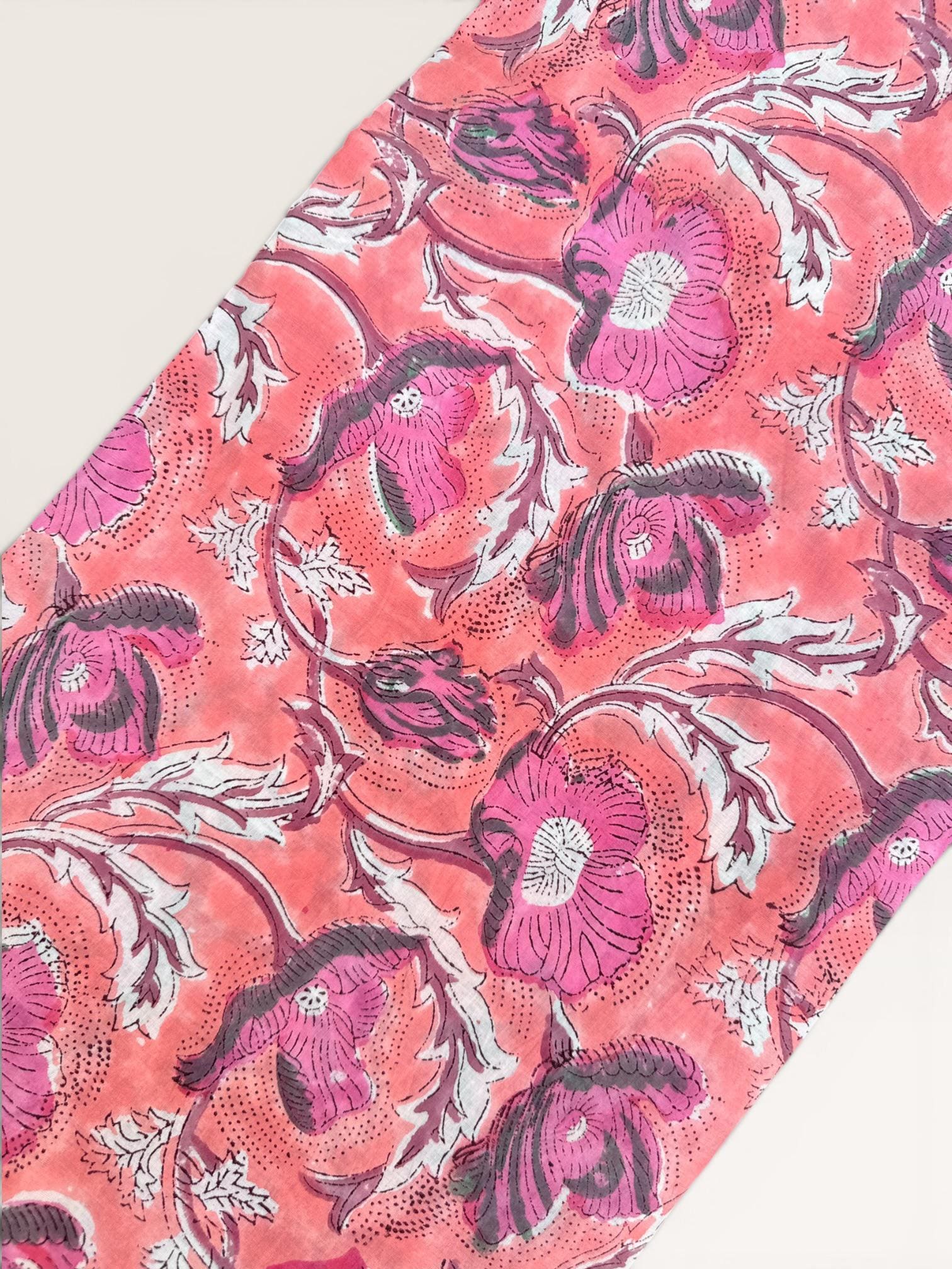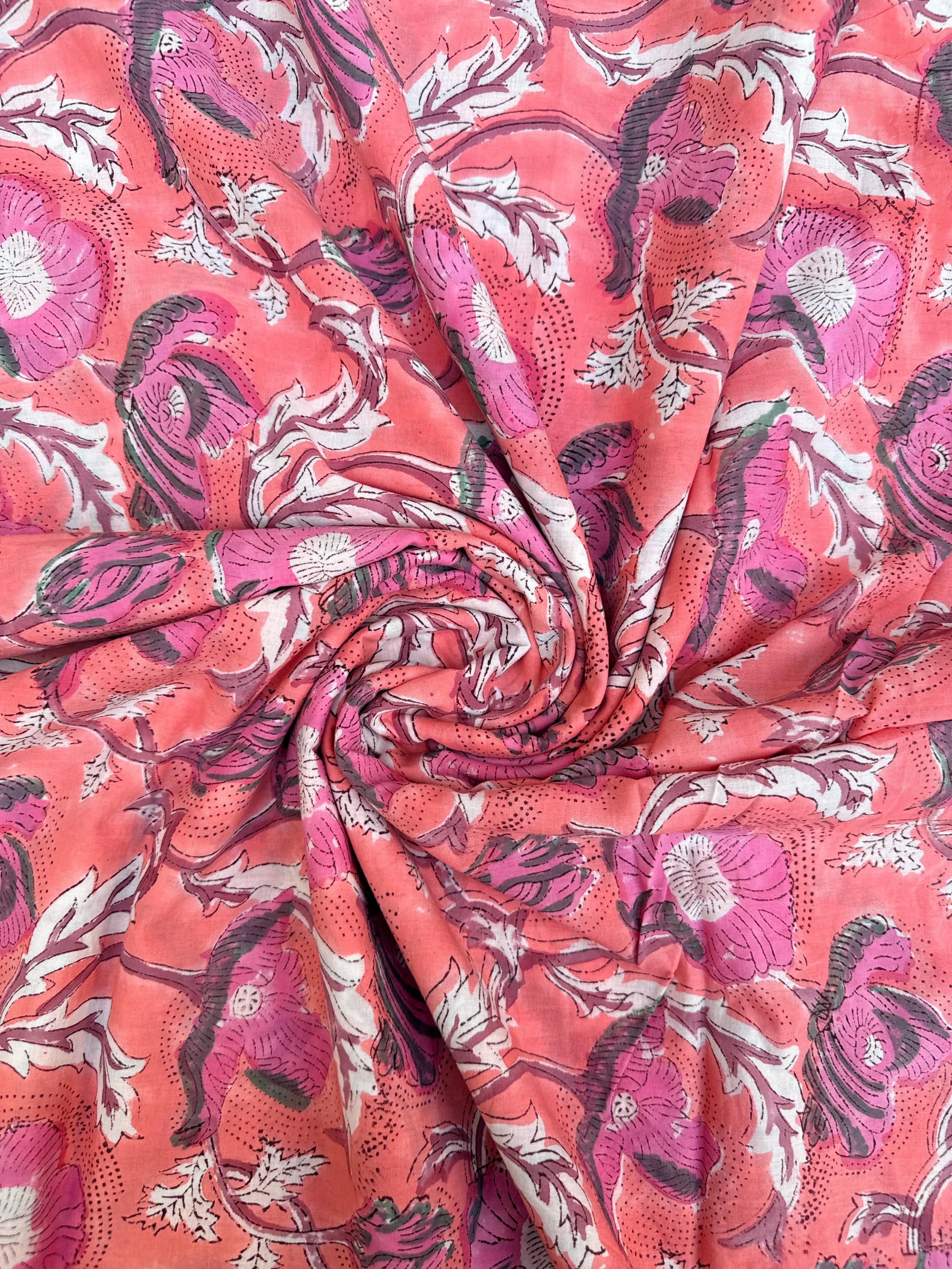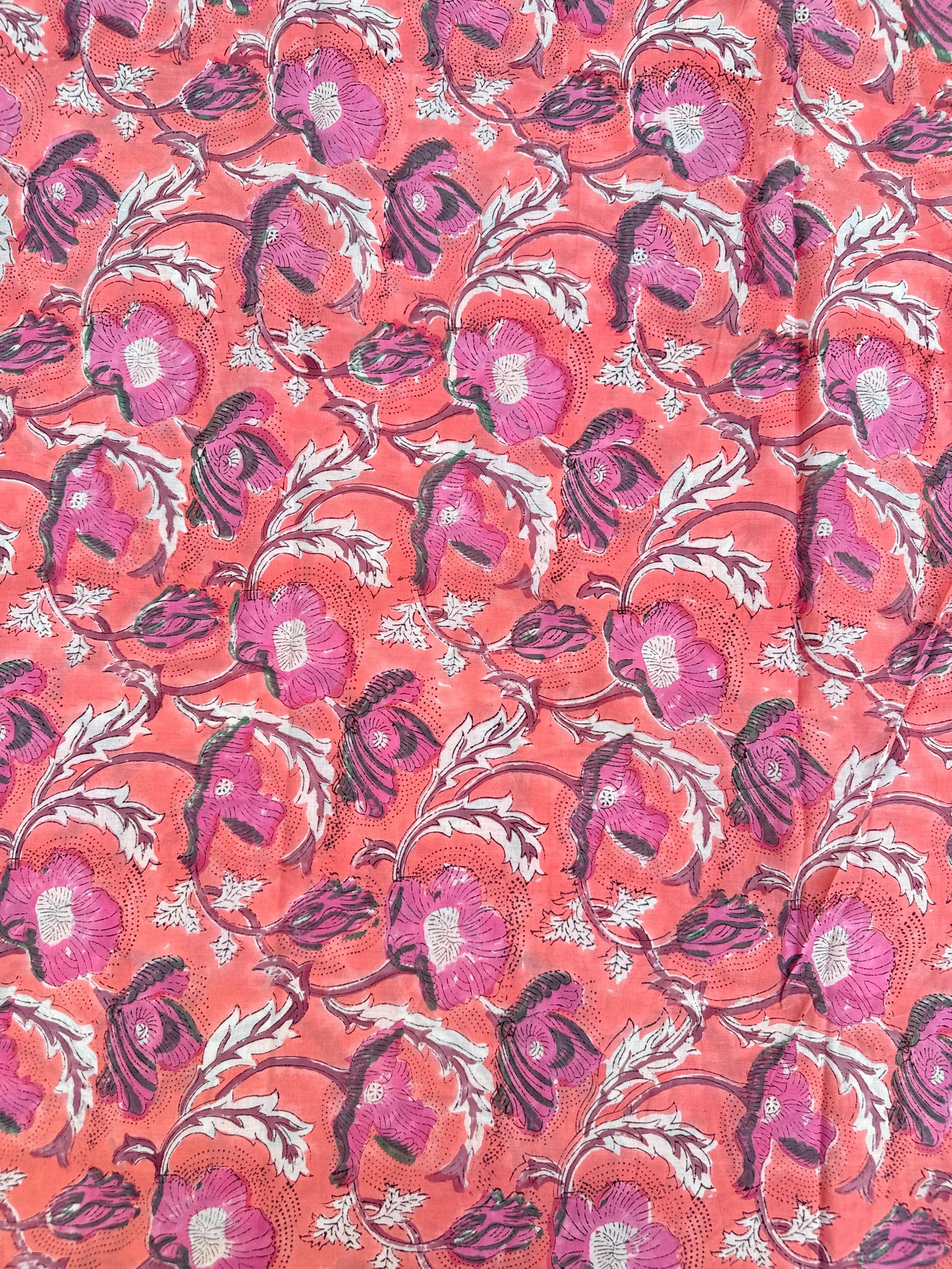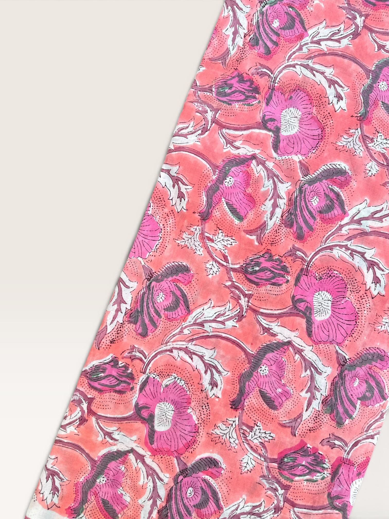 Hand Block Print Cotton Fabric by Yard – Coral Pink Floral Running Fabric | Indian Handmade Textile | Soft Cotton Dressmaking & Craft Fabric