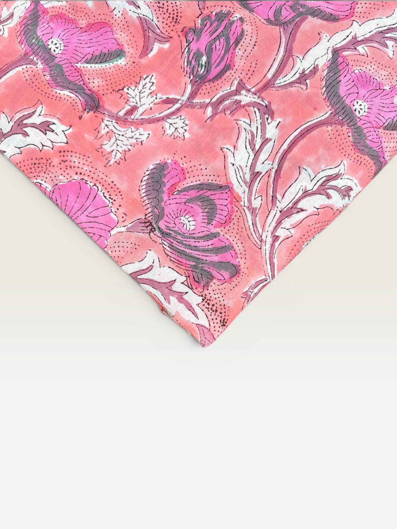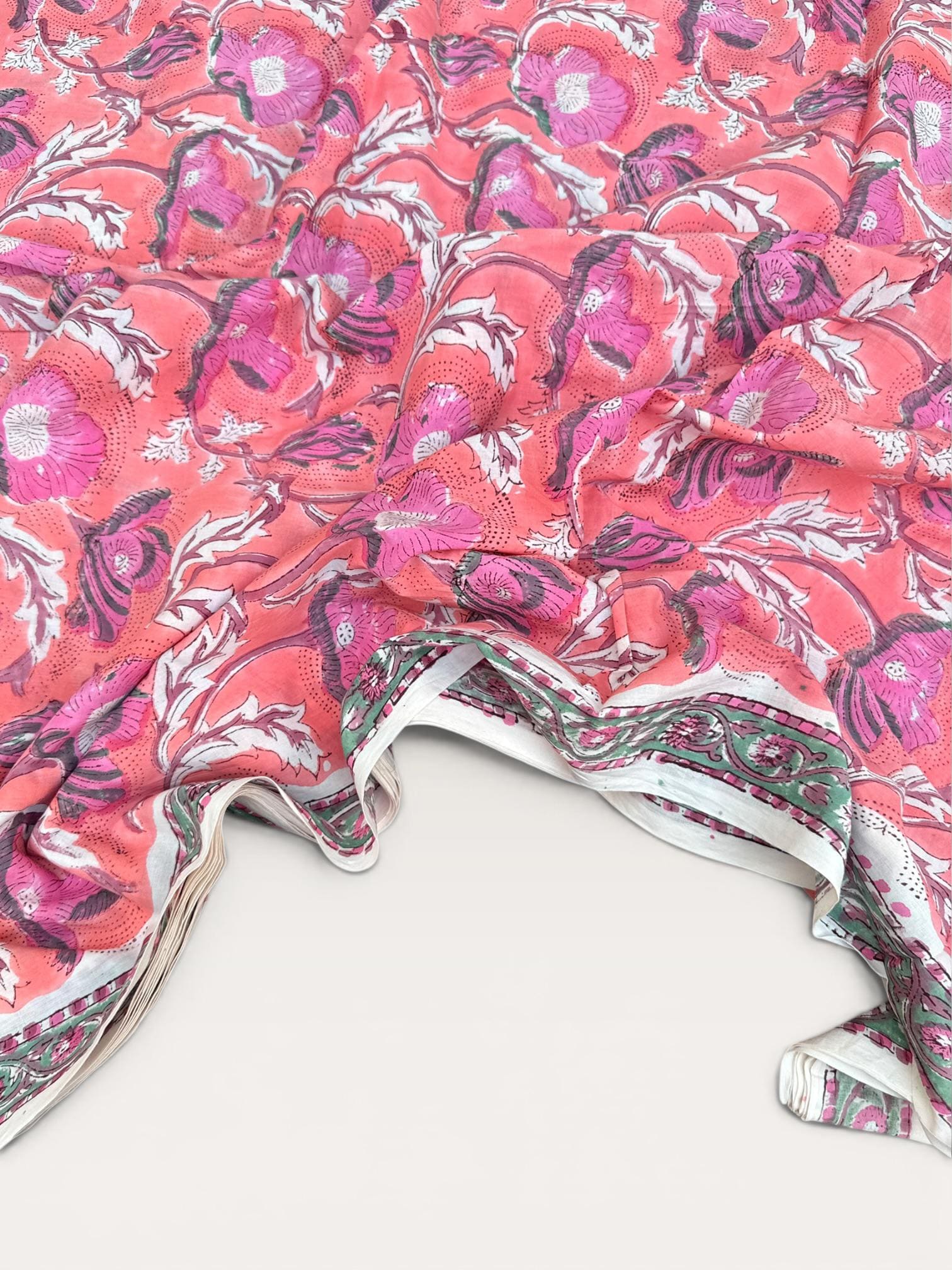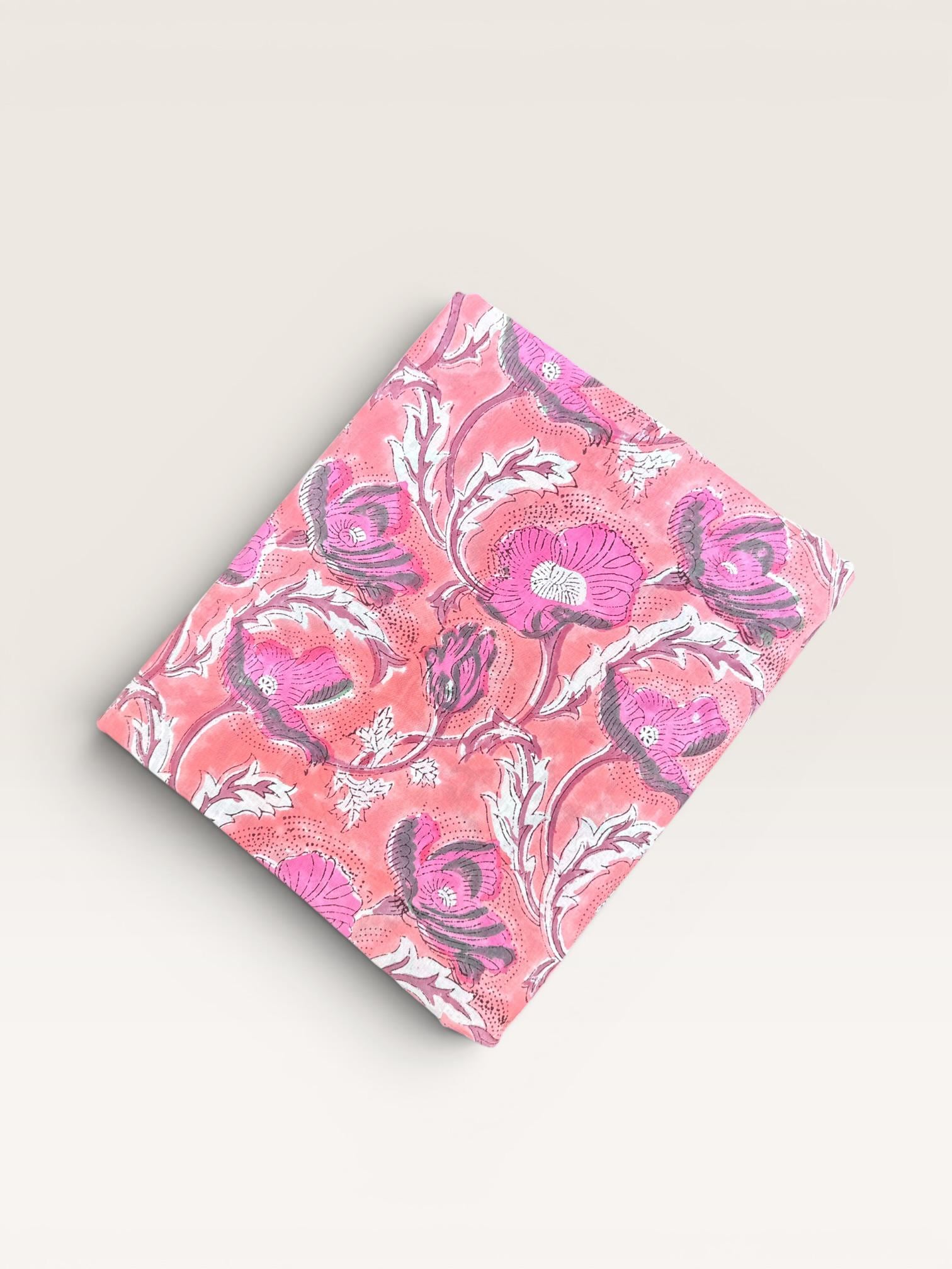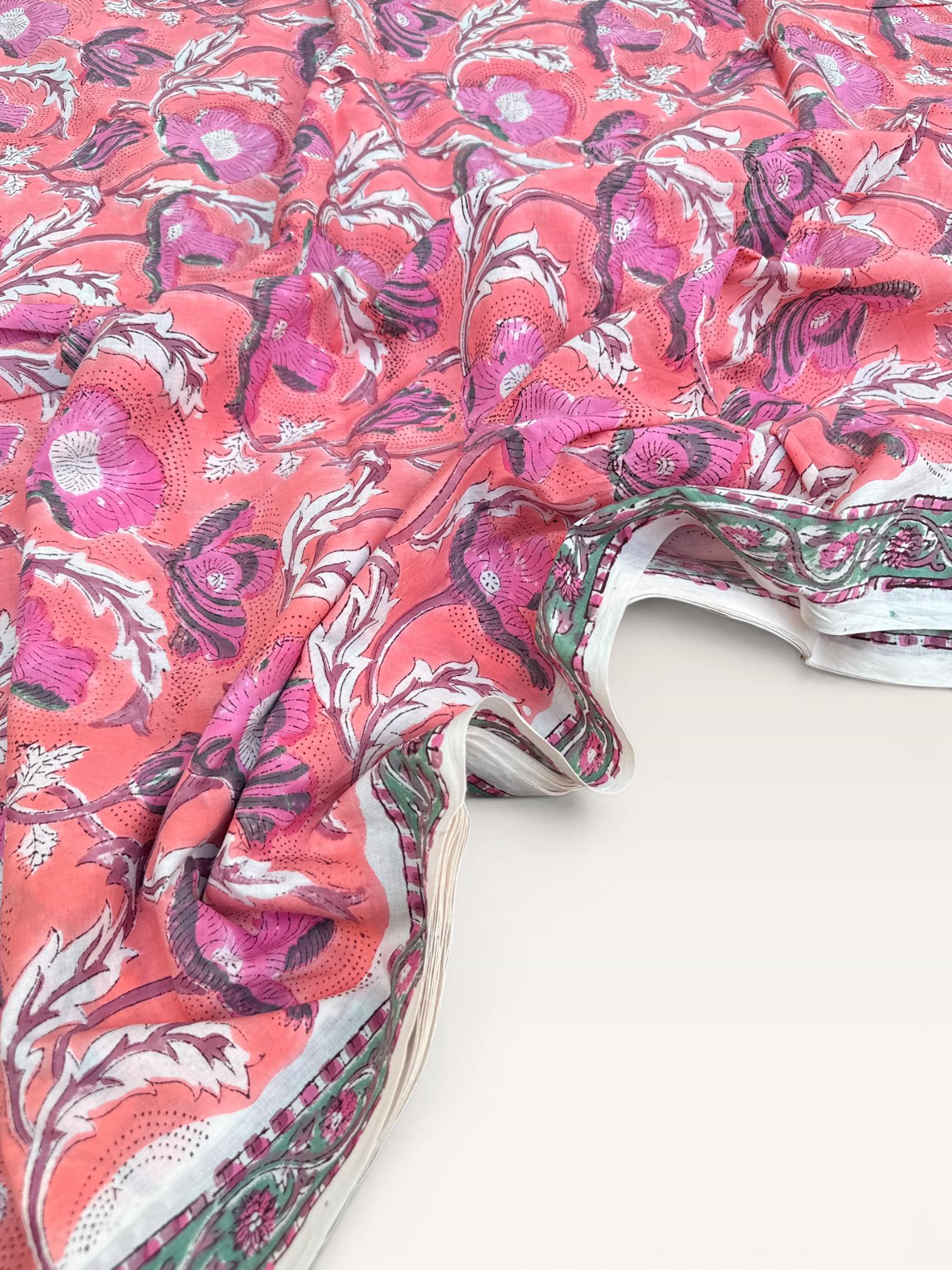 Hand Block Print Cotton Fabric by Yard – Coral Pink Floral Running Fabric | Indian Handmade Textile | Soft Cotton Dressmaking & Craft Fabric