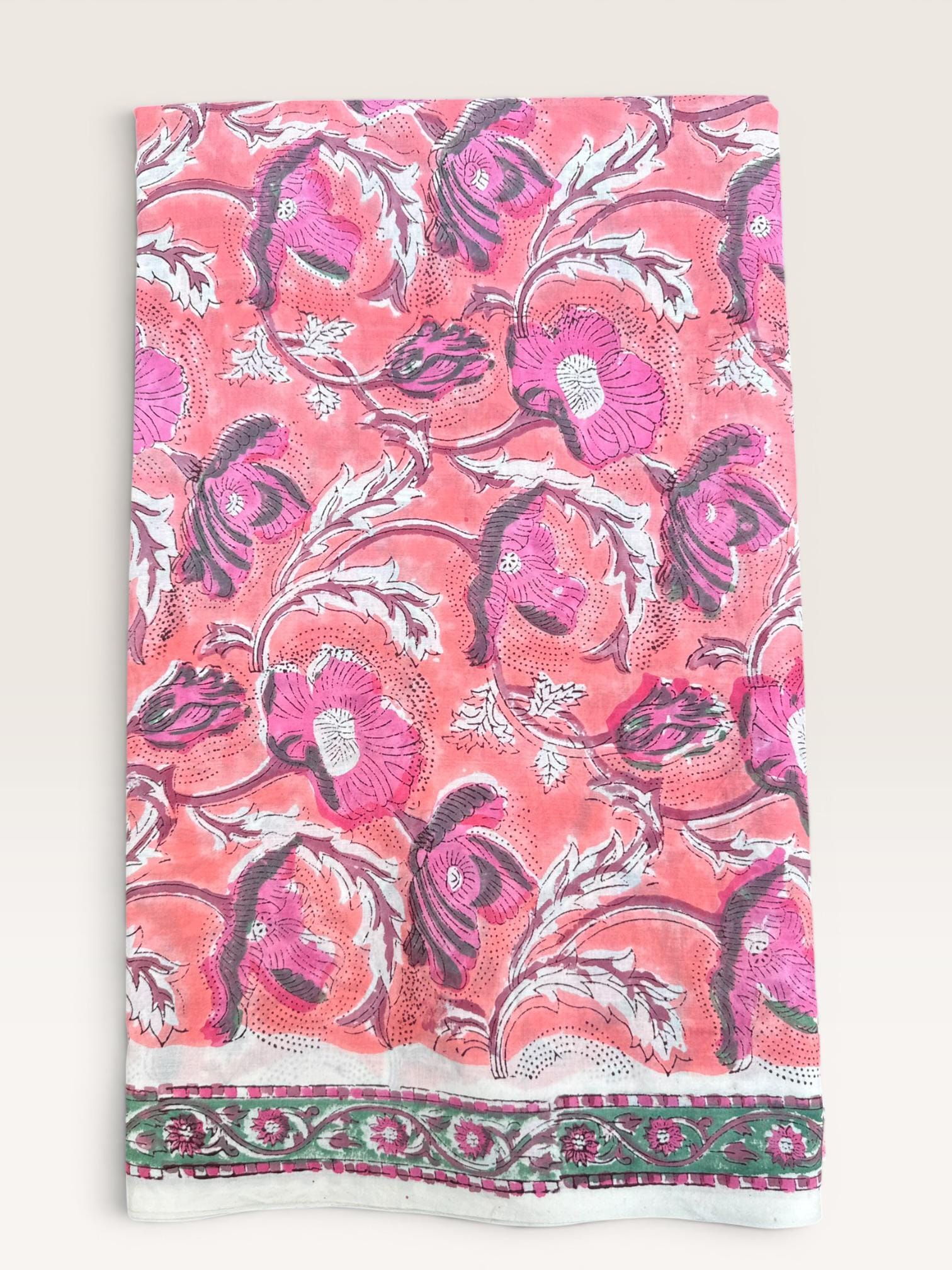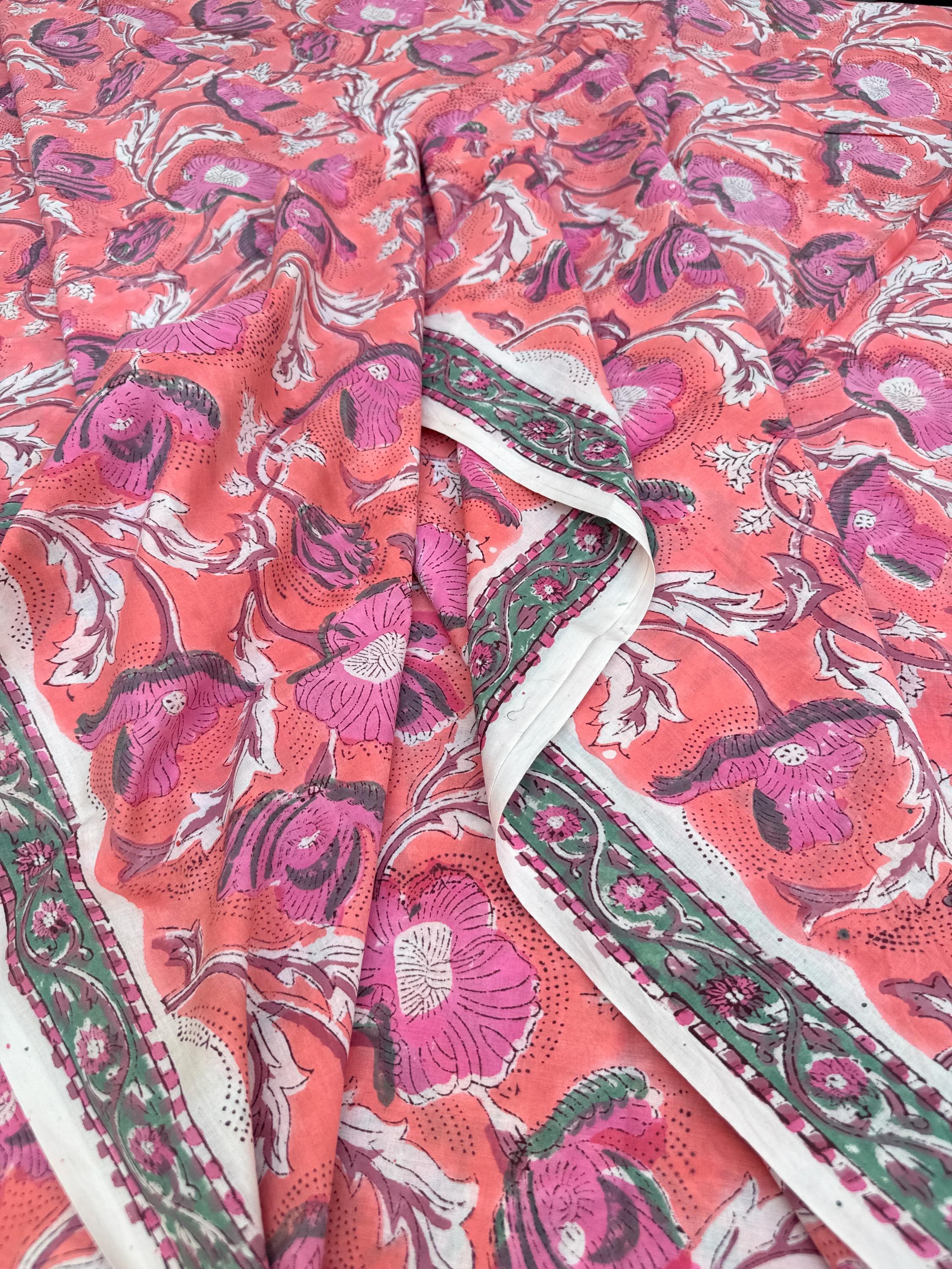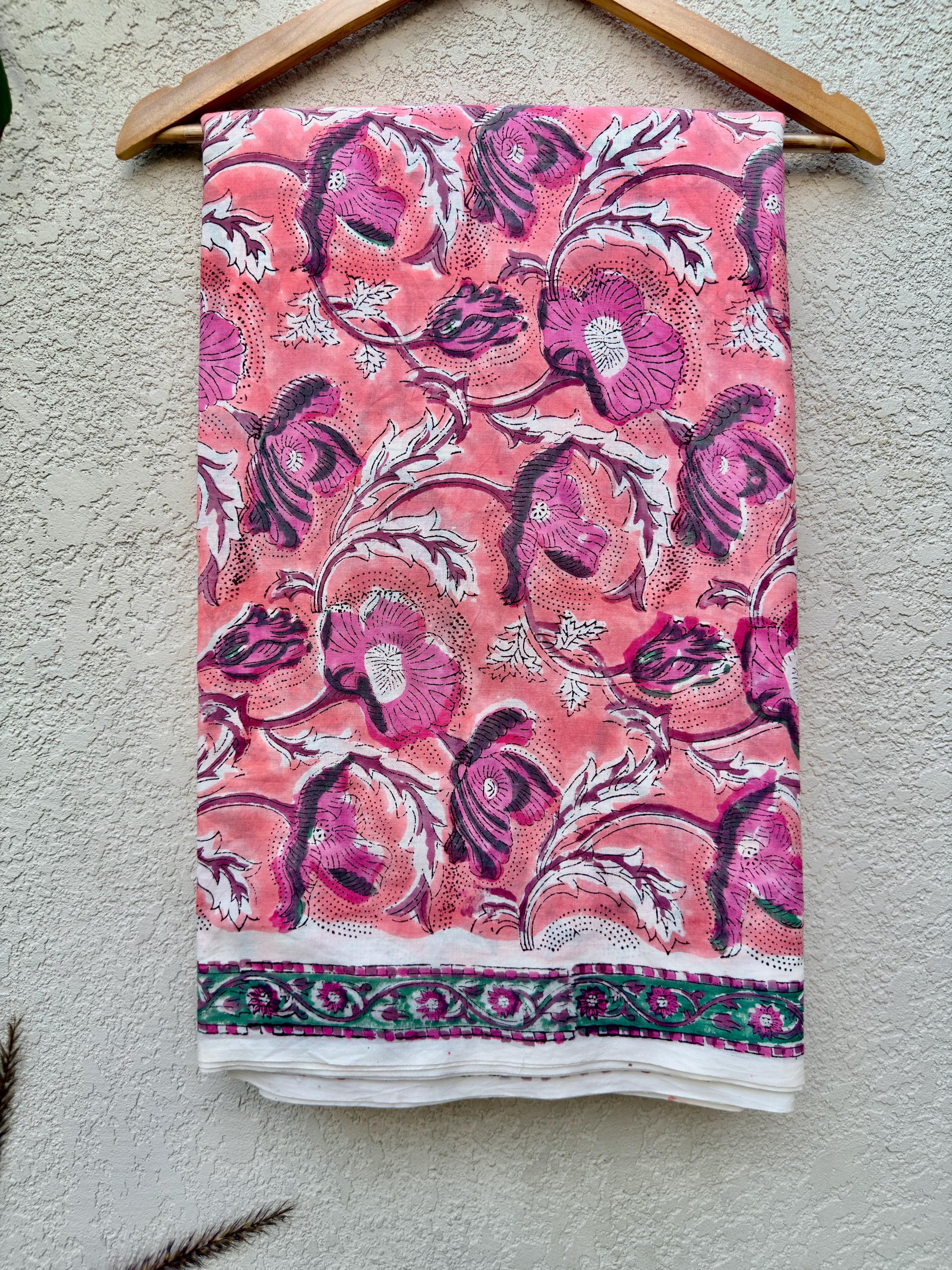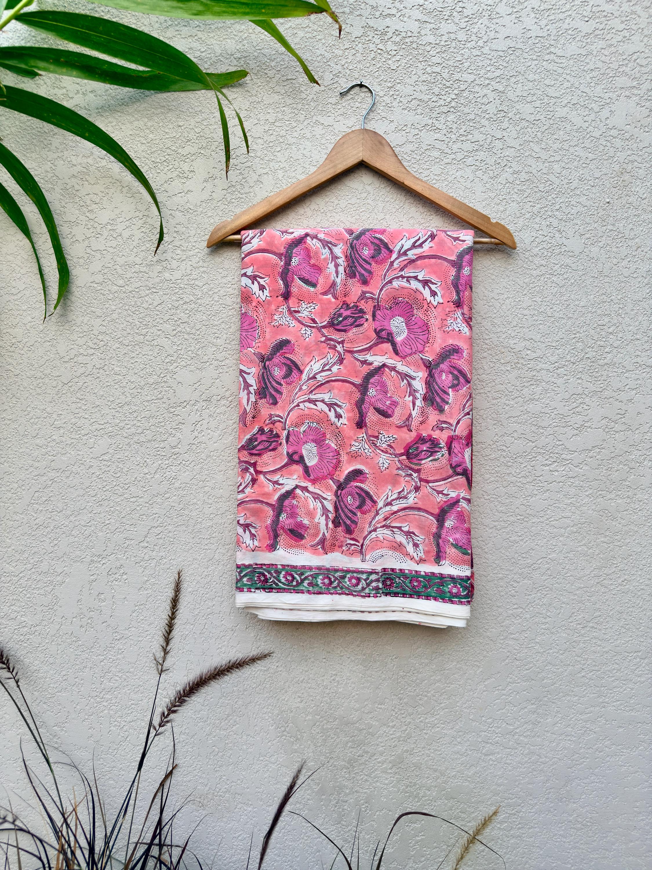 Hand Block Print Cotton Fabric by Yard – Coral Pink Floral Running Fabric | Indian Handmade Textile | Soft Cotton Dressmaking & Craft Fabric