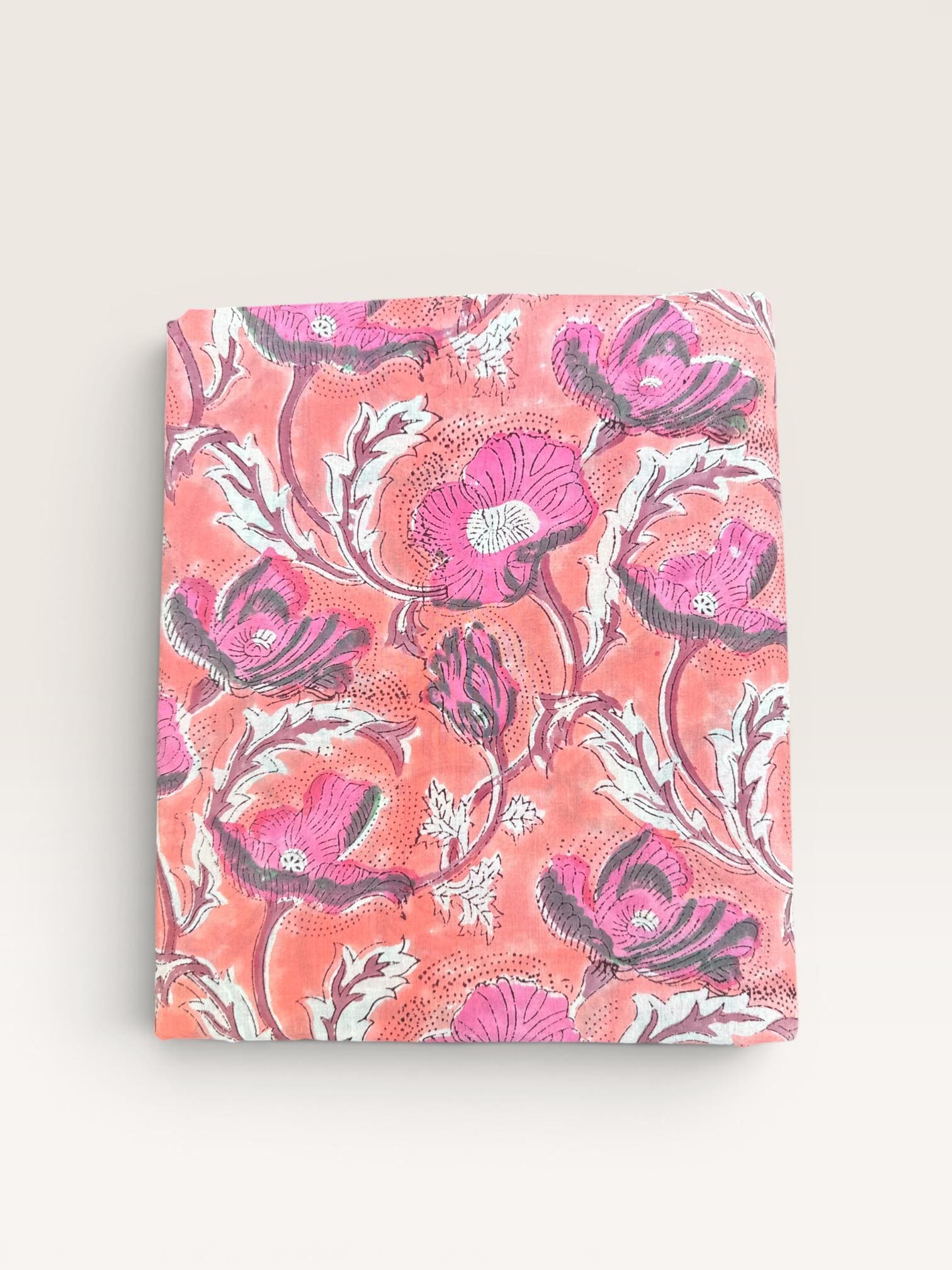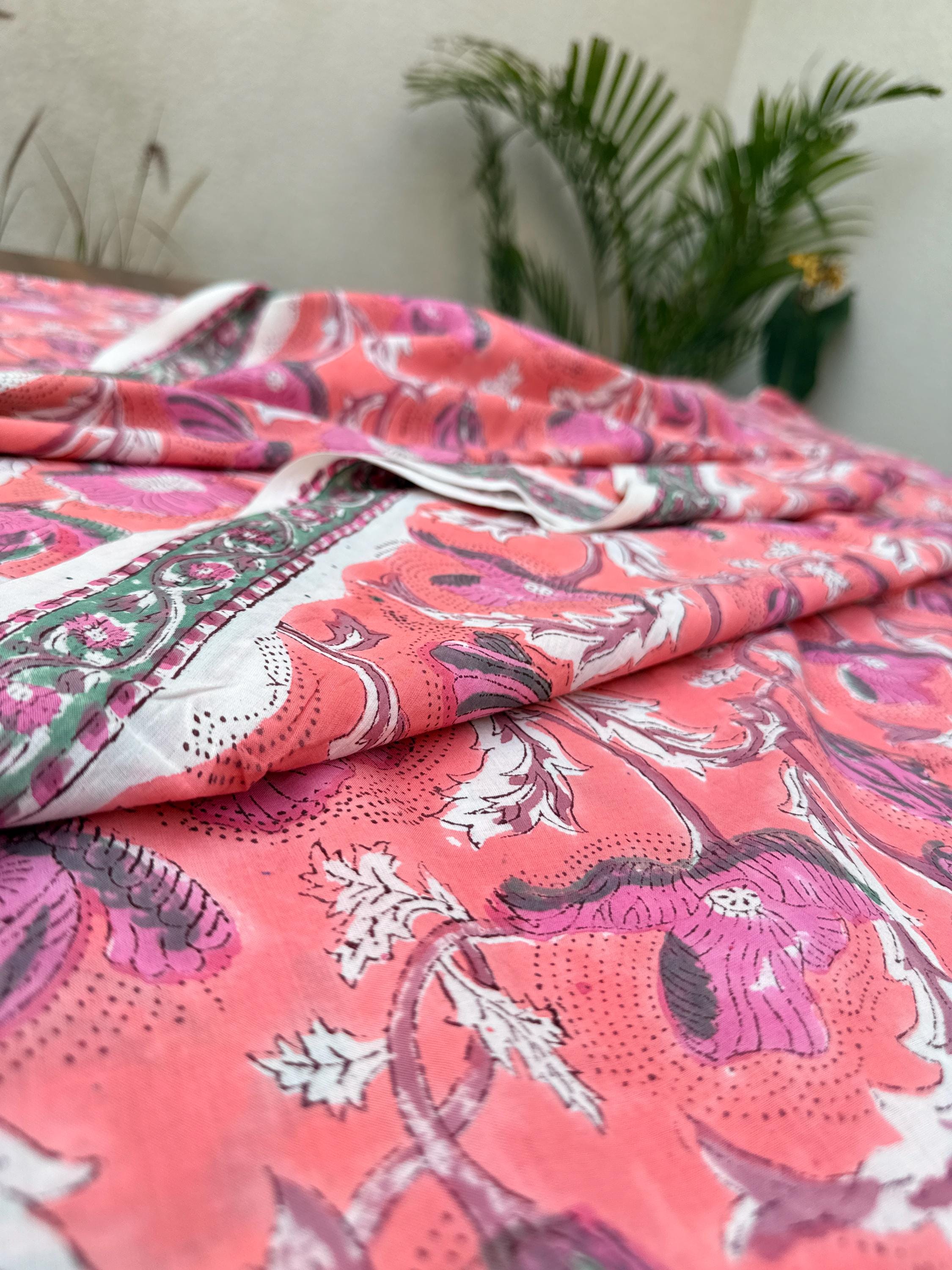 Bring timeless elegance to your creations with this beautiful hand block printed running fabric, crafted by skilled artisans using traditional Indian techniques. Featuring a vibrant coral pink base adorned with bold floral motifs in shades of magenta, grey, and soft white, this fabric is perfect for adding a fresh and artistic touch to your designs.