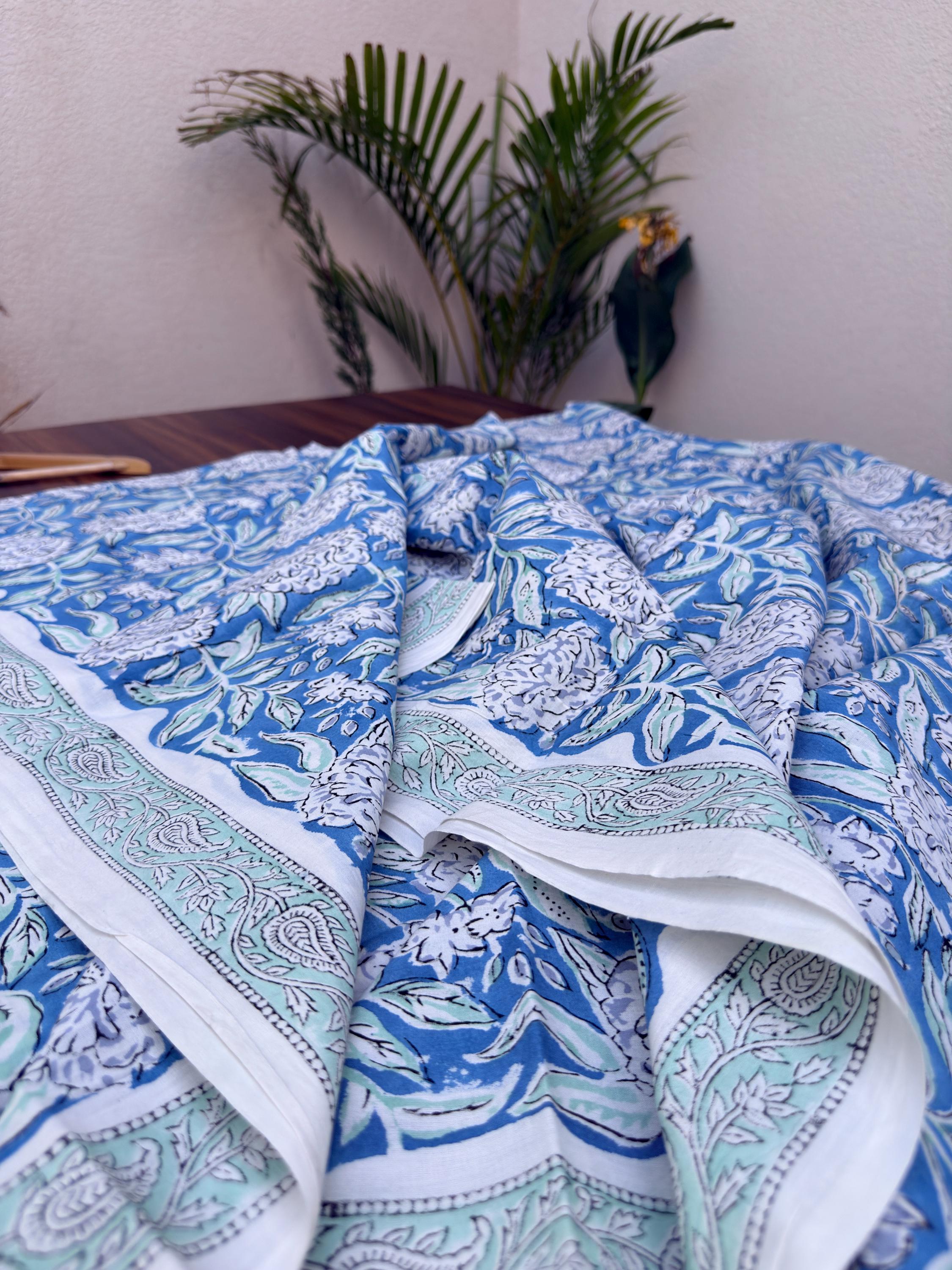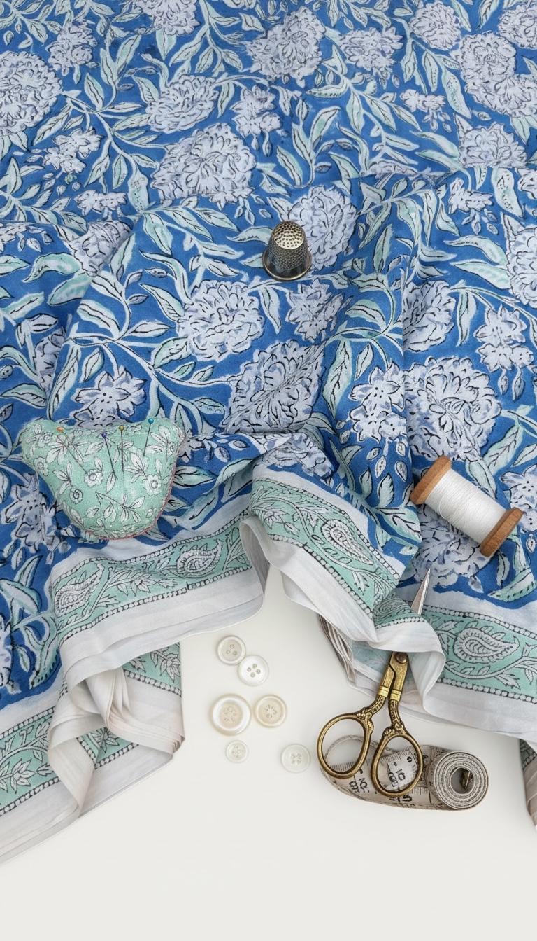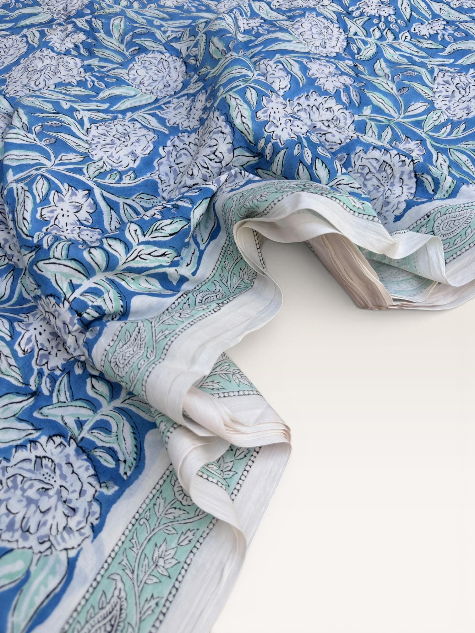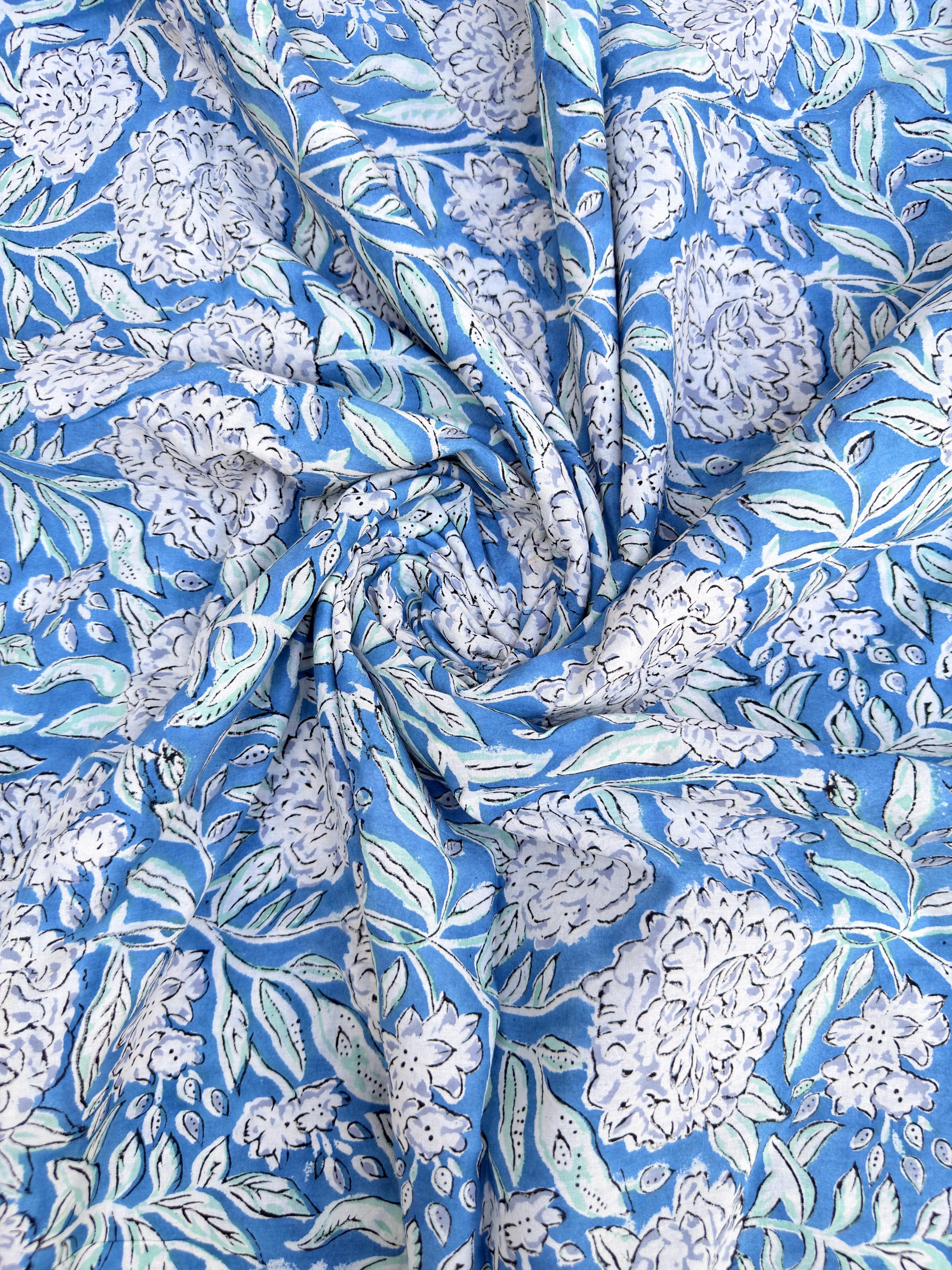 Bring timeless elegance to your sewing projects with this beautiful hand block printed cotton fabric in a refreshing blue color palette. Featuring intricate floral motifs in shades of indigo, sky blue, and soft mint green, this running fabric is perfect for creating breezy garments and stylish home décor.