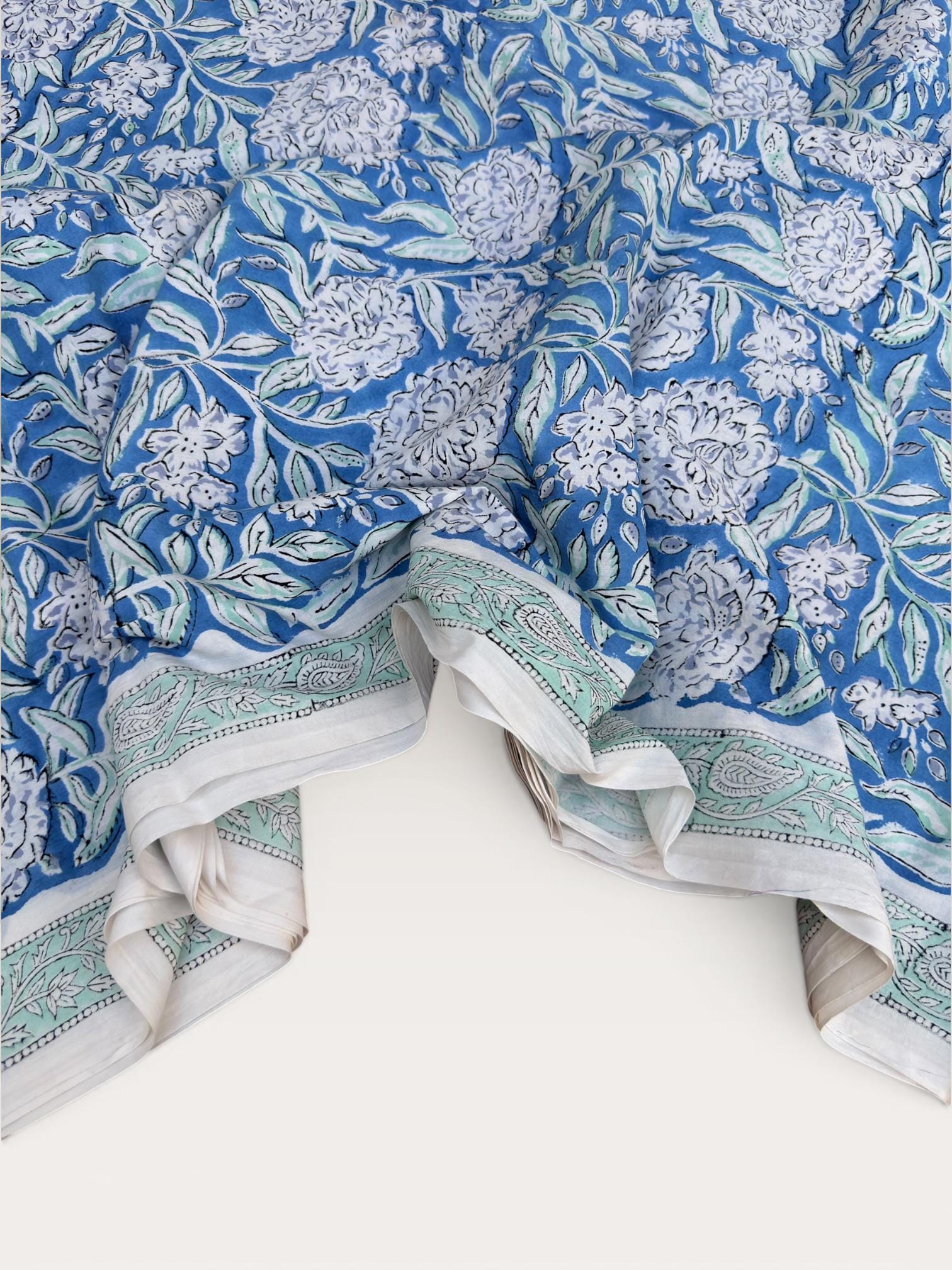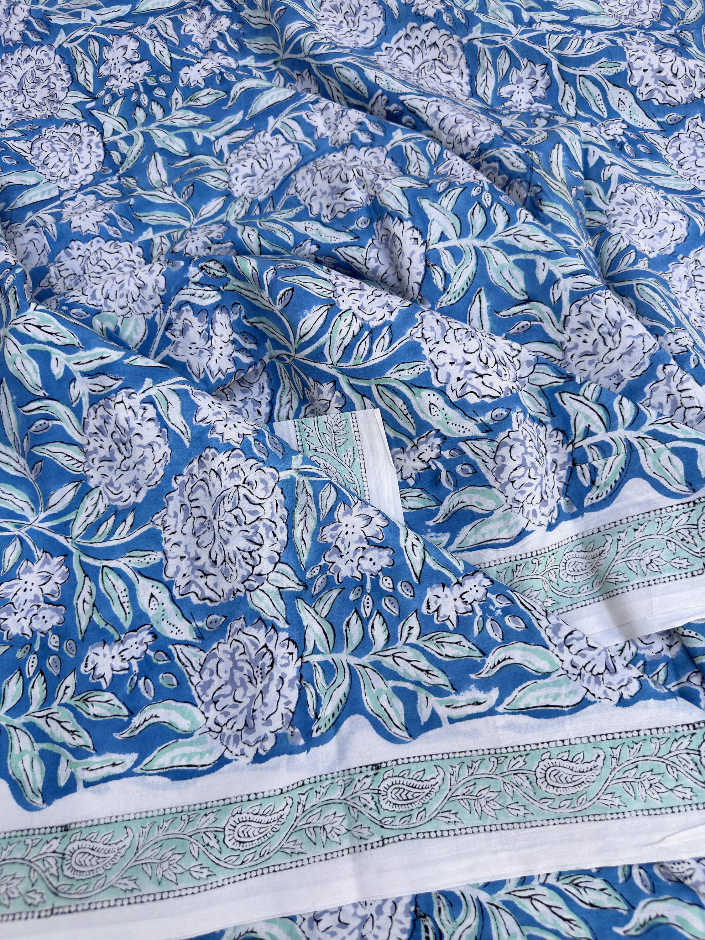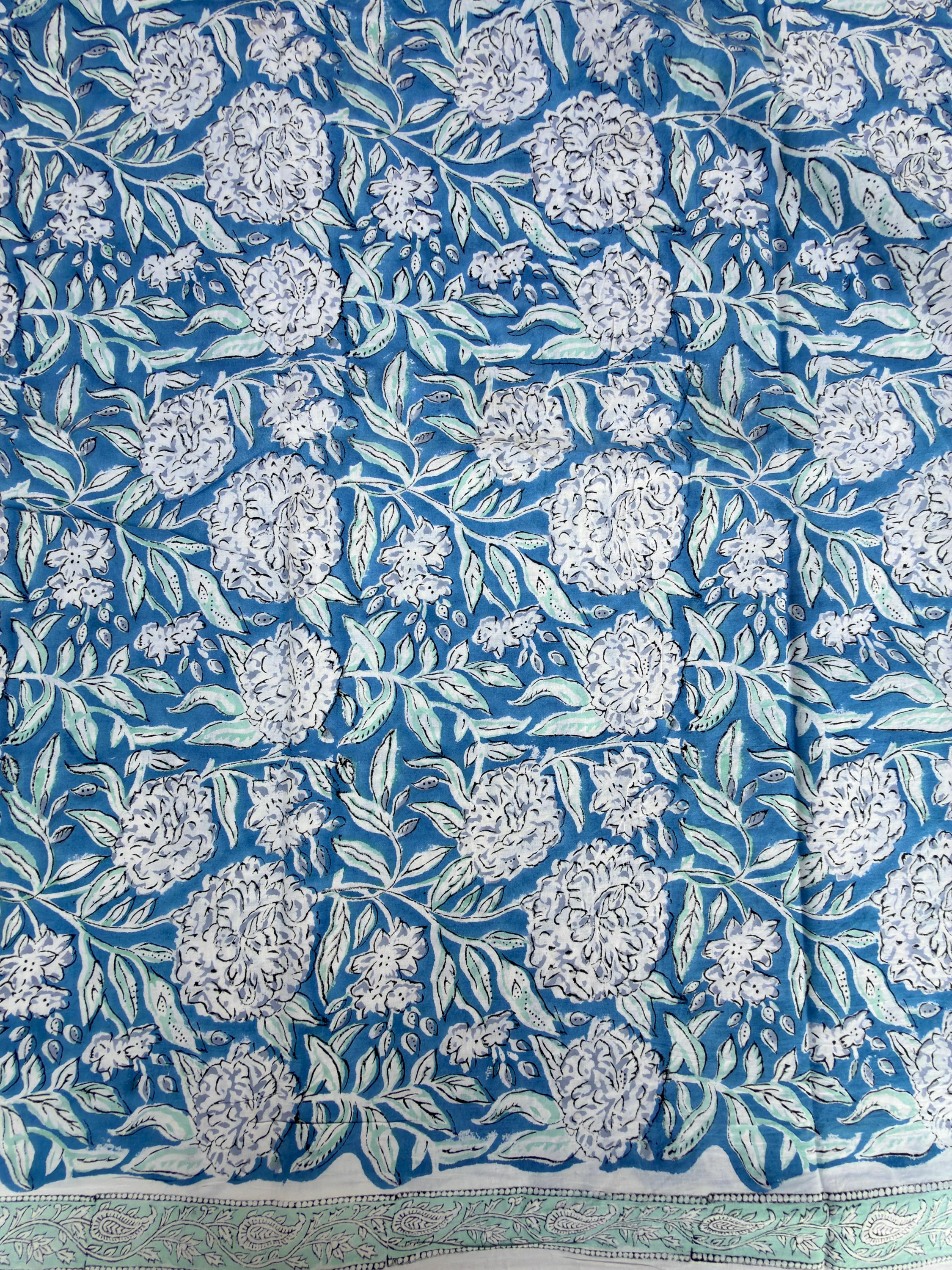 Bring timeless elegance to your sewing projects with this beautiful hand block printed cotton fabric in a refreshing blue color palette. Featuring intricate floral motifs in shades of indigo, sky blue, and soft mint green, this running fabric is perfect for creating breezy garments and stylish home décor.