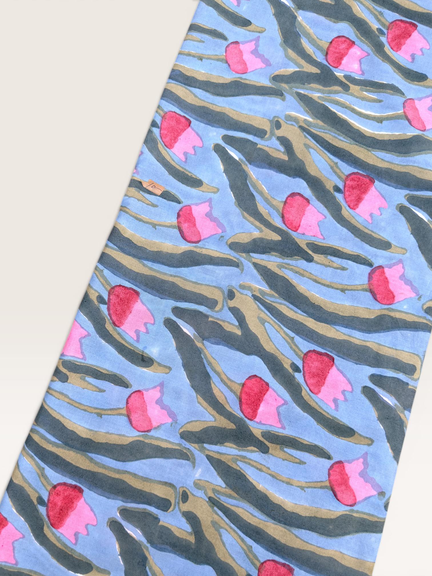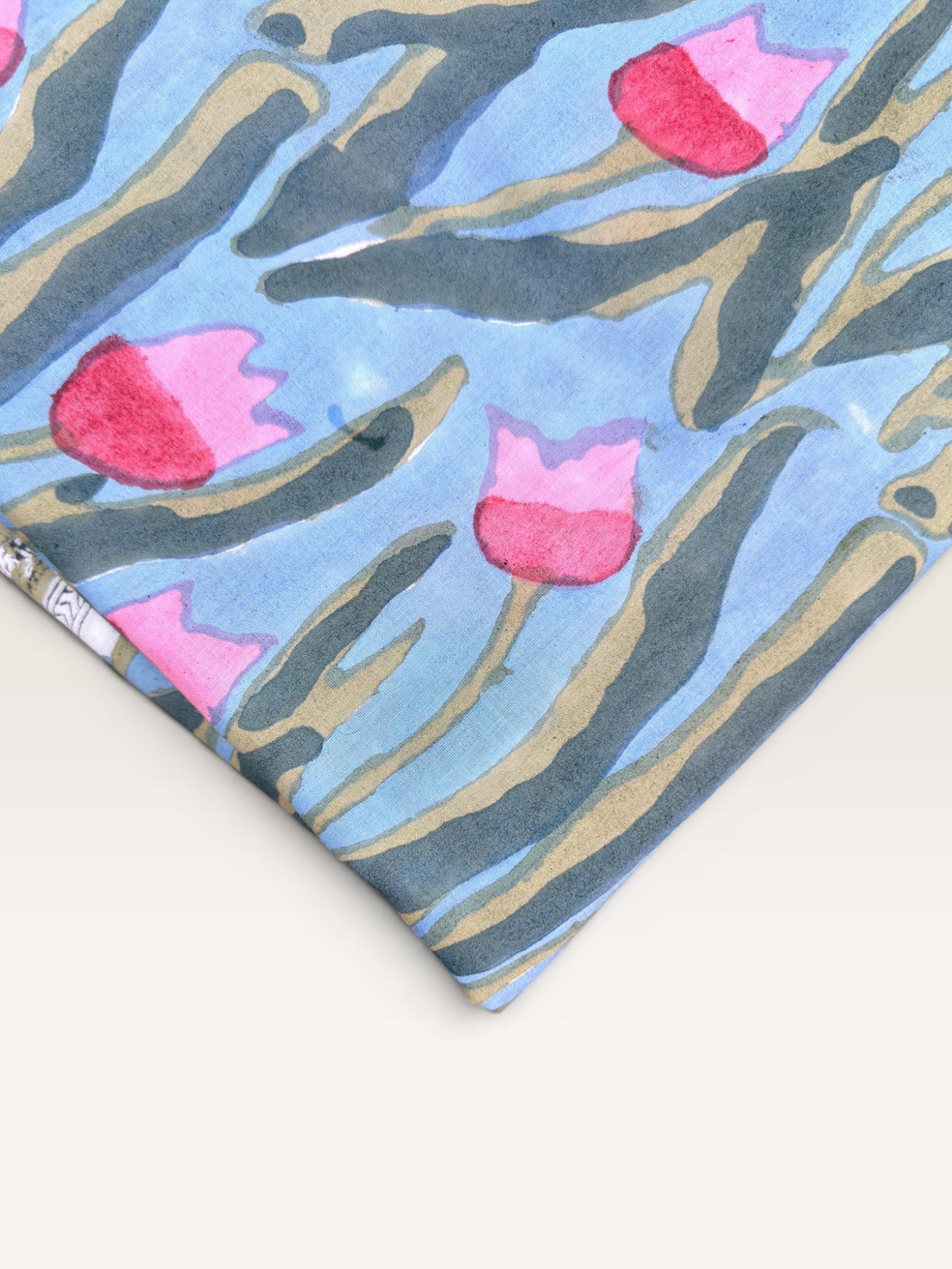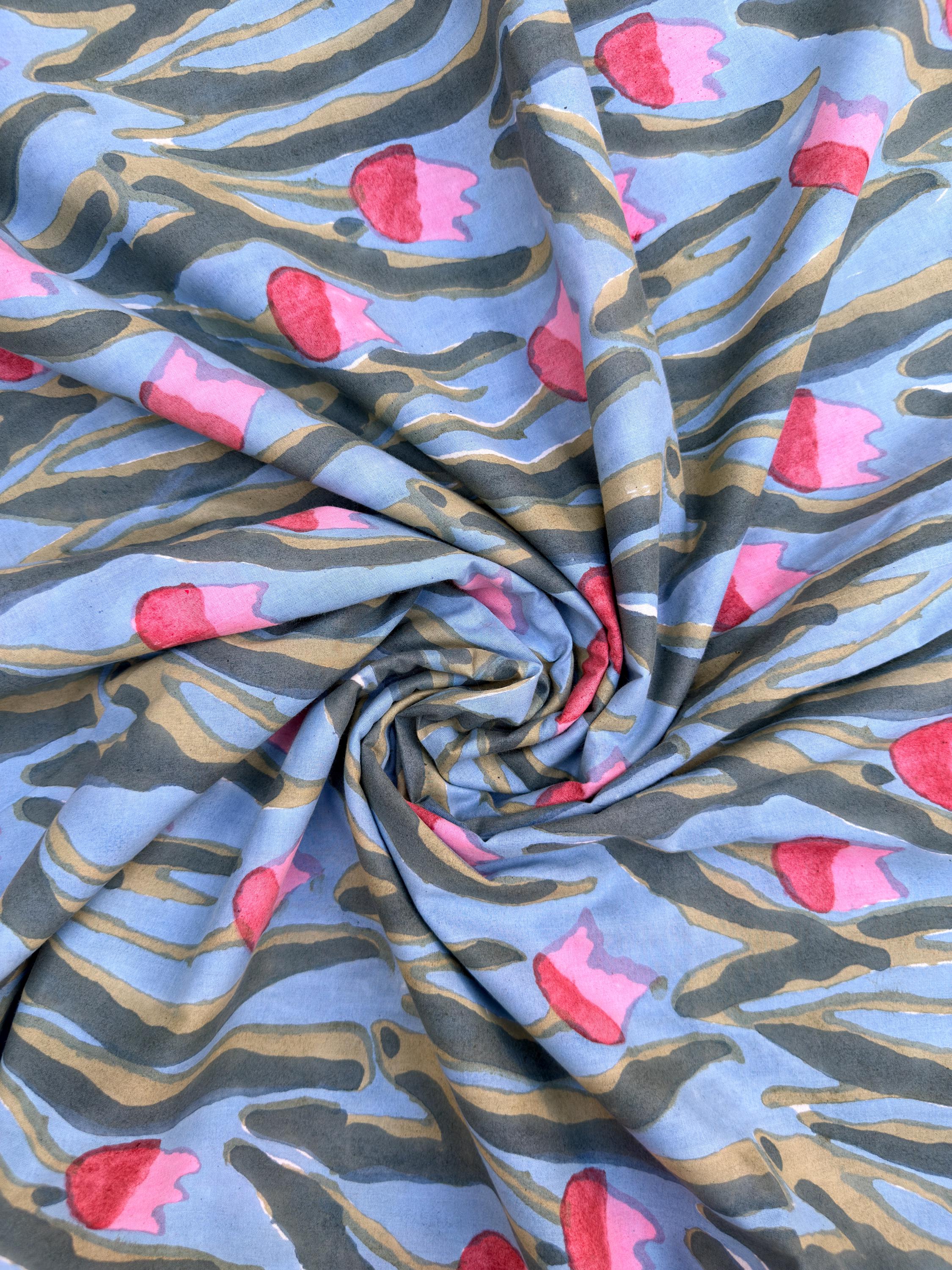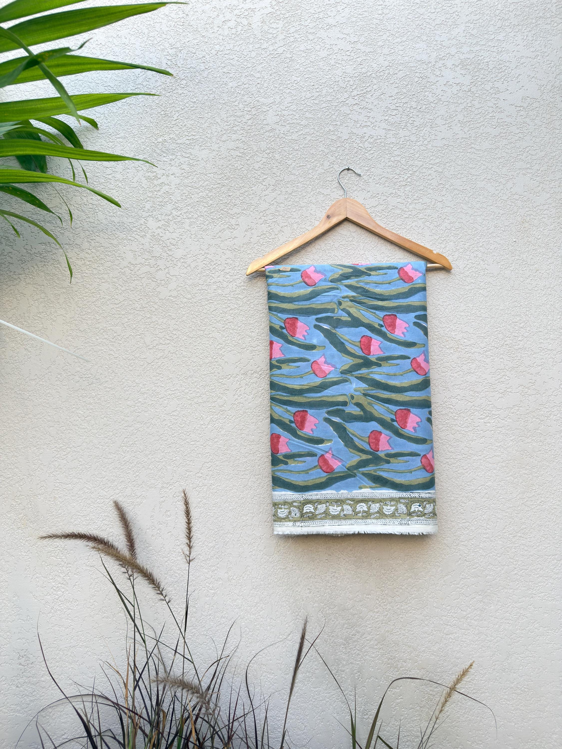 Bring timeless artistry into your creations with this beautifully handcrafted block print cotton fabric, featuring a serene blue base adorned with flowing green foliage and soft pink floral buds. Each piece reflects the charm of traditional Indian craftsmanship, carefully hand-printed by skilled artisans from Jaipur.