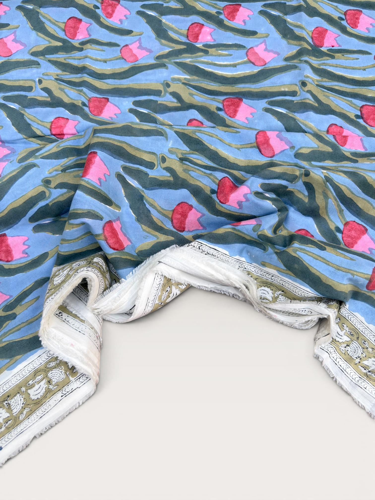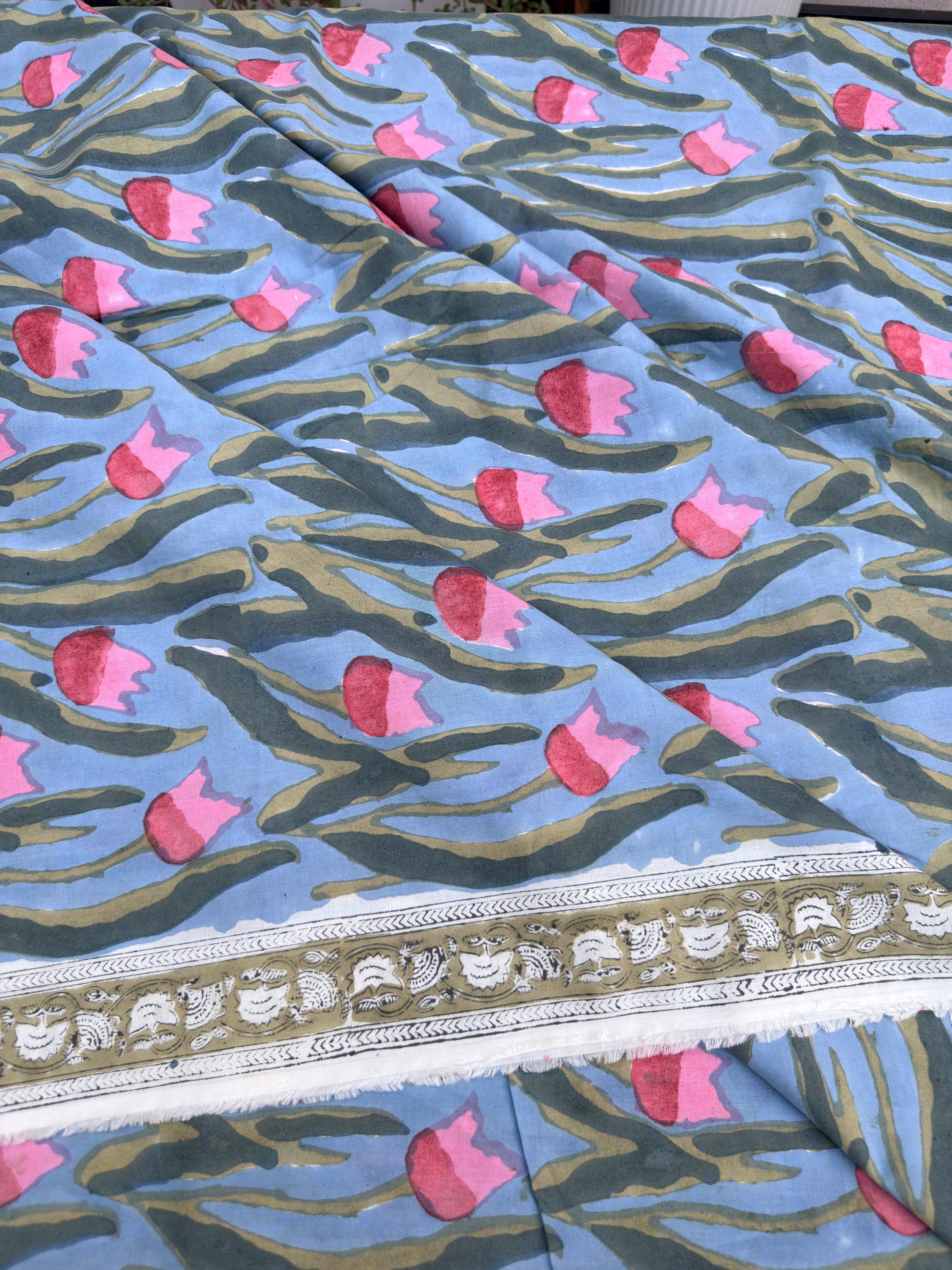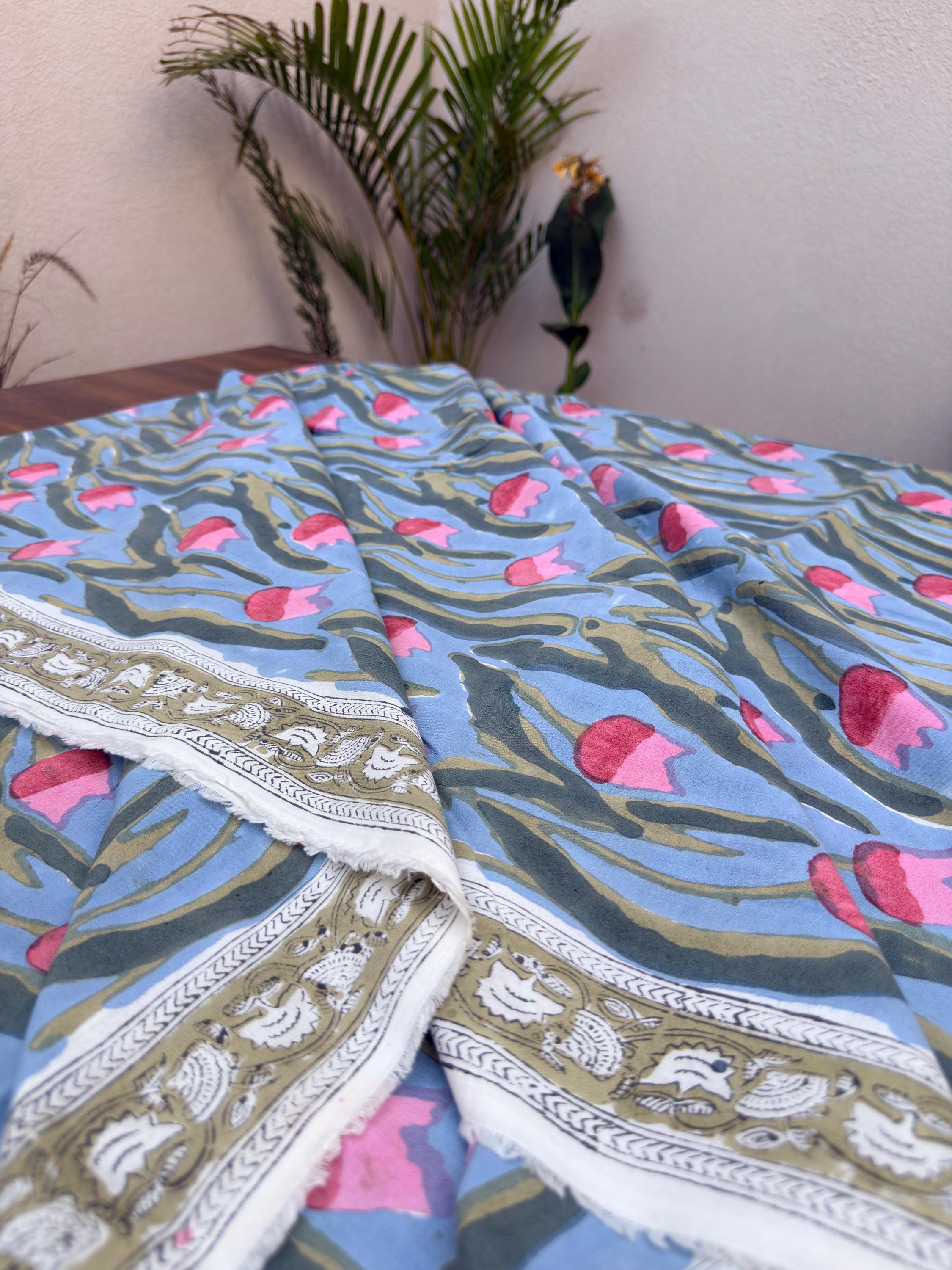 Each piece is carefully handcrafted using traditional block printing techniques, giving it a unique charm and artisanal touch. The delicate floral design paired with a detailed border adds sophistication and versatility to the fabric.