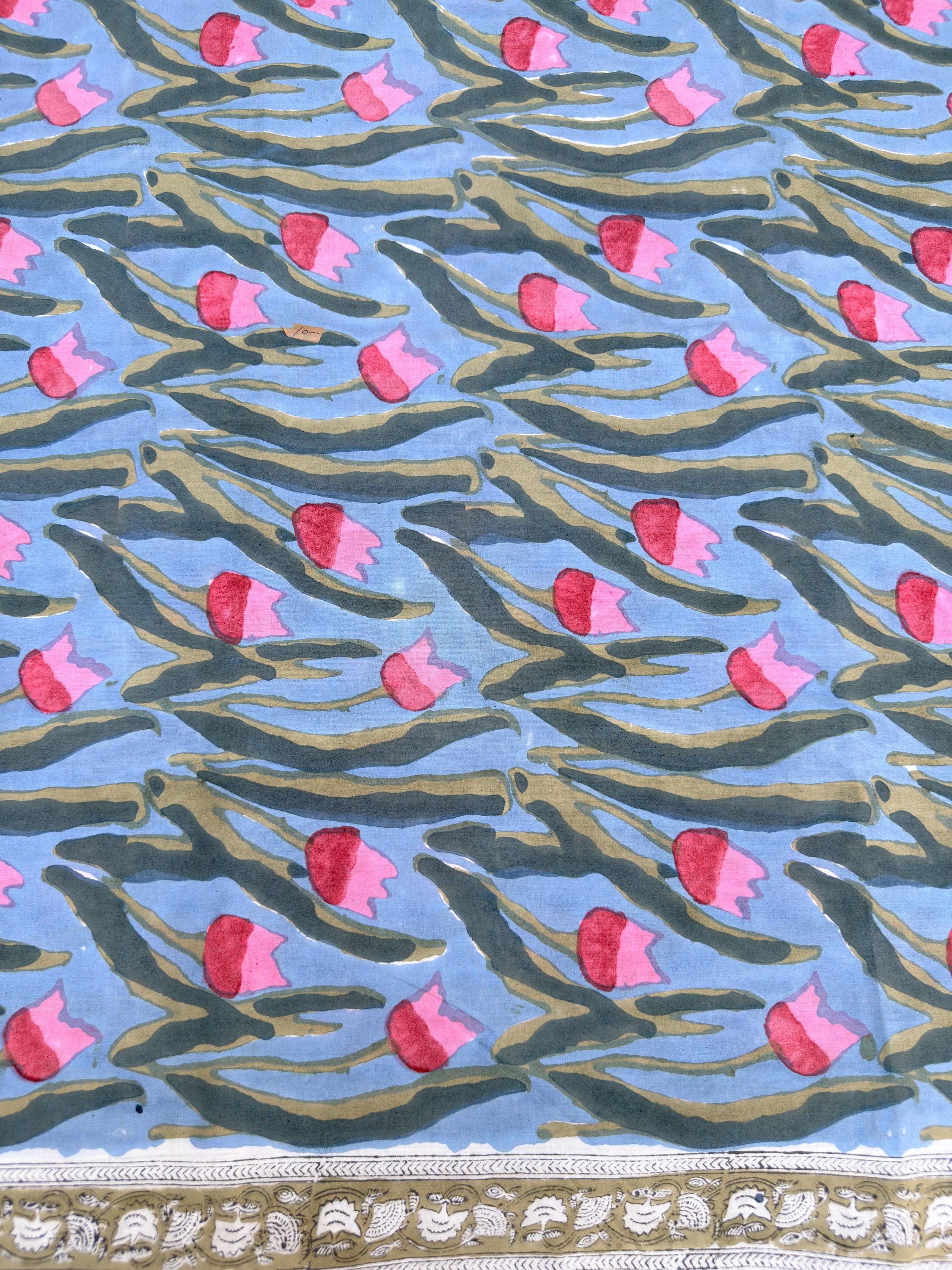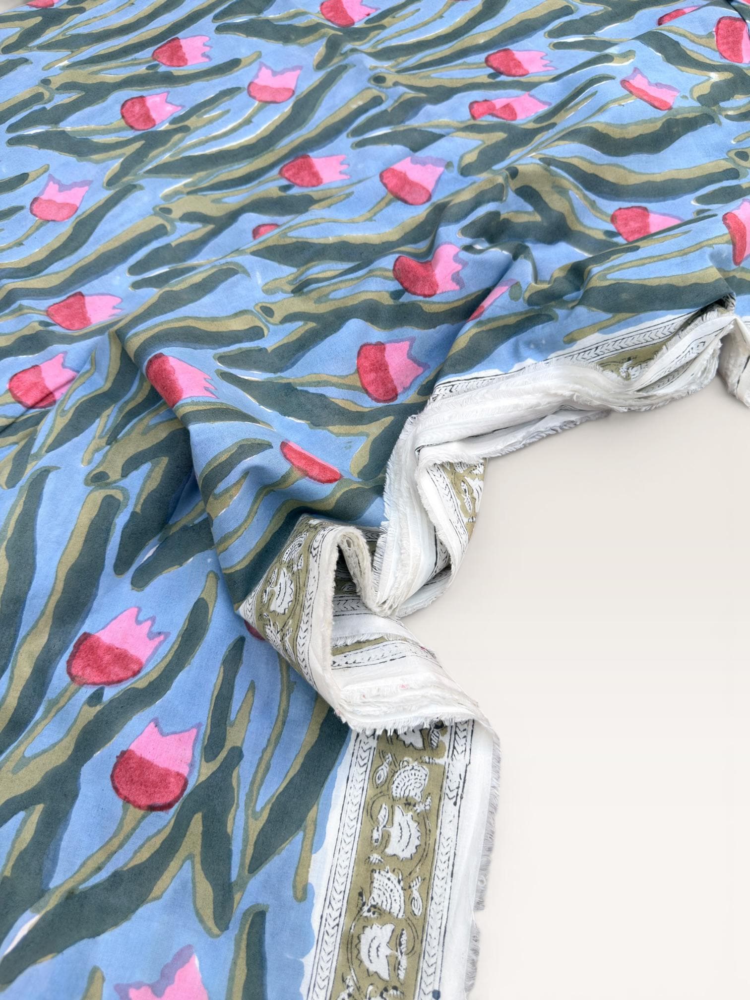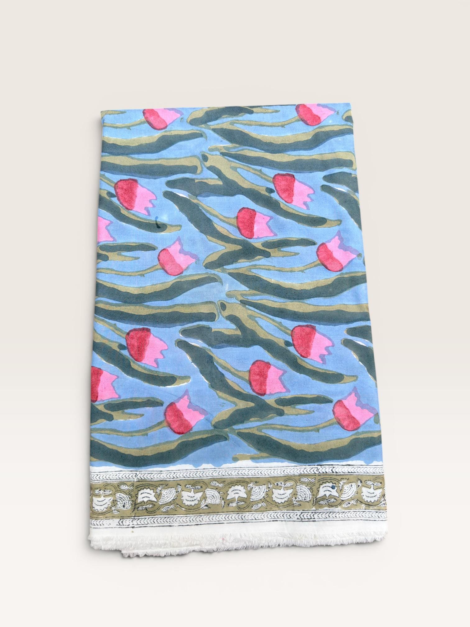 Each piece is carefully handcrafted using traditional block printing techniques, giving it a unique charm and artisanal touch. The delicate floral design paired with a detailed border adds sophistication and versatility to the fabric.