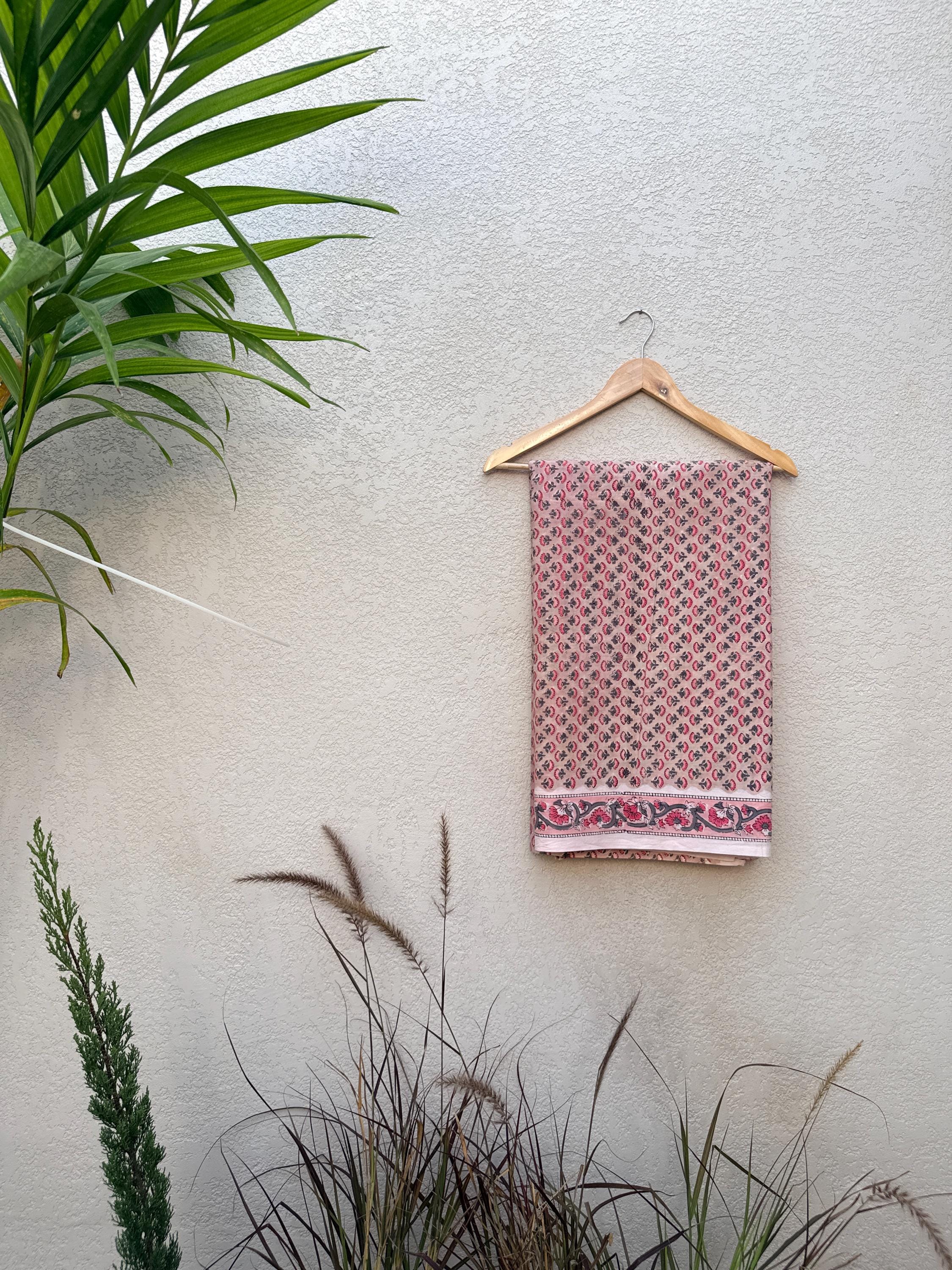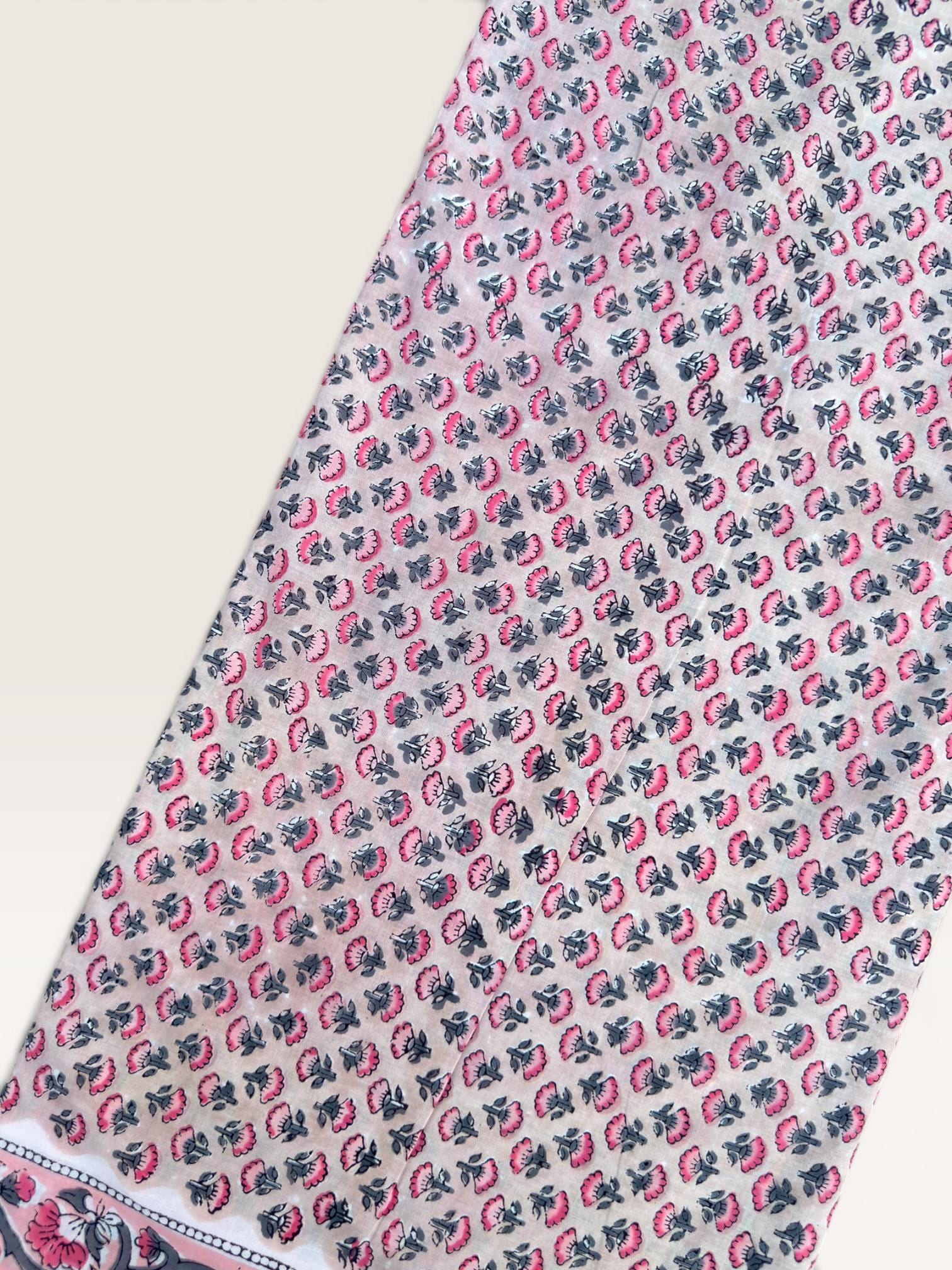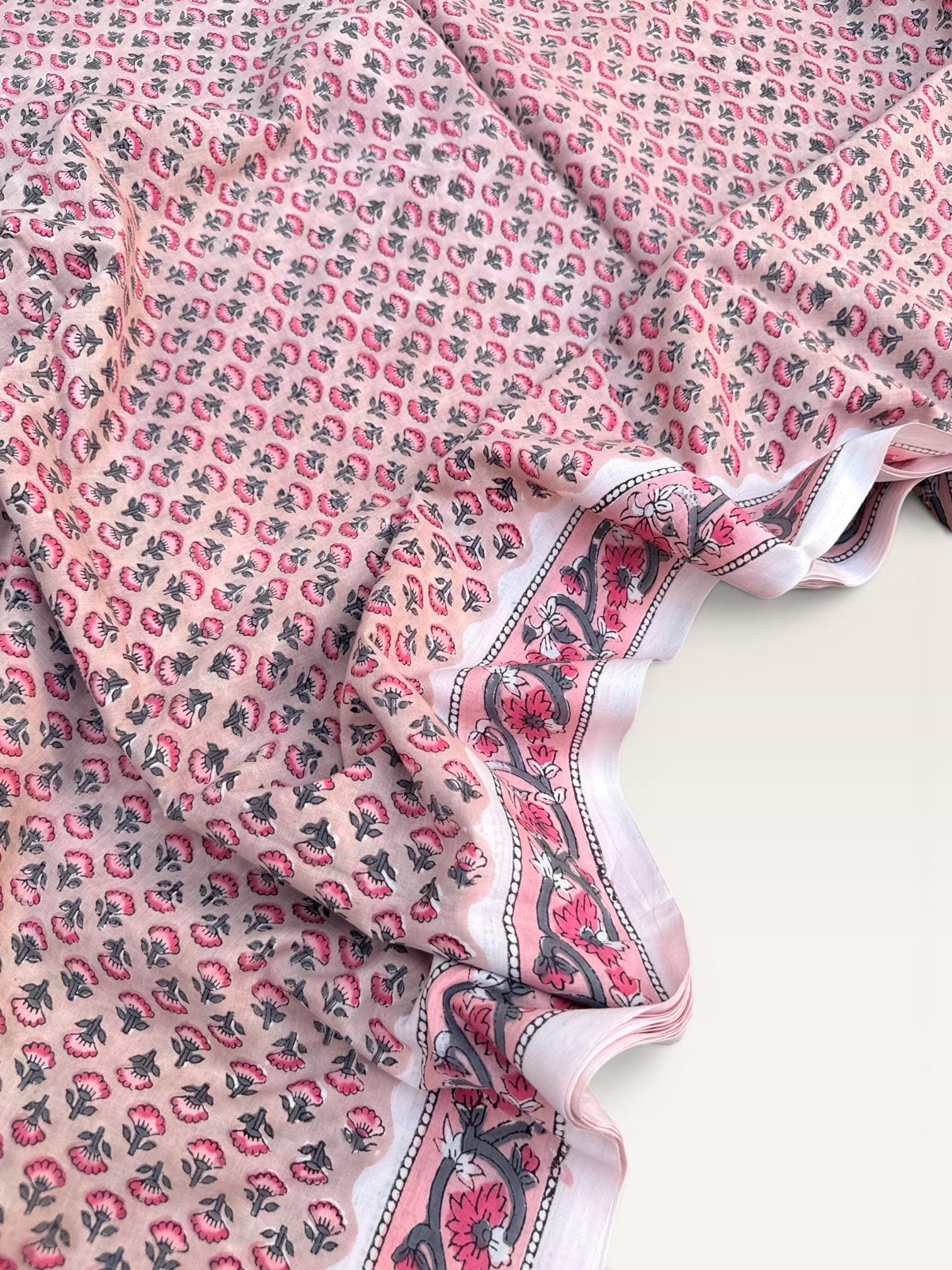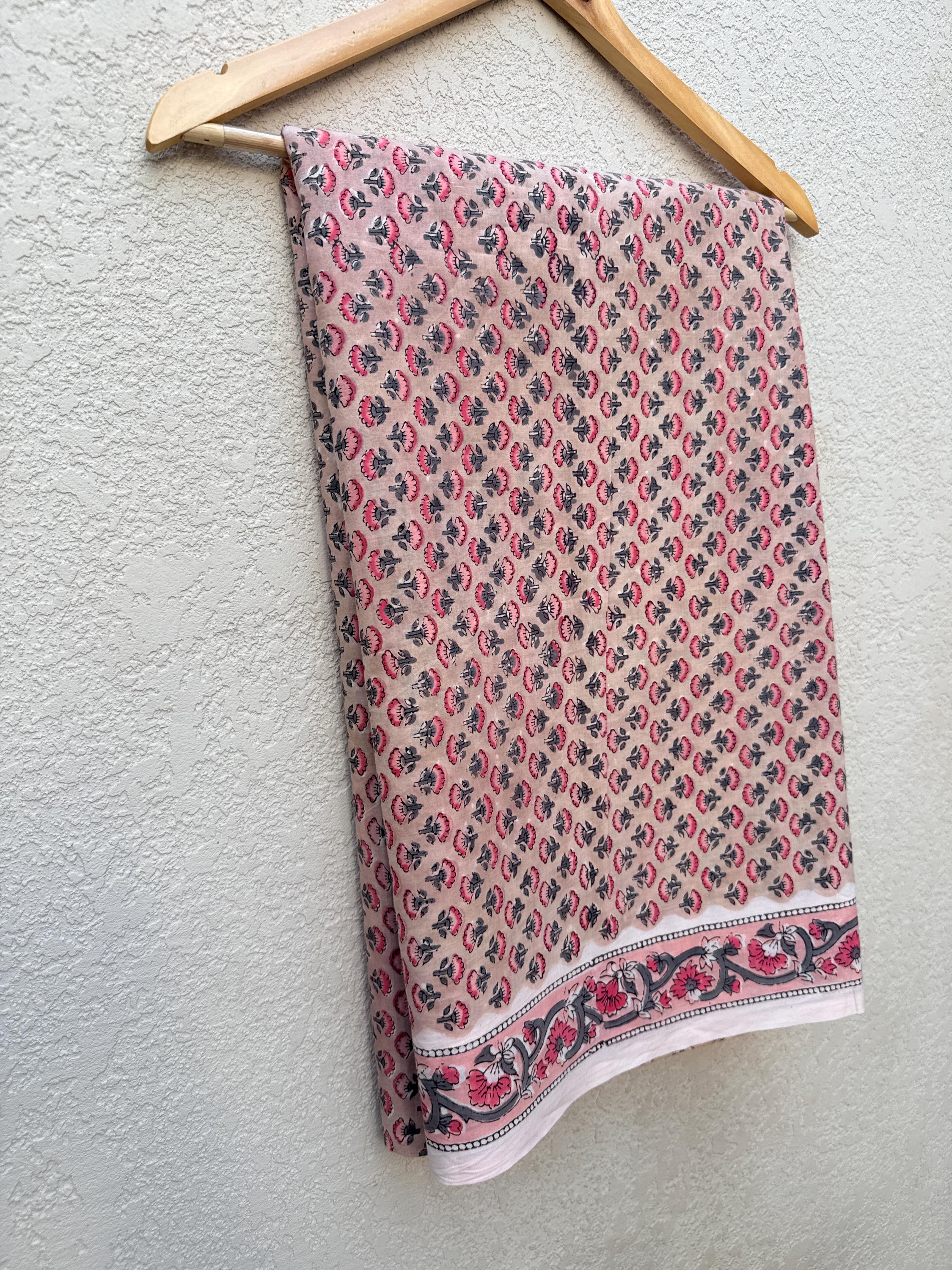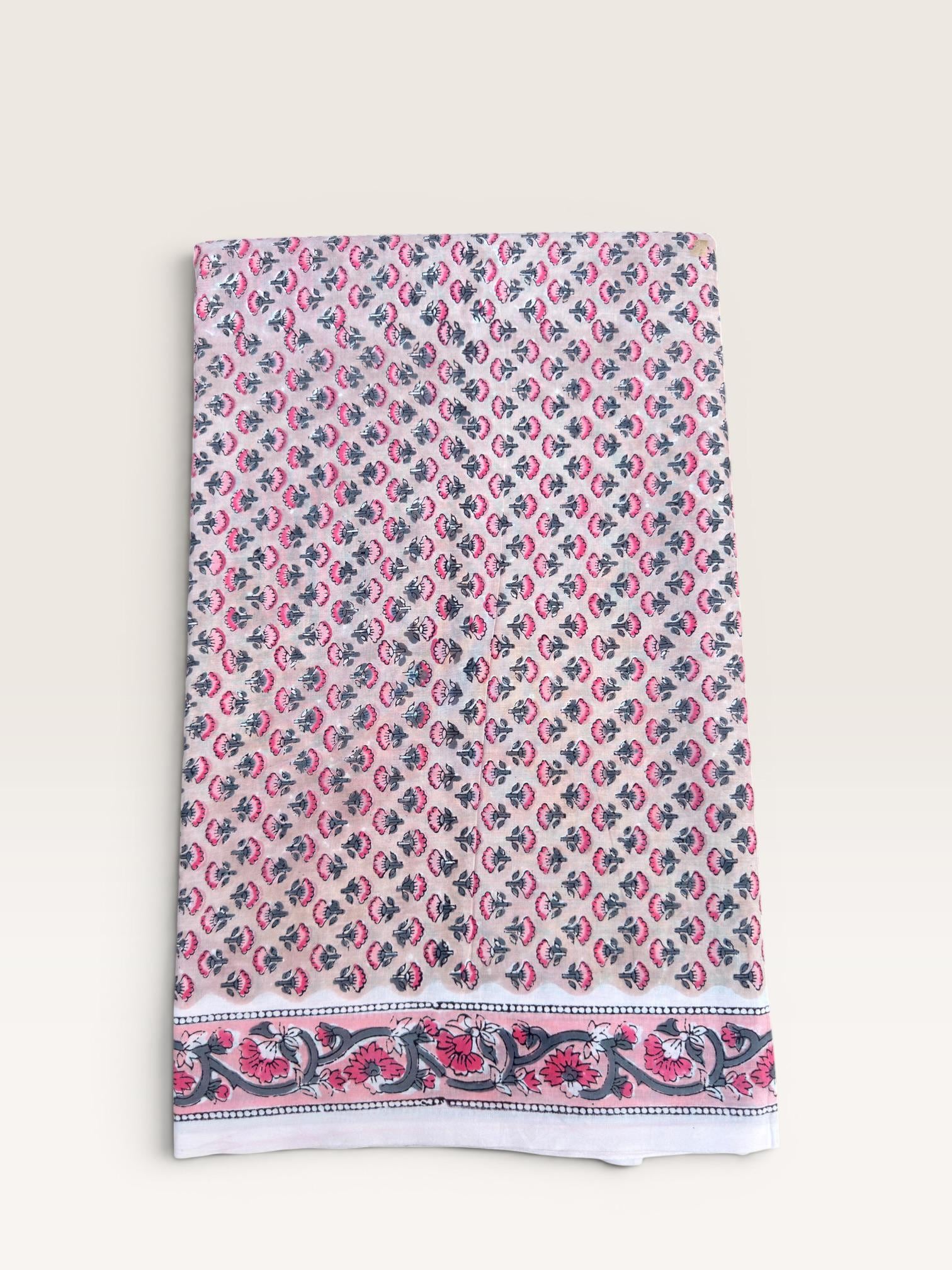 Each piece is carefully handcrafted using traditional block printing techniques, giving it a unique charm and artisanal touch. The delicate floral design paired with a detailed border adds sophistication and versatility to the fabric.
